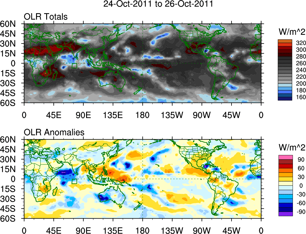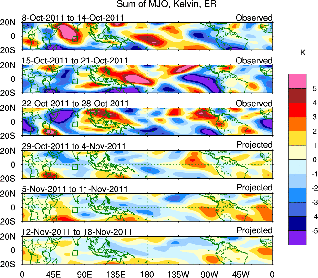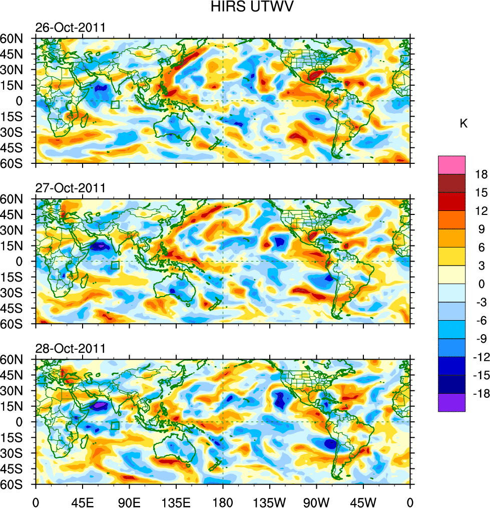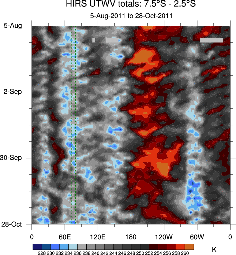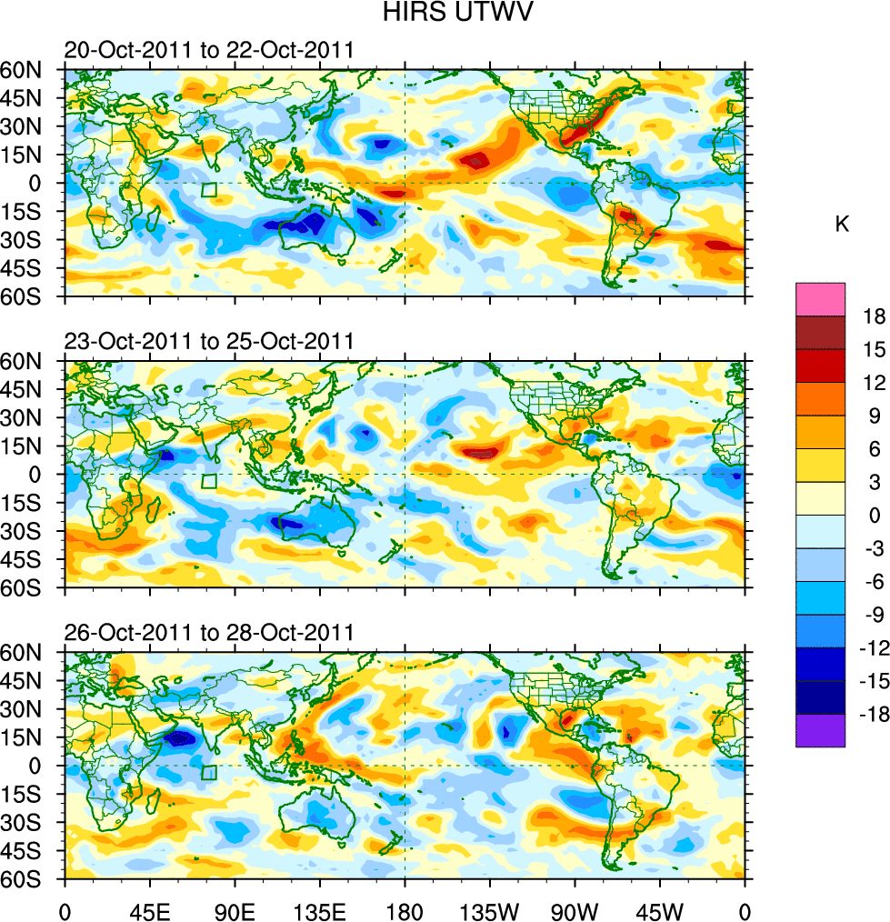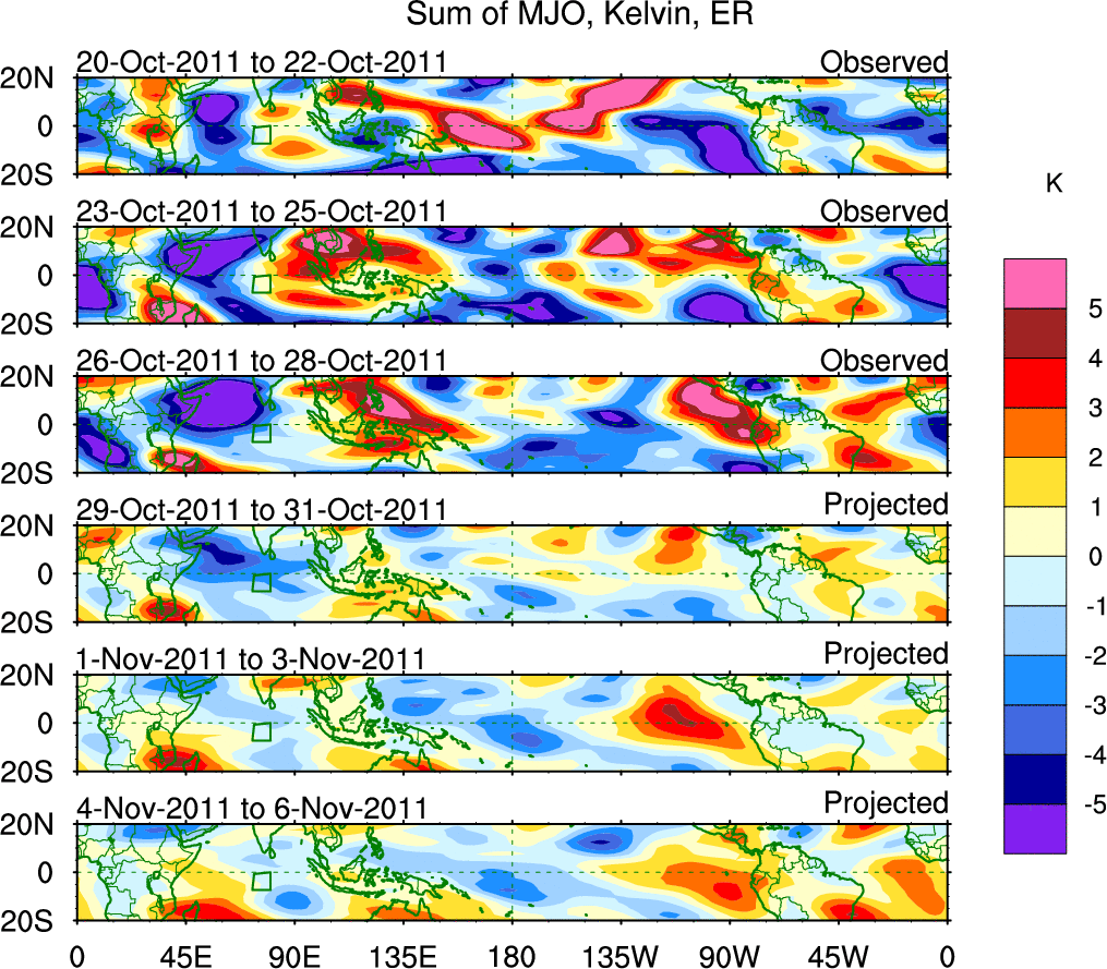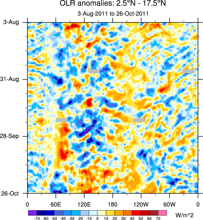 To identify tropical waves in near real-time, the OLR and UTWV data are filtered following Wheeler & Weickmann (2001 MWR). The daily anomalies are calculated using the first 3 harmonics of the seasonal cycle for 1979–2009. Missing values are then filled using linear interpolation in space and time. The most recent 365 days of anomalies are padded with 659 days of zeroes, and the result is filtered for each wave type.