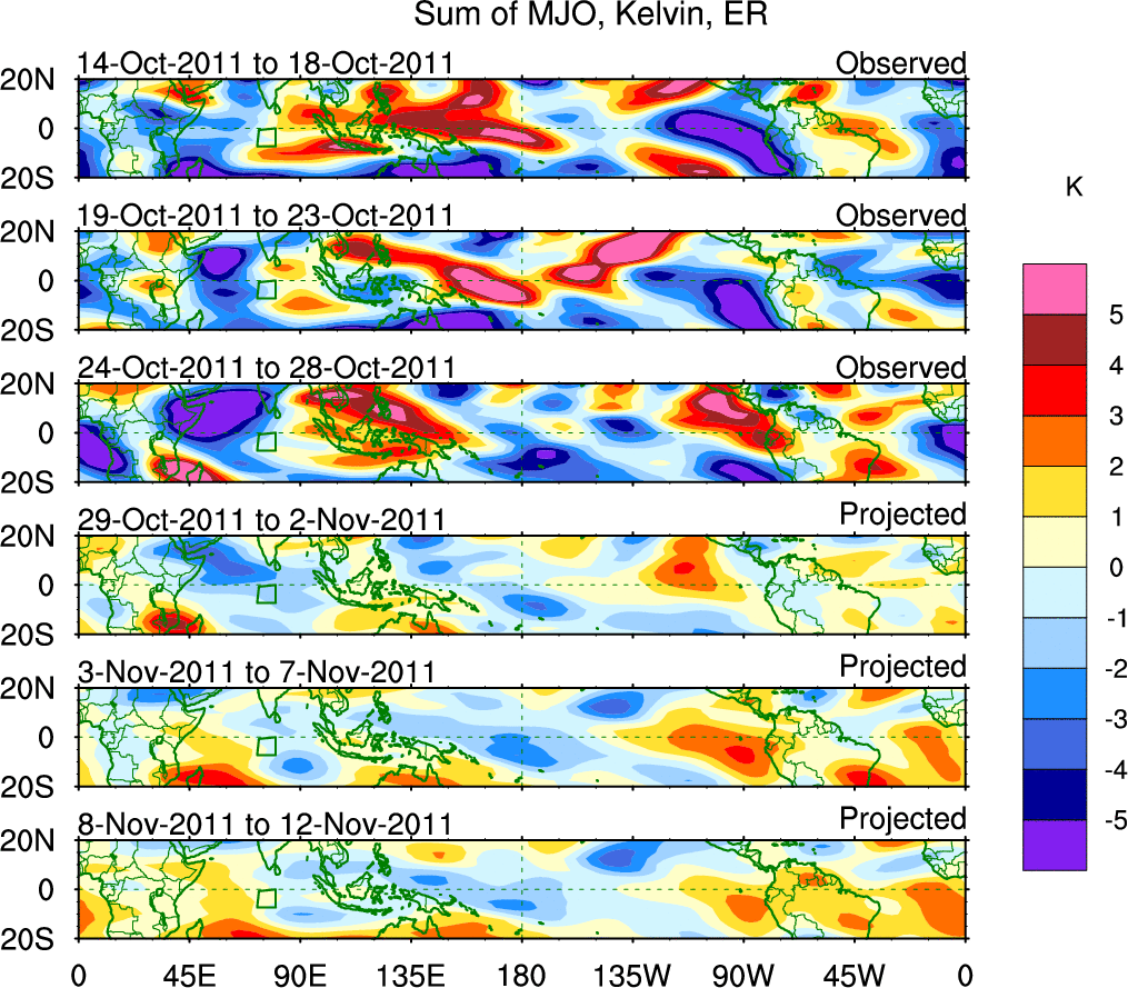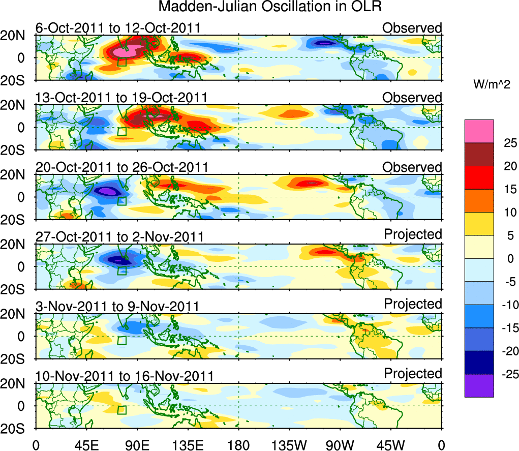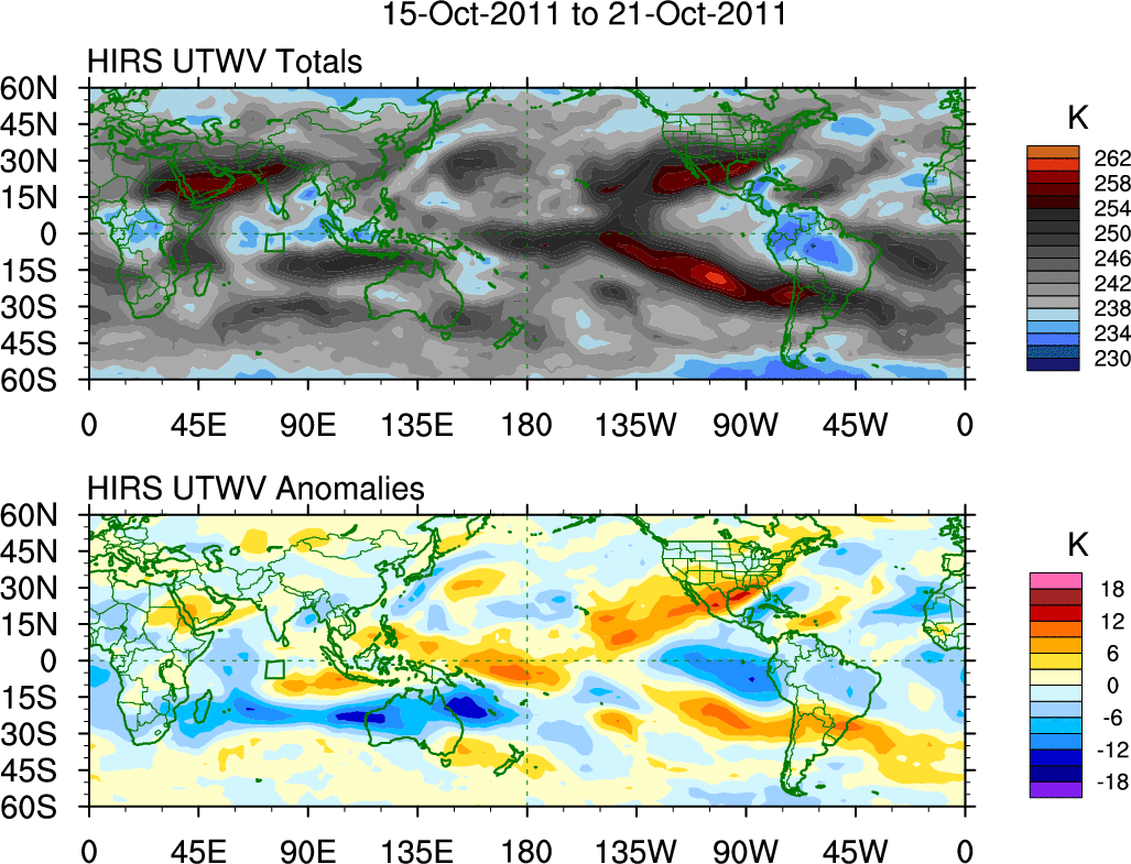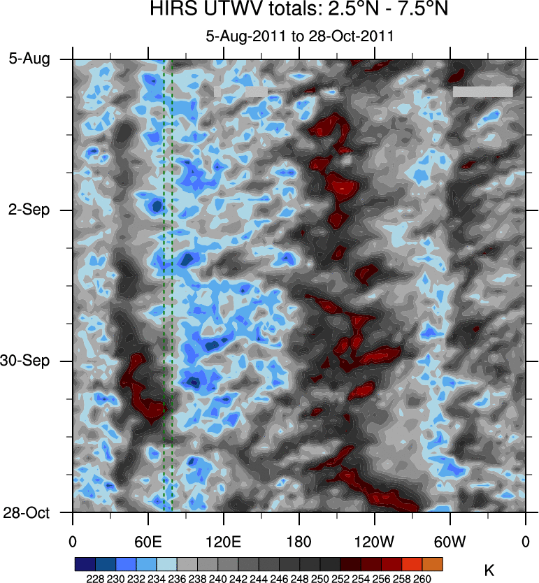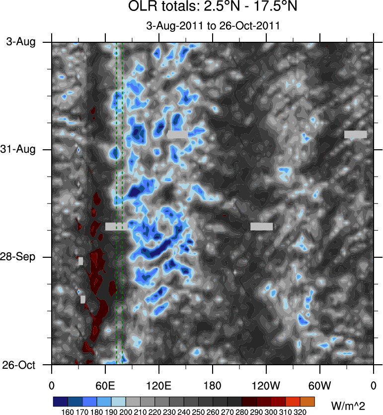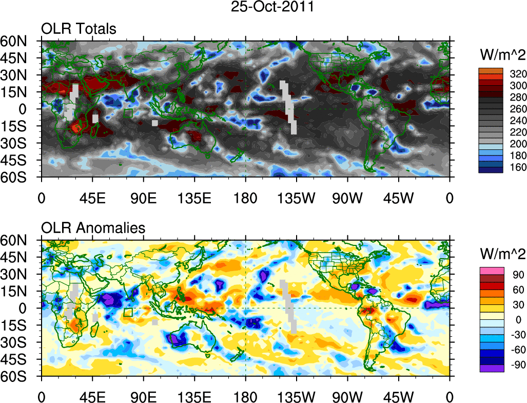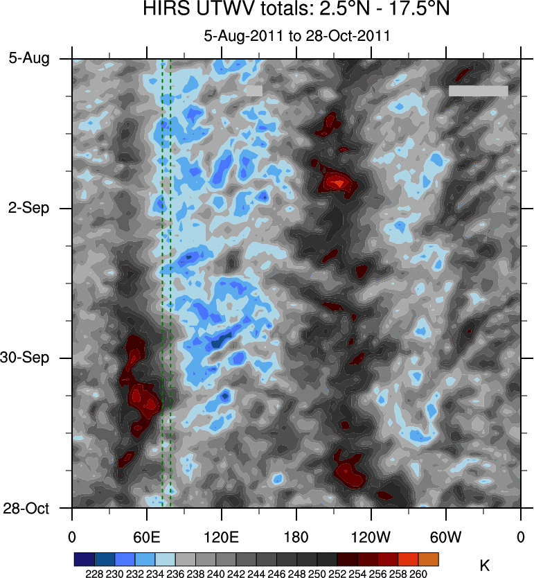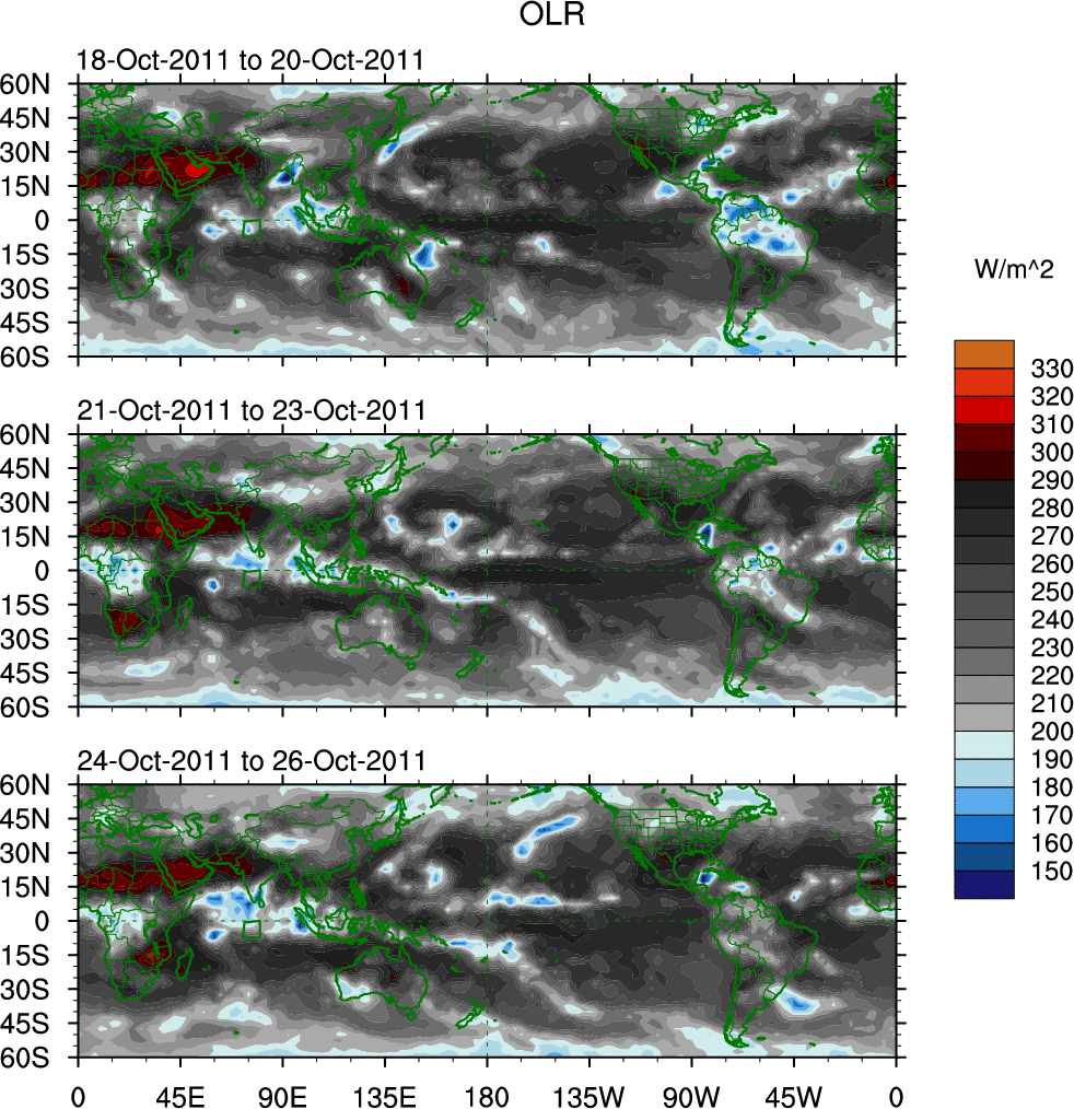 To identify tropical waves in near real-time, the OLR and UTWV data are filtered following Wheeler & Weickmann (2001 MWR). The daily anomalies are calculated using the first 3 harmonics of the seasonal cycle for 1979–2009. Missing values are then filled using linear interpolation in space and time. The most recent 365 days of anomalies are padded with 659 days of zeroes, and the result is filtered for each wave type.