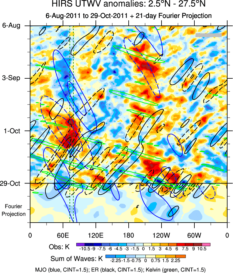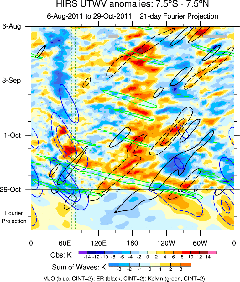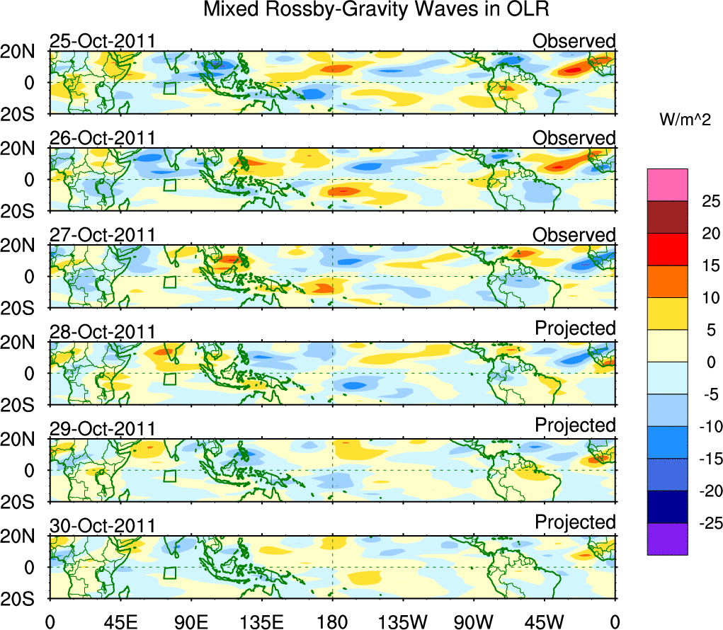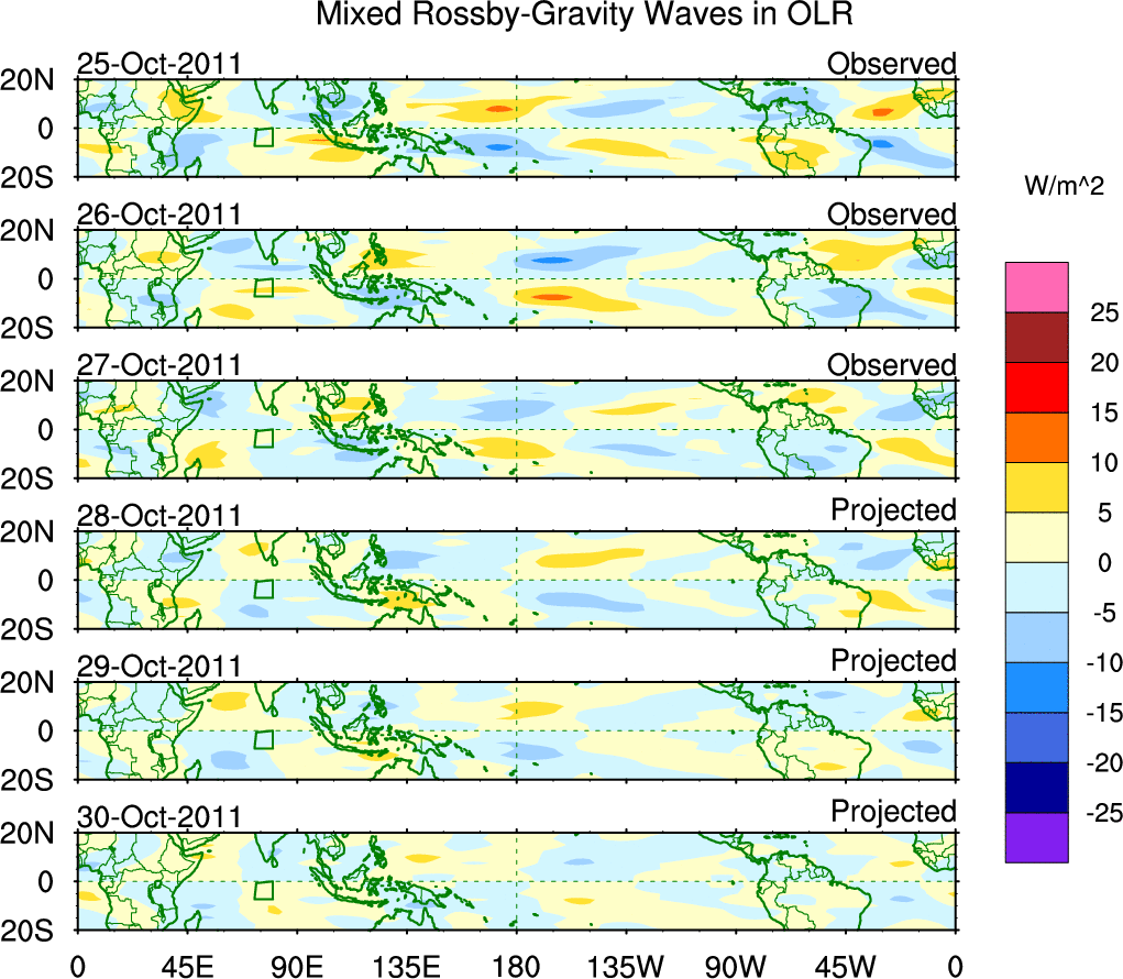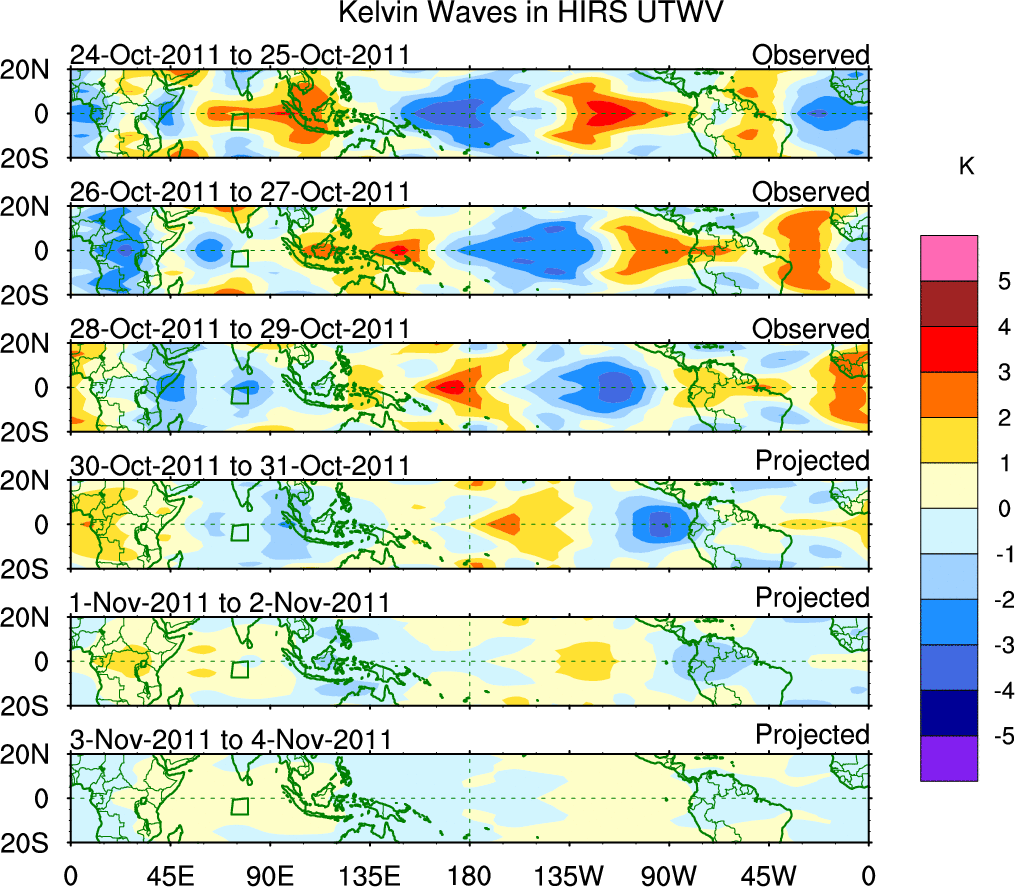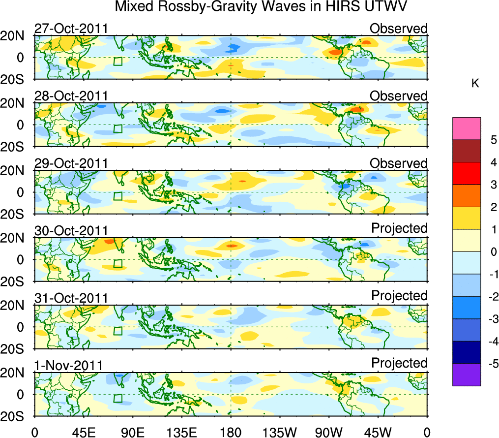 To identify tropical waves in near real-time, the OLR and UTWV data are filtered following Wheeler & Weickmann (2001 MWR). The daily anomalies are calculated using the first 3 harmonics of the seasonal cycle for 1979–2009. Missing values are then filled using linear interpolation in space and time. The most recent 365 days of anomalies are padded with 659 days of zeroes, and the result is filtered for each wave type.