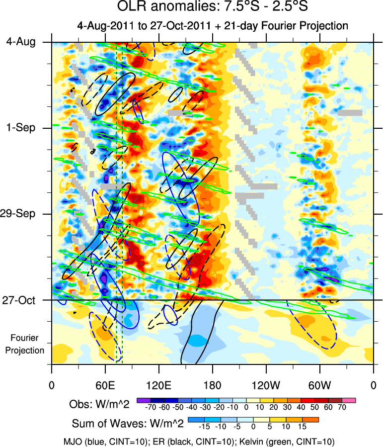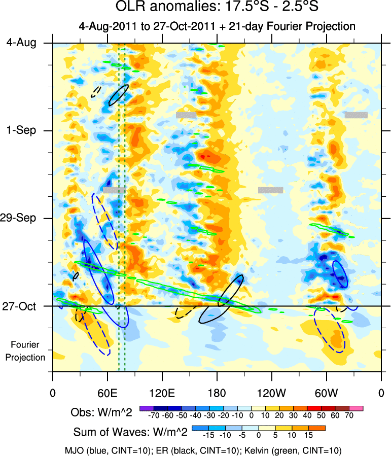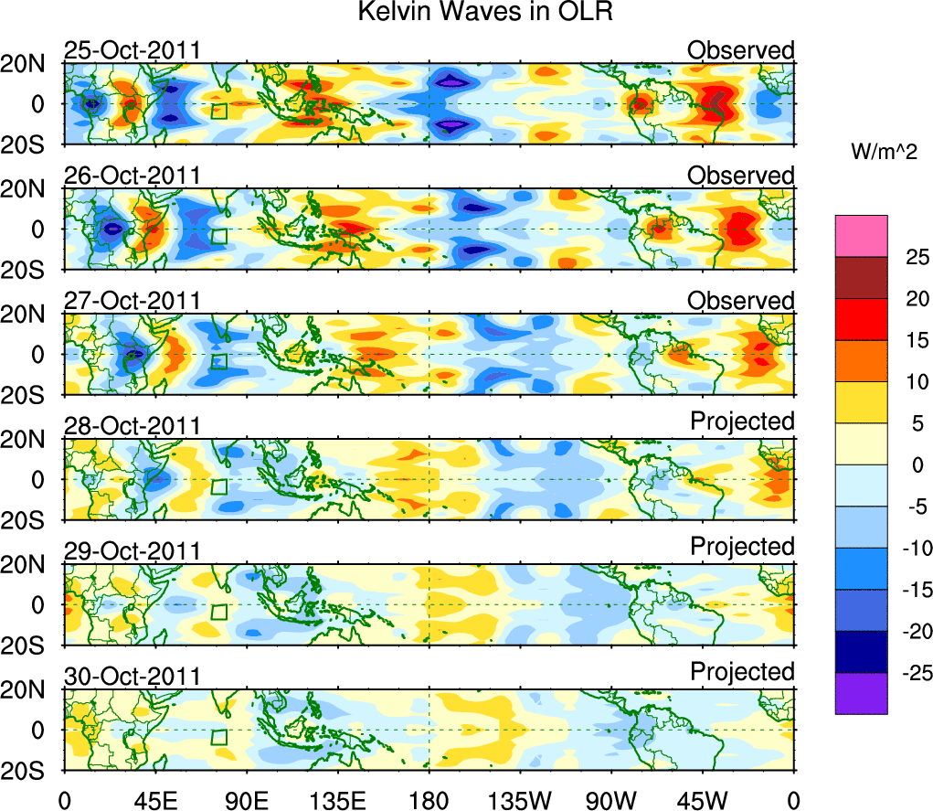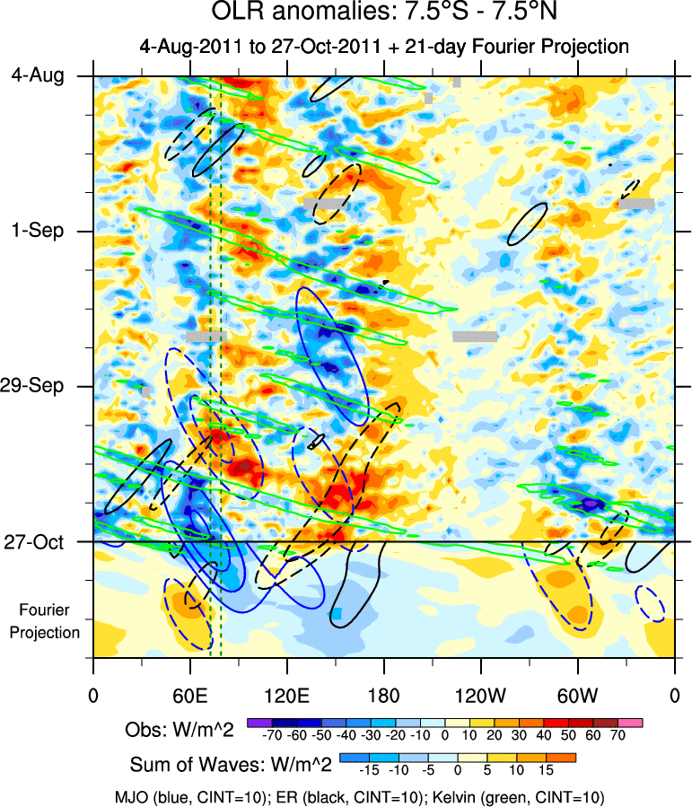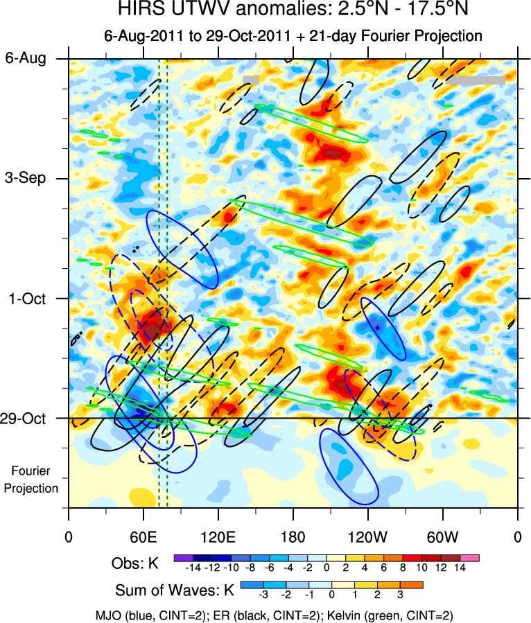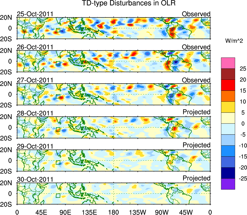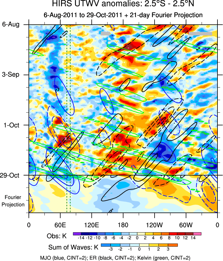 To identify tropical waves in near real-time, the OLR and UTWV data are filtered following Wheeler & Weickmann (2001 MWR). The daily anomalies are calculated using the first 3 harmonics of the seasonal cycle for 1979–2009. Missing values are then filled using linear interpolation in space and time. The most recent 365 days of anomalies are padded with 659 days of zeroes, and the result is filtered for each wave type.