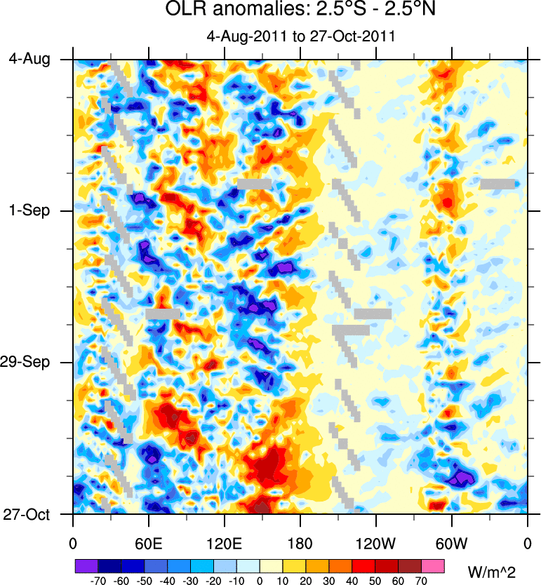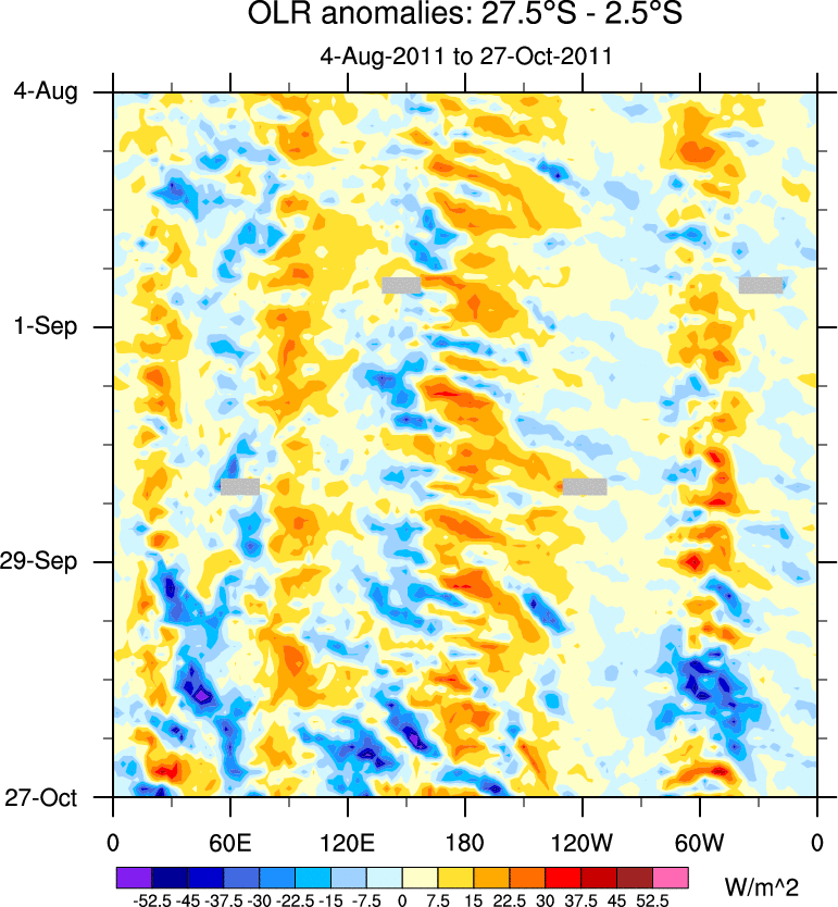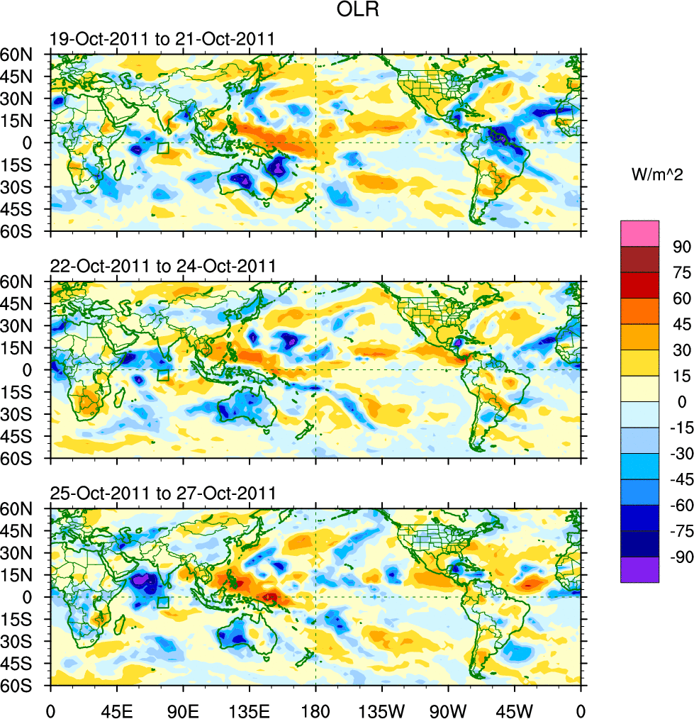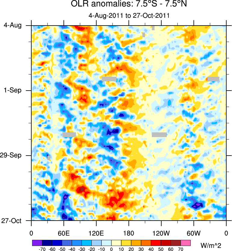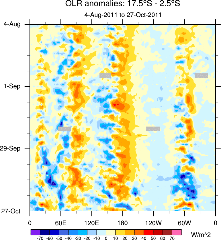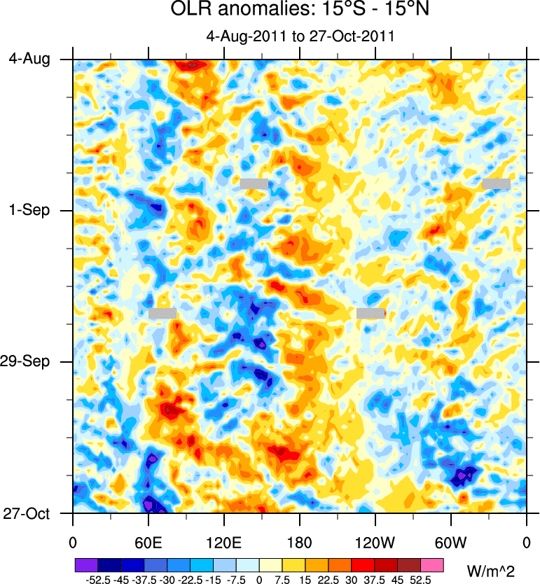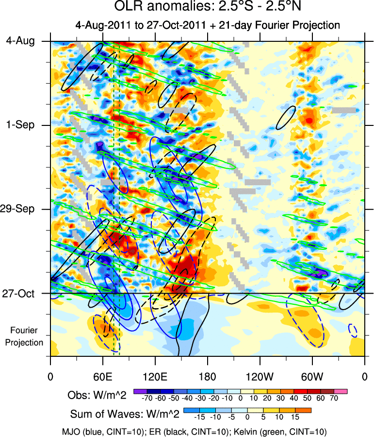 To identify tropical waves in near real-time, the OLR and UTWV data are filtered following Wheeler & Weickmann (2001 MWR). The daily anomalies are calculated using the first 3 harmonics of the seasonal cycle for 1979–2009. Missing values are then filled using linear interpolation in space and time. The most recent 365 days of anomalies are padded with 659 days of zeroes, and the result is filtered for each wave type.