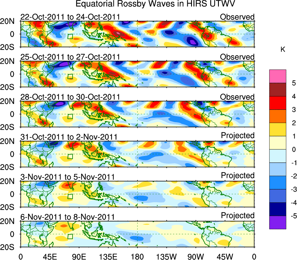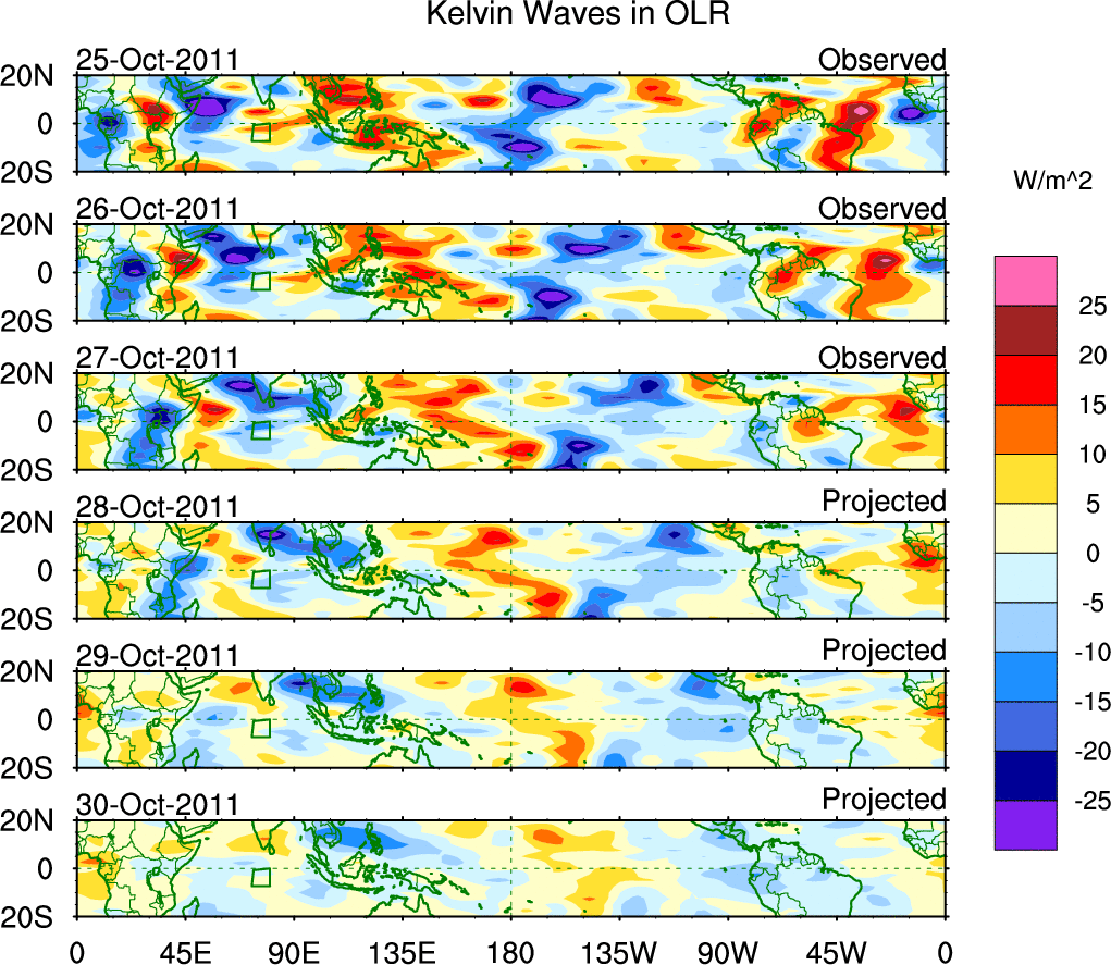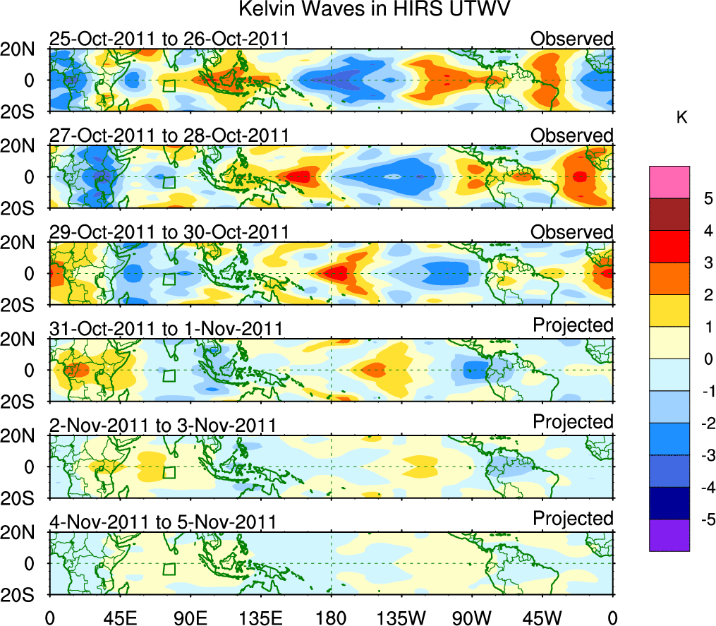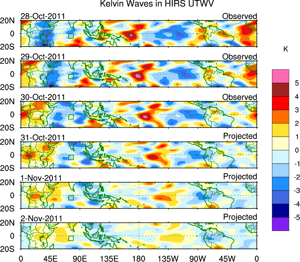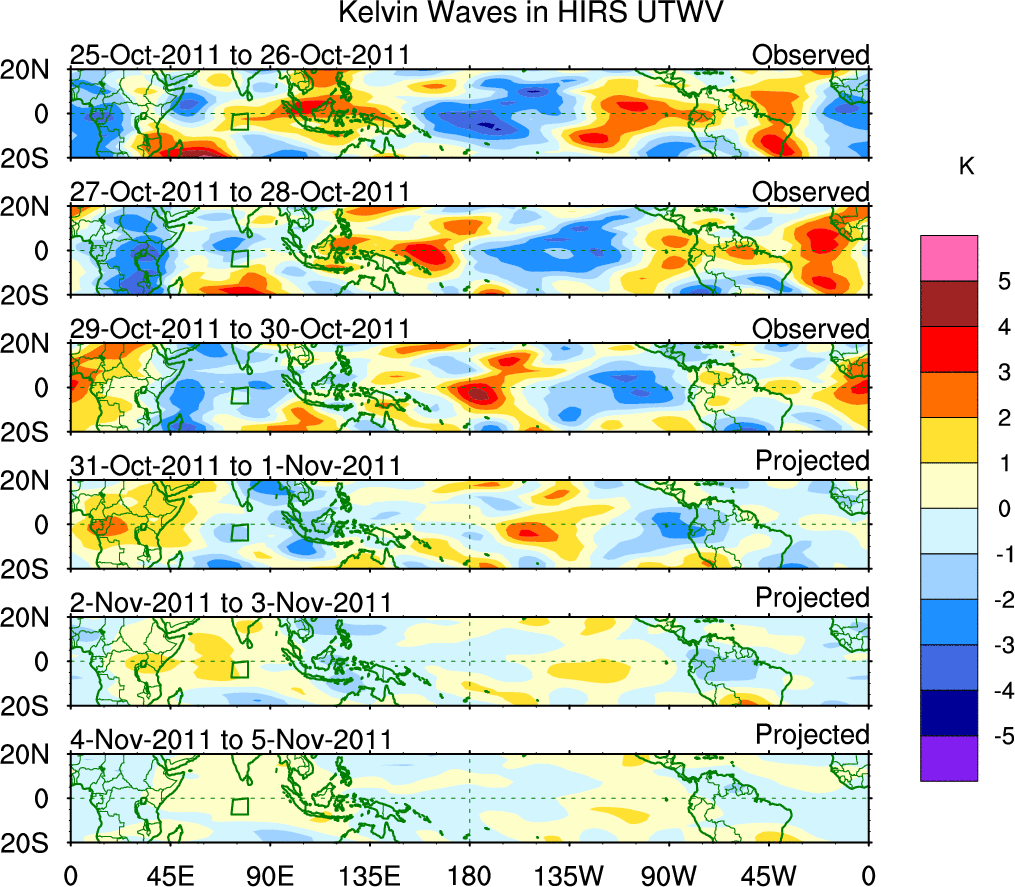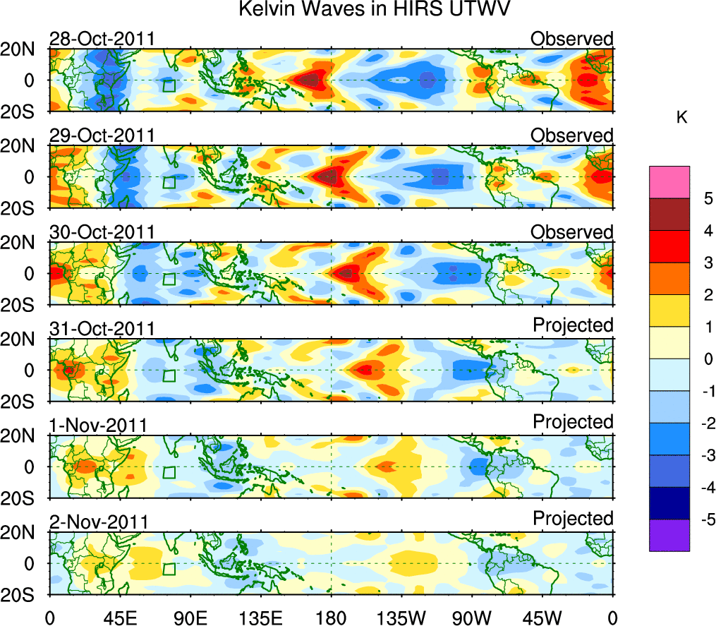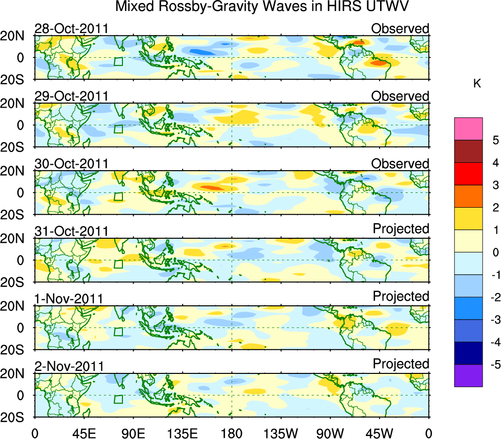 To identify tropical waves in near real-time, the OLR and UTWV data are filtered following Wheeler & Weickmann (2001 MWR). The daily anomalies are calculated using the first 3 harmonics of the seasonal cycle for 1979–2009. Missing values are then filled using linear interpolation in space and time. The most recent 365 days of anomalies are padded with 659 days of zeroes, and the result is filtered for each wave type.