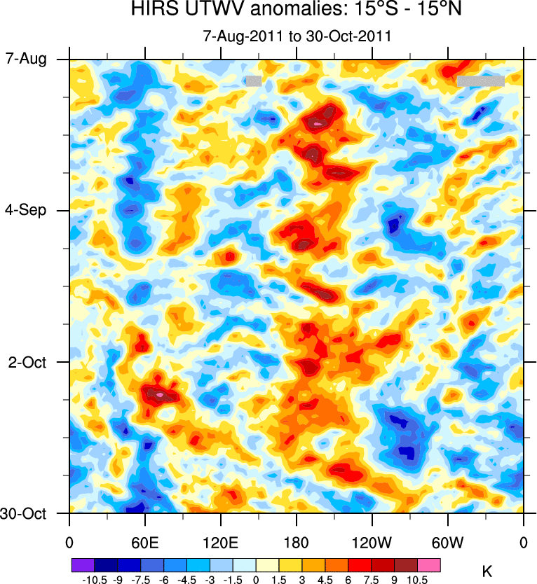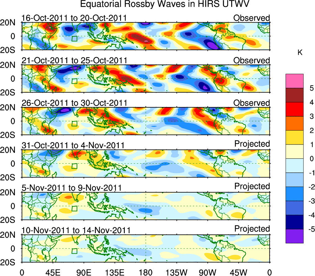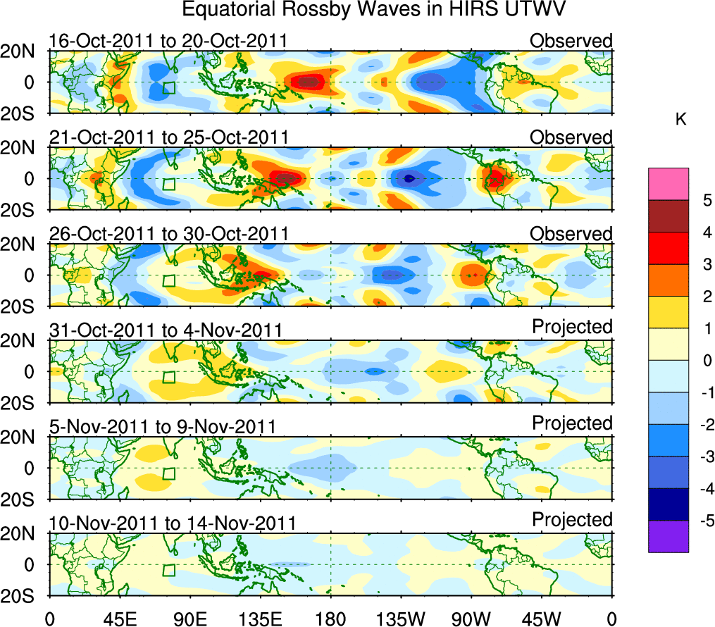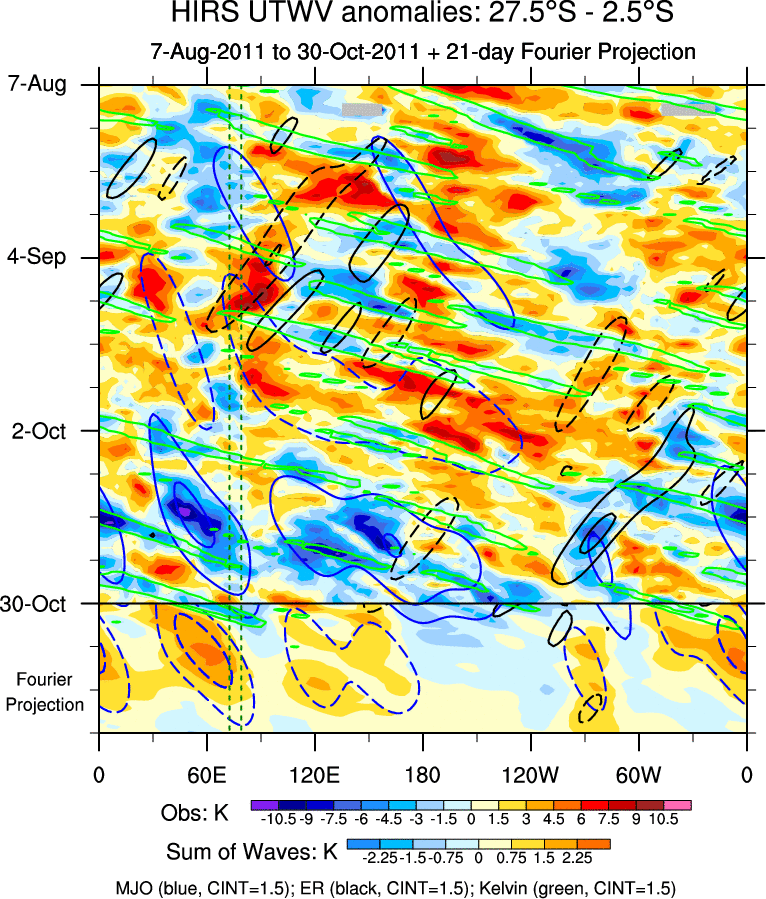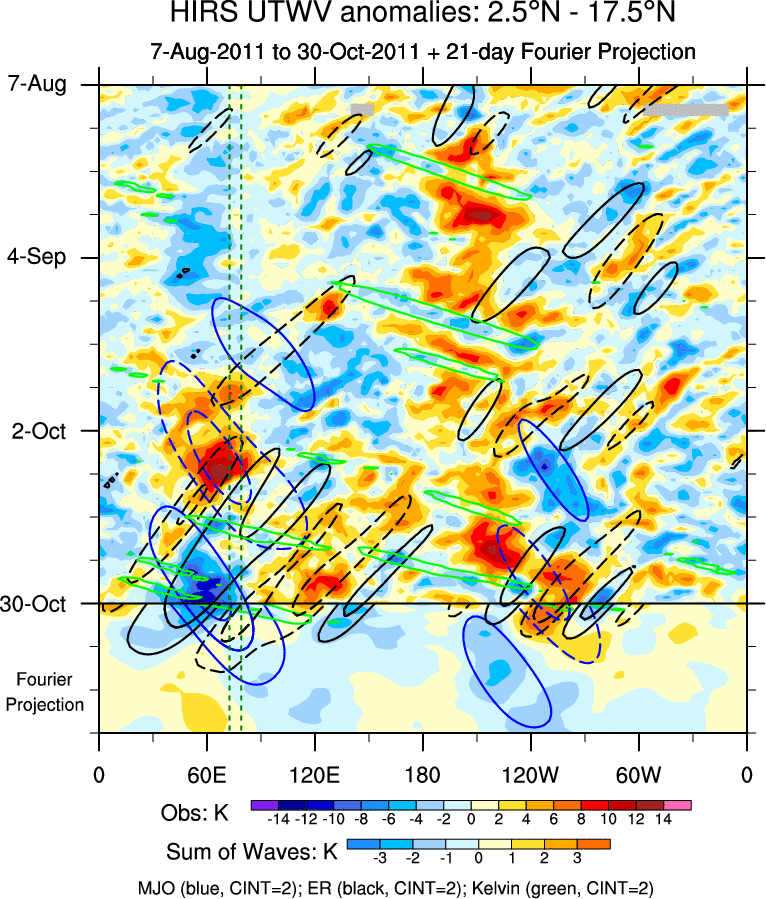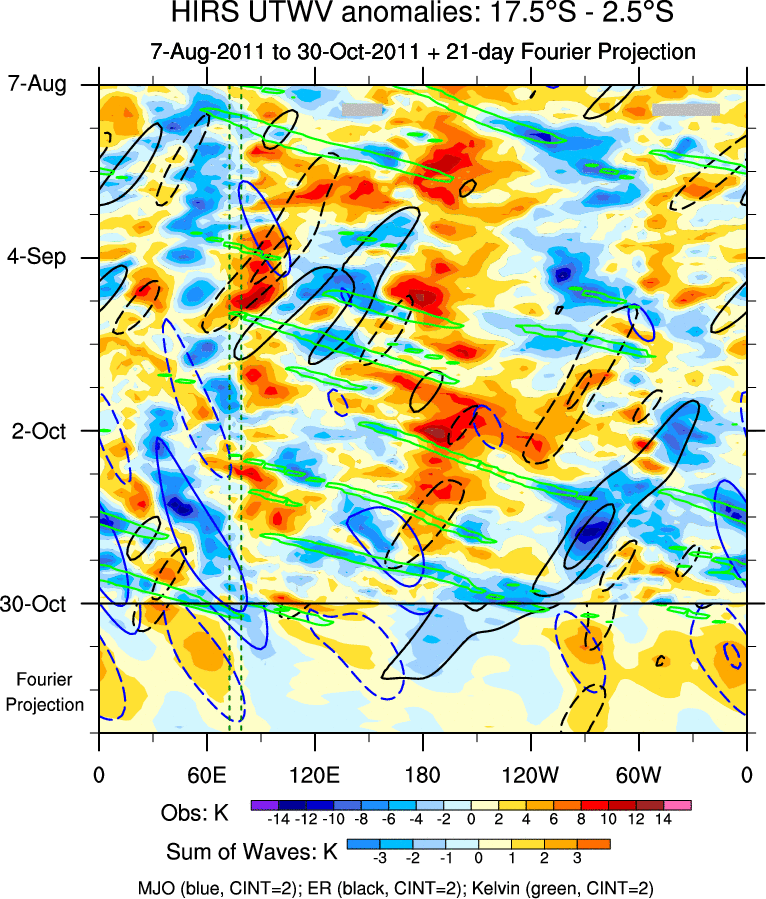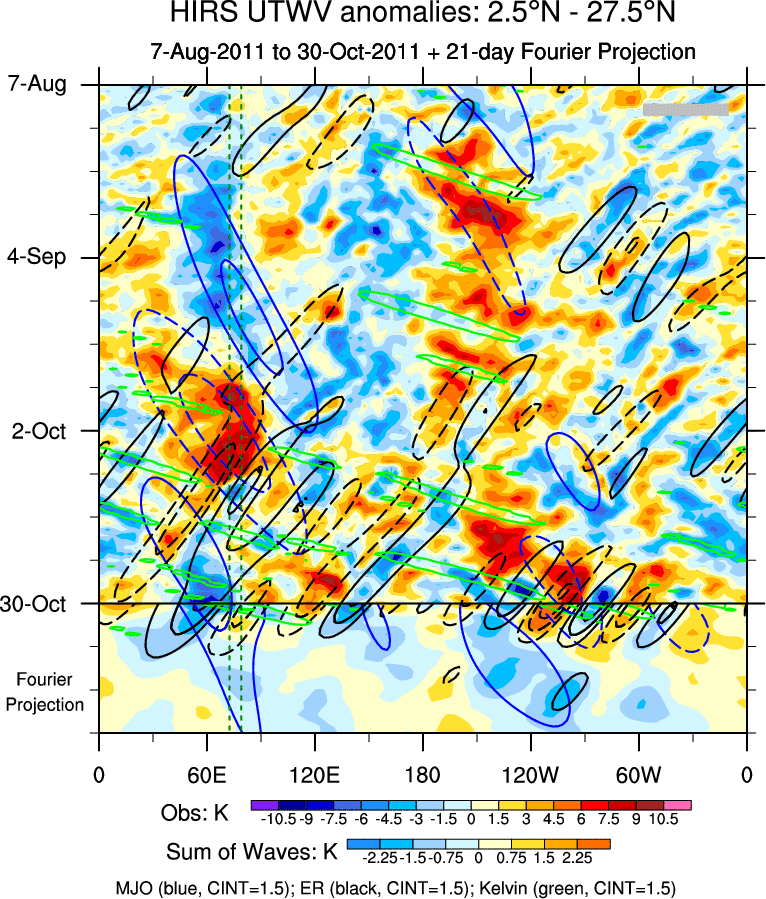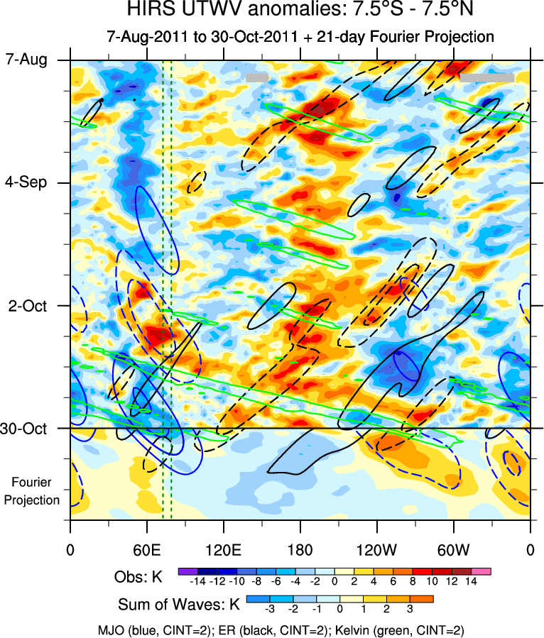 To identify tropical waves in near real-time, the OLR and UTWV data are filtered following Wheeler & Weickmann (2001 MWR). The daily anomalies are calculated using the first 3 harmonics of the seasonal cycle for 1979–2009. Missing values are then filled using linear interpolation in space and time. The most recent 365 days of anomalies are padded with 659 days of zeroes, and the result is filtered for each wave type.