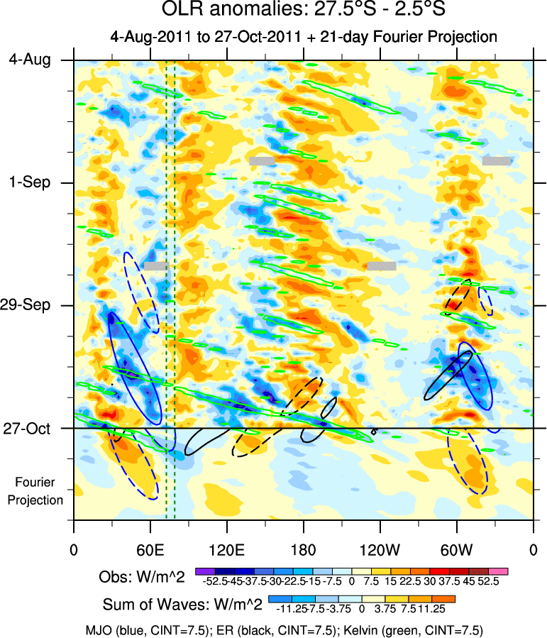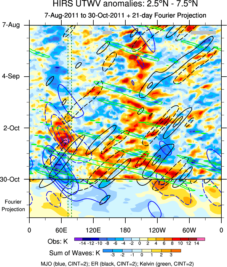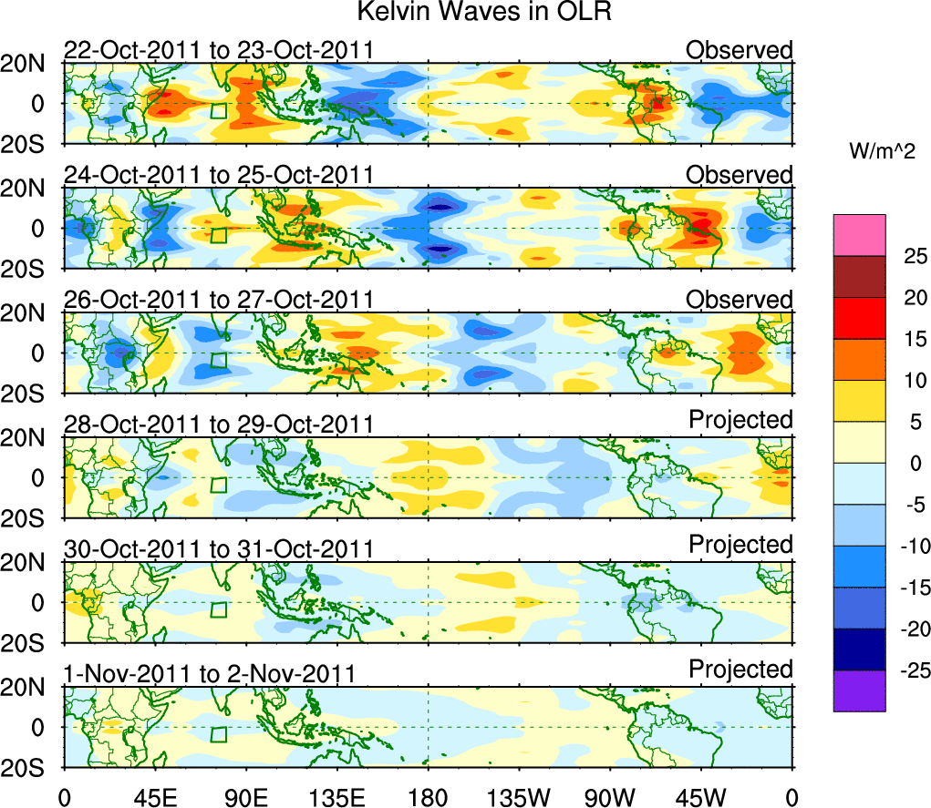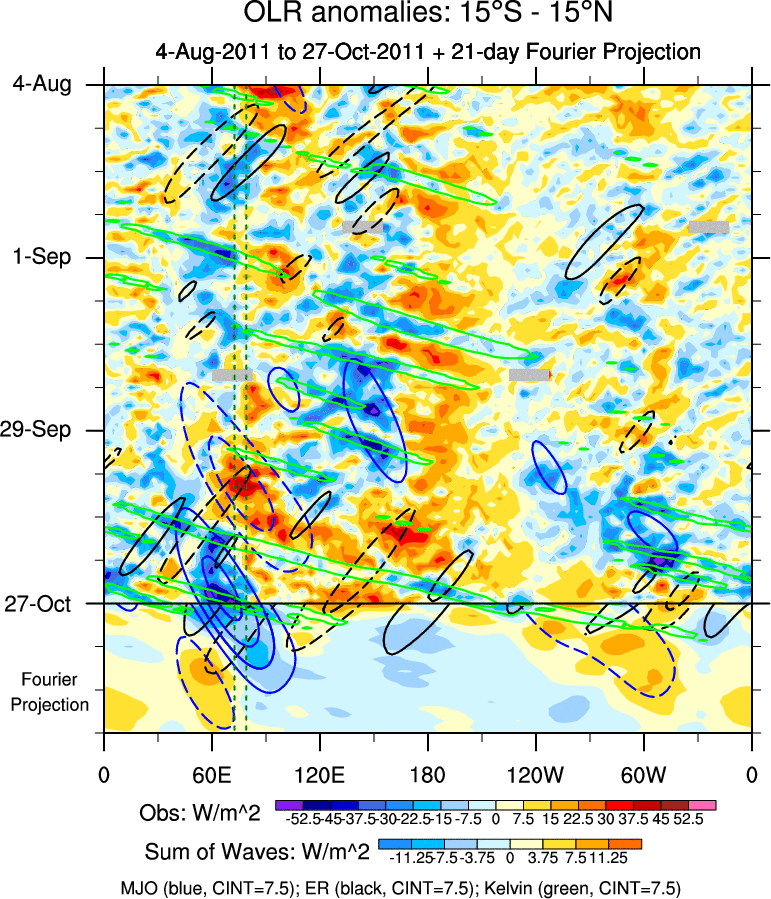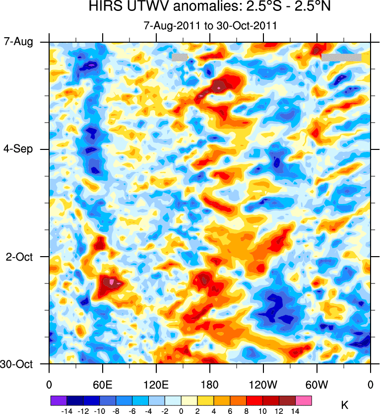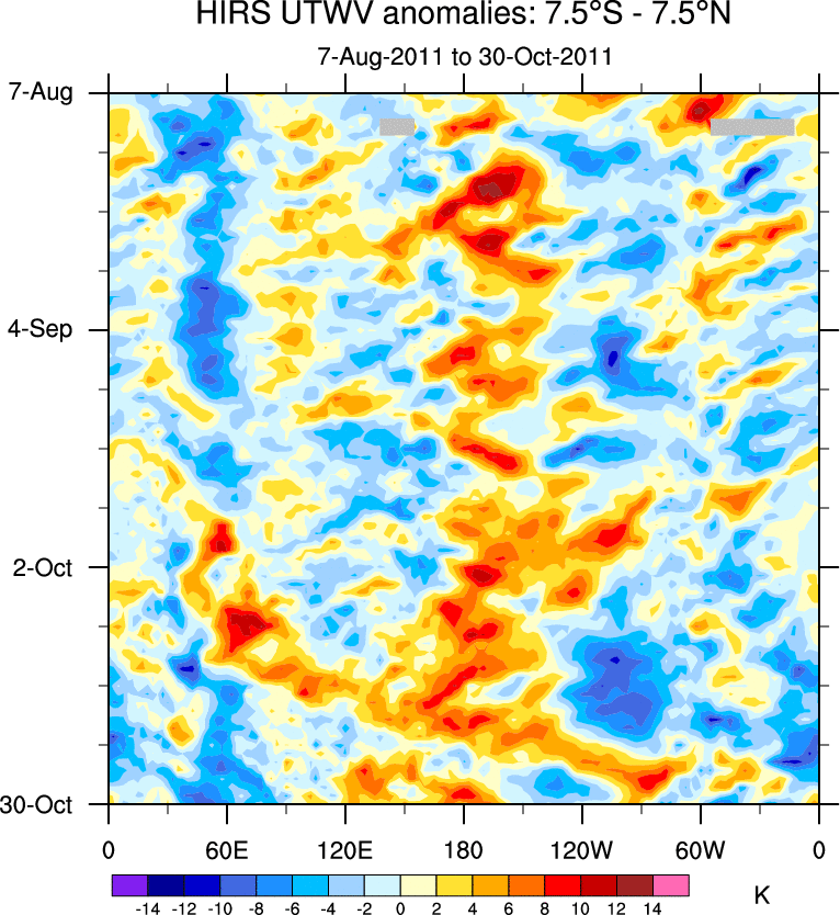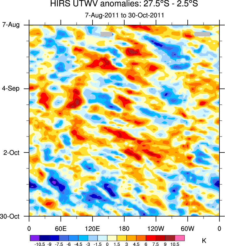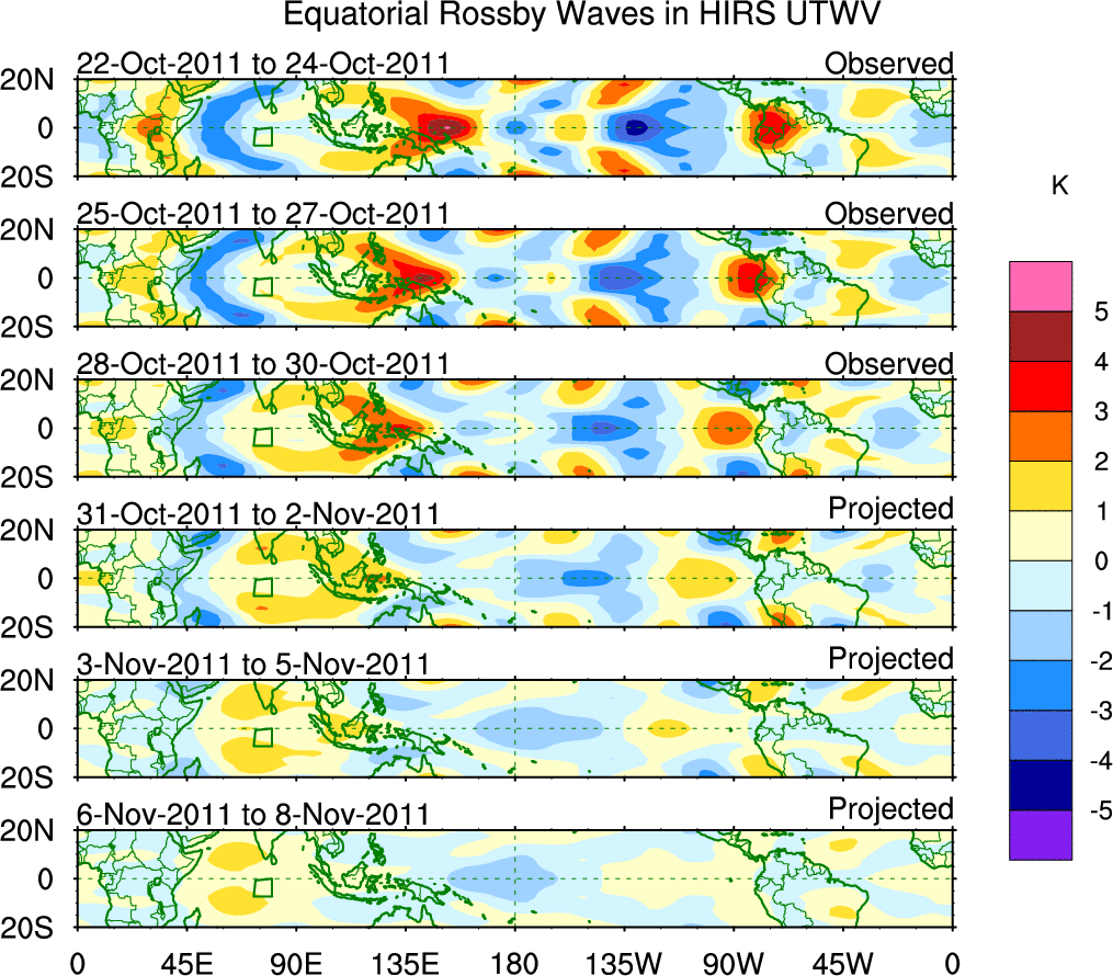 To identify tropical waves in near real-time, the OLR and UTWV data are filtered following Wheeler & Weickmann (2001 MWR). The daily anomalies are calculated using the first 3 harmonics of the seasonal cycle for 1979–2009. Missing values are then filled using linear interpolation in space and time. The most recent 365 days of anomalies are padded with 659 days of zeroes, and the result is filtered for each wave type.