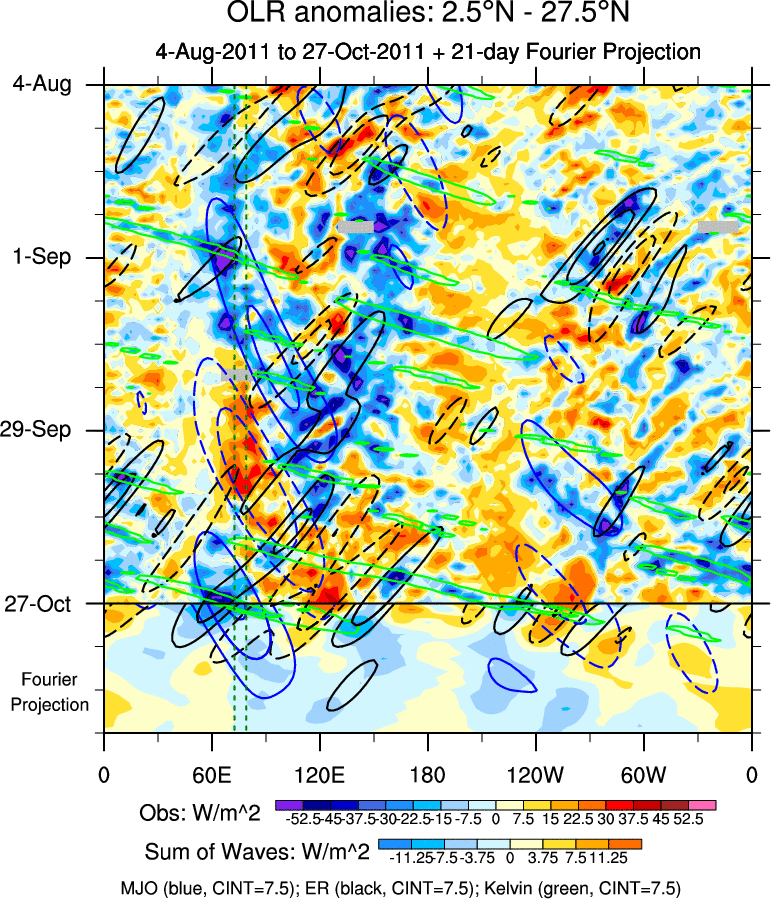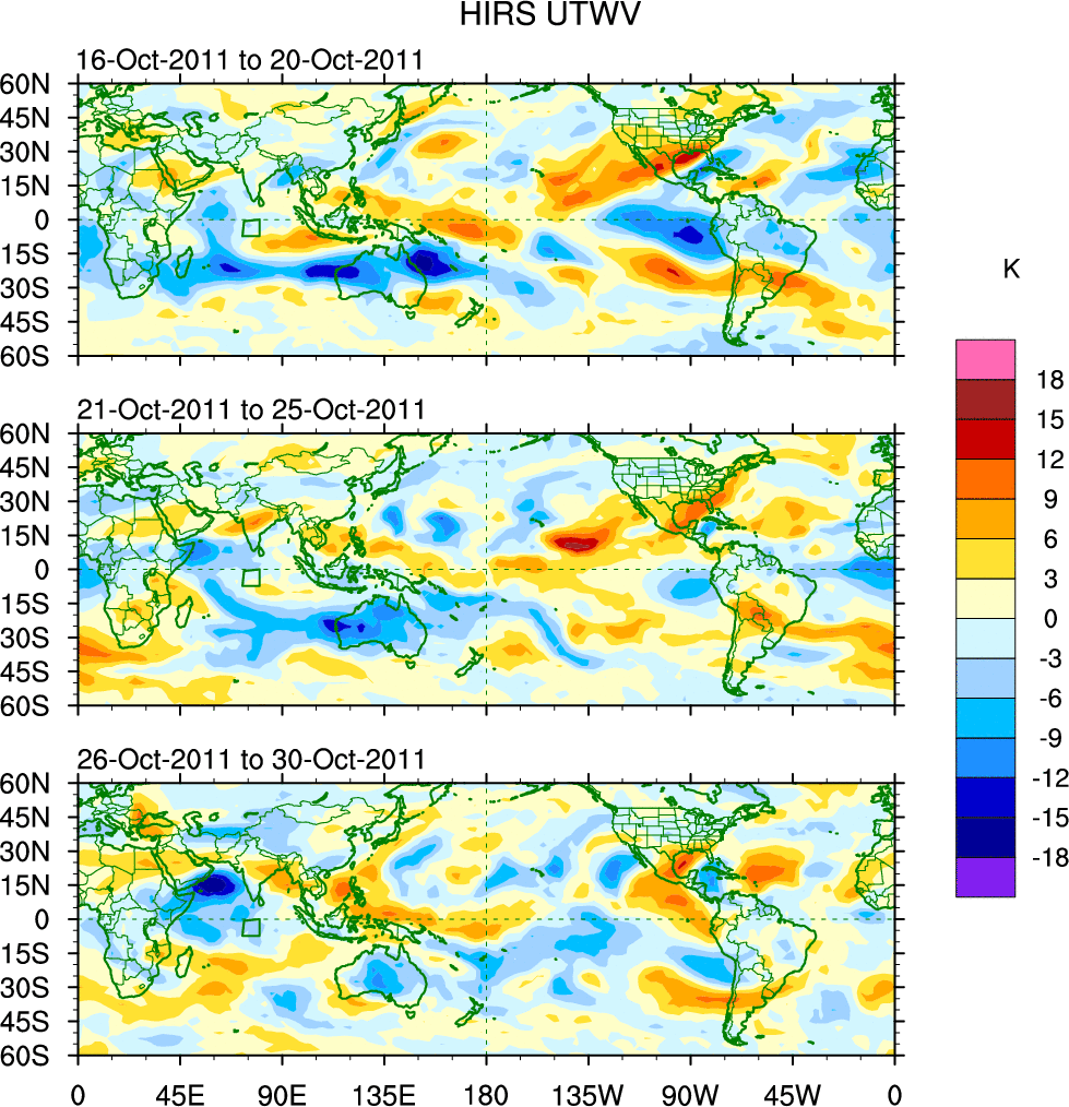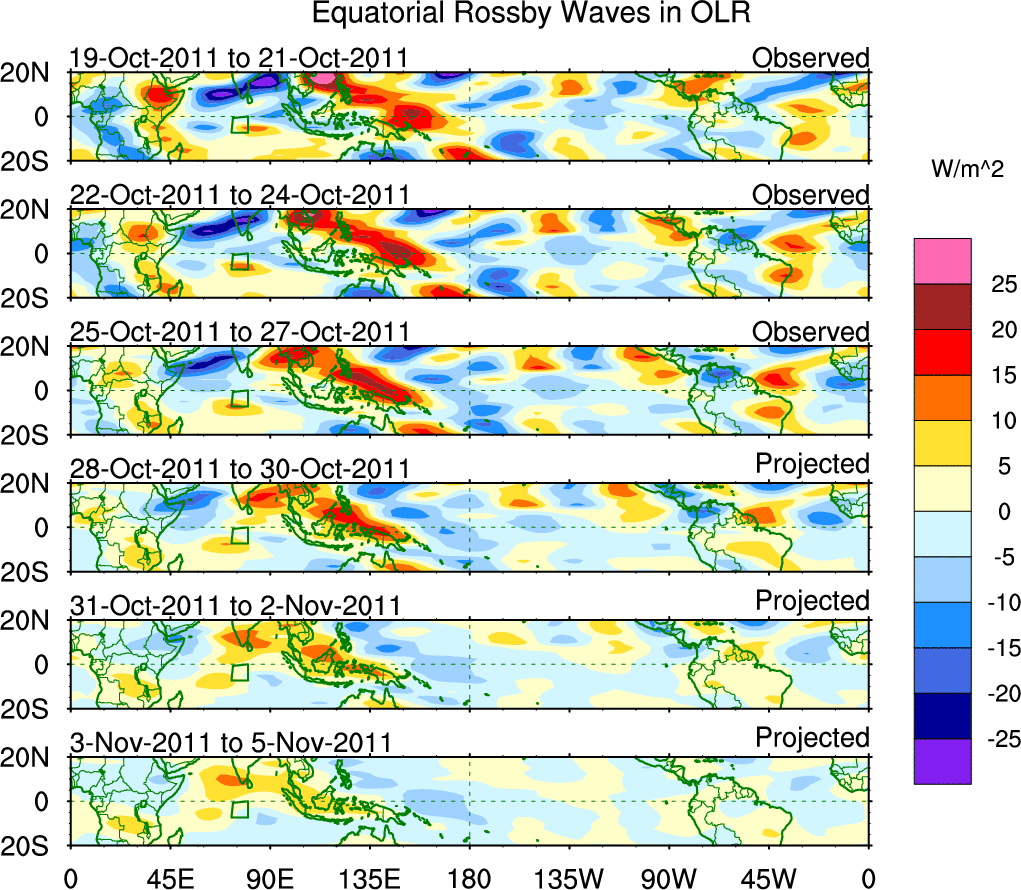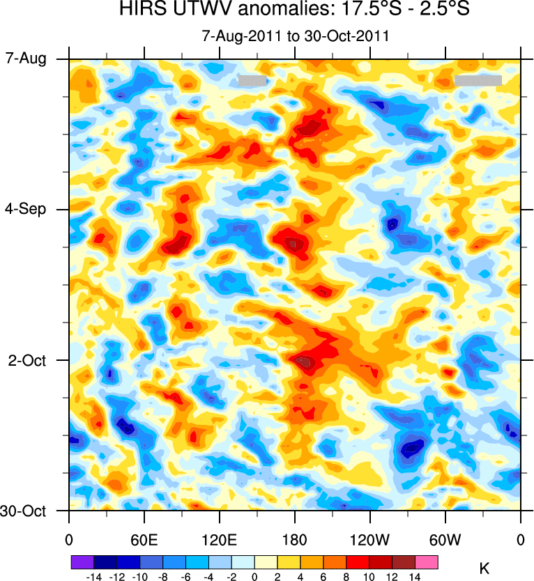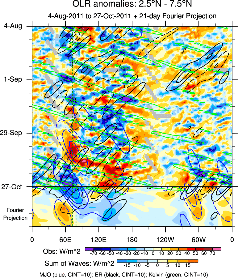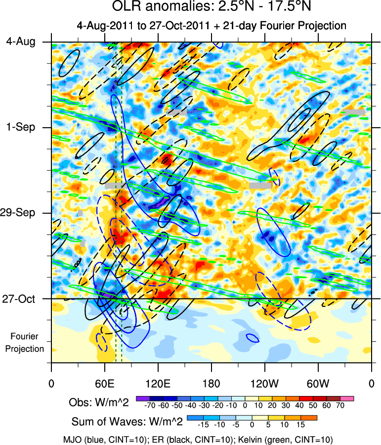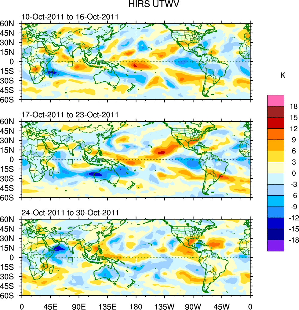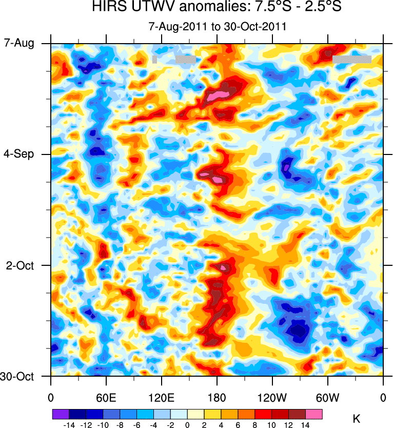 To identify tropical waves in near real-time, the OLR and UTWV data are filtered following Wheeler & Weickmann (2001 MWR). The daily anomalies are calculated using the first 3 harmonics of the seasonal cycle for 1979–2009. Missing values are then filled using linear interpolation in space and time. The most recent 365 days of anomalies are padded with 659 days of zeroes, and the result is filtered for each wave type.