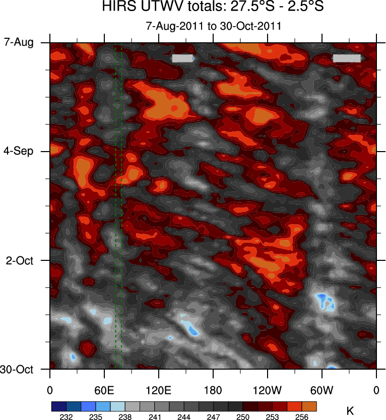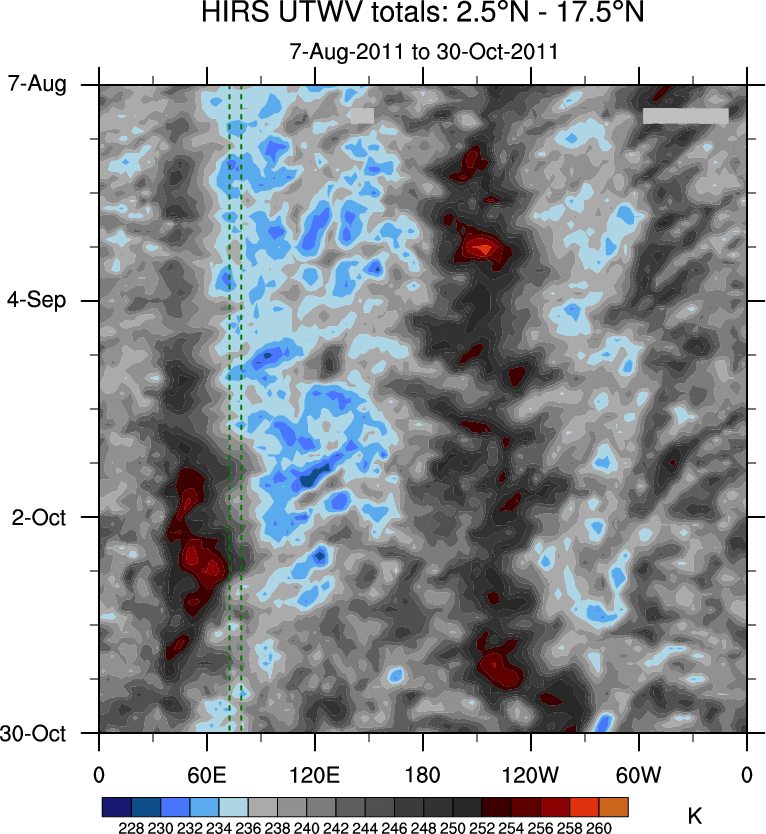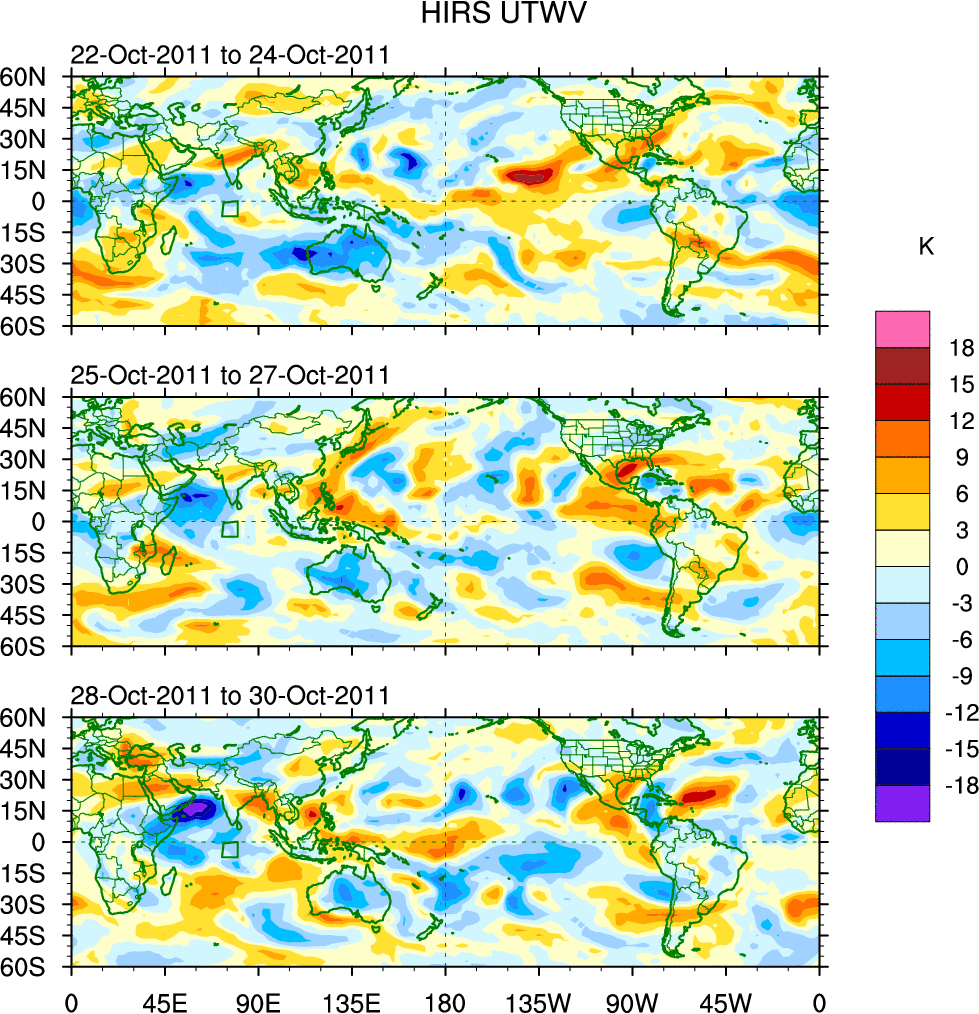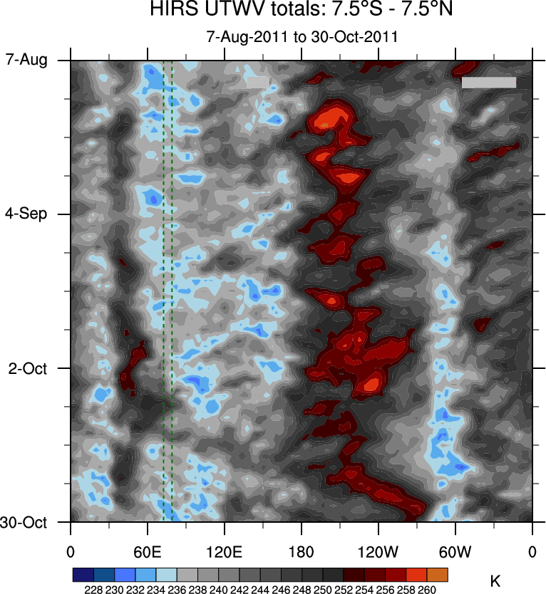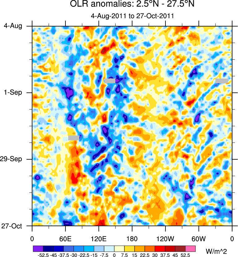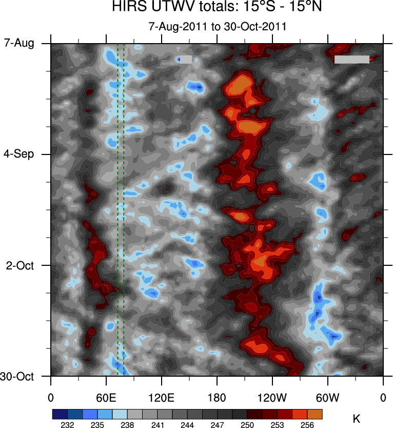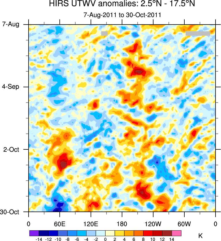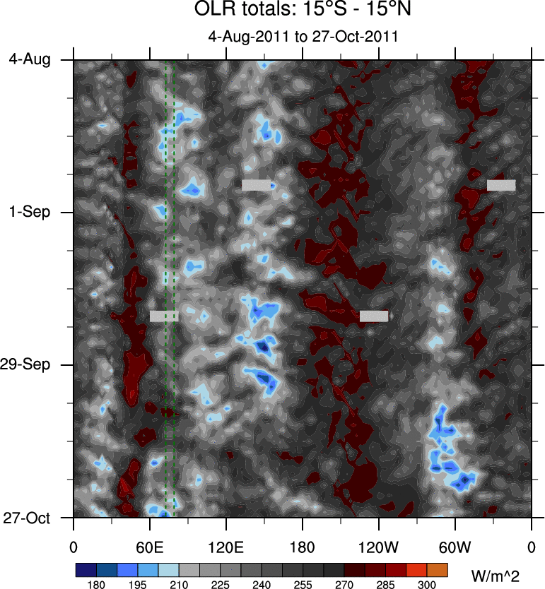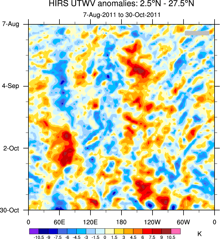 To identify tropical waves in near real-time, the OLR and UTWV data are filtered following Wheeler & Weickmann (2001 MWR). The daily anomalies are calculated using the first 3 harmonics of the seasonal cycle for 1979–2009. Missing values are then filled using linear interpolation in space and time. The most recent 365 days of anomalies are padded with 659 days of zeroes, and the result is filtered for each wave type.