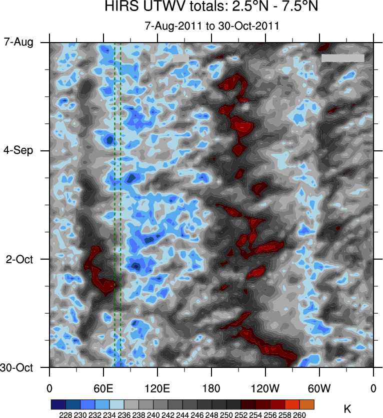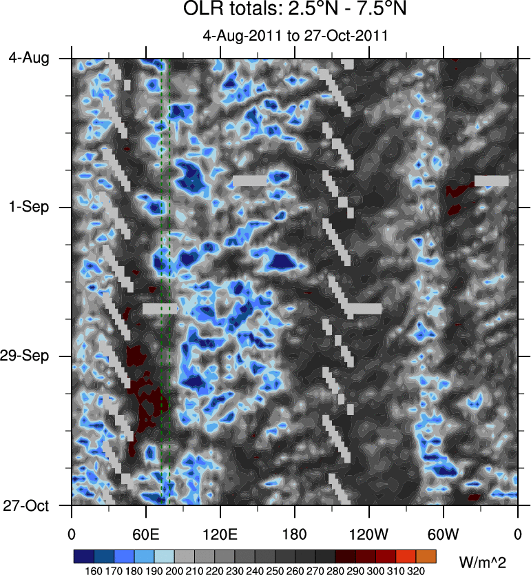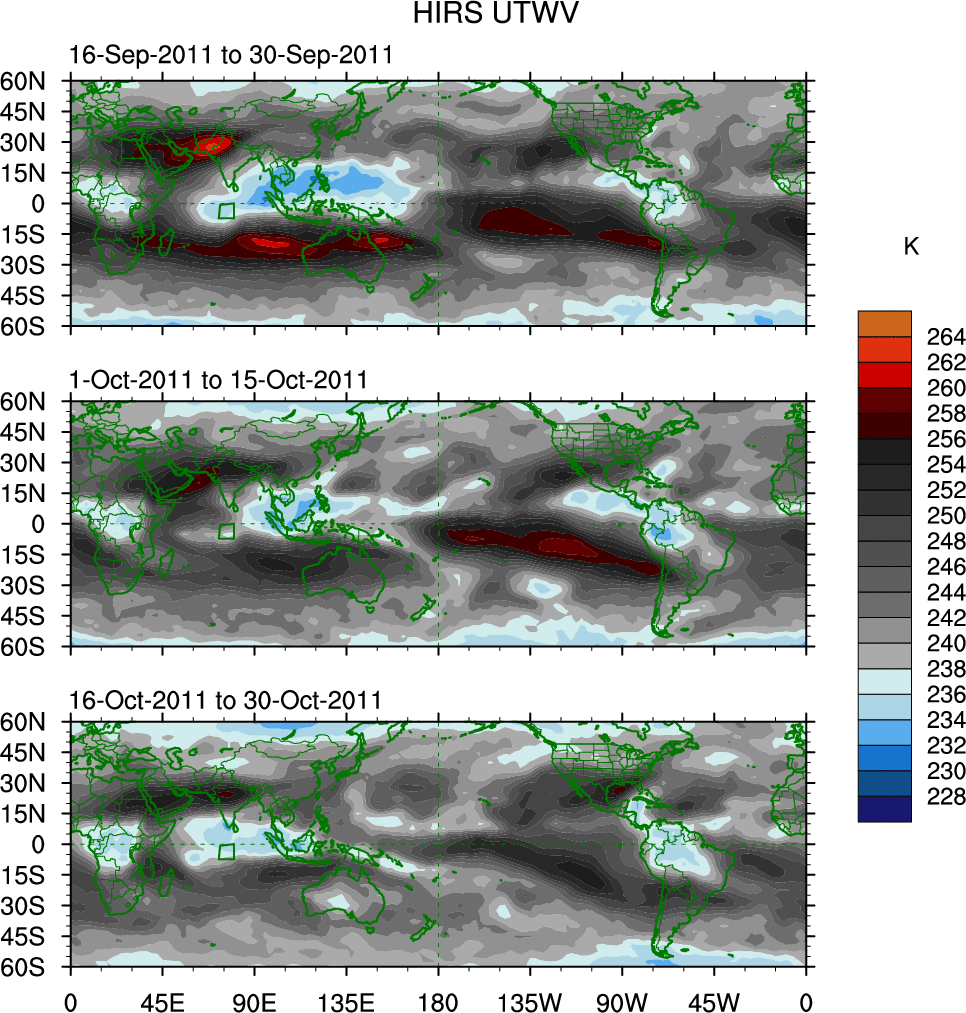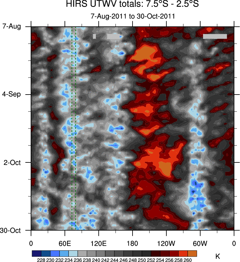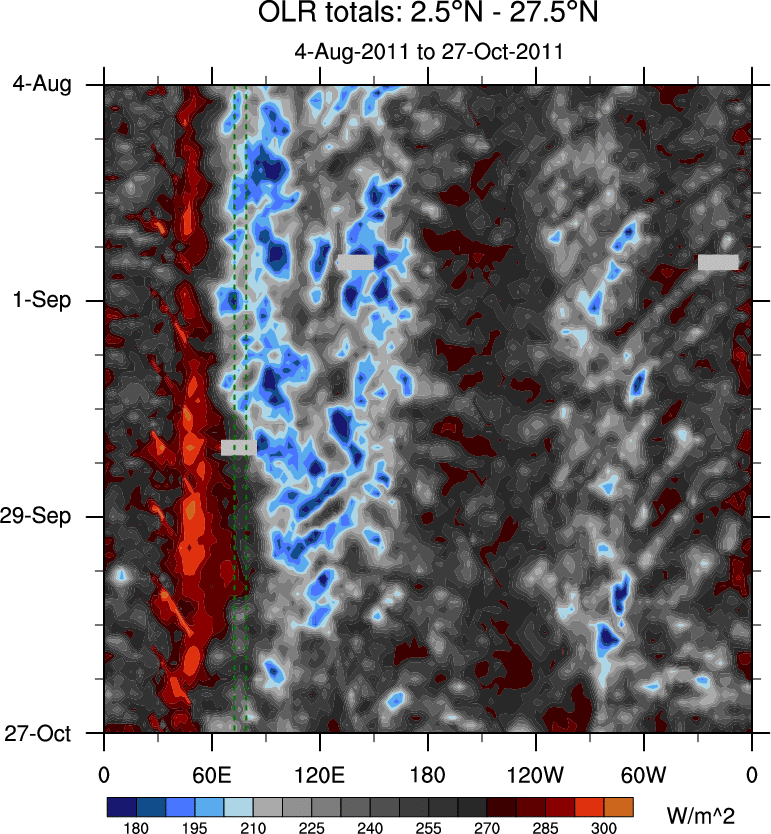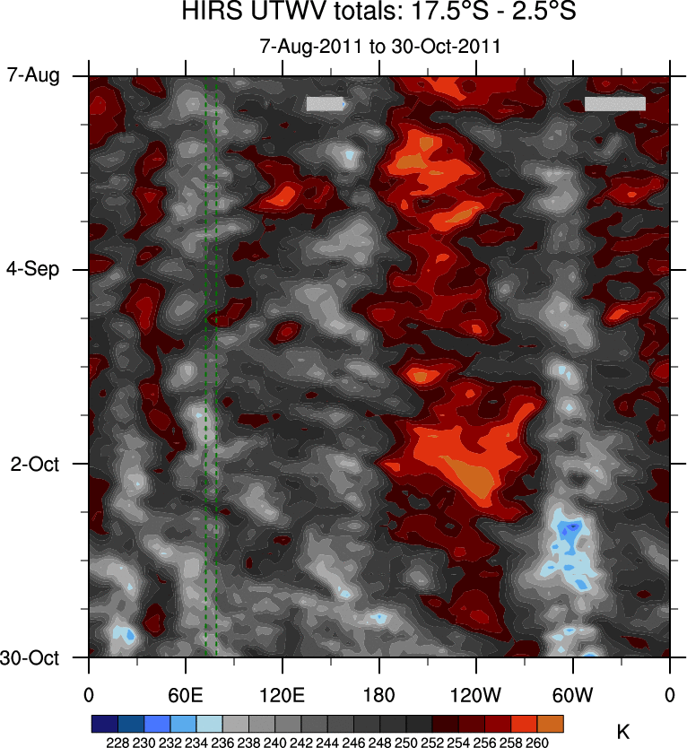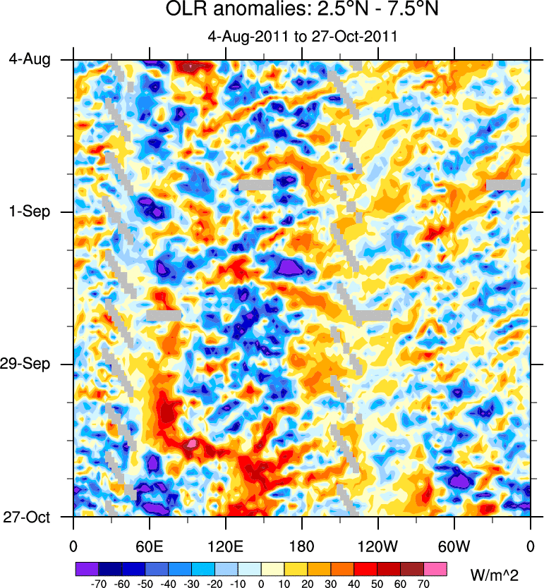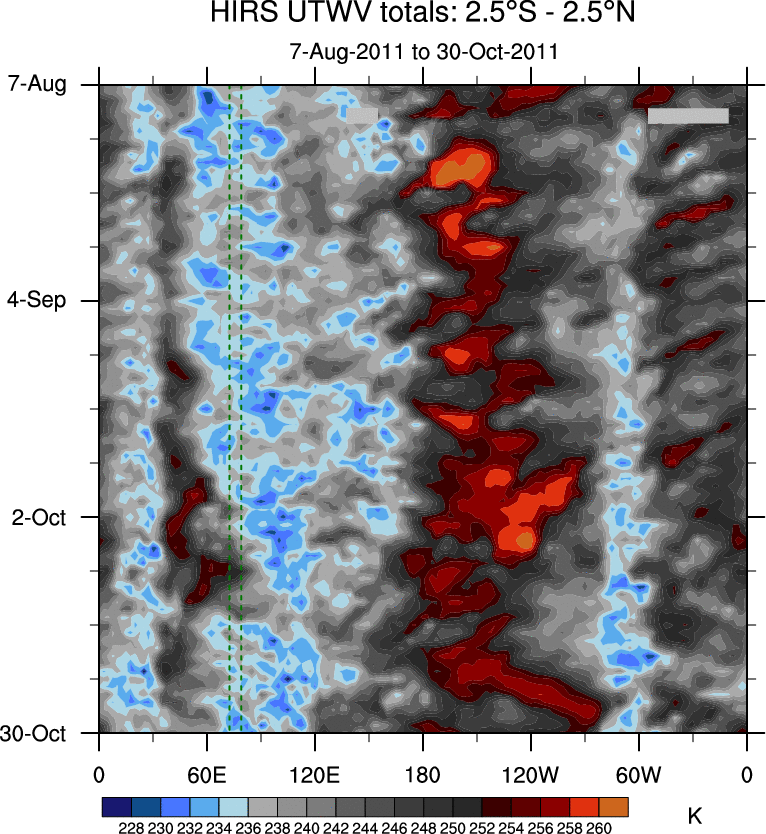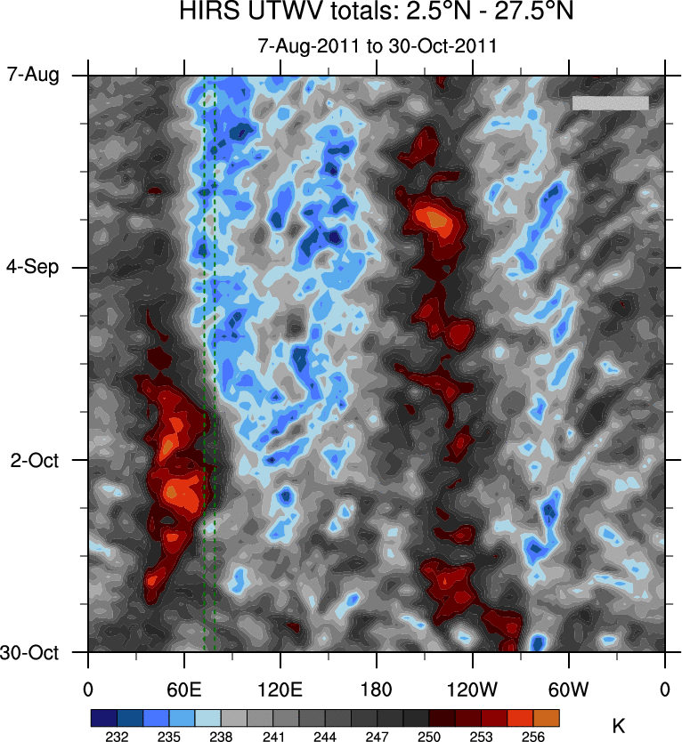 To identify tropical waves in near real-time, the OLR and UTWV data are filtered following Wheeler & Weickmann (2001 MWR). The daily anomalies are calculated using the first 3 harmonics of the seasonal cycle for 1979–2009. Missing values are then filled using linear interpolation in space and time. The most recent 365 days of anomalies are padded with 659 days of zeroes, and the result is filtered for each wave type.