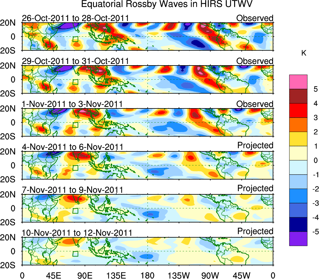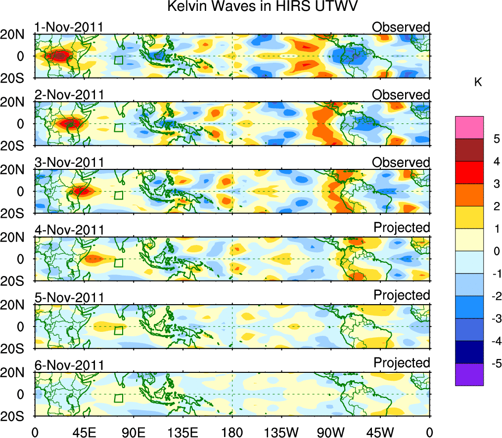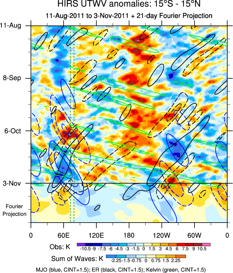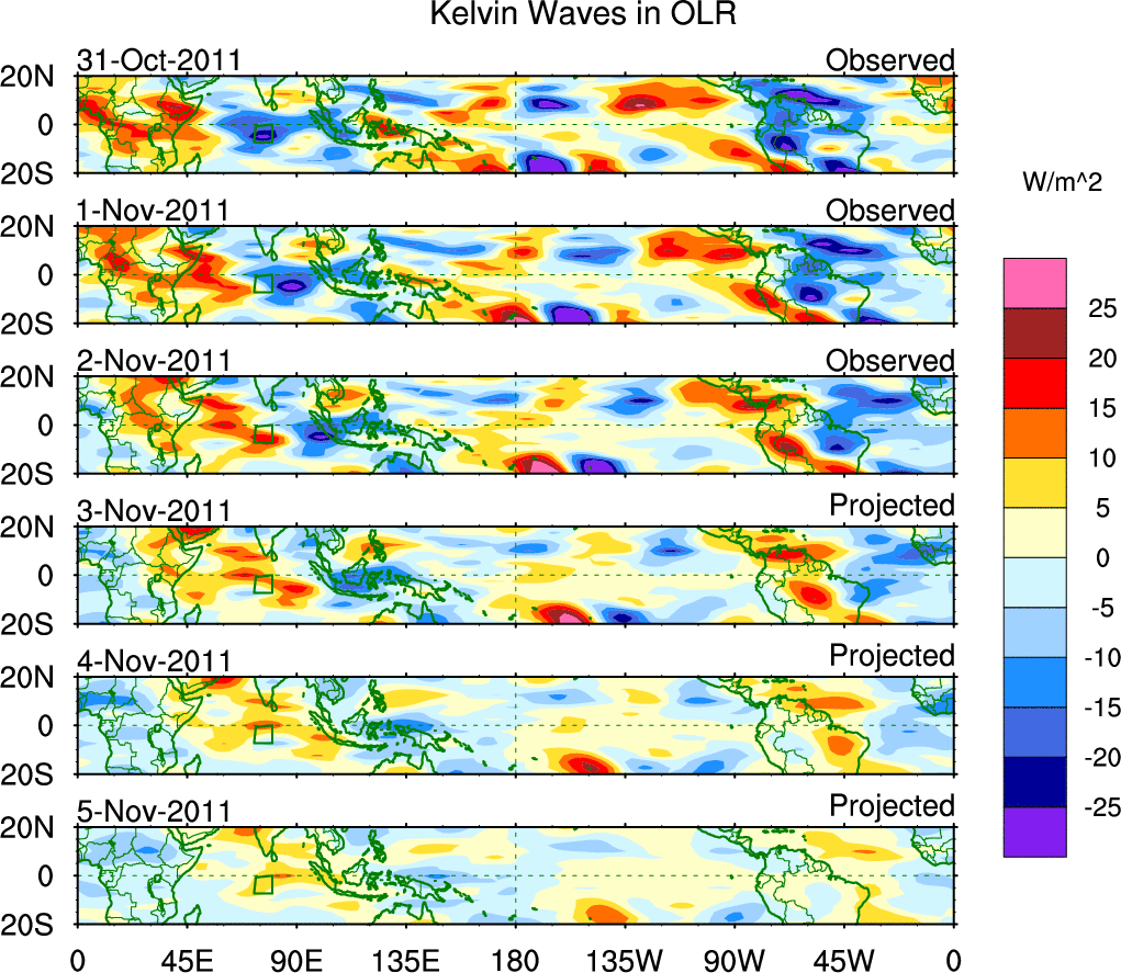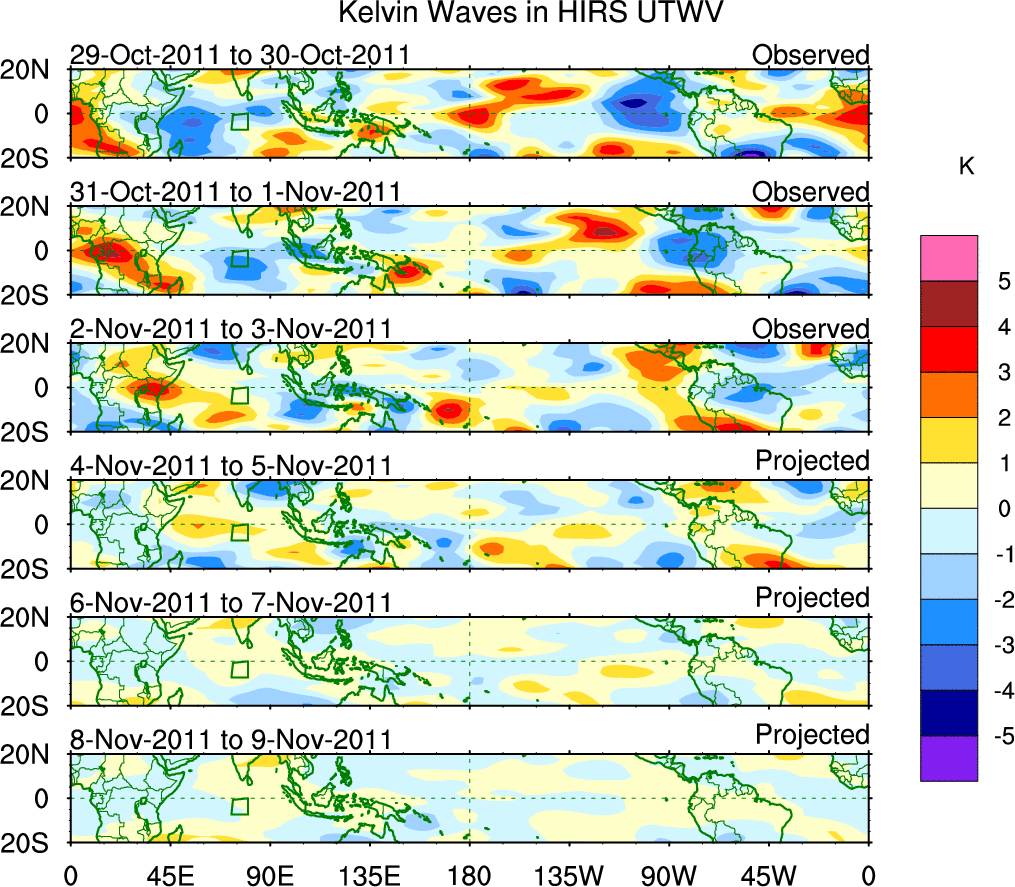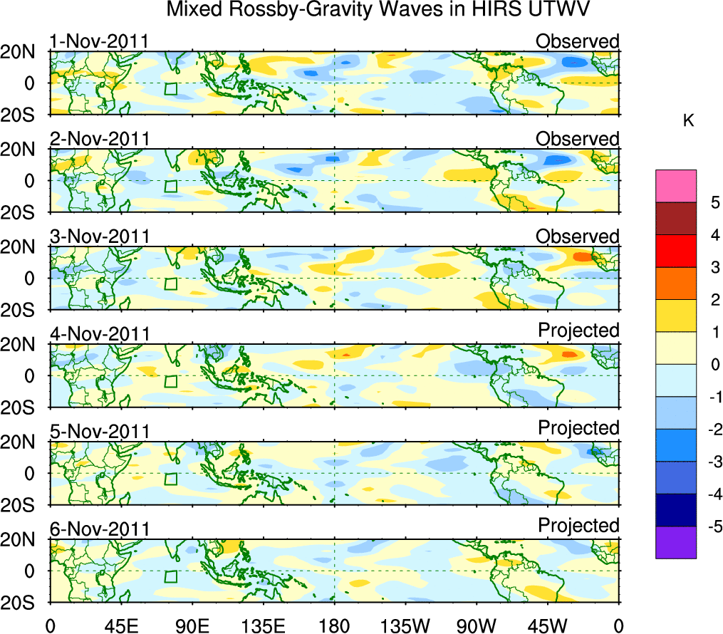 To identify tropical waves in near real-time, the OLR and UTWV data are filtered following Wheeler & Weickmann (2001 MWR). The daily anomalies are calculated using the first 3 harmonics of the seasonal cycle for 1979–2009. Missing values are then filled using linear interpolation in space and time. The most recent 365 days of anomalies are padded with 659 days of zeroes, and the result is filtered for each wave type.
