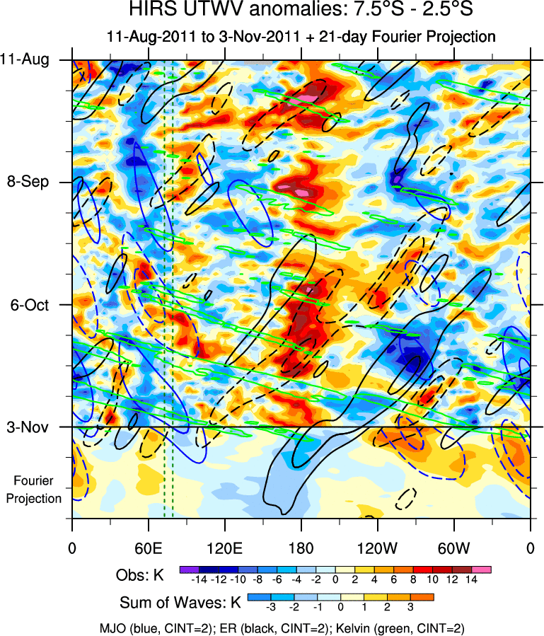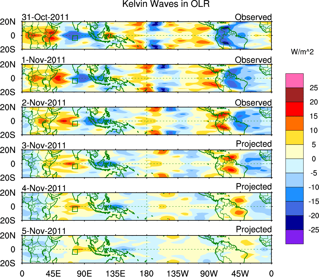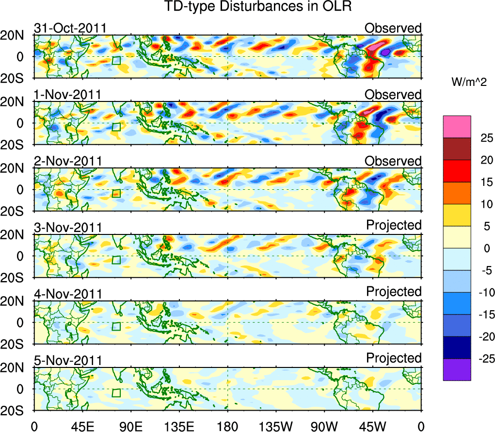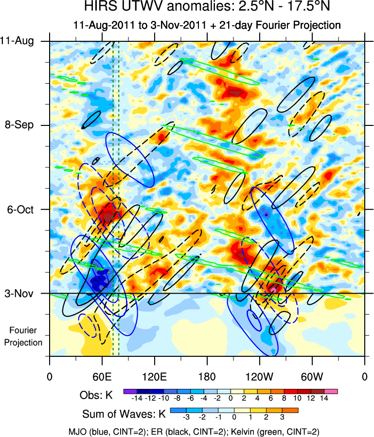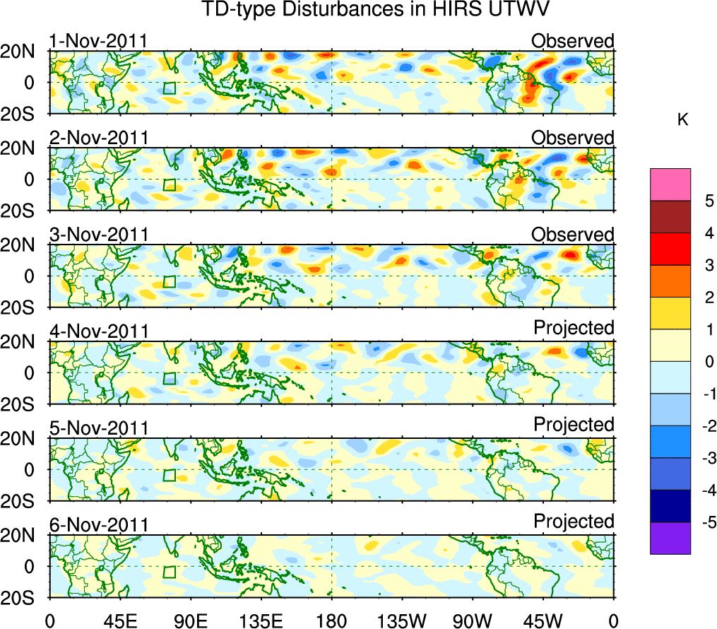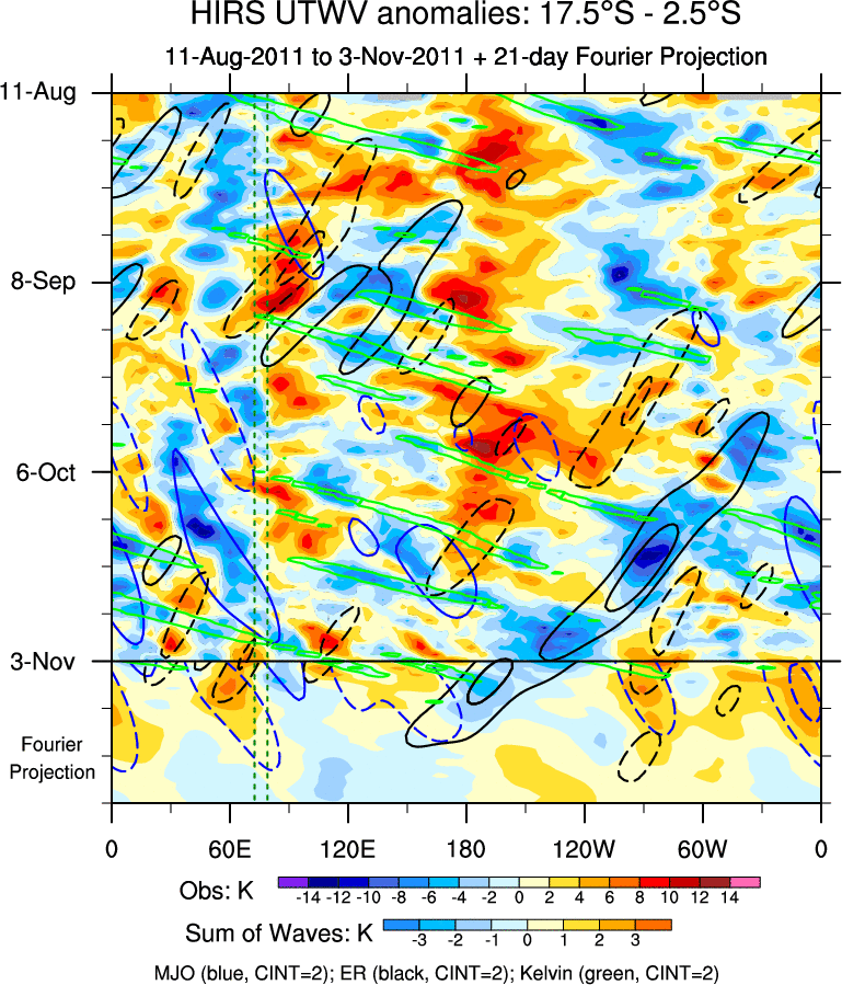 To identify tropical waves in near real-time, the OLR and UTWV data are filtered following Wheeler & Weickmann (2001 MWR). The daily anomalies are calculated using the first 3 harmonics of the seasonal cycle for 1979–2009. Missing values are then filled using linear interpolation in space and time. The most recent 365 days of anomalies are padded with 659 days of zeroes, and the result is filtered for each wave type.