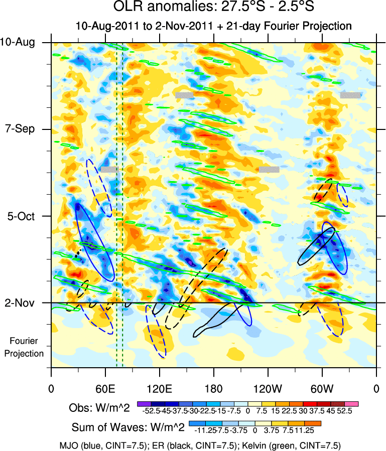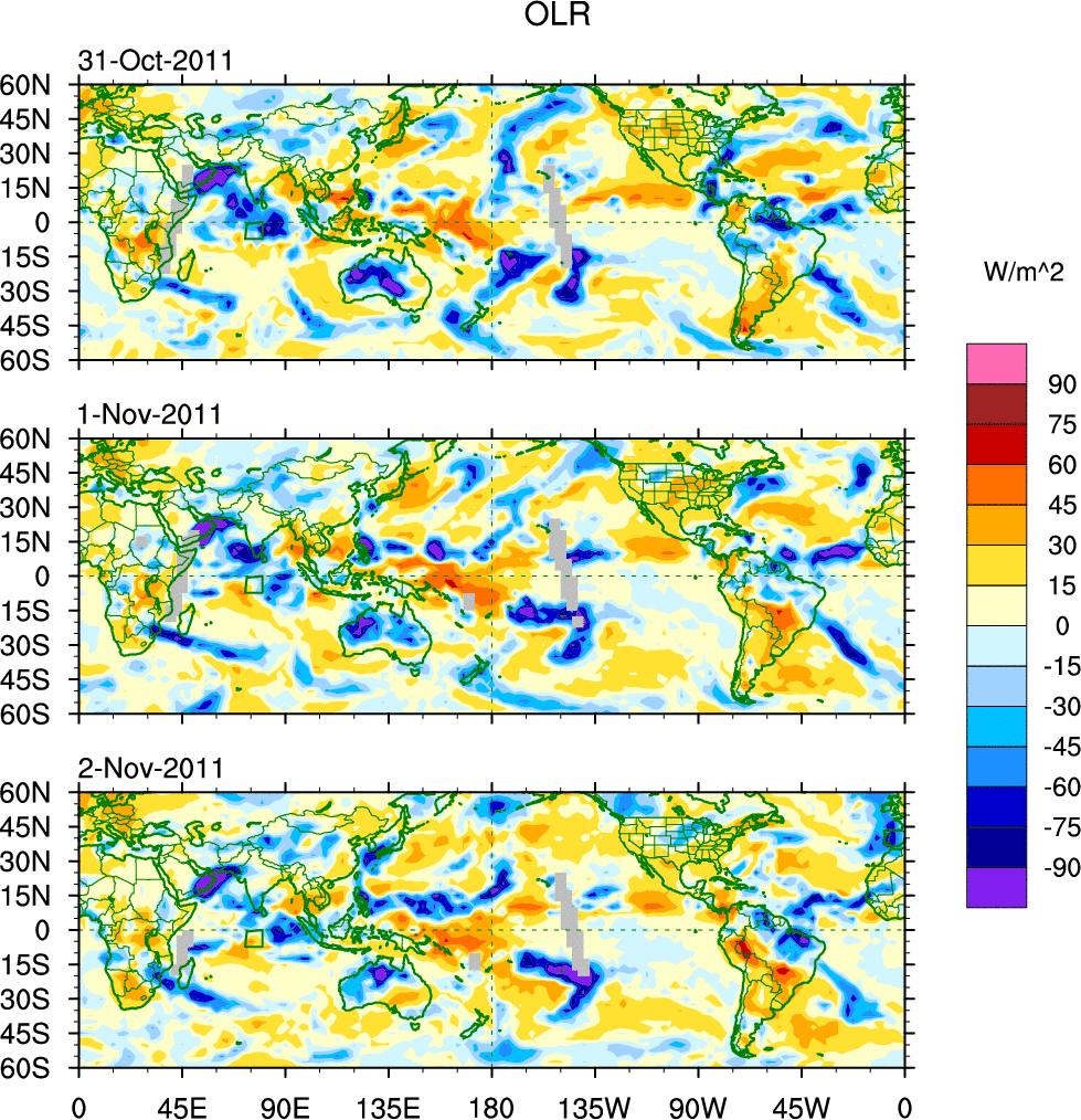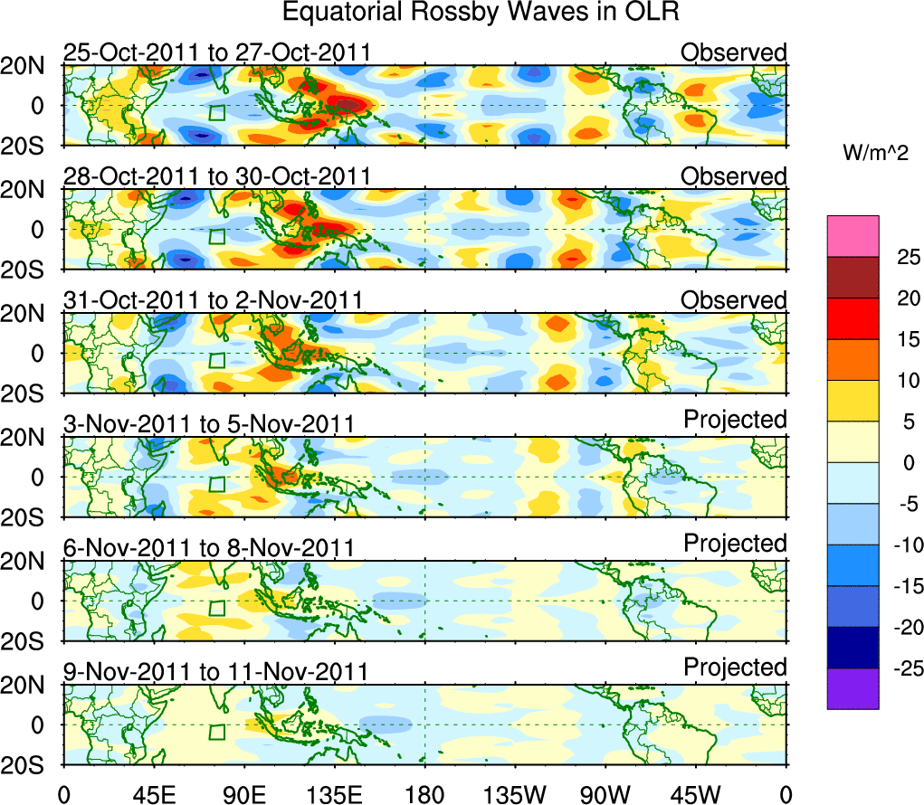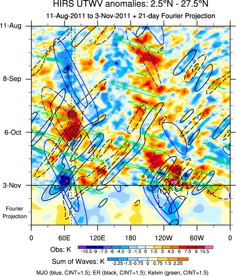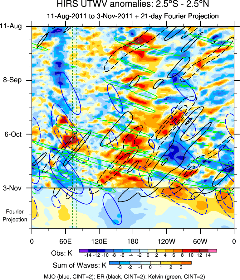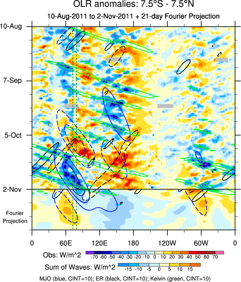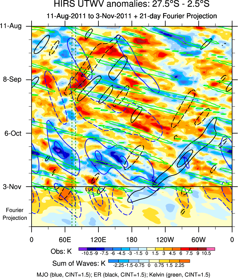 To identify tropical waves in near real-time, the OLR and UTWV data are filtered following Wheeler & Weickmann (2001 MWR). The daily anomalies are calculated using the first 3 harmonics of the seasonal cycle for 1979–2009. Missing values are then filled using linear interpolation in space and time. The most recent 365 days of anomalies are padded with 659 days of zeroes, and the result is filtered for each wave type.