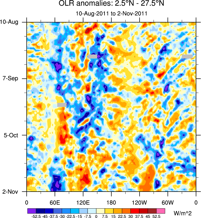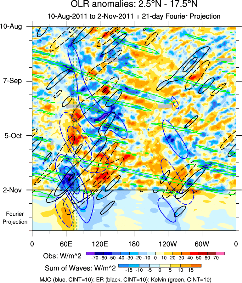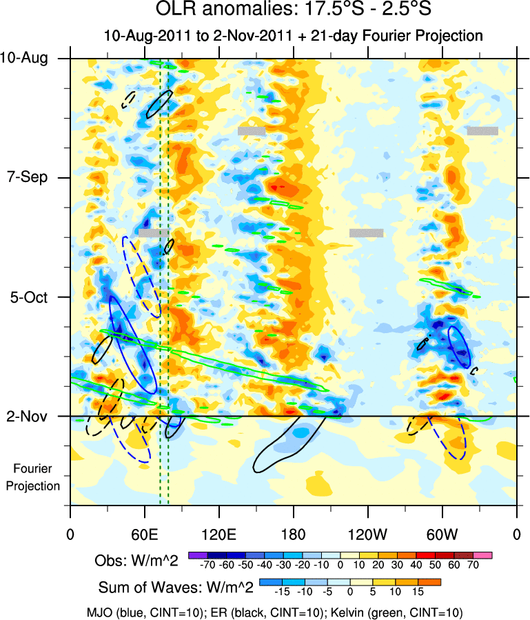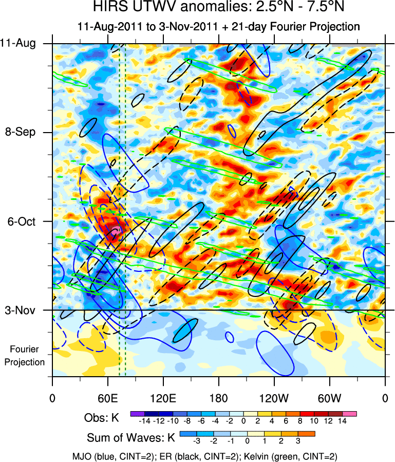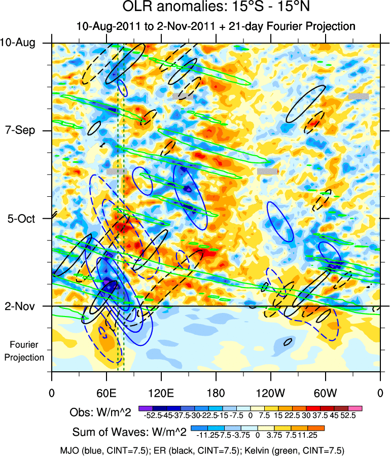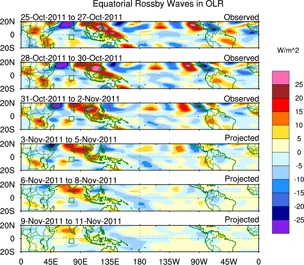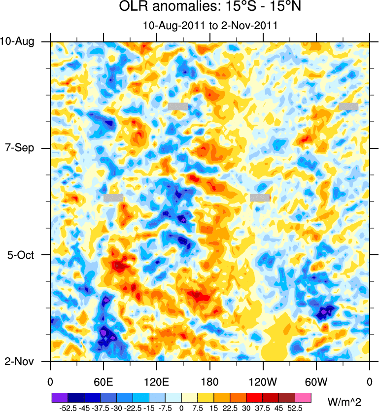 To identify tropical waves in near real-time, the OLR and UTWV data are filtered following Wheeler & Weickmann (2001 MWR). The daily anomalies are calculated using the first 3 harmonics of the seasonal cycle for 1979–2009. Missing values are then filled using linear interpolation in space and time. The most recent 365 days of anomalies are padded with 659 days of zeroes, and the result is filtered for each wave type.