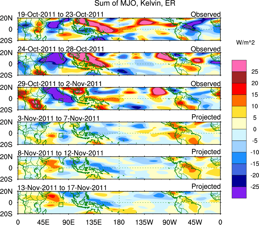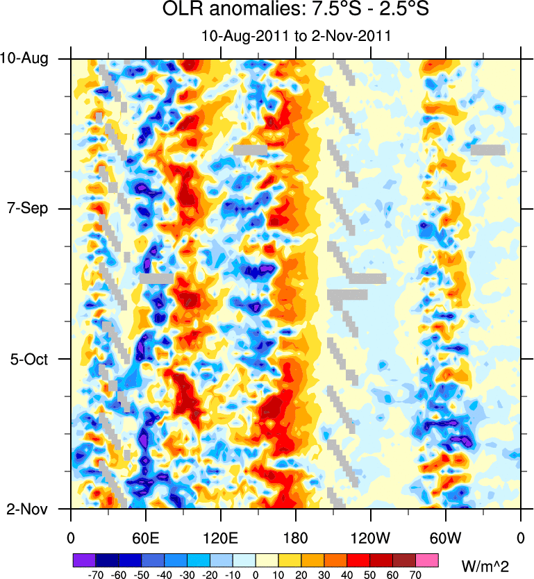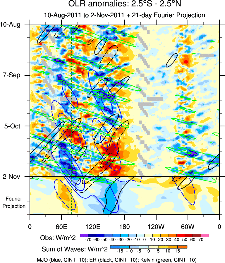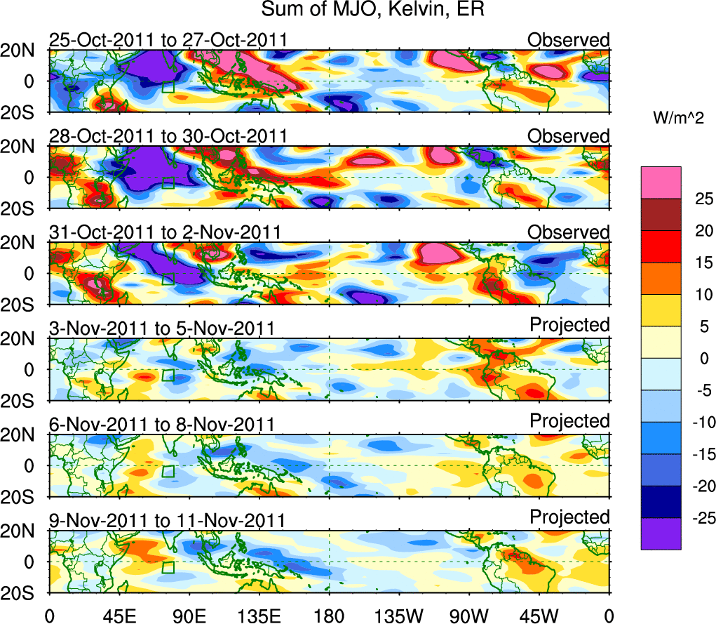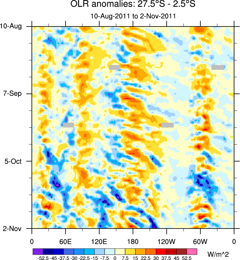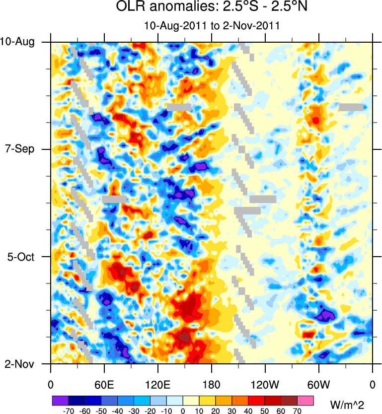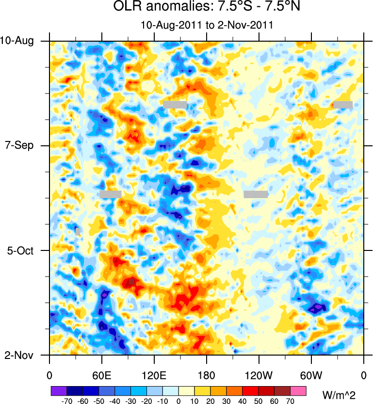 To identify tropical waves in near real-time, the OLR and UTWV data are filtered following Wheeler & Weickmann (2001 MWR). The daily anomalies are calculated using the first 3 harmonics of the seasonal cycle for 1979–2009. Missing values are then filled using linear interpolation in space and time. The most recent 365 days of anomalies are padded with 659 days of zeroes, and the result is filtered for each wave type.