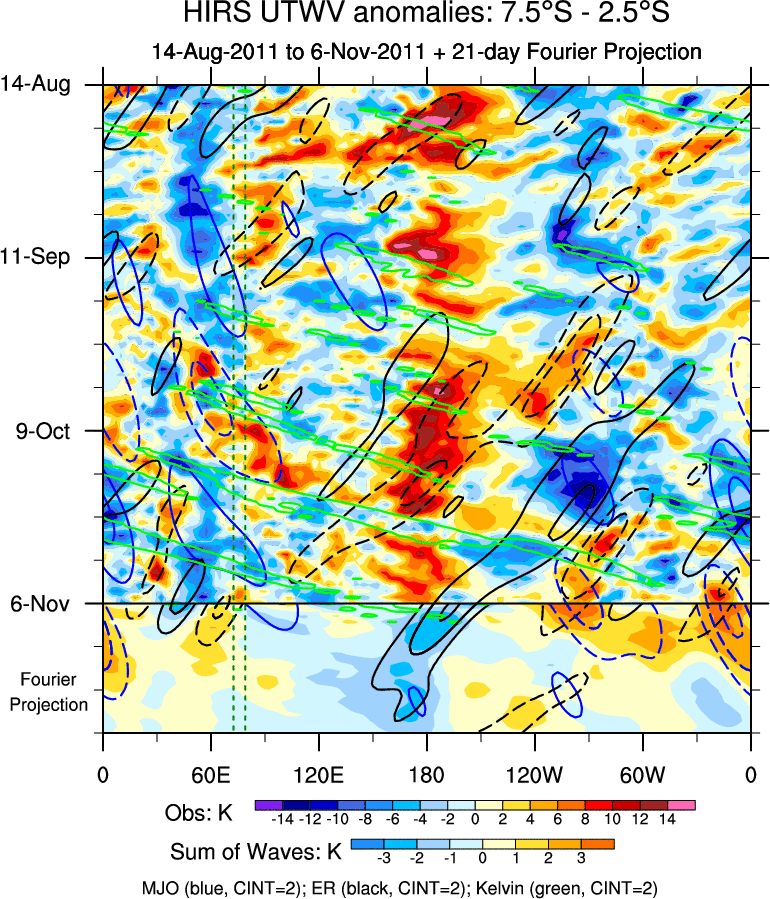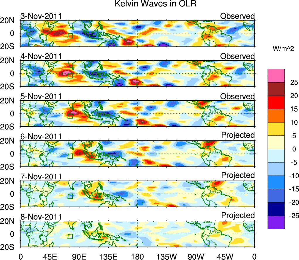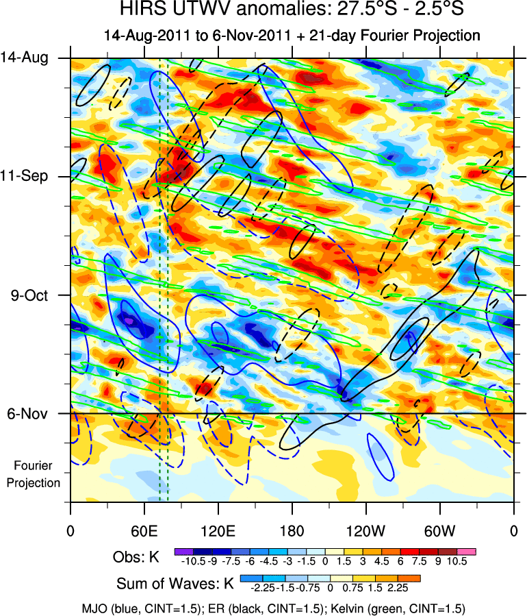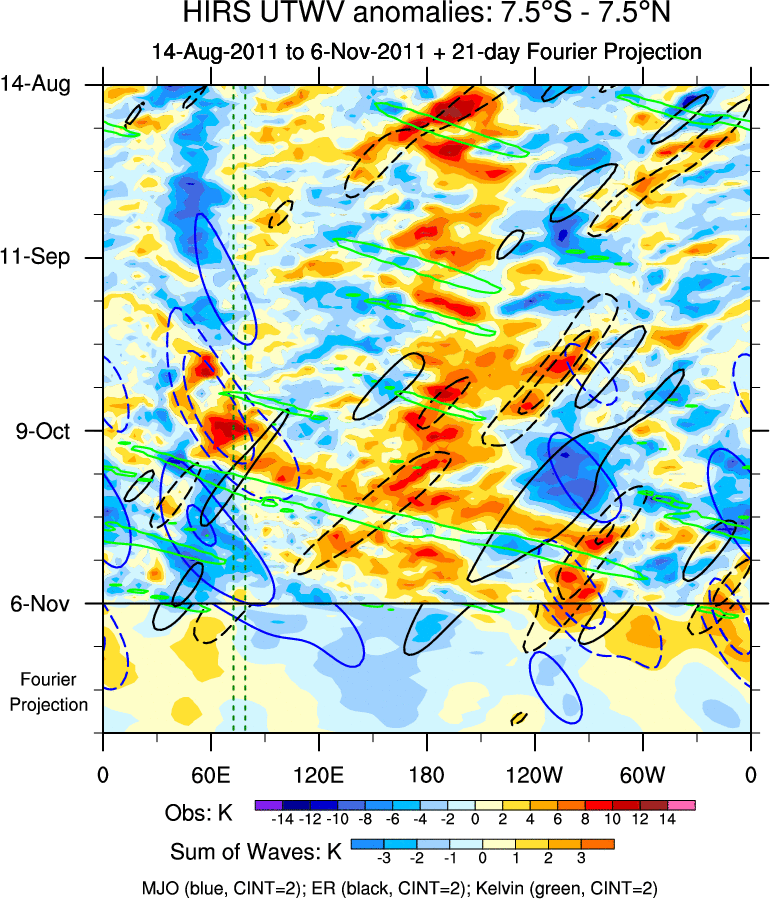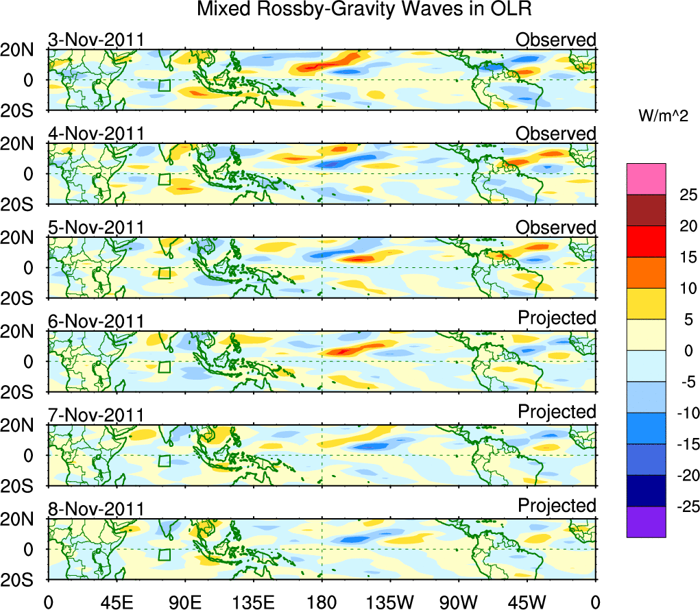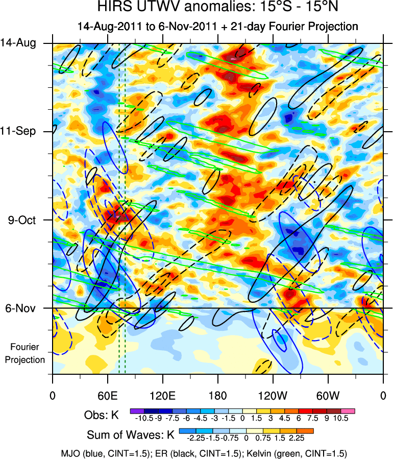 To identify tropical waves in near real-time, the OLR and UTWV data are filtered following Wheeler & Weickmann (2001 MWR). The daily anomalies are calculated using the first 3 harmonics of the seasonal cycle for 1979–2009. Missing values are then filled using linear interpolation in space and time. The most recent 365 days of anomalies are padded with 659 days of zeroes, and the result is filtered for each wave type.