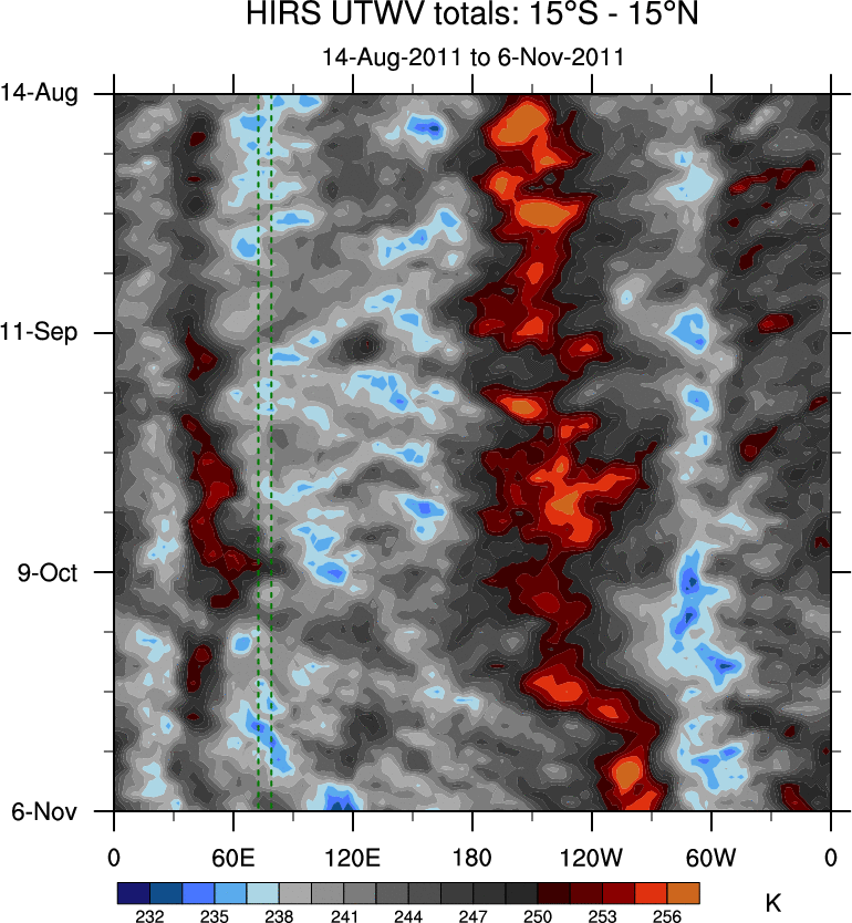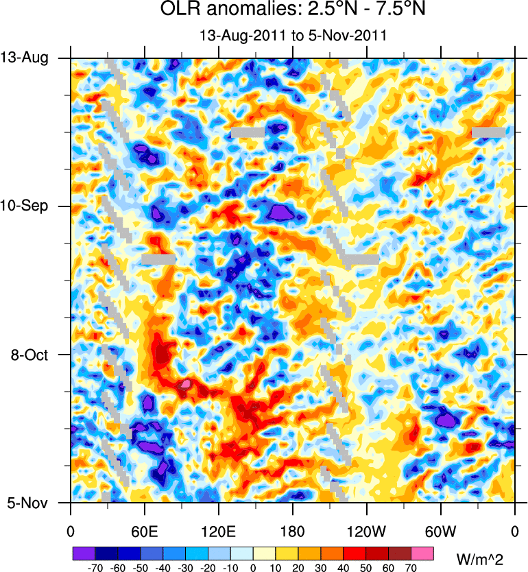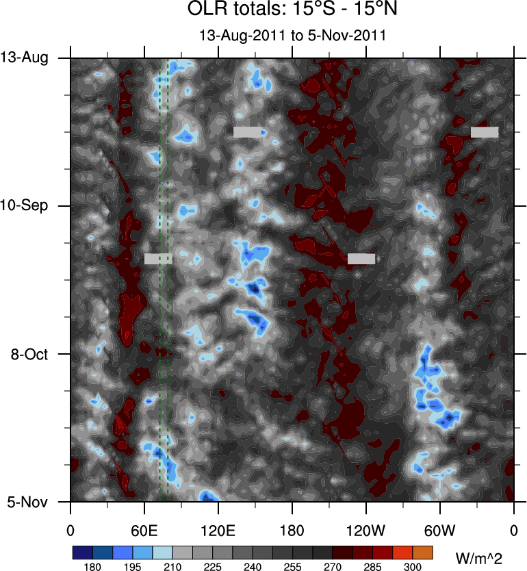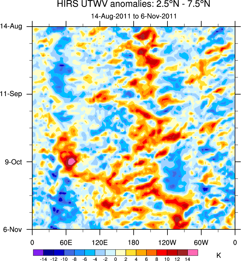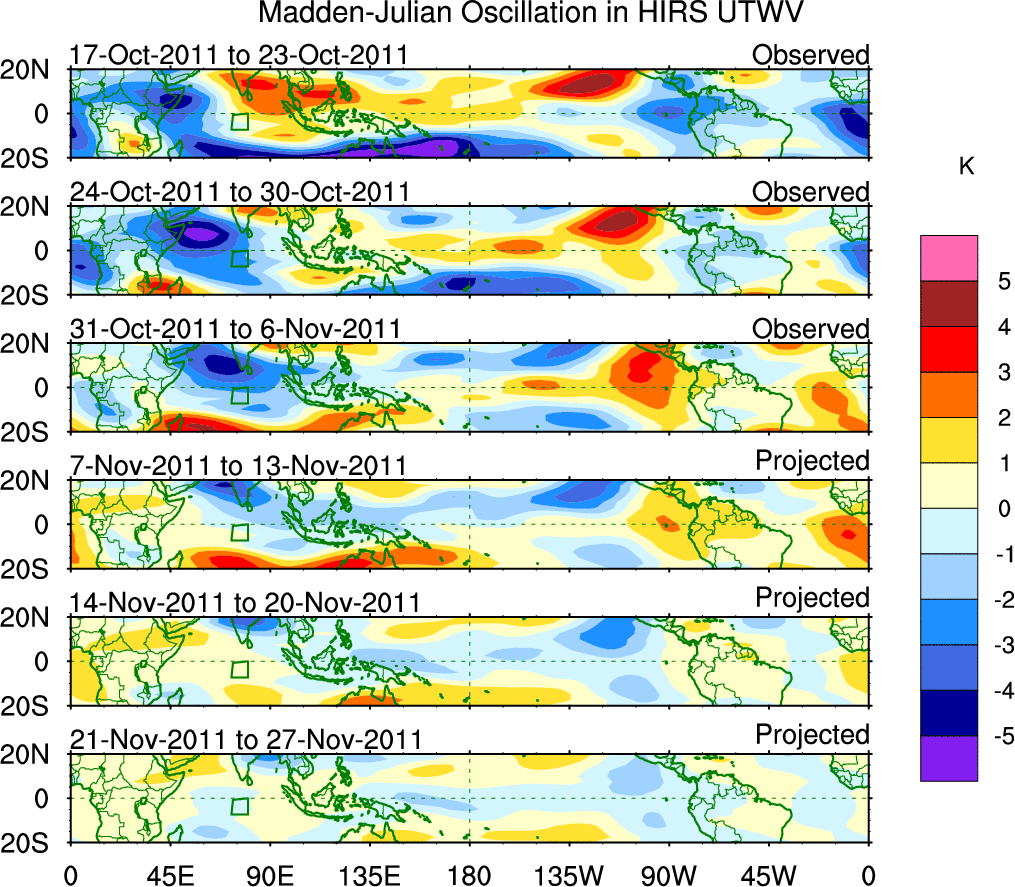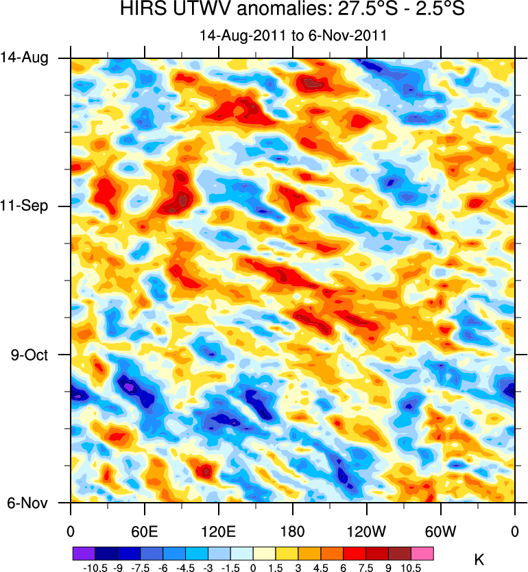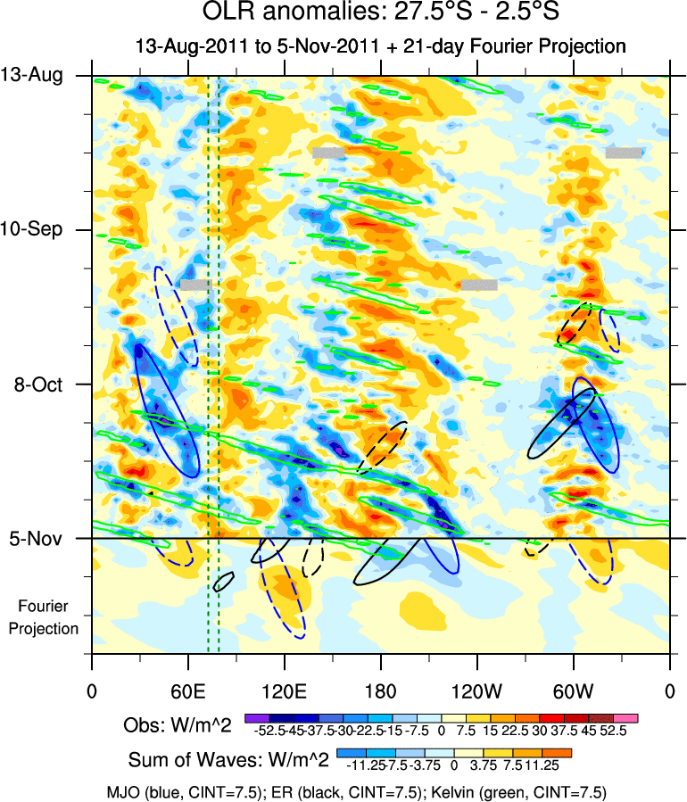 To identify tropical waves in near real-time, the OLR and UTWV data are filtered following Wheeler & Weickmann (2001 MWR). The daily anomalies are calculated using the first 3 harmonics of the seasonal cycle for 1979–2009. Missing values are then filled using linear interpolation in space and time. The most recent 365 days of anomalies are padded with 659 days of zeroes, and the result is filtered for each wave type.