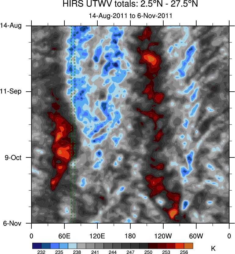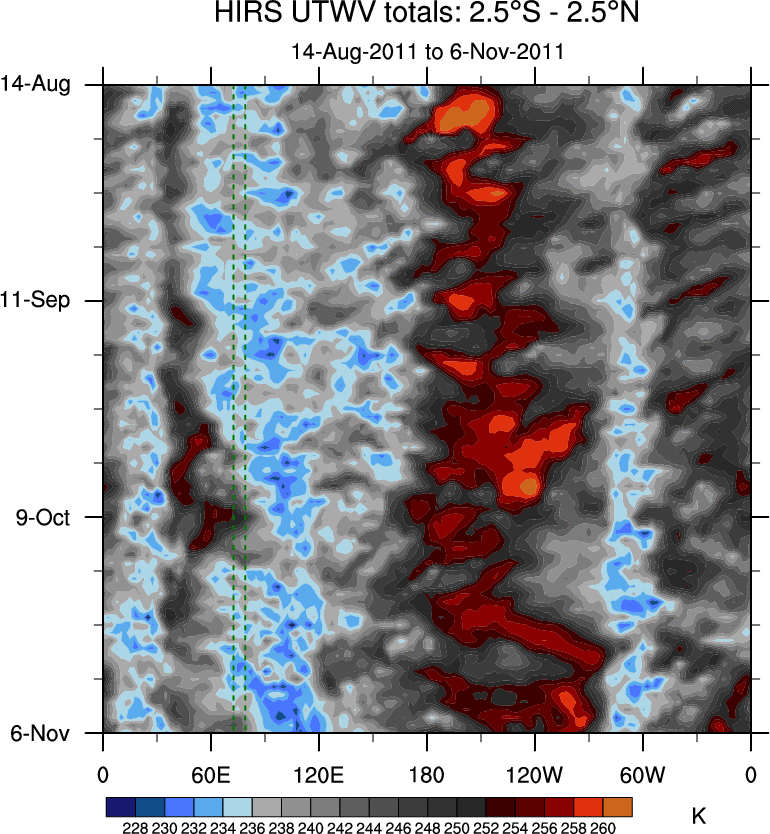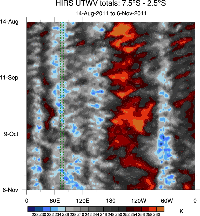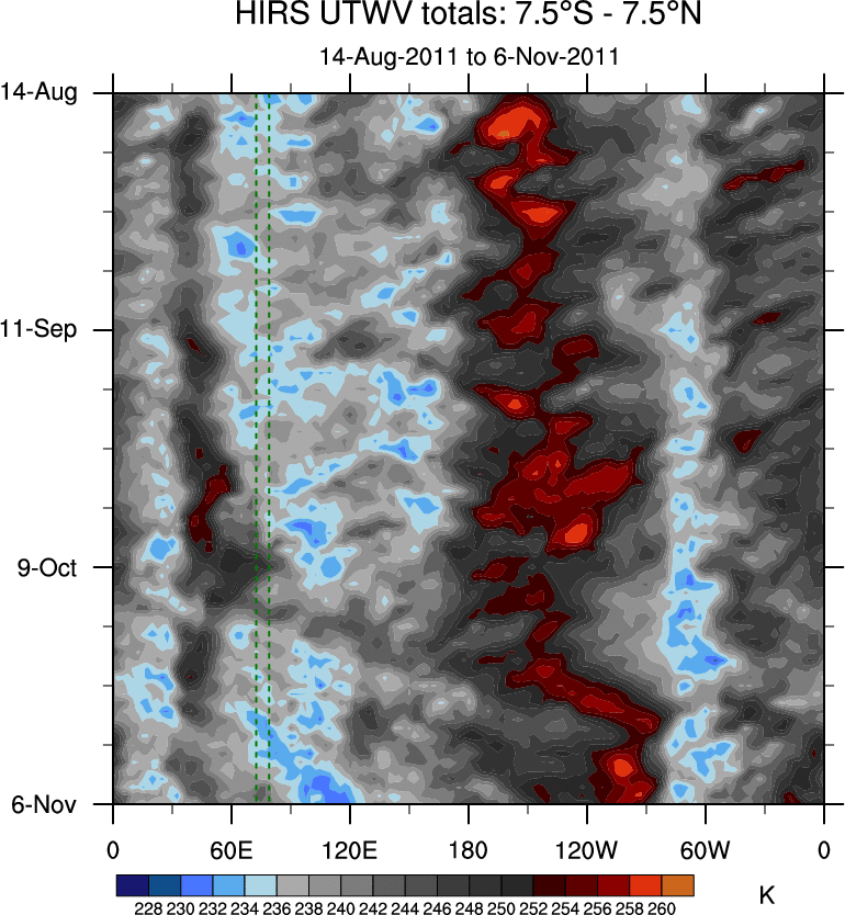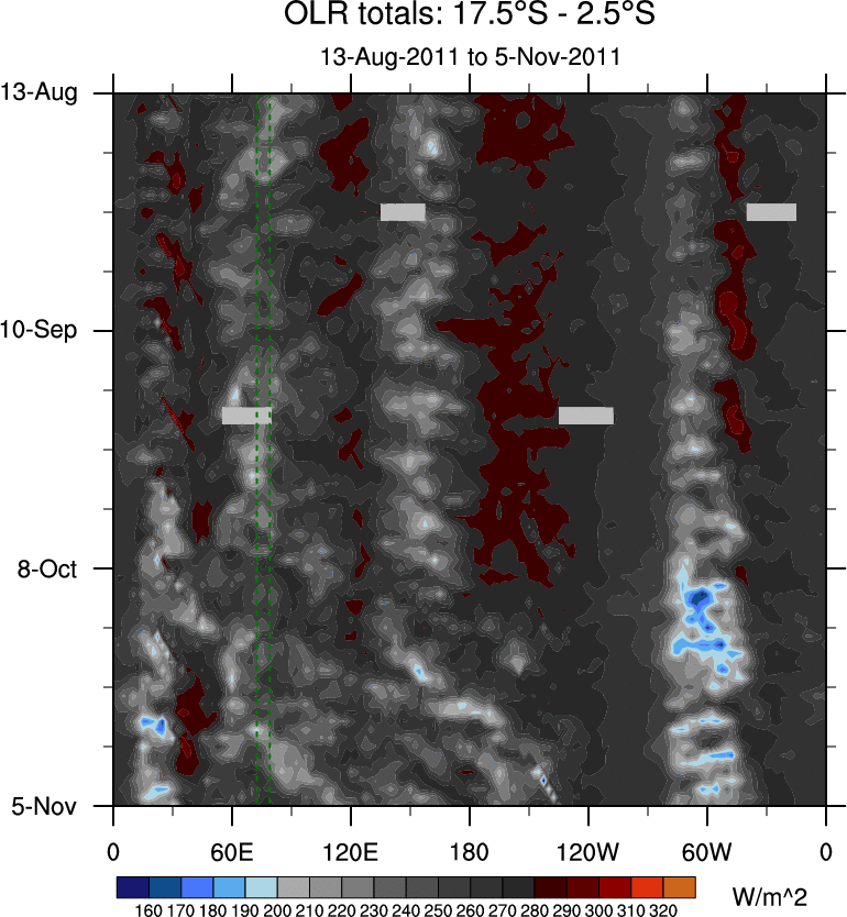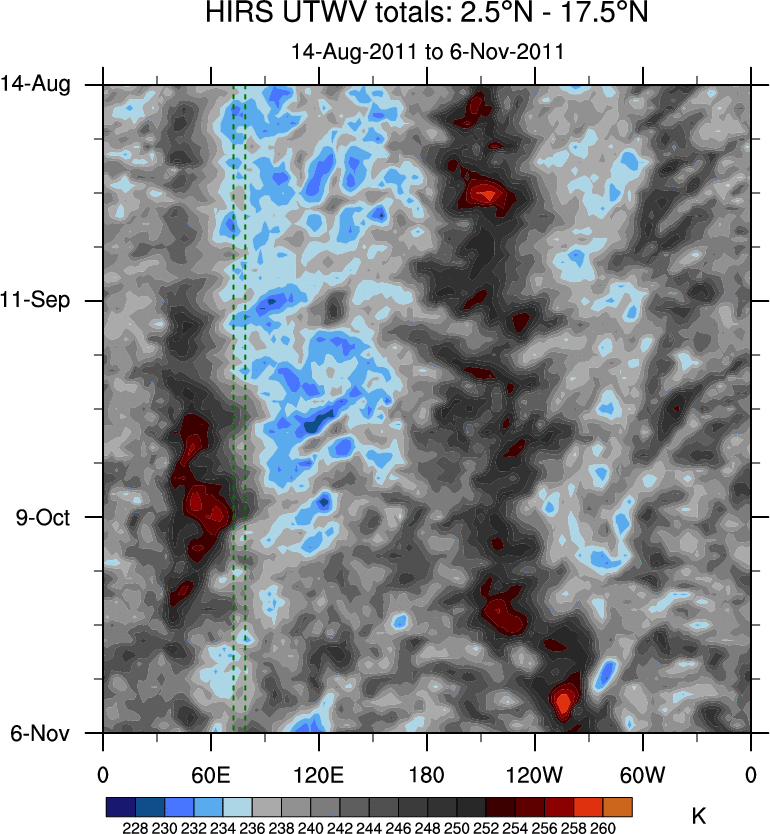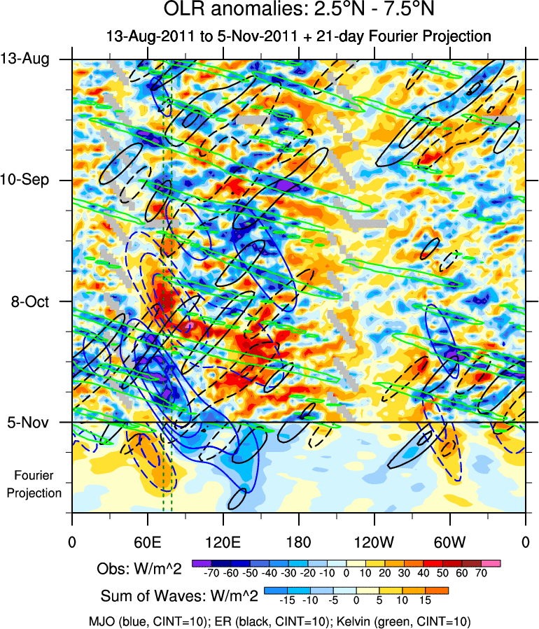 To identify tropical waves in near real-time, the OLR and UTWV data are filtered following Wheeler & Weickmann (2001 MWR). The daily anomalies are calculated using the first 3 harmonics of the seasonal cycle for 1979–2009. Missing values are then filled using linear interpolation in space and time. The most recent 365 days of anomalies are padded with 659 days of zeroes, and the result is filtered for each wave type.