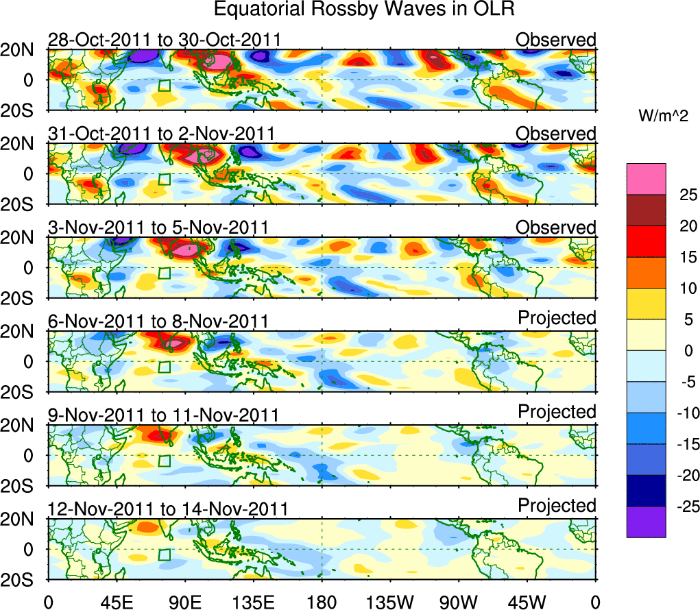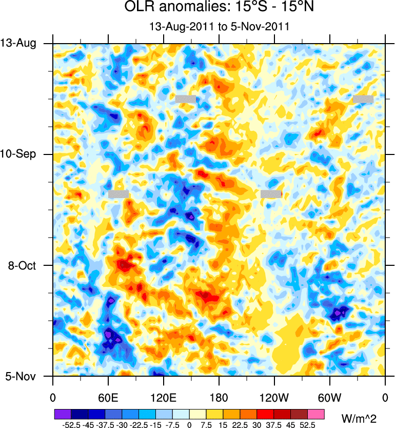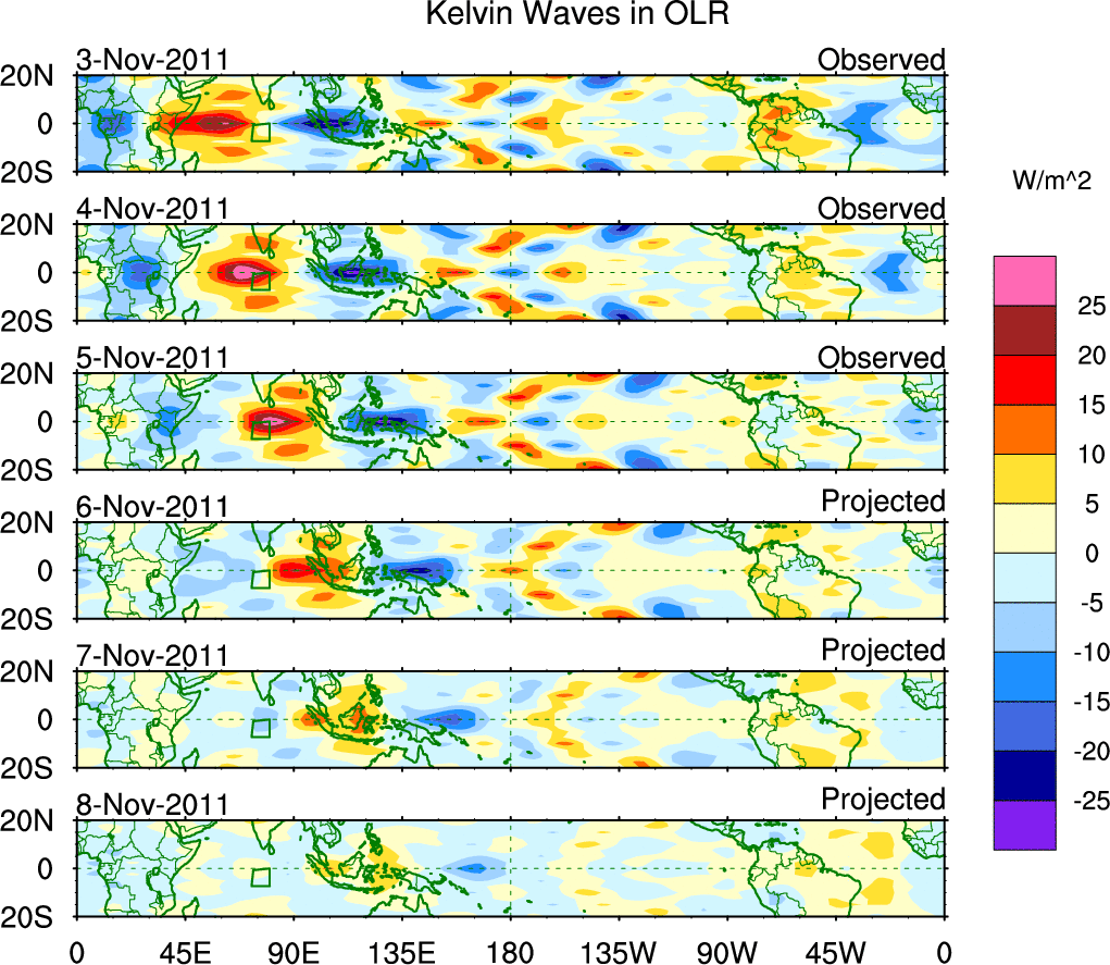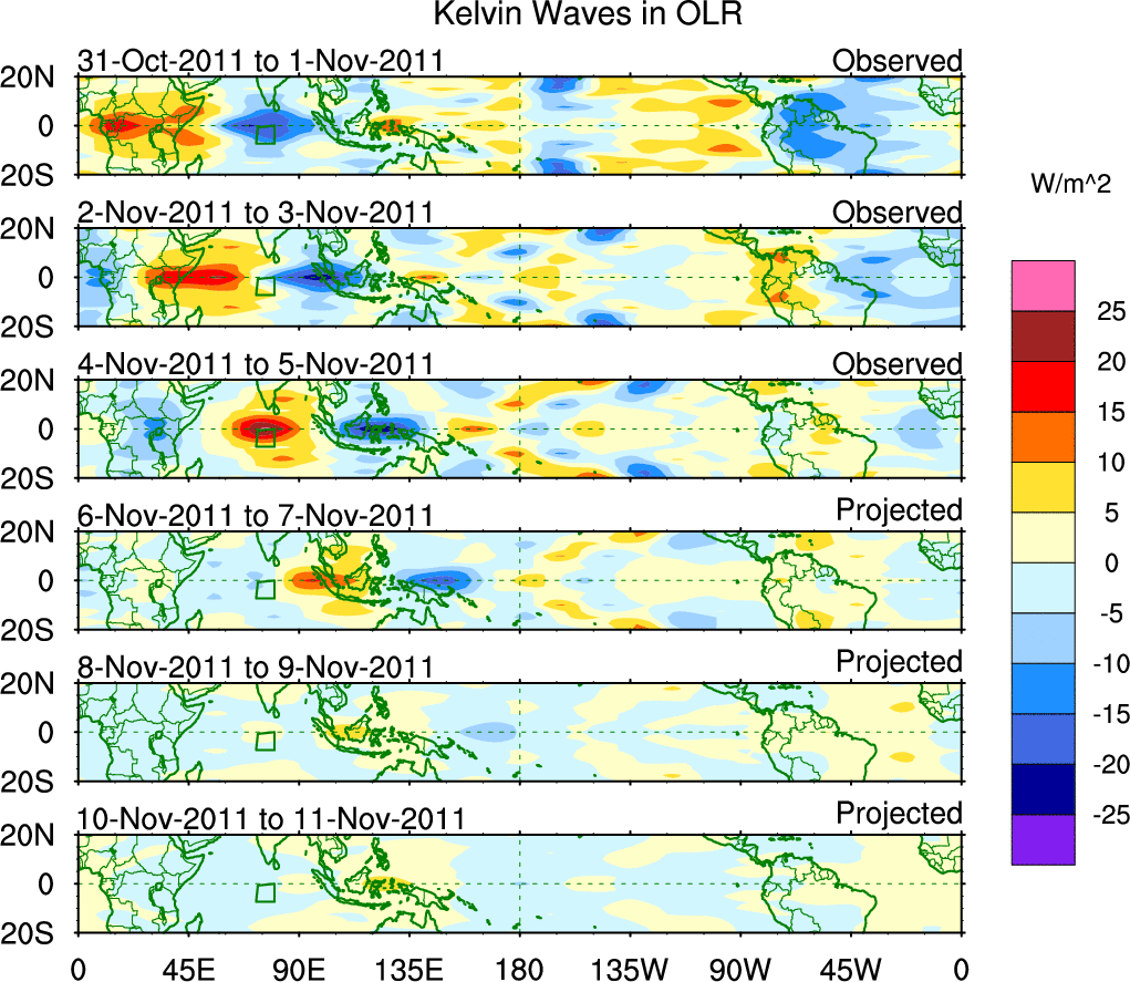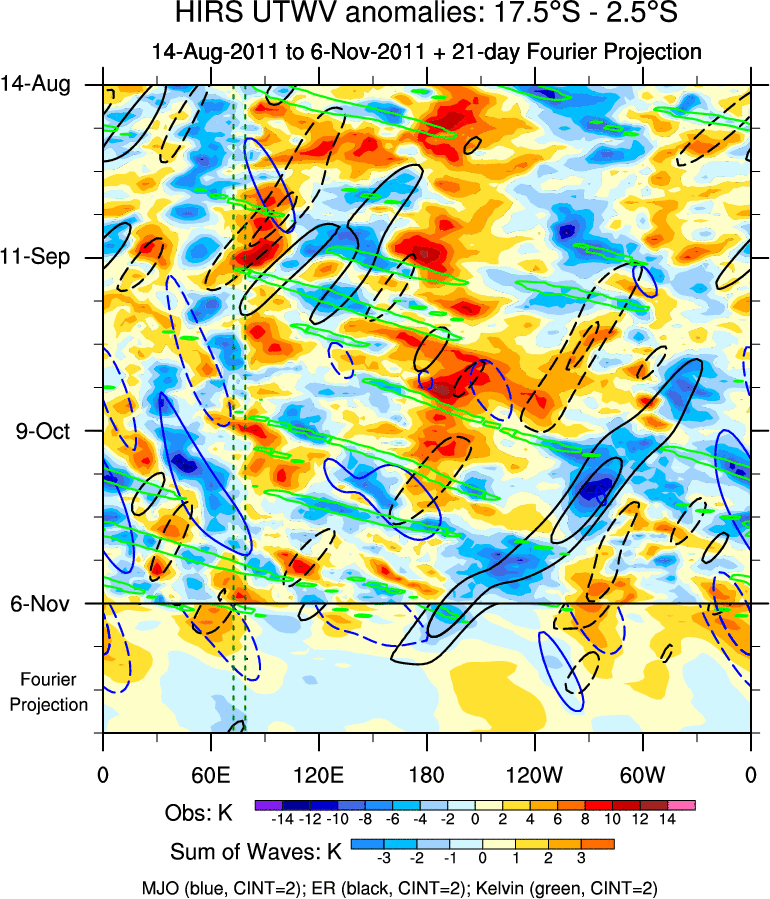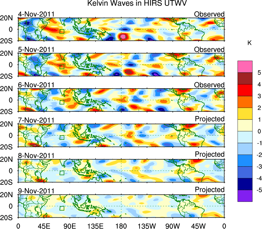 To identify tropical waves in near real-time, the OLR and UTWV data are filtered following Wheeler & Weickmann (2001 MWR). The daily anomalies are calculated using the first 3 harmonics of the seasonal cycle for 1979–2009. Missing values are then filled using linear interpolation in space and time. The most recent 365 days of anomalies are padded with 659 days of zeroes, and the result is filtered for each wave type.