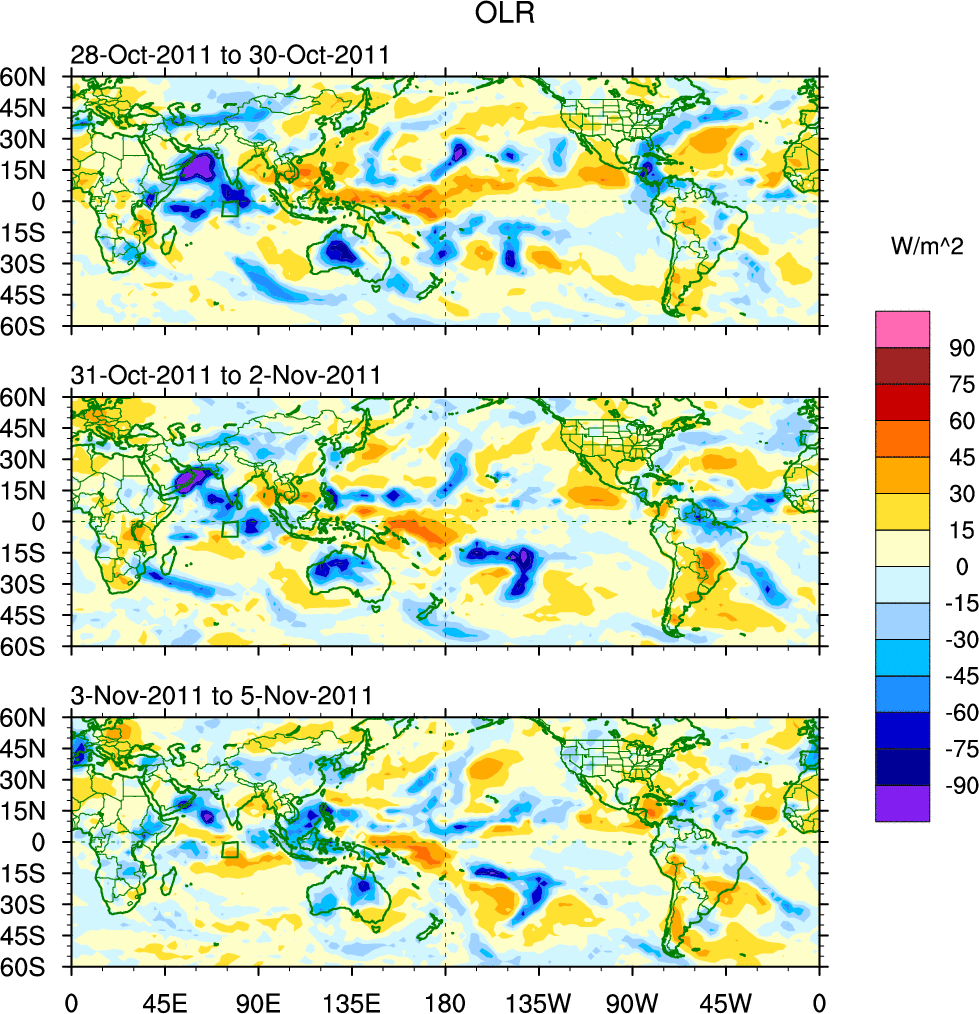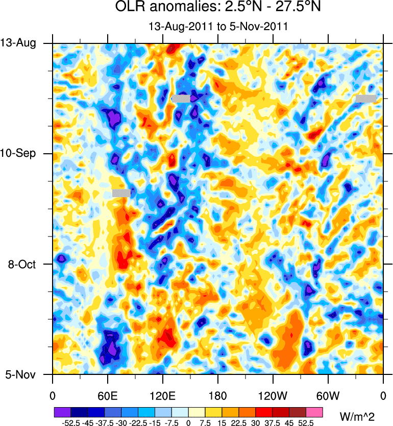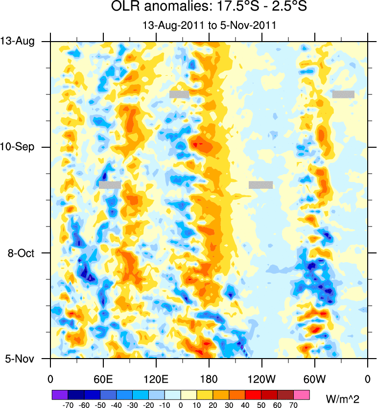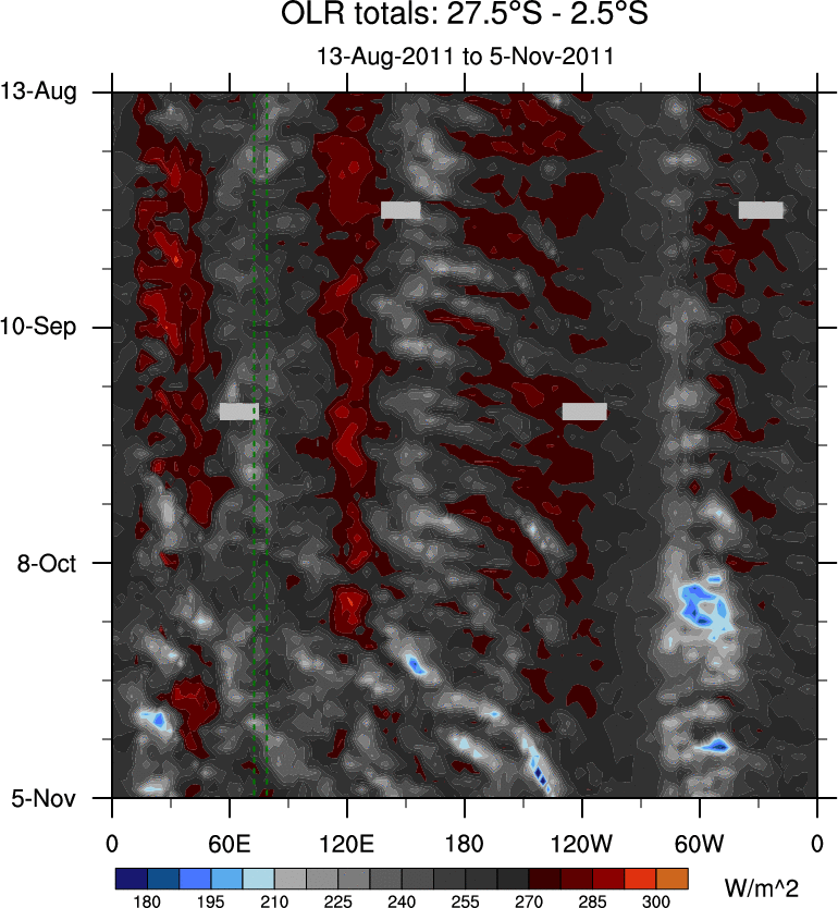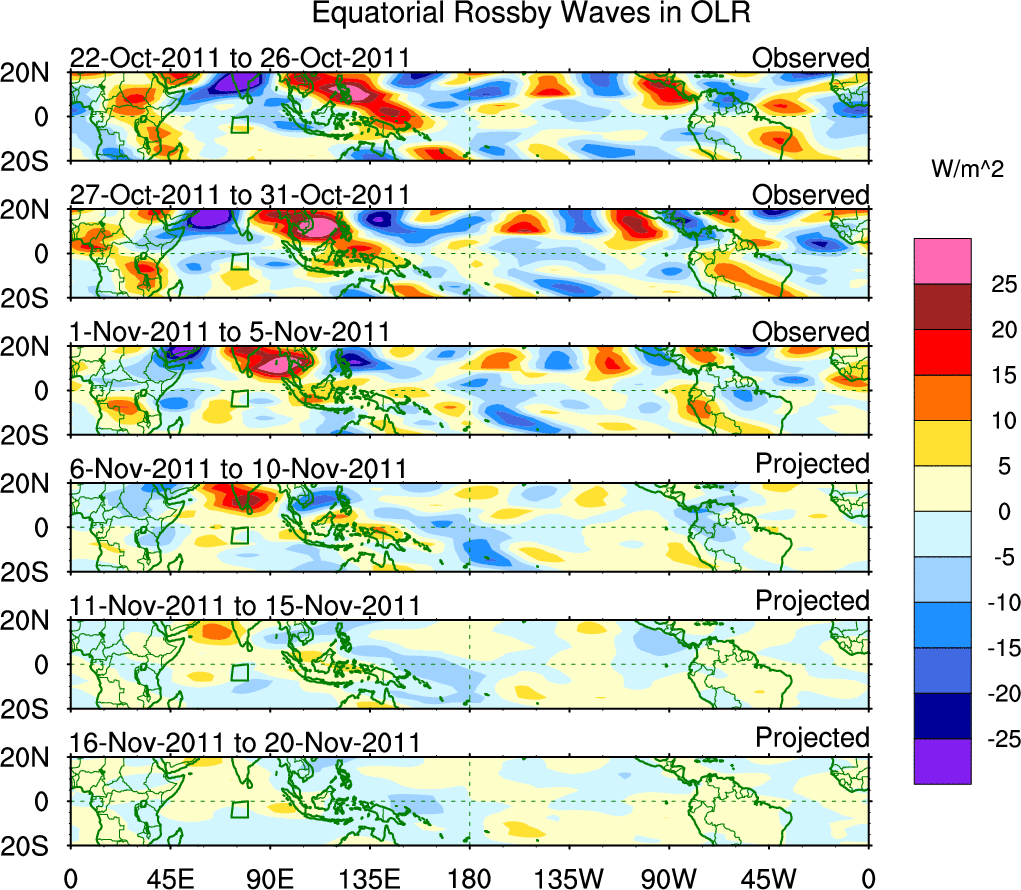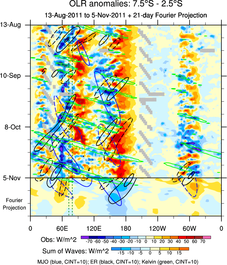 To identify tropical waves in near real-time, the OLR and UTWV data are filtered following Wheeler & Weickmann (2001 MWR). The daily anomalies are calculated using the first 3 harmonics of the seasonal cycle for 1979–2009. Missing values are then filled using linear interpolation in space and time. The most recent 365 days of anomalies are padded with 659 days of zeroes, and the result is filtered for each wave type.