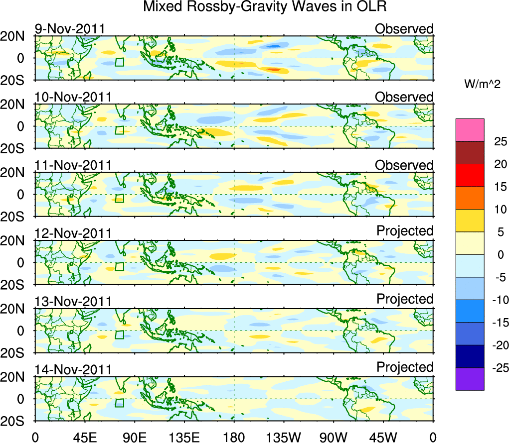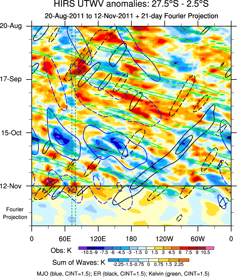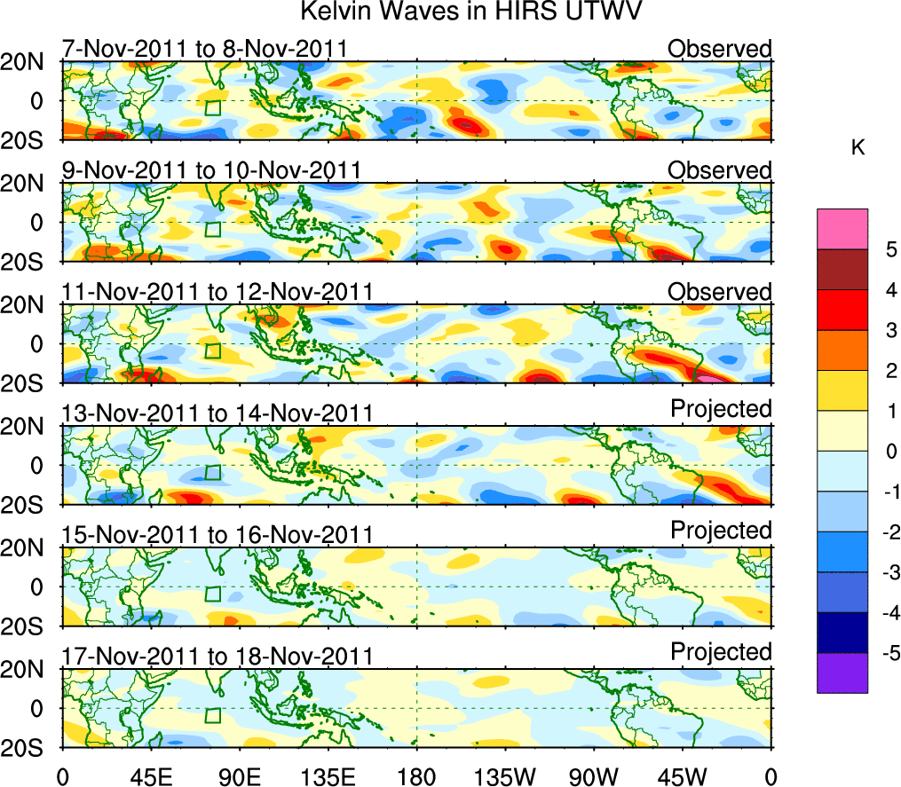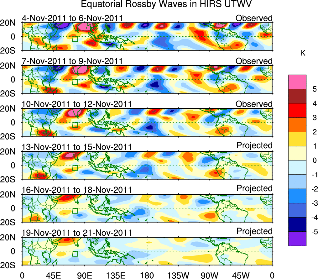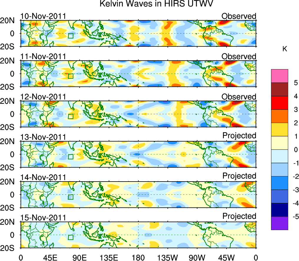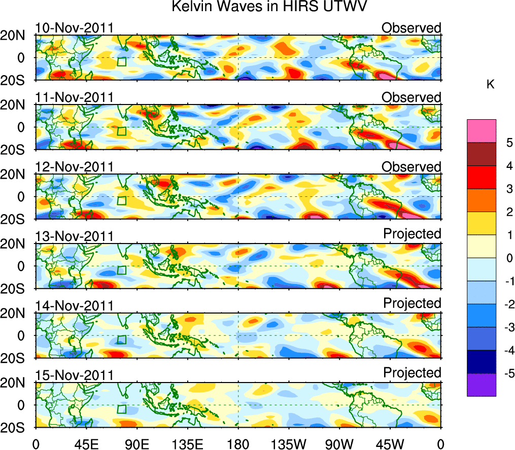 To identify tropical waves in near real-time, the OLR and UTWV data are filtered following Wheeler & Weickmann (2001 MWR). The daily anomalies are calculated using the first 3 harmonics of the seasonal cycle for 1979–2009. Missing values are then filled using linear interpolation in space and time. The most recent 365 days of anomalies are padded with 659 days of zeroes, and the result is filtered for each wave type.