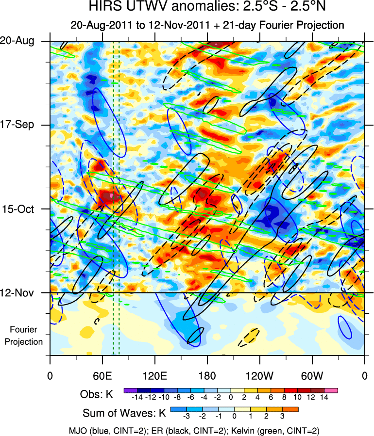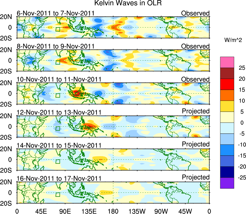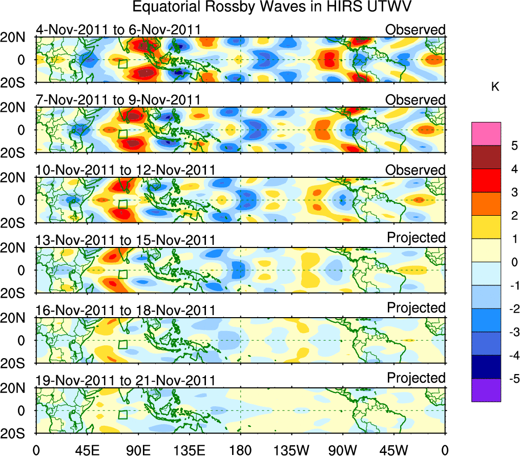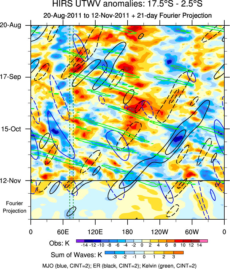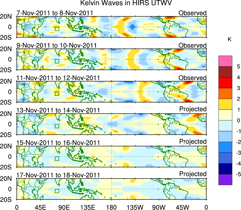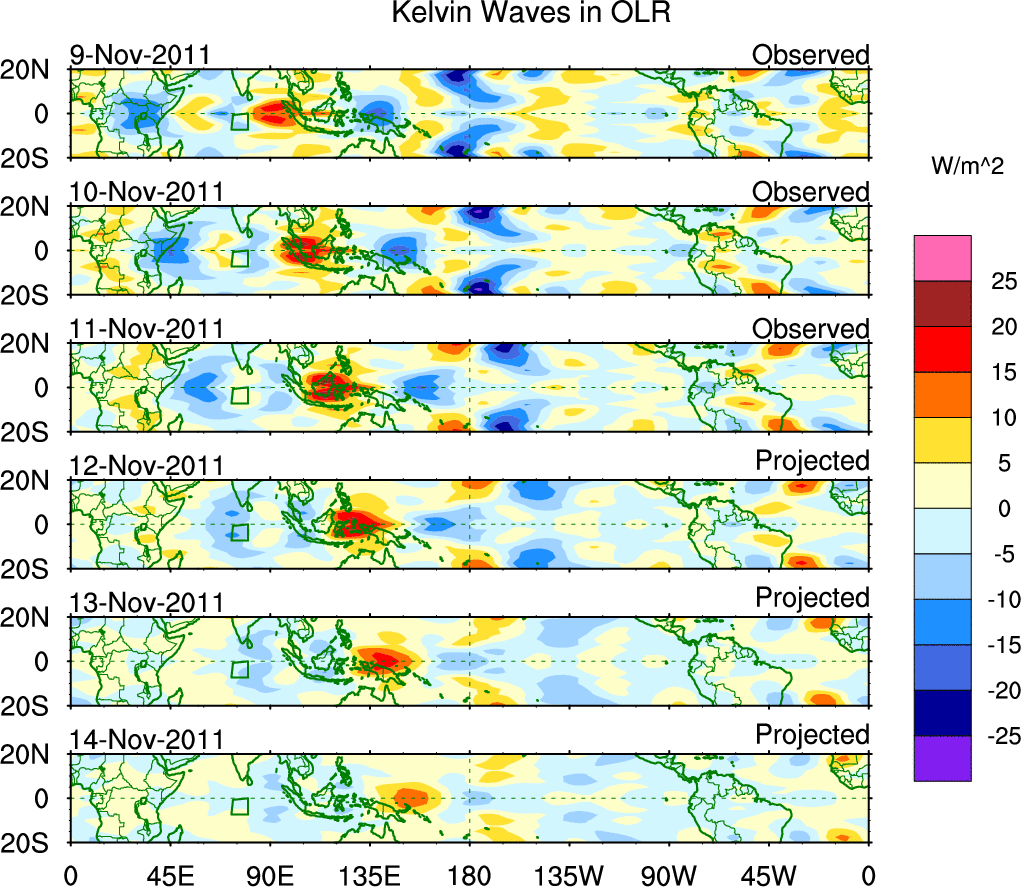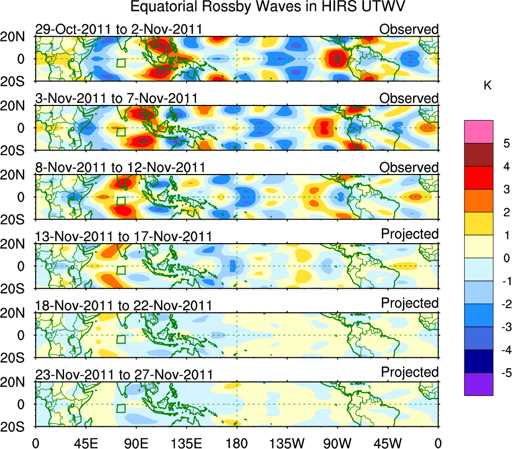 To identify tropical waves in near real-time, the OLR and UTWV data are filtered following Wheeler & Weickmann (2001 MWR). The daily anomalies are calculated using the first 3 harmonics of the seasonal cycle for 1979–2009. Missing values are then filled using linear interpolation in space and time. The most recent 365 days of anomalies are padded with 659 days of zeroes, and the result is filtered for each wave type.