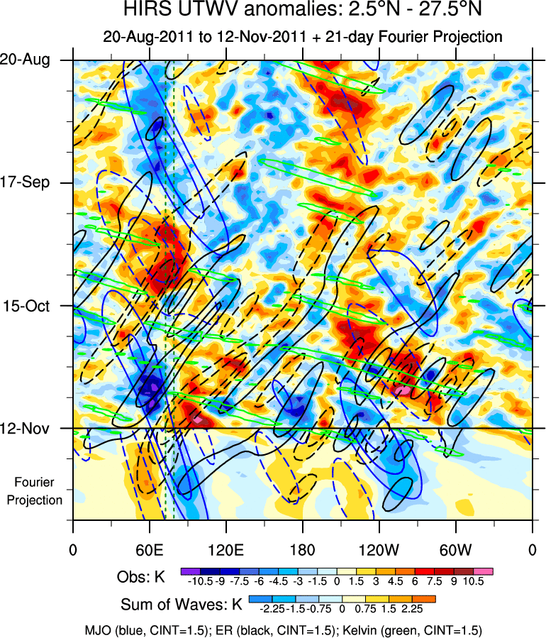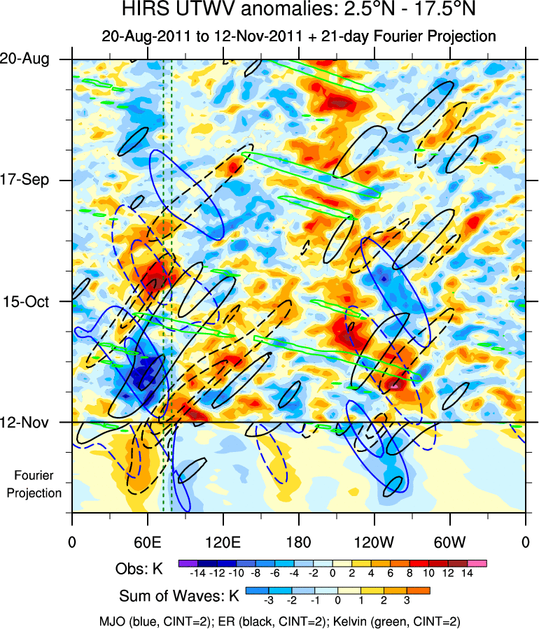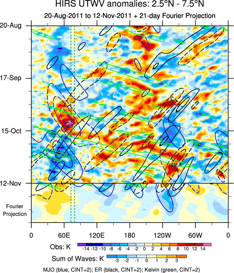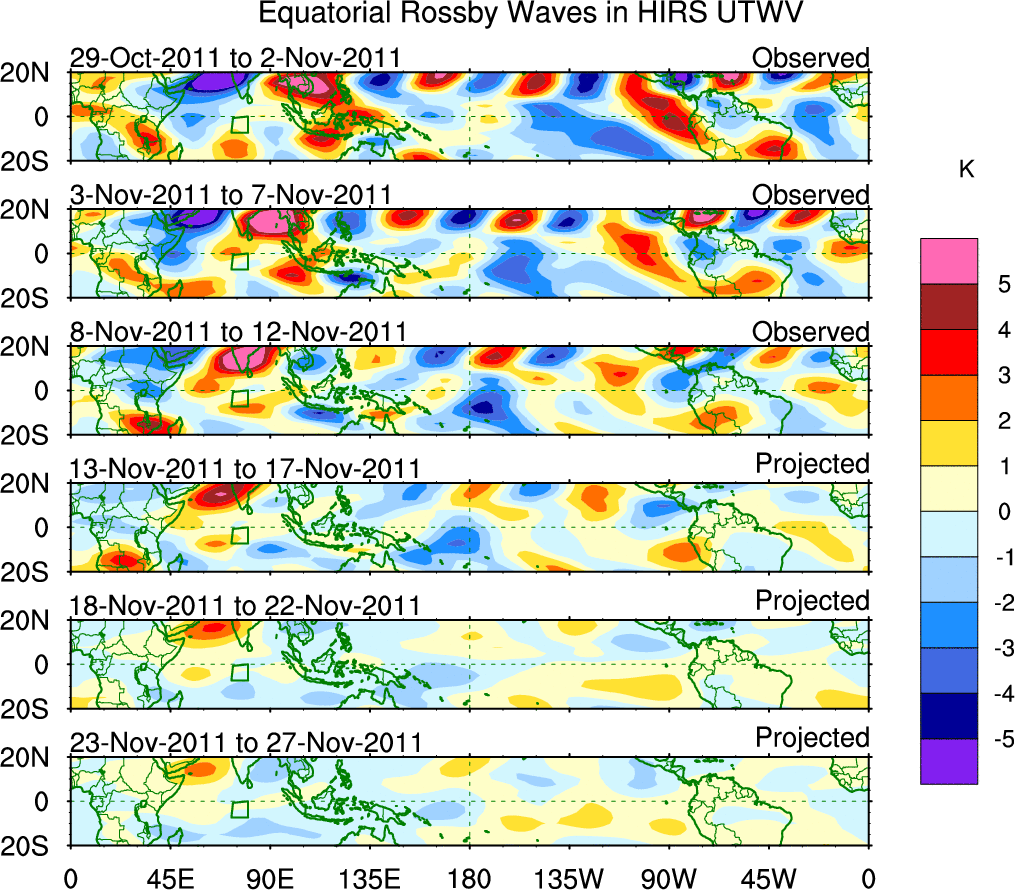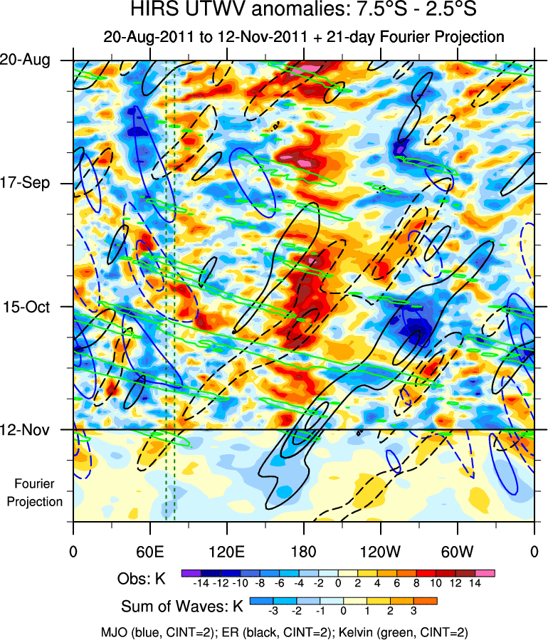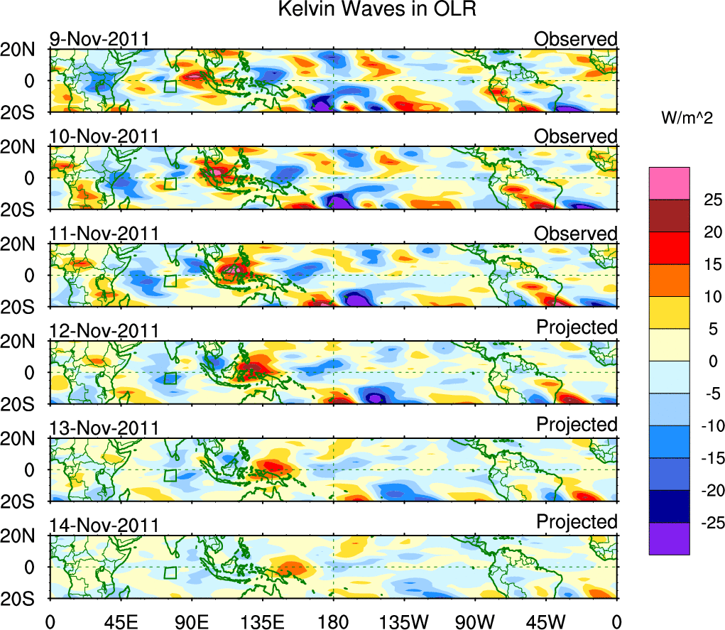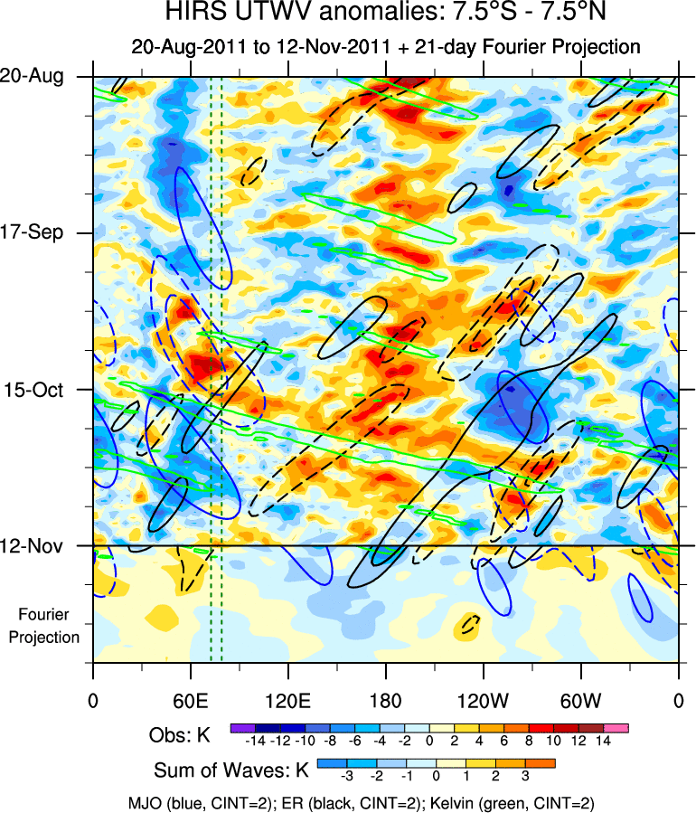To identify tropical waves in near real-time, the OLR and UTWV data are filtered following Wheeler & Weickmann (2001 MWR). The daily anomalies are calculated using the first 3 harmonics of the seasonal cycle for 1979–2009. Missing values are then filled using linear interpolation in space and time. The most recent 365 days of anomalies are padded with 659 days of zeroes, and the result is filtered for each wave type.