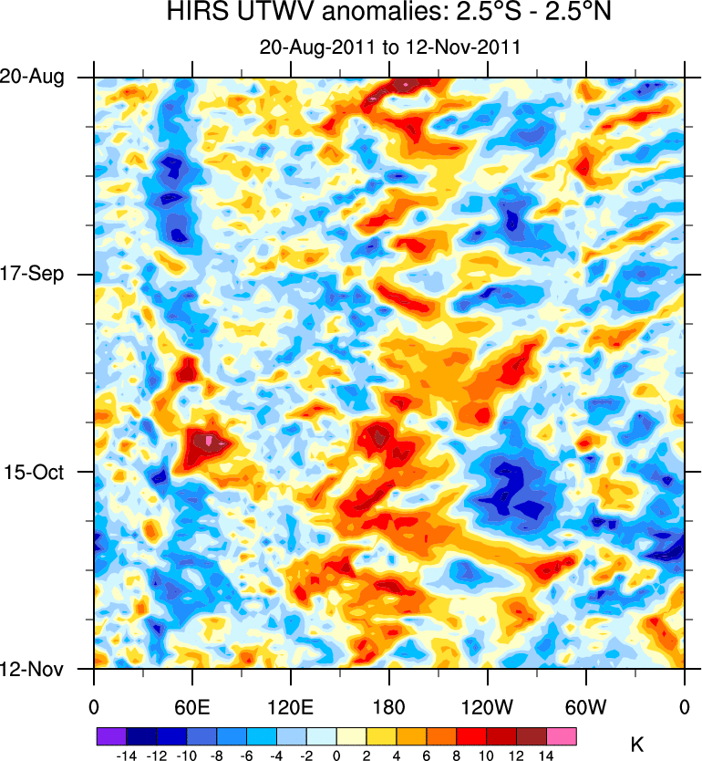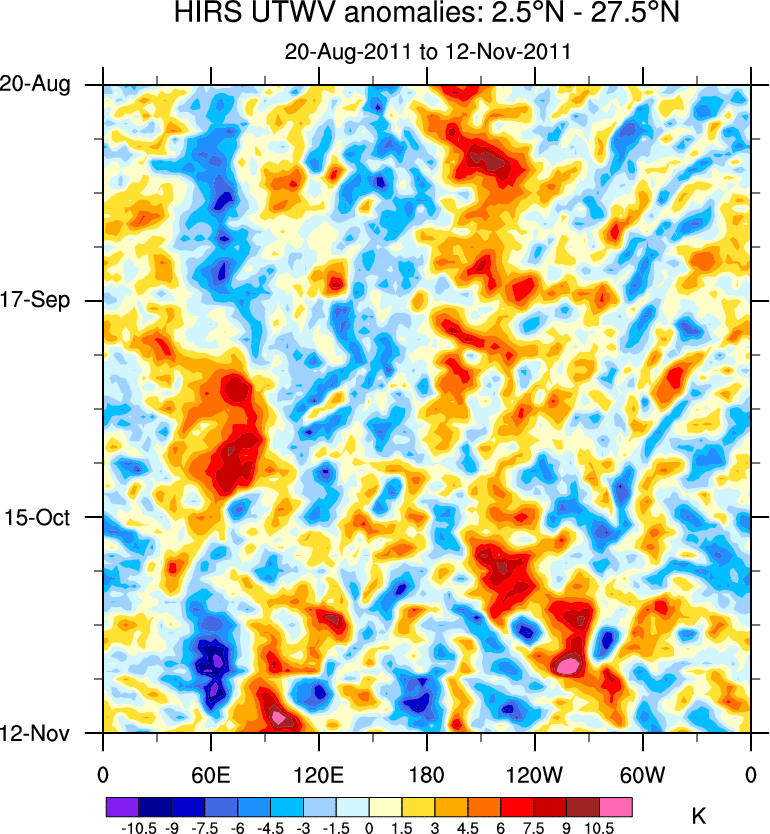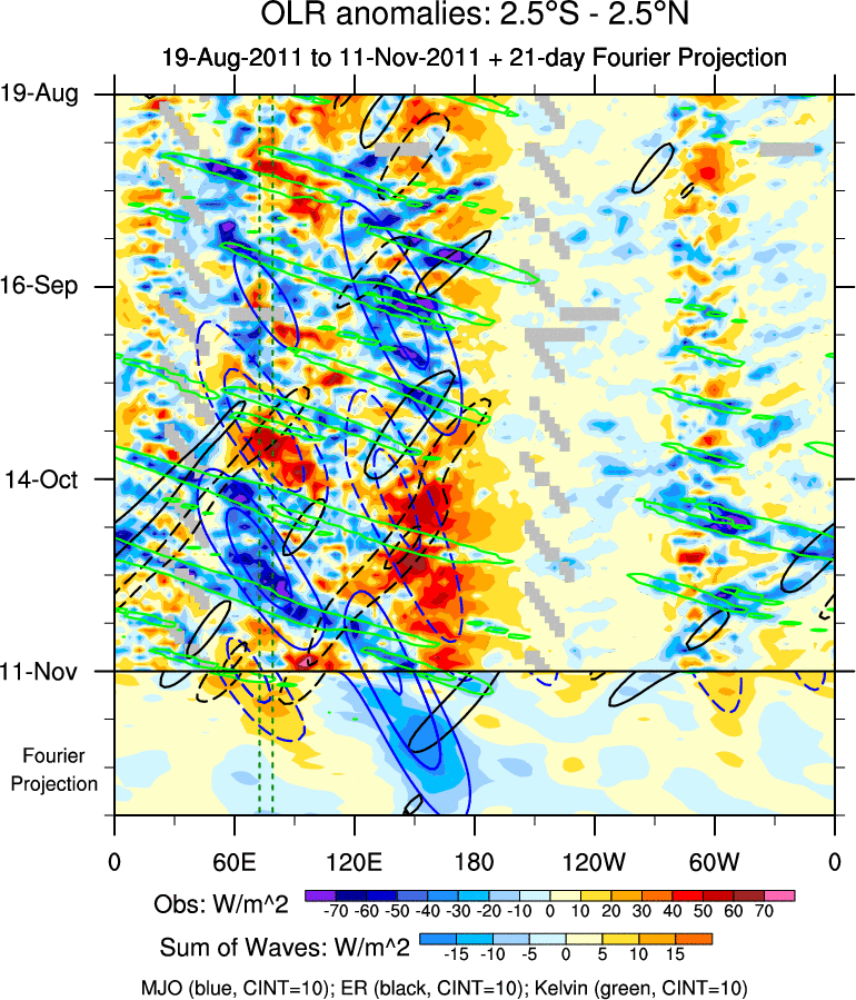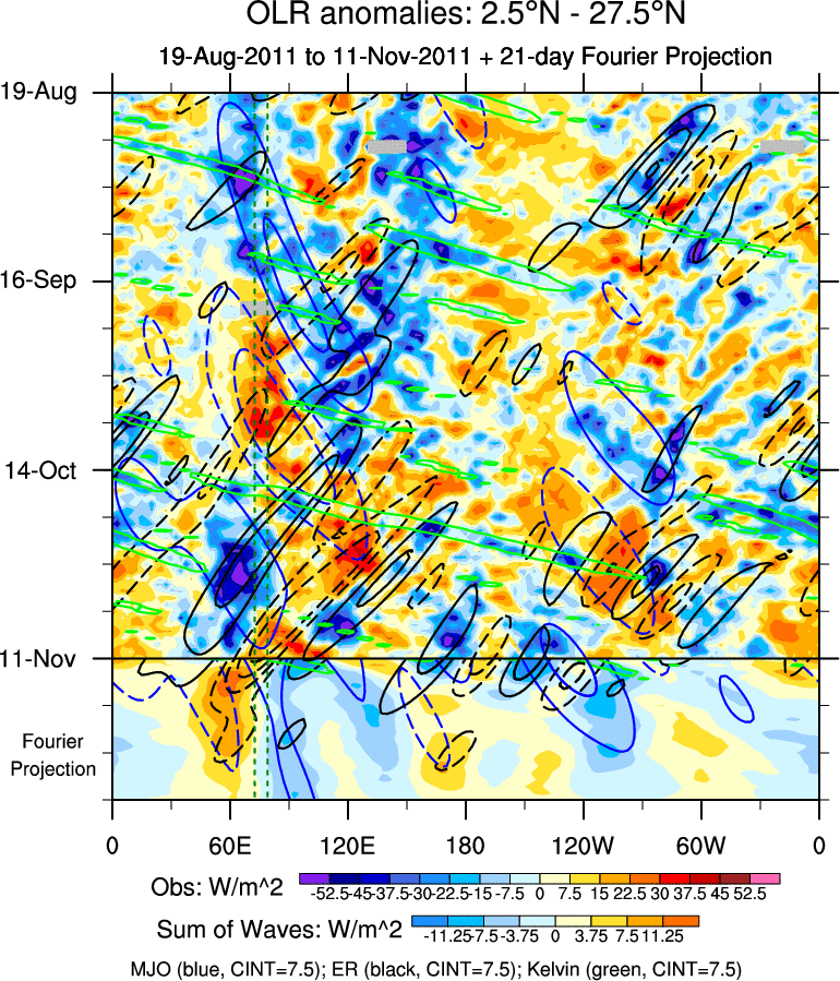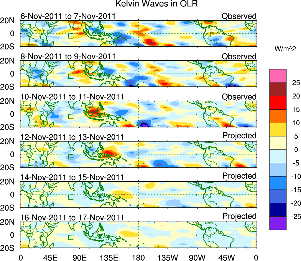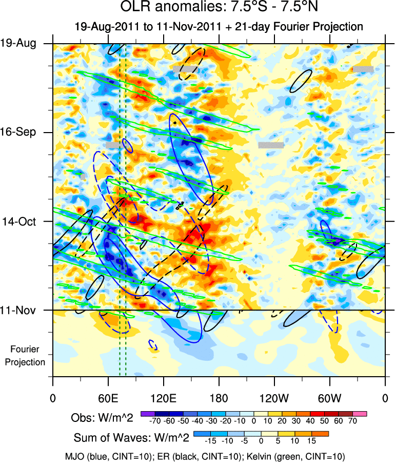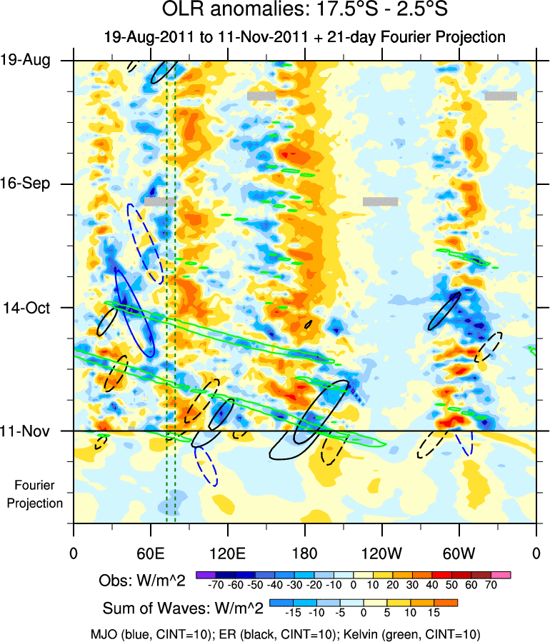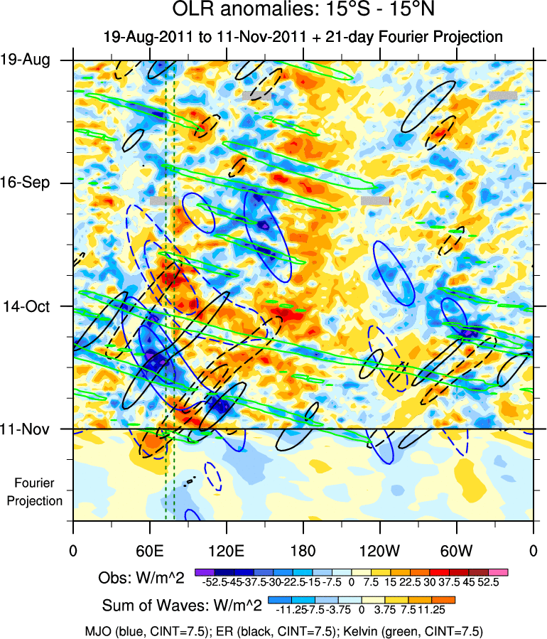 To identify tropical waves in near real-time, the OLR and UTWV data are filtered following Wheeler & Weickmann (2001 MWR). The daily anomalies are calculated using the first 3 harmonics of the seasonal cycle for 1979–2009. Missing values are then filled using linear interpolation in space and time. The most recent 365 days of anomalies are padded with 659 days of zeroes, and the result is filtered for each wave type.