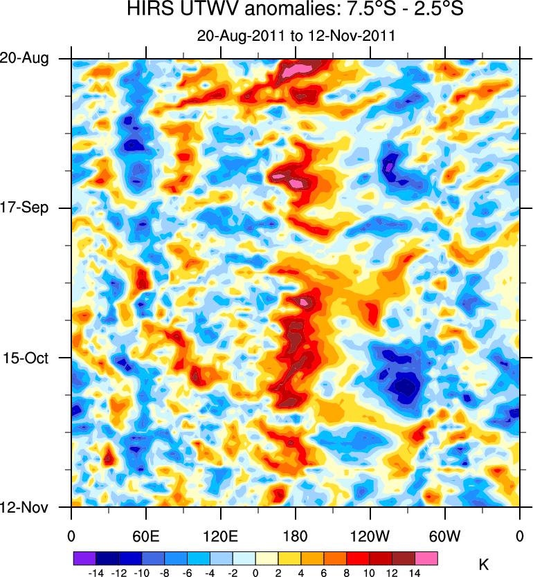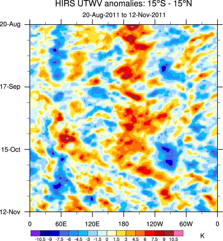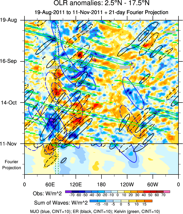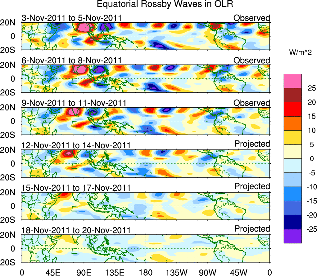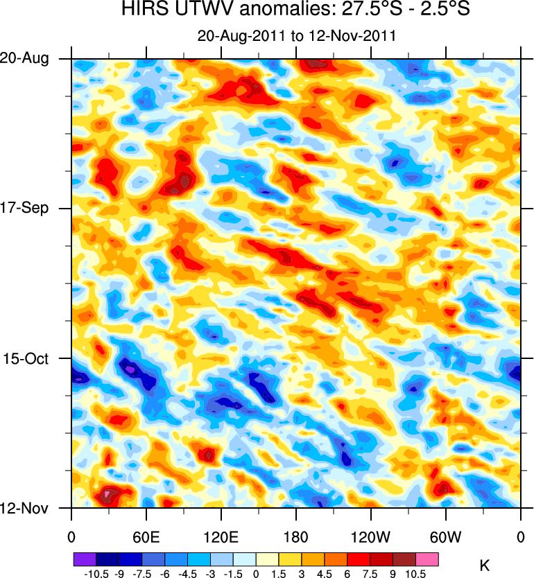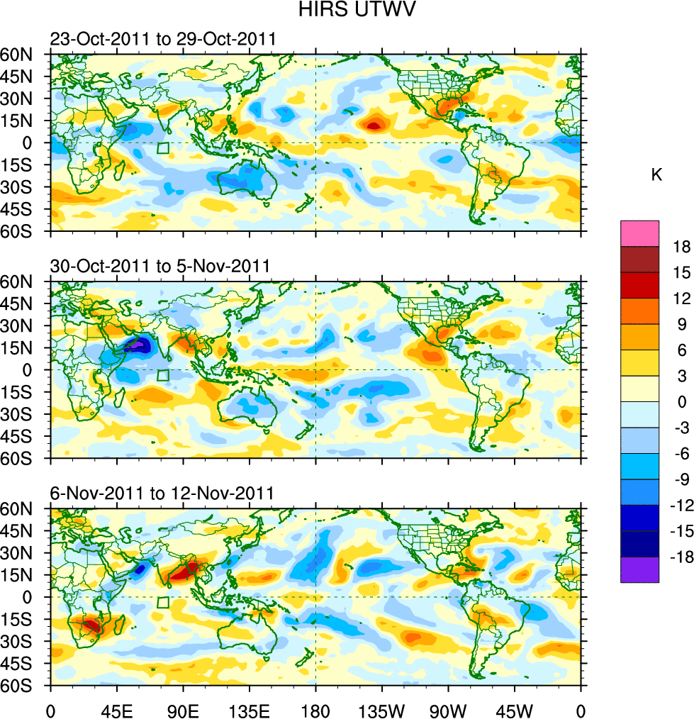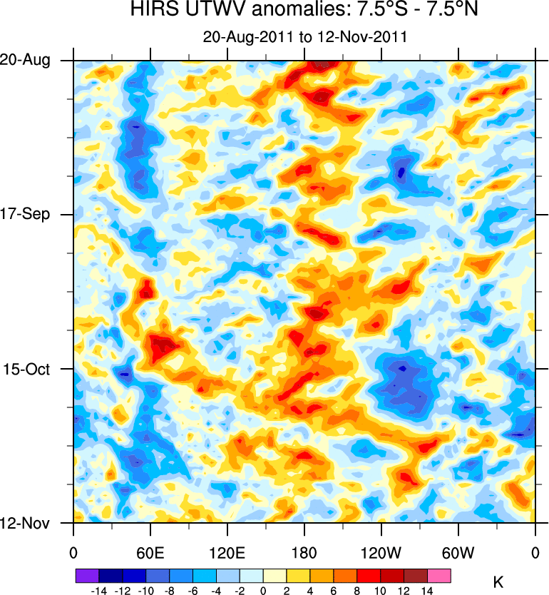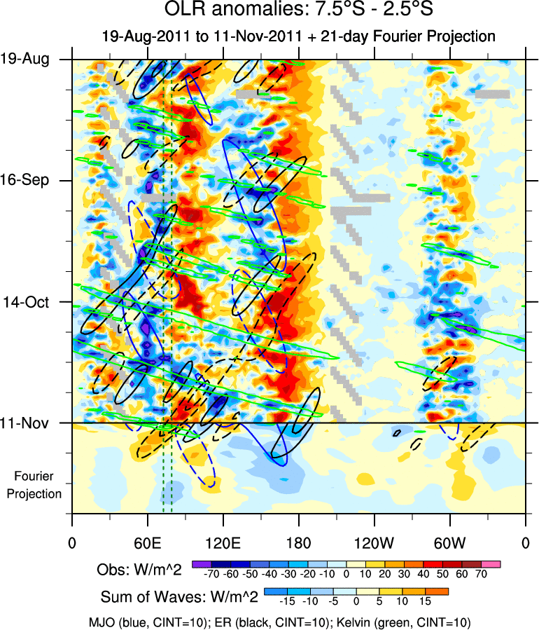 To identify tropical waves in near real-time, the OLR and UTWV data are filtered following Wheeler & Weickmann (2001 MWR). The daily anomalies are calculated using the first 3 harmonics of the seasonal cycle for 1979–2009. Missing values are then filled using linear interpolation in space and time. The most recent 365 days of anomalies are padded with 659 days of zeroes, and the result is filtered for each wave type.