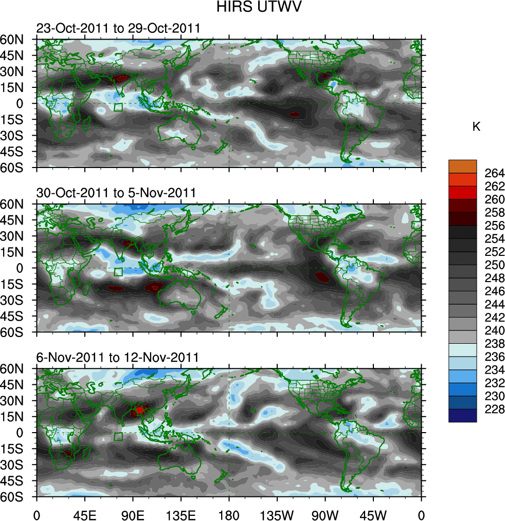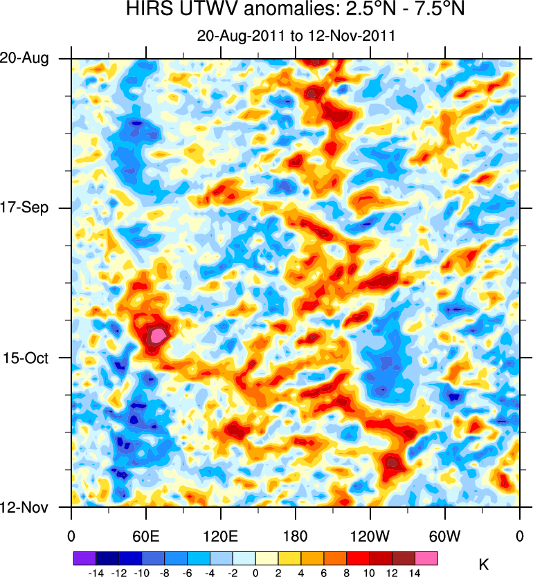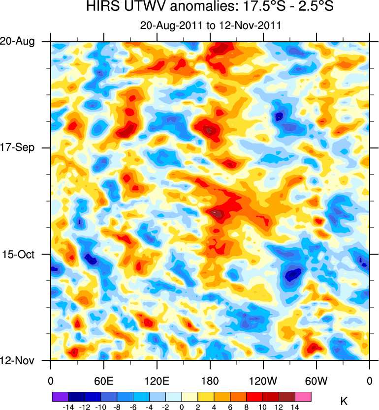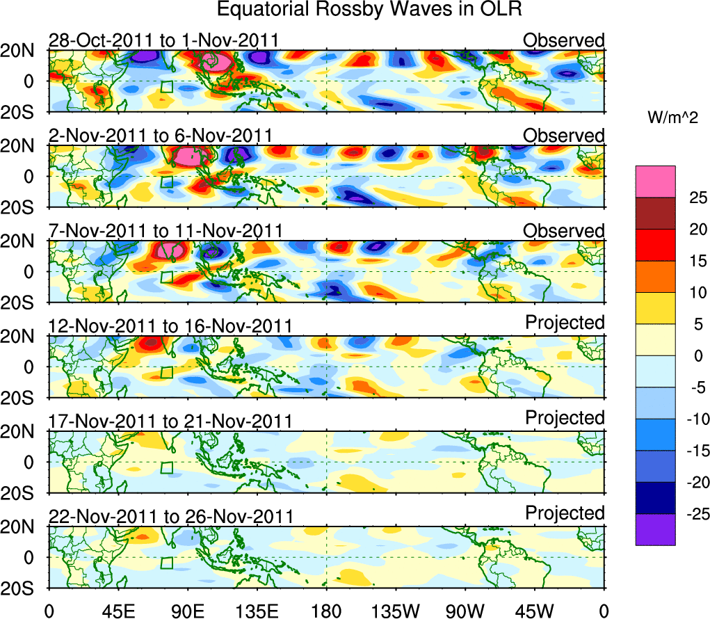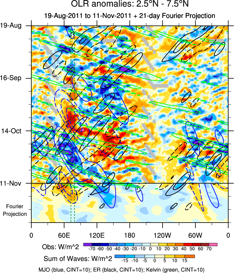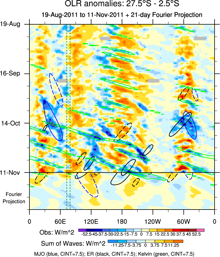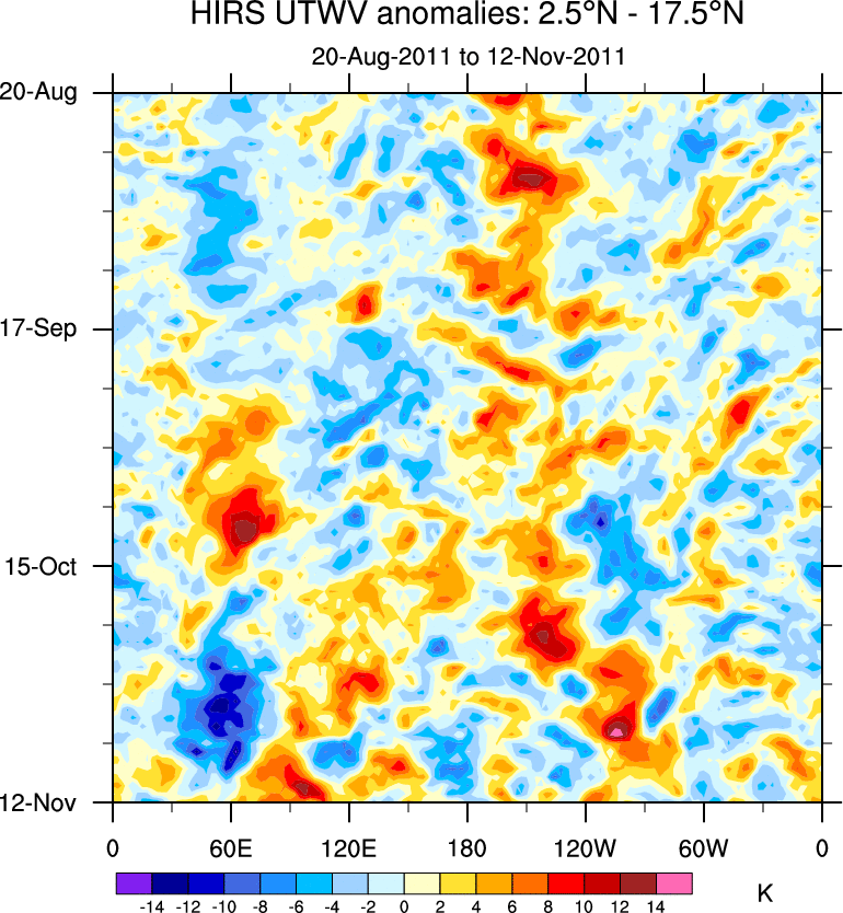 To identify tropical waves in near real-time, the OLR and UTWV data are filtered following Wheeler & Weickmann (2001 MWR). The daily anomalies are calculated using the first 3 harmonics of the seasonal cycle for 1979–2009. Missing values are then filled using linear interpolation in space and time. The most recent 365 days of anomalies are padded with 659 days of zeroes, and the result is filtered for each wave type.