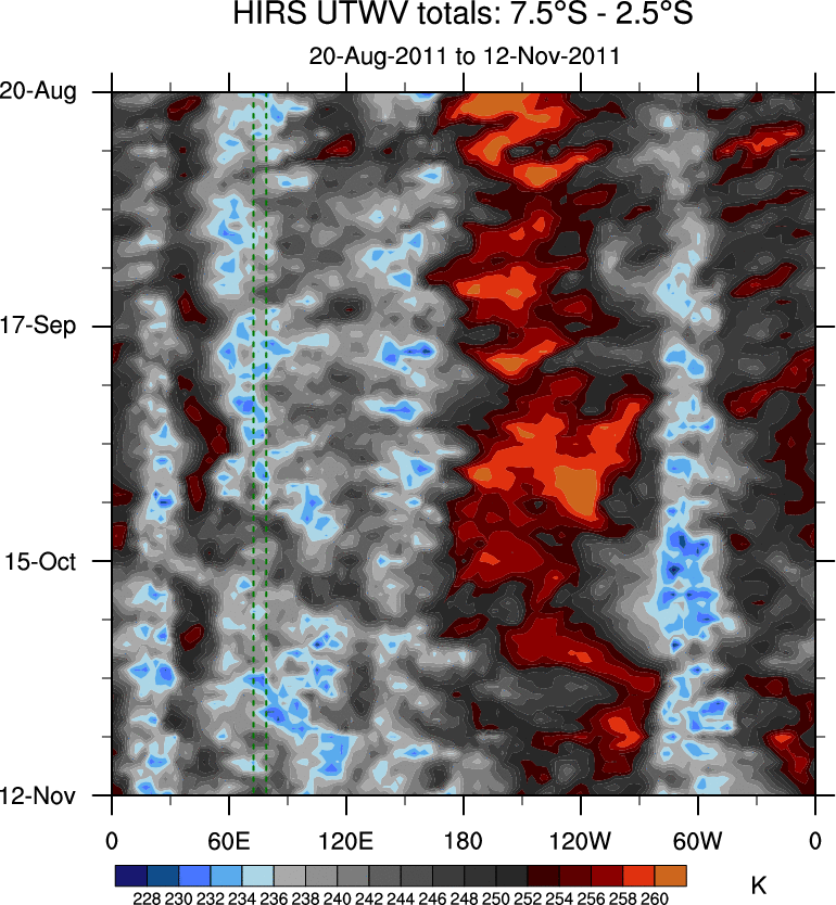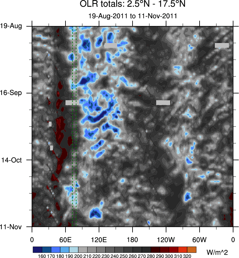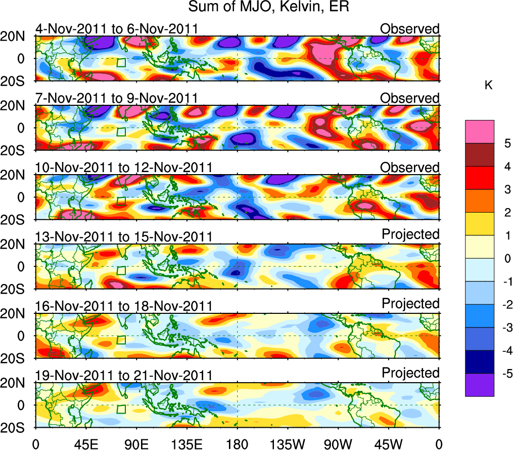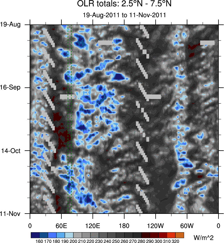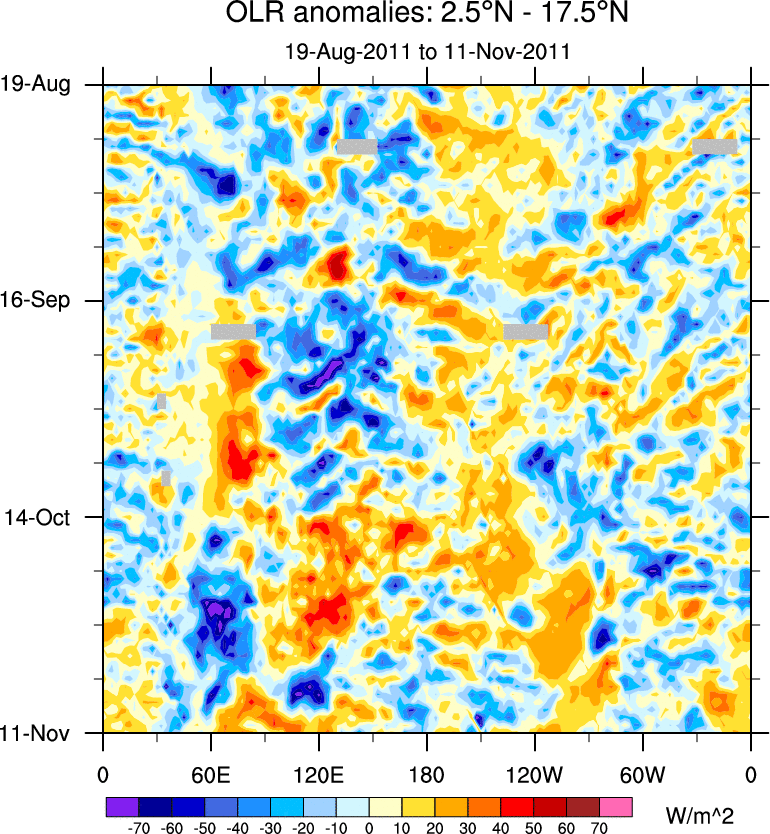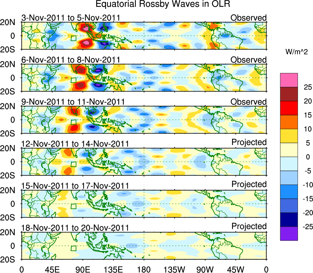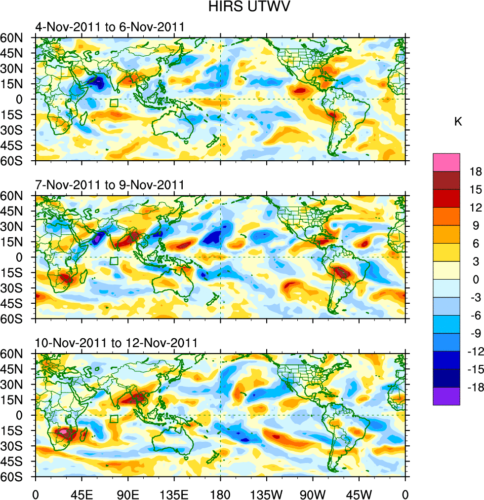 To identify tropical waves in near real-time, the OLR and UTWV data are filtered following Wheeler & Weickmann (2001 MWR). The daily anomalies are calculated using the first 3 harmonics of the seasonal cycle for 1979–2009. Missing values are then filled using linear interpolation in space and time. The most recent 365 days of anomalies are padded with 659 days of zeroes, and the result is filtered for each wave type.