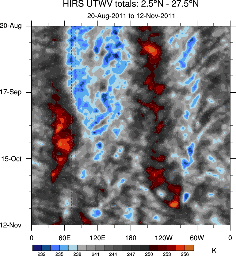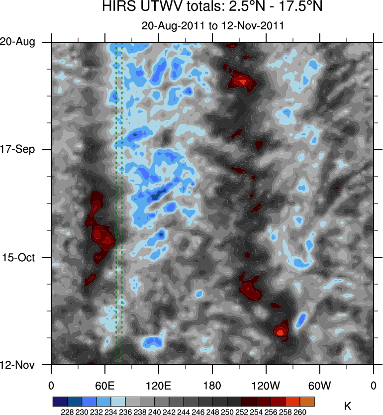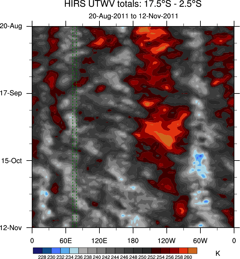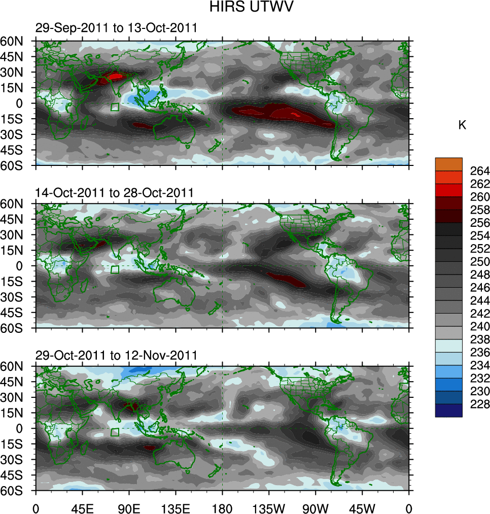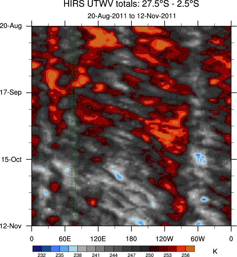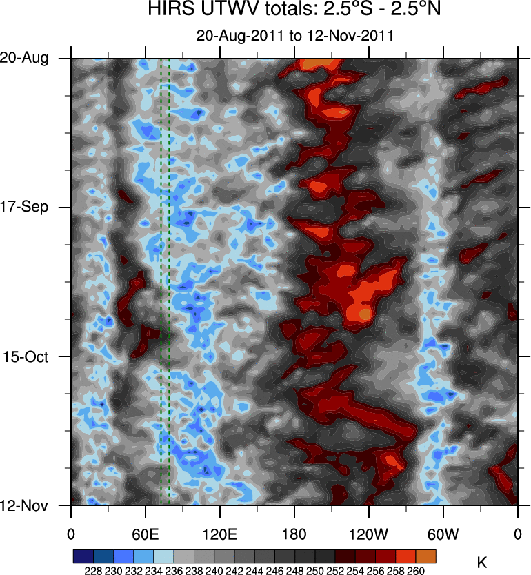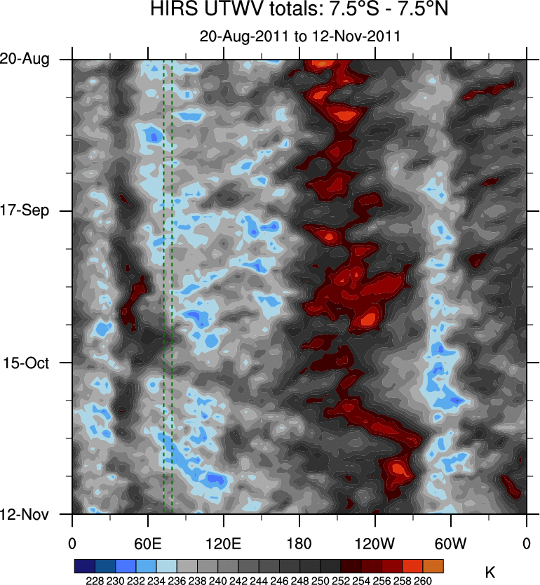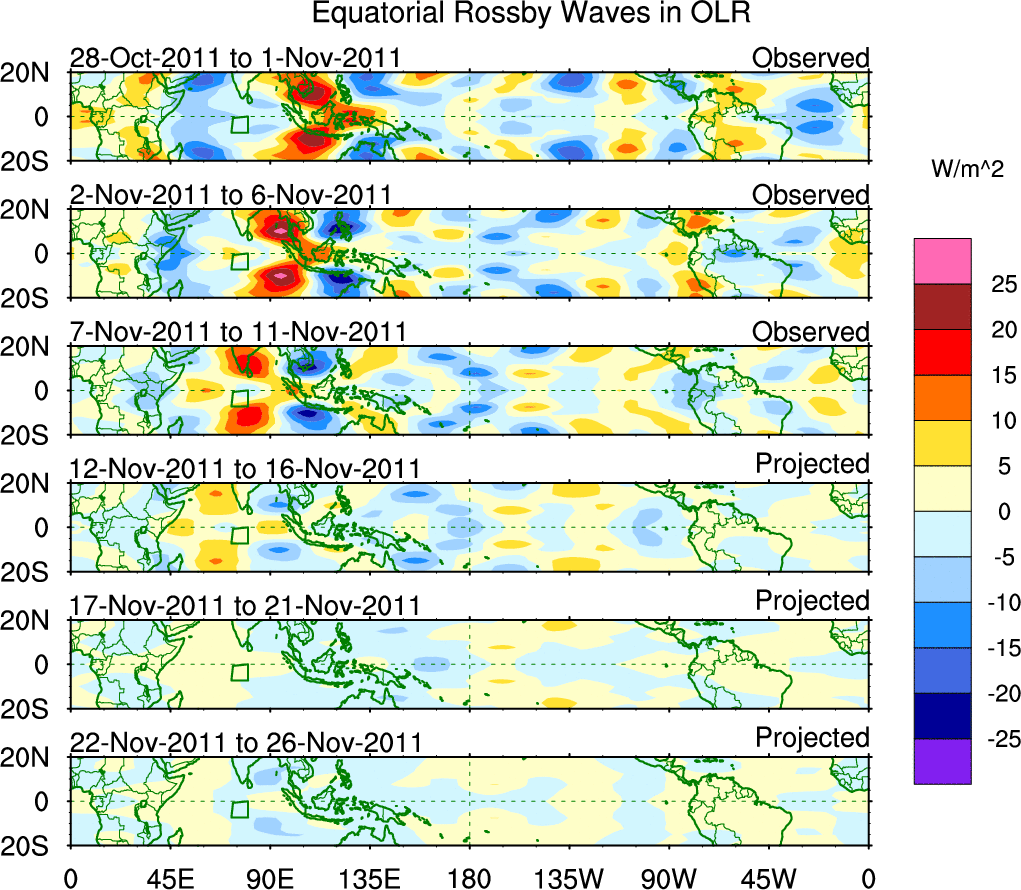 To identify tropical waves in near real-time, the OLR and UTWV data are filtered following Wheeler & Weickmann (2001 MWR). The daily anomalies are calculated using the first 3 harmonics of the seasonal cycle for 1979–2009. Missing values are then filled using linear interpolation in space and time. The most recent 365 days of anomalies are padded with 659 days of zeroes, and the result is filtered for each wave type.