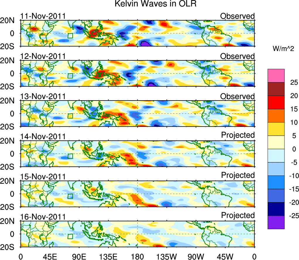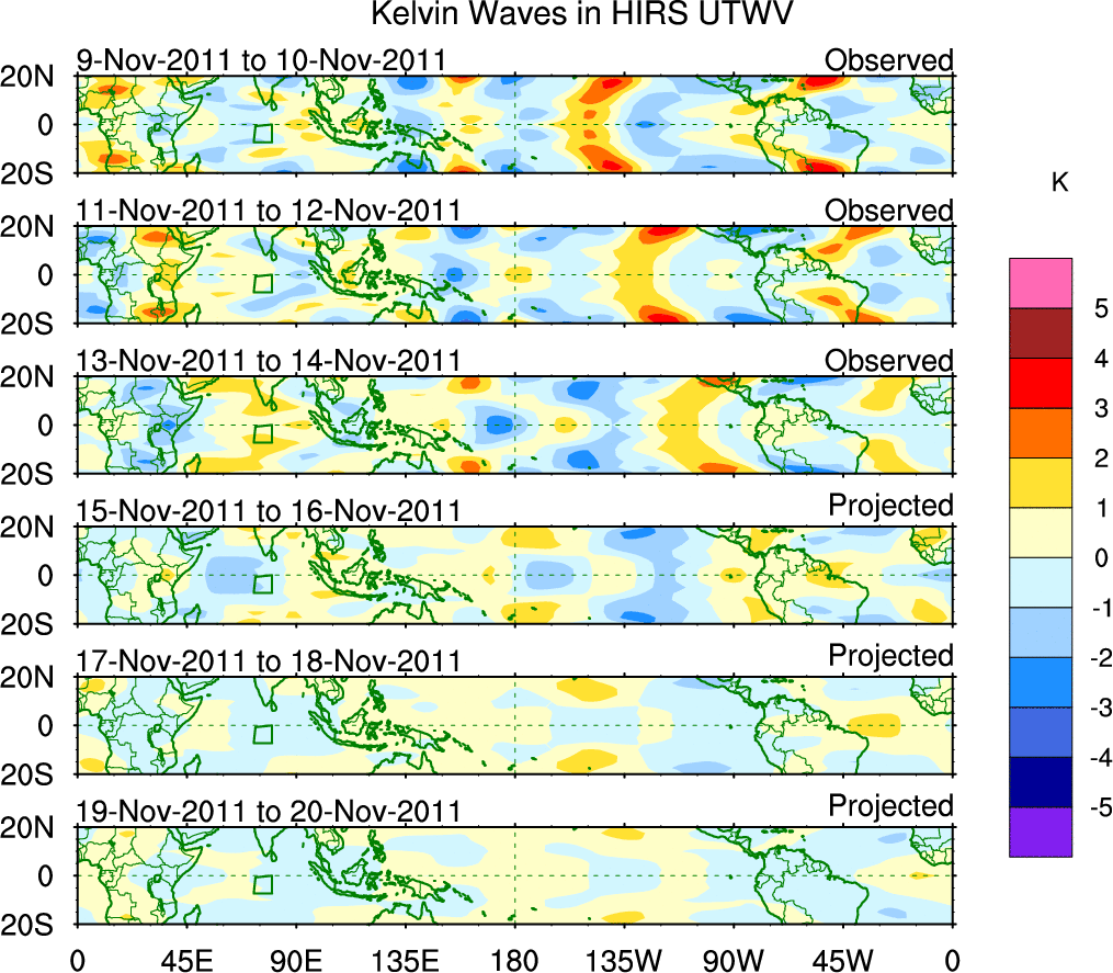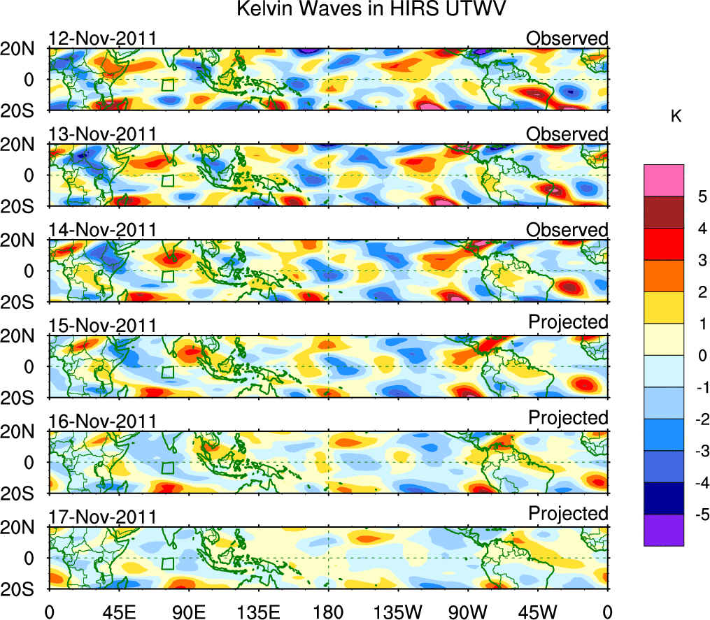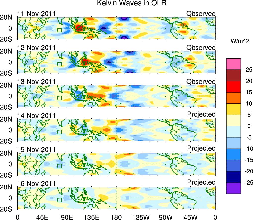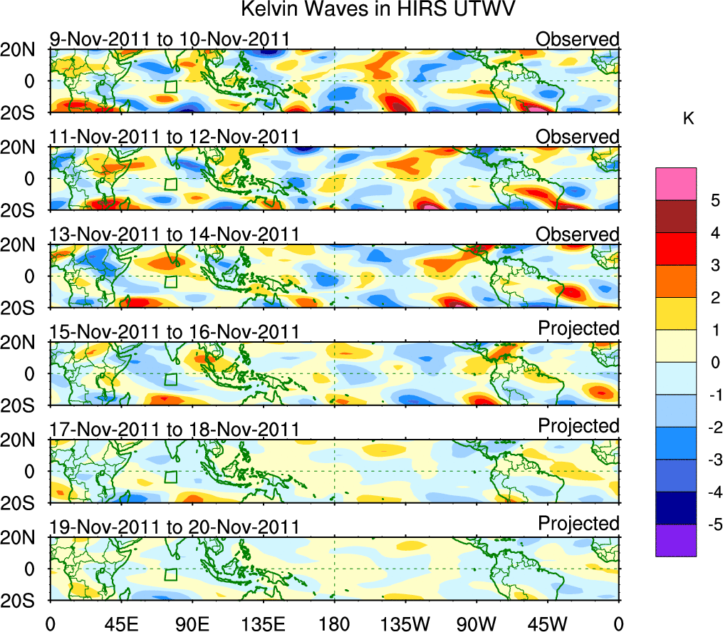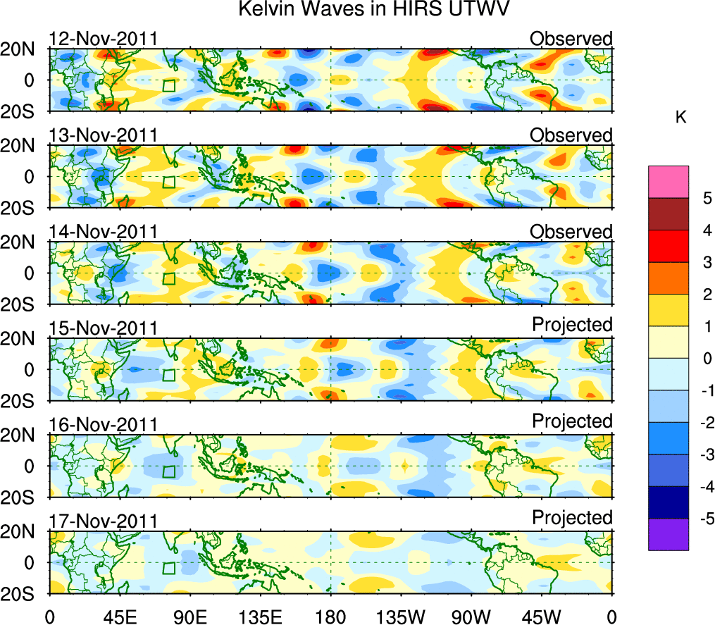 To identify tropical waves in near real-time, the OLR and UTWV data are filtered following Wheeler & Weickmann (2001 MWR). The daily anomalies are calculated using the first 3 harmonics of the seasonal cycle for 1979–2009. Missing values are then filled using linear interpolation in space and time. The most recent 365 days of anomalies are padded with 659 days of zeroes, and the result is filtered for each wave type.