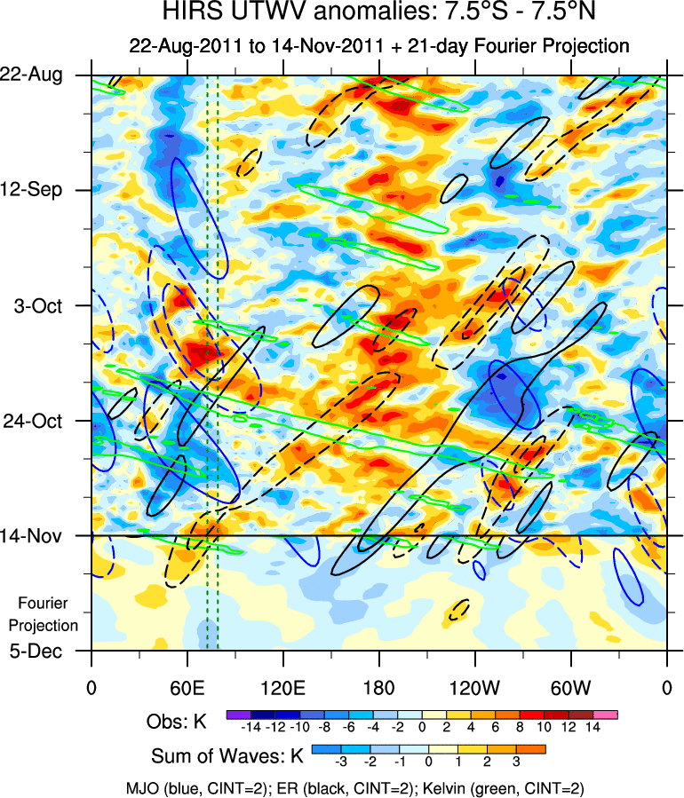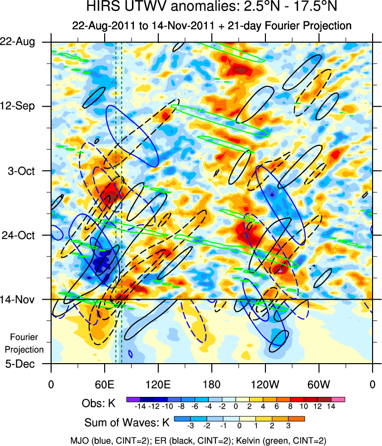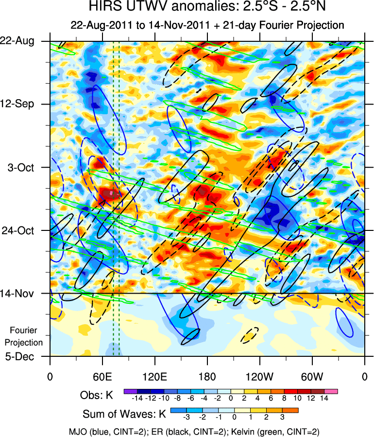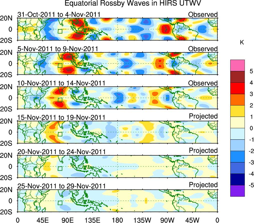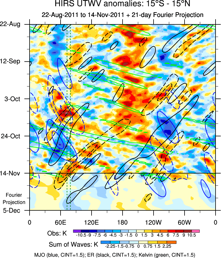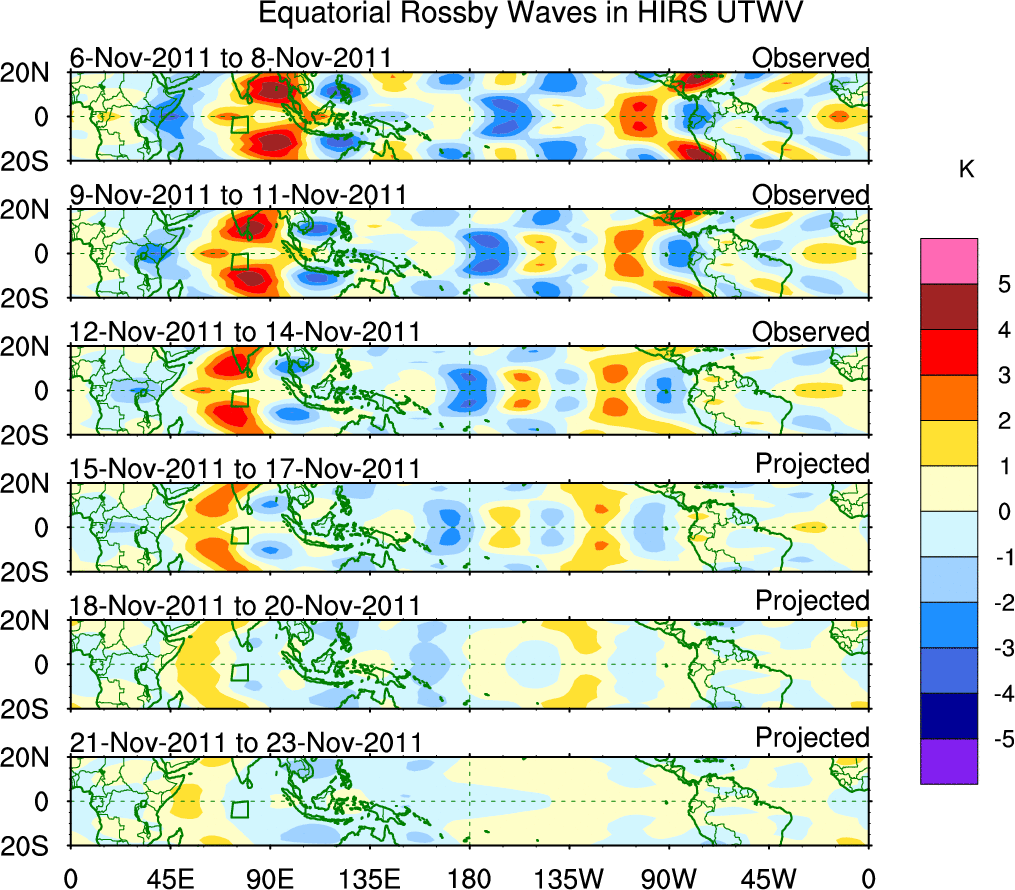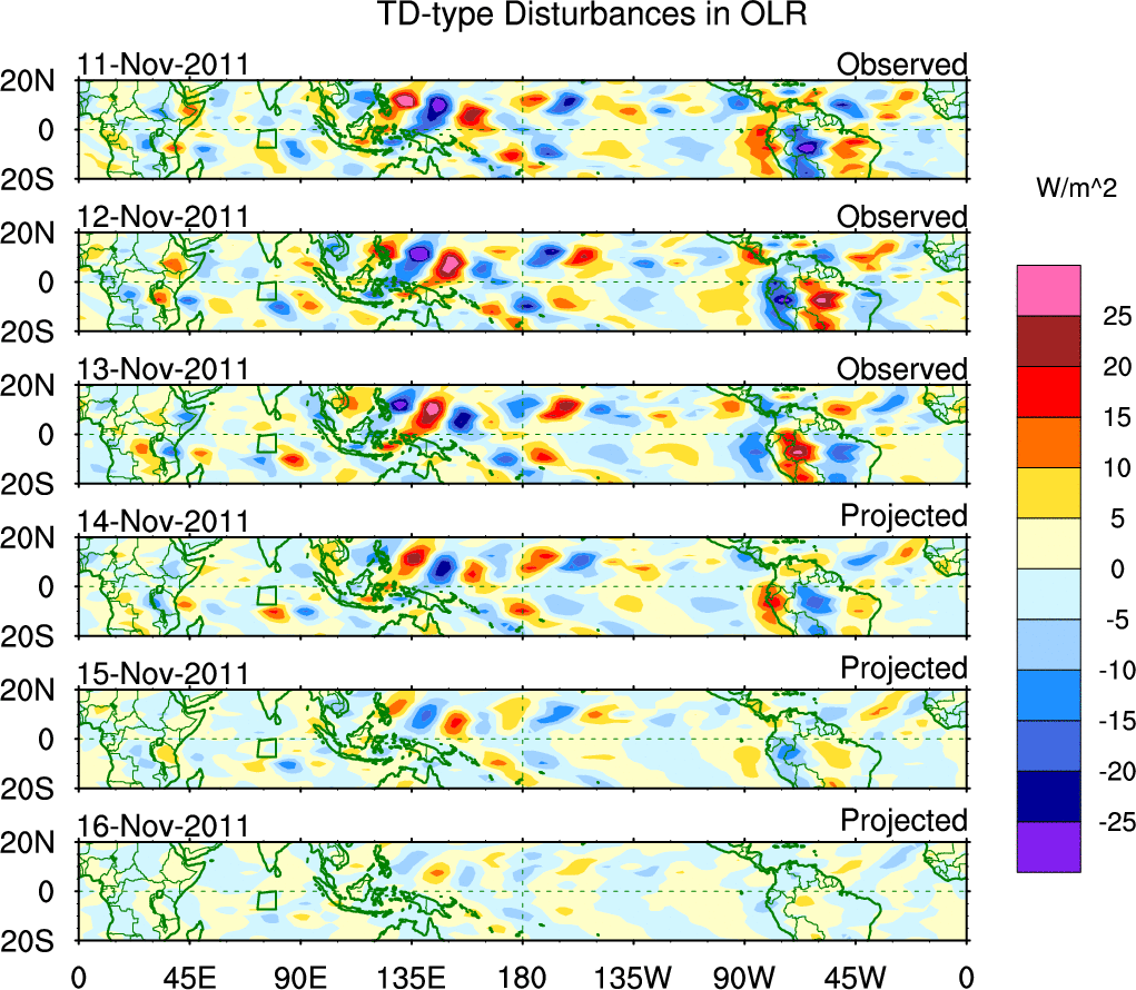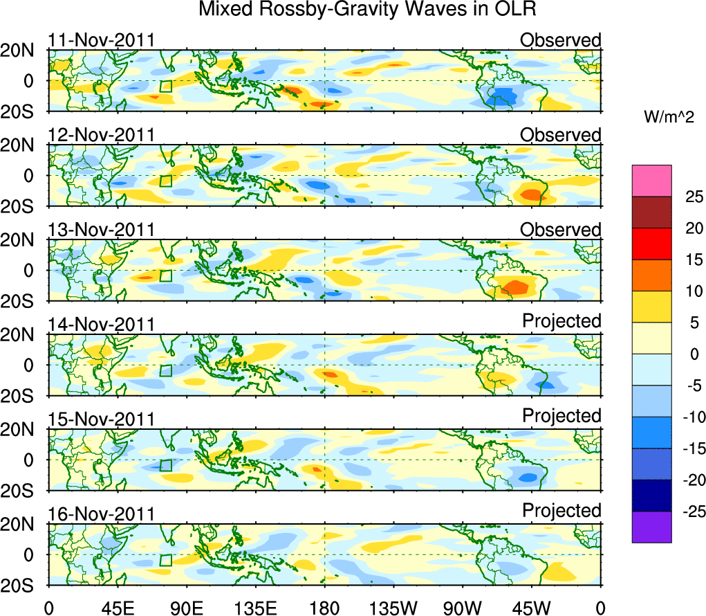 To identify tropical waves in near real-time, the OLR and UTWV data are filtered following Wheeler & Weickmann (2001 MWR). The daily anomalies are calculated using the first 3 harmonics of the seasonal cycle for 1979–2009. Missing values are then filled using linear interpolation in space and time. The most recent 365 days of anomalies are padded with 659 days of zeroes, and the result is filtered for each wave type.