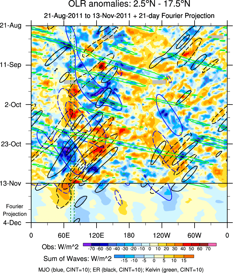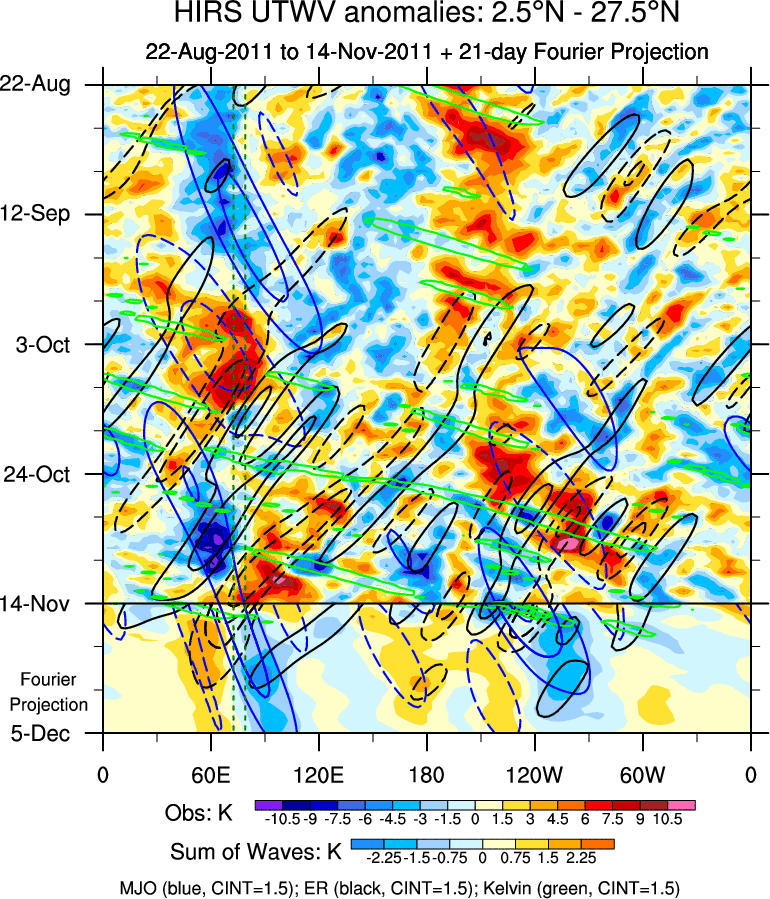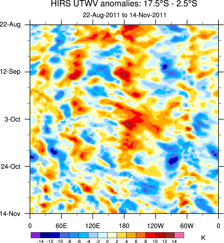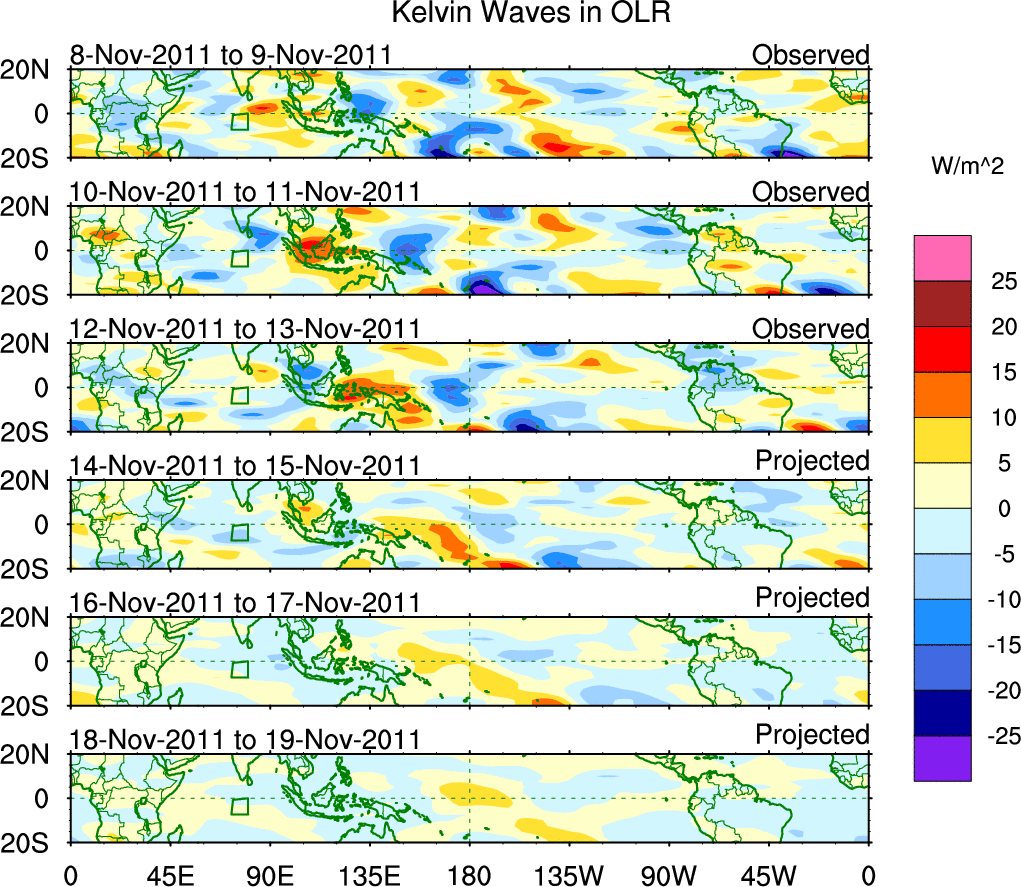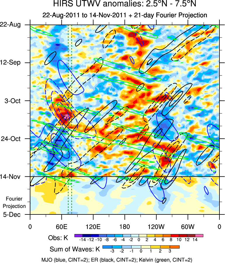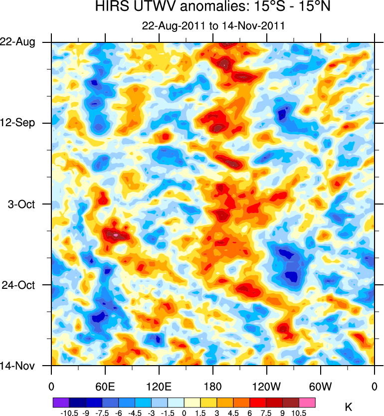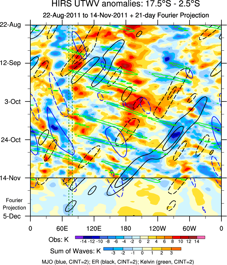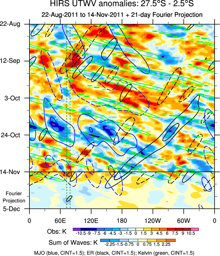 To identify tropical waves in near real-time, the OLR and UTWV data are filtered following Wheeler & Weickmann (2001 MWR). The daily anomalies are calculated using the first 3 harmonics of the seasonal cycle for 1979–2009. Missing values are then filled using linear interpolation in space and time. The most recent 365 days of anomalies are padded with 659 days of zeroes, and the result is filtered for each wave type.