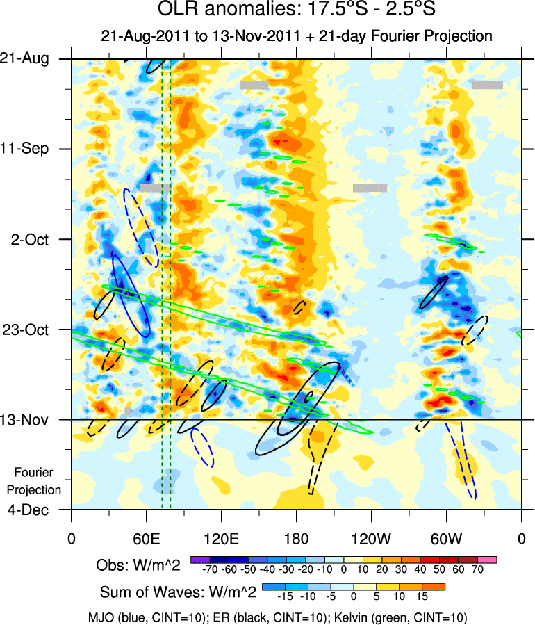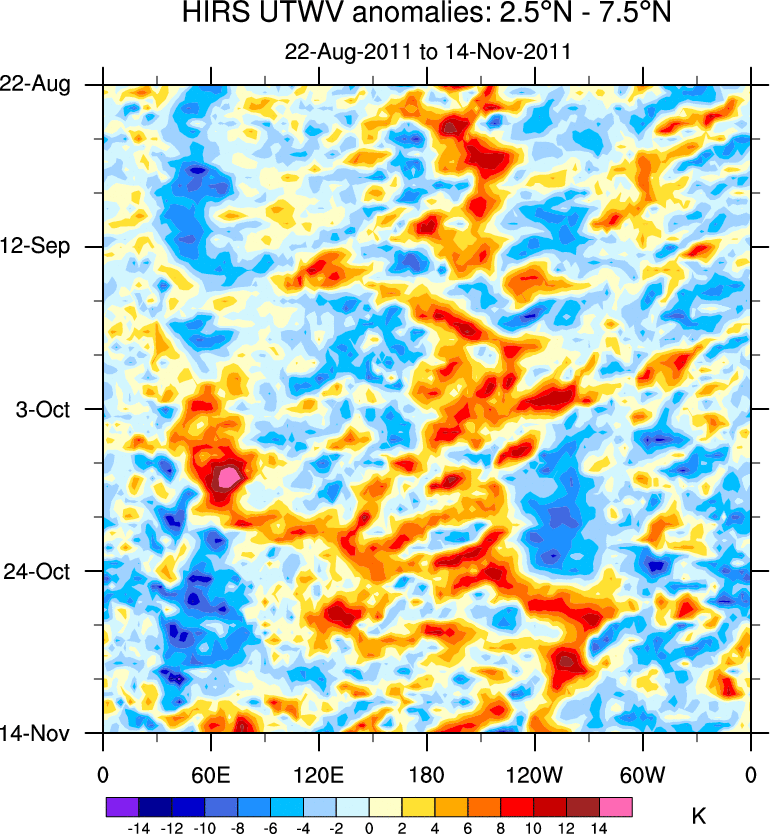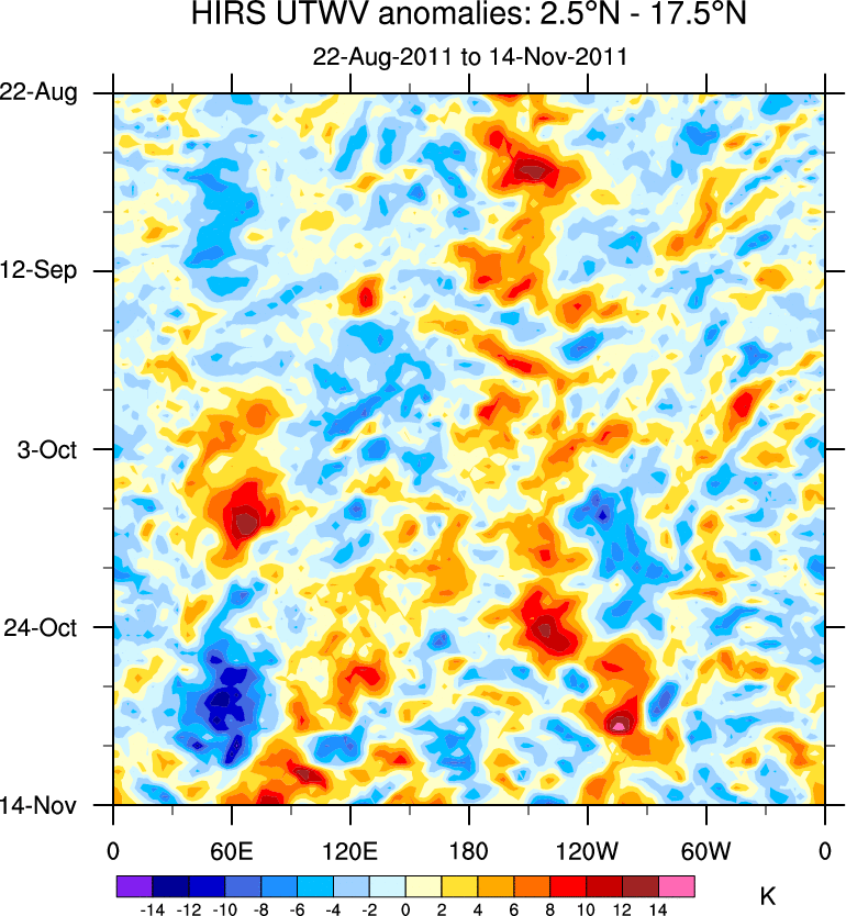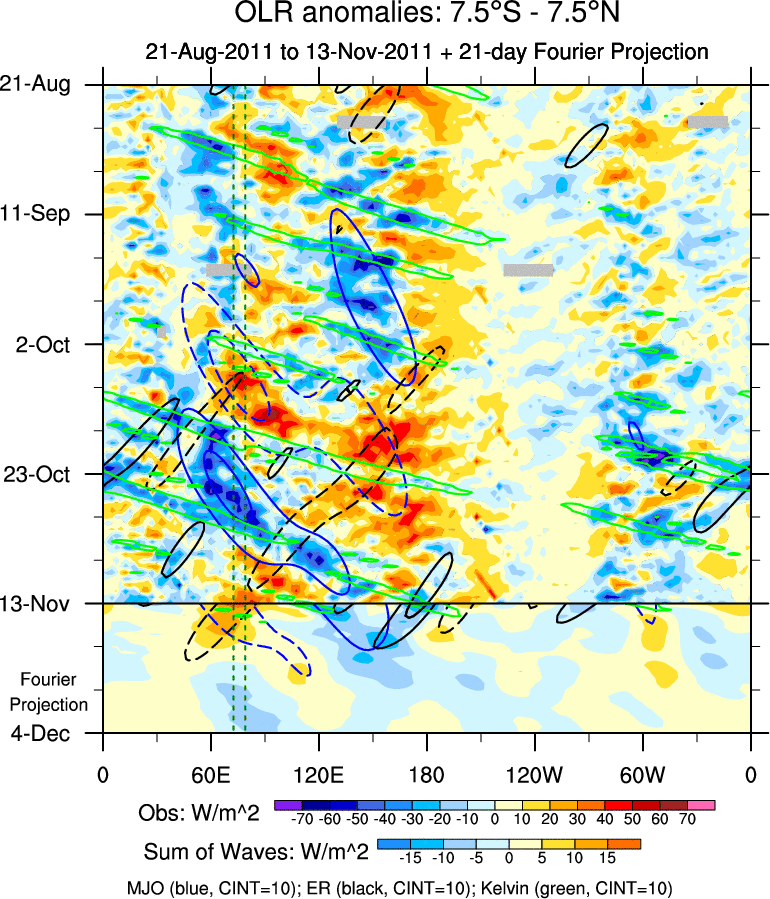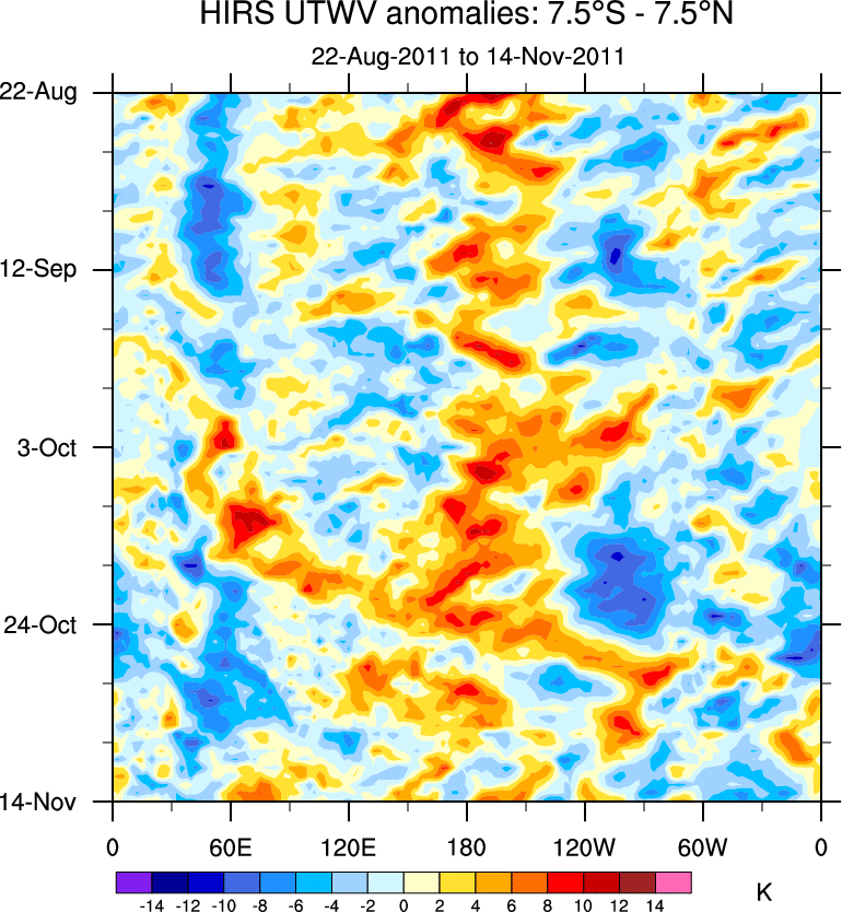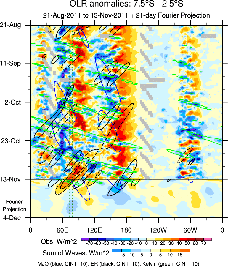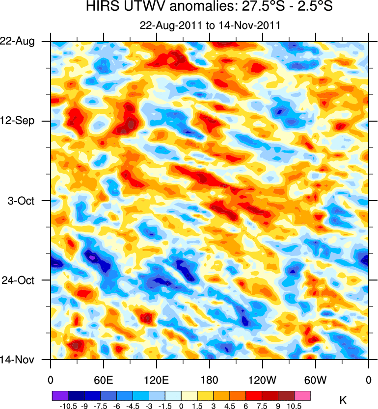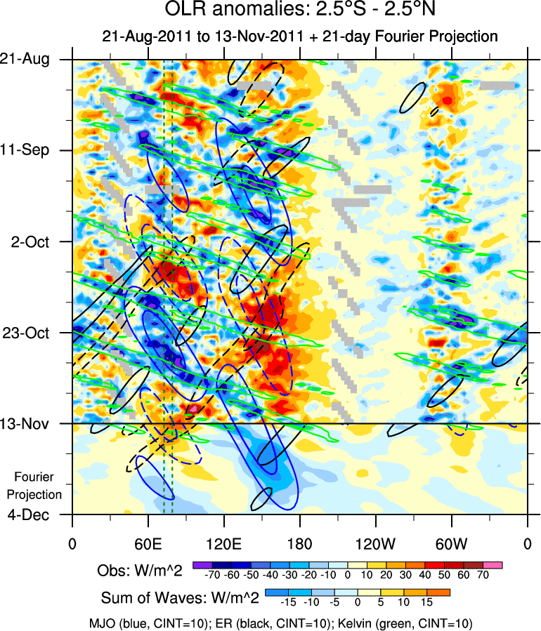To identify tropical waves in near real-time, the OLR and UTWV data are filtered following Wheeler & Weickmann (2001 MWR). The daily anomalies are calculated using the first 3 harmonics of the seasonal cycle for 1979–2009. Missing values are then filled using linear interpolation in space and time. The most recent 365 days of anomalies are padded with 659 days of zeroes, and the result is filtered for each wave type.