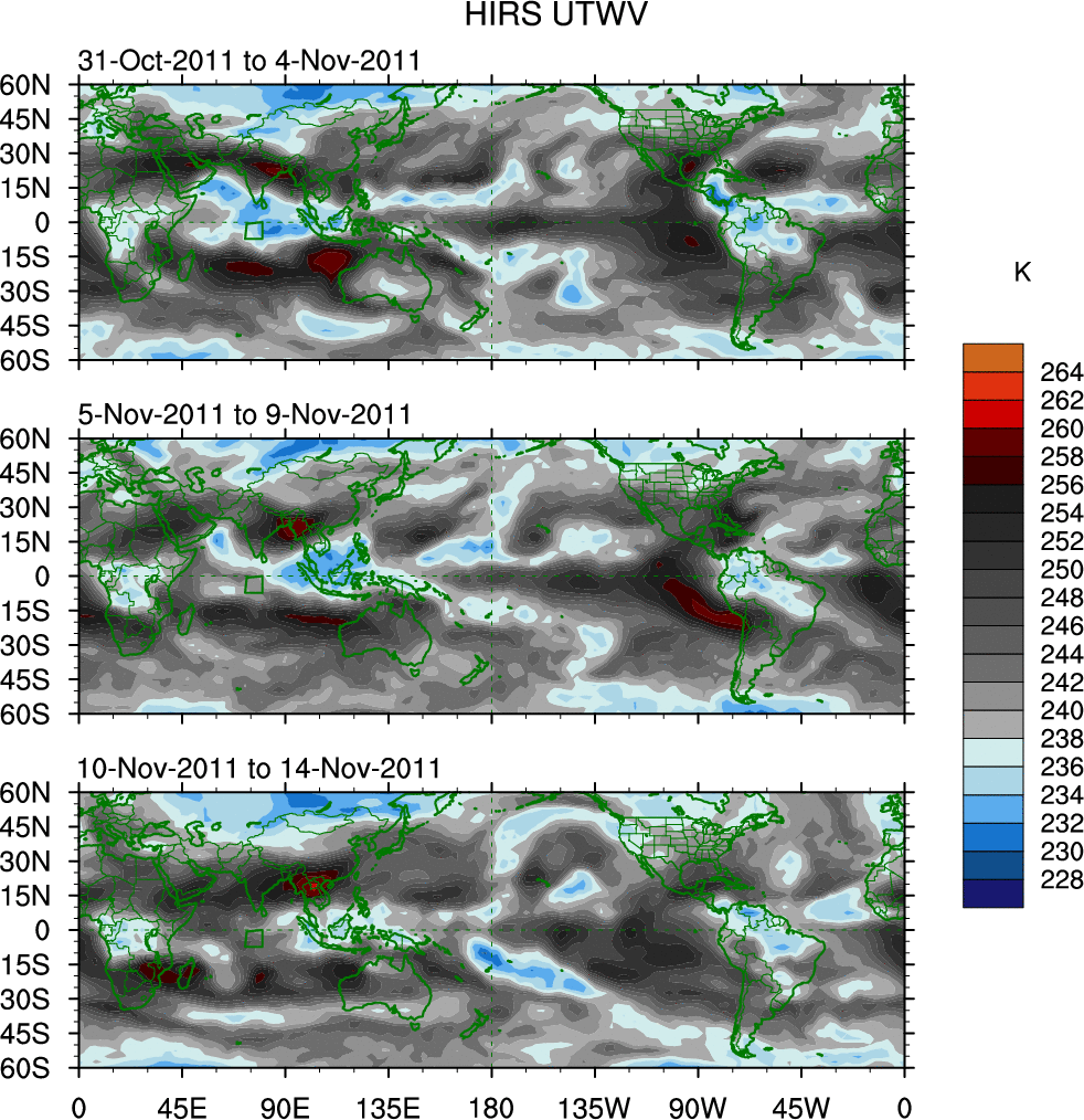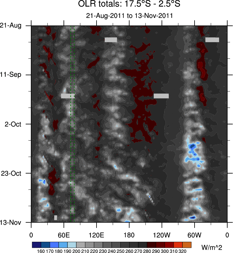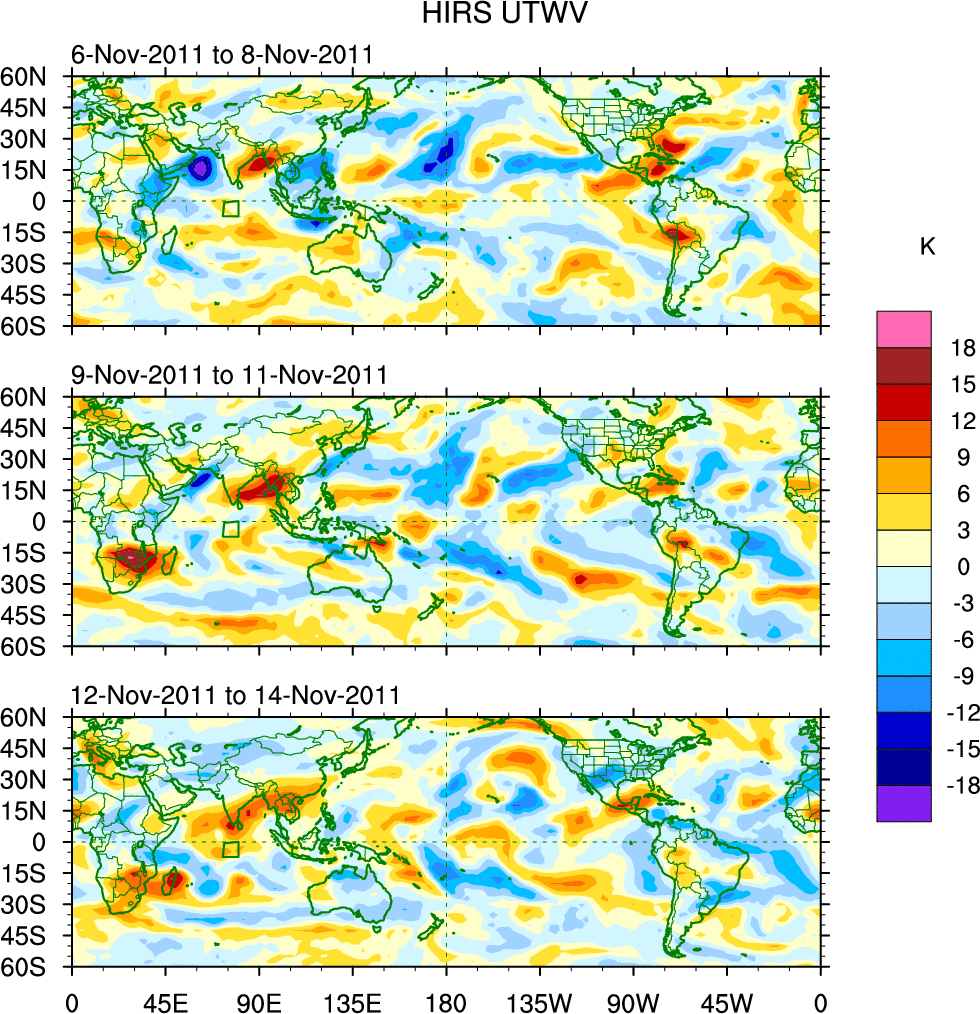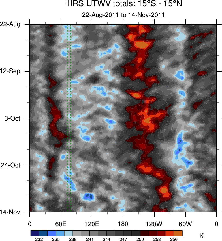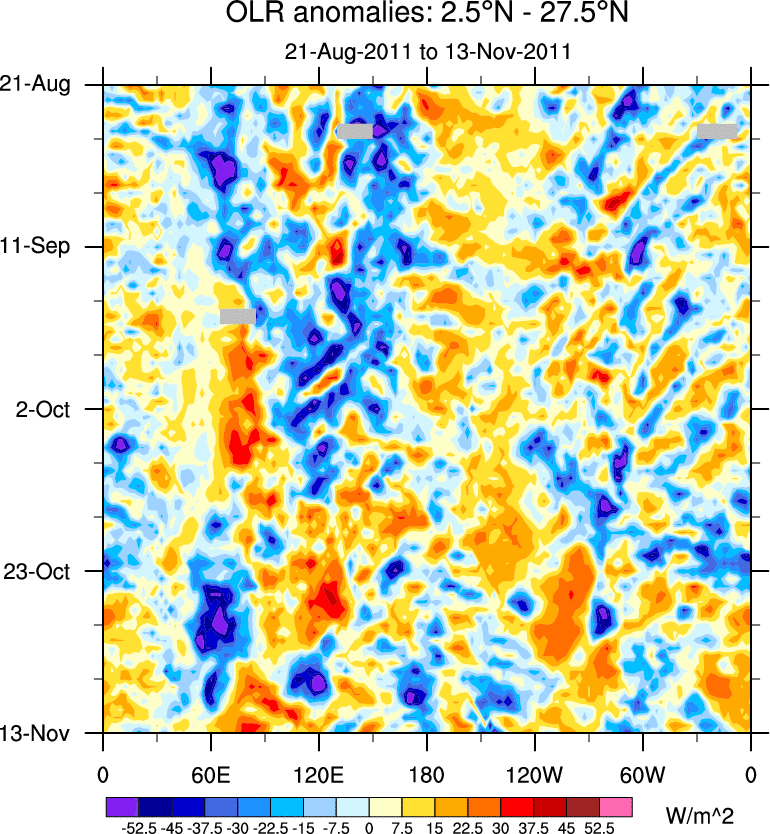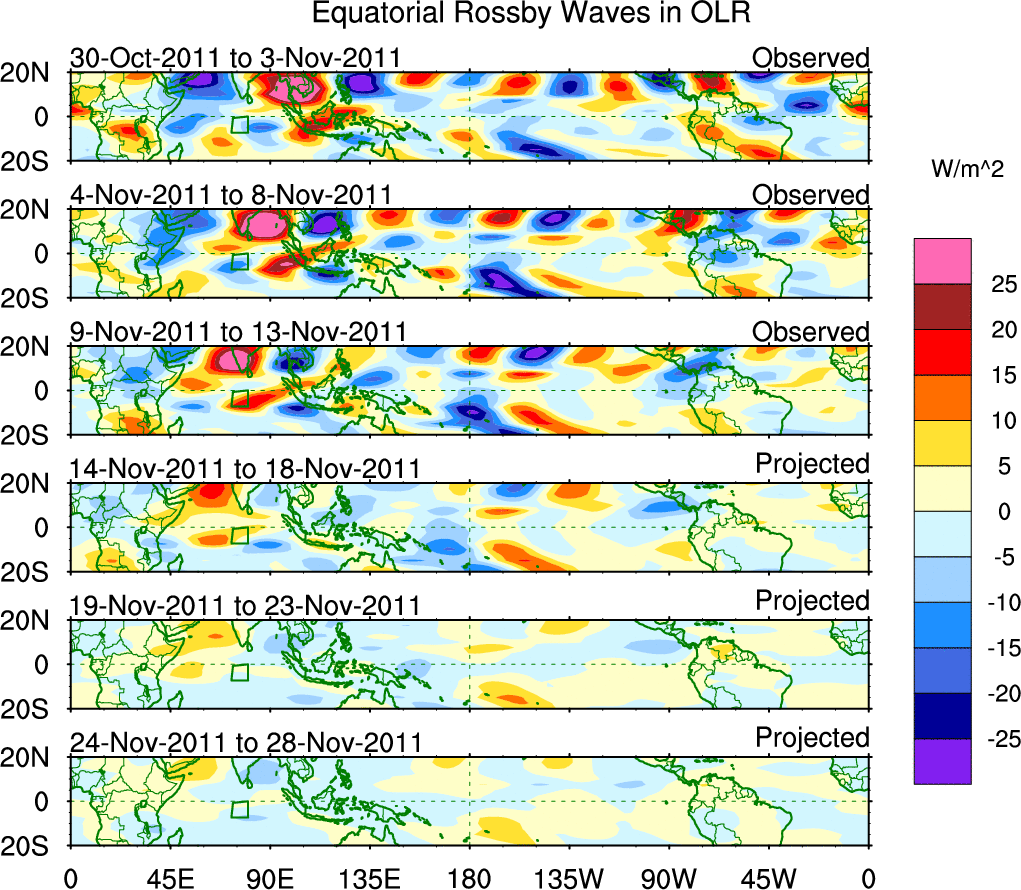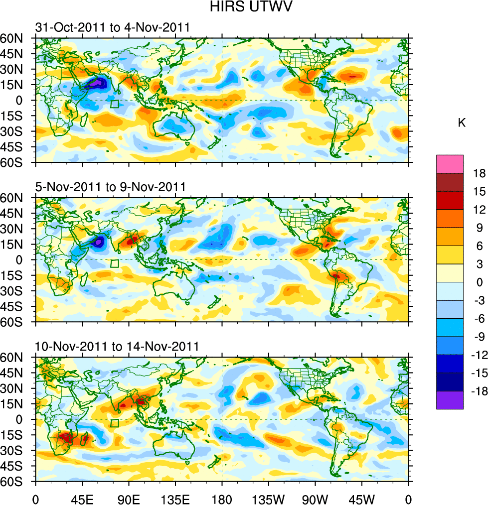 To identify tropical waves in near real-time, the OLR and UTWV data are filtered following Wheeler & Weickmann (2001 MWR). The daily anomalies are calculated using the first 3 harmonics of the seasonal cycle for 1979–2009. Missing values are then filled using linear interpolation in space and time. The most recent 365 days of anomalies are padded with 659 days of zeroes, and the result is filtered for each wave type.