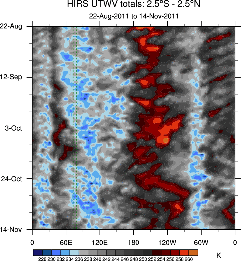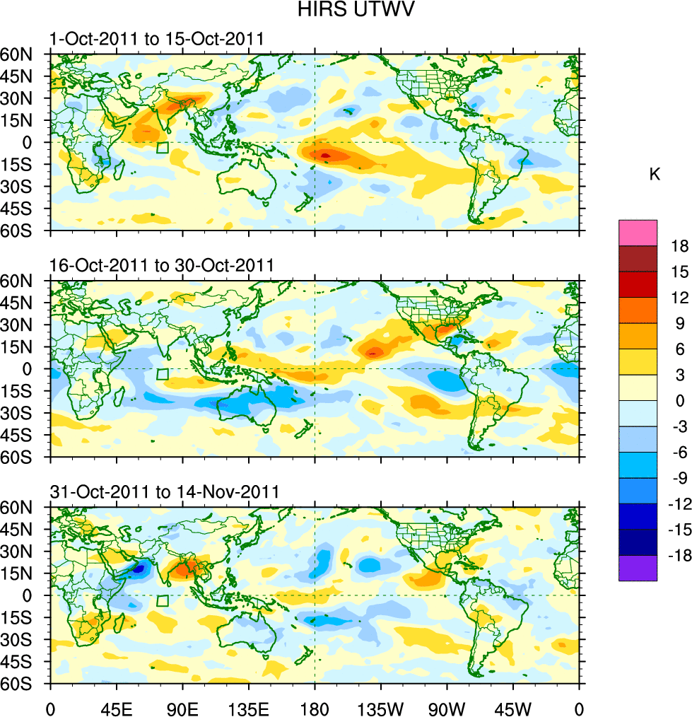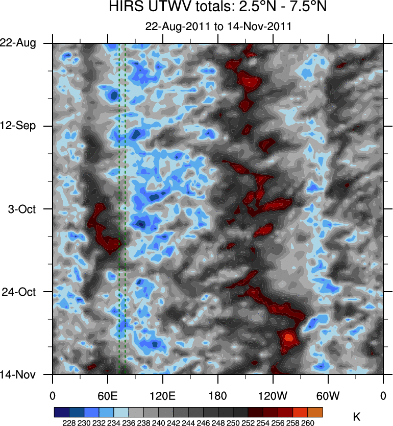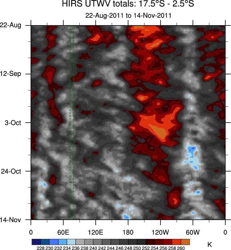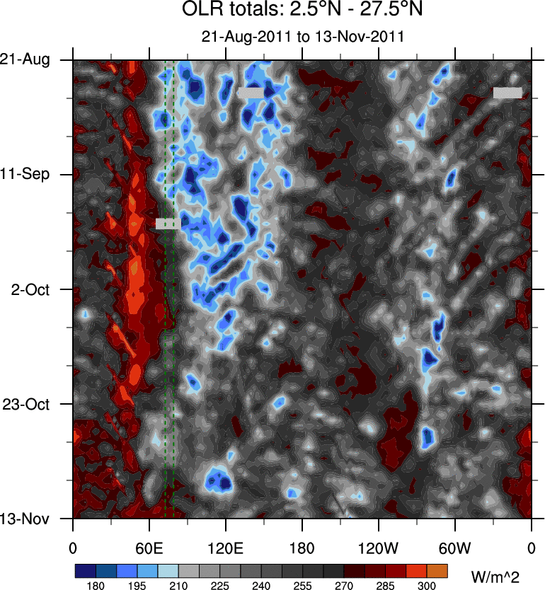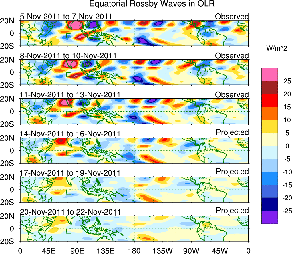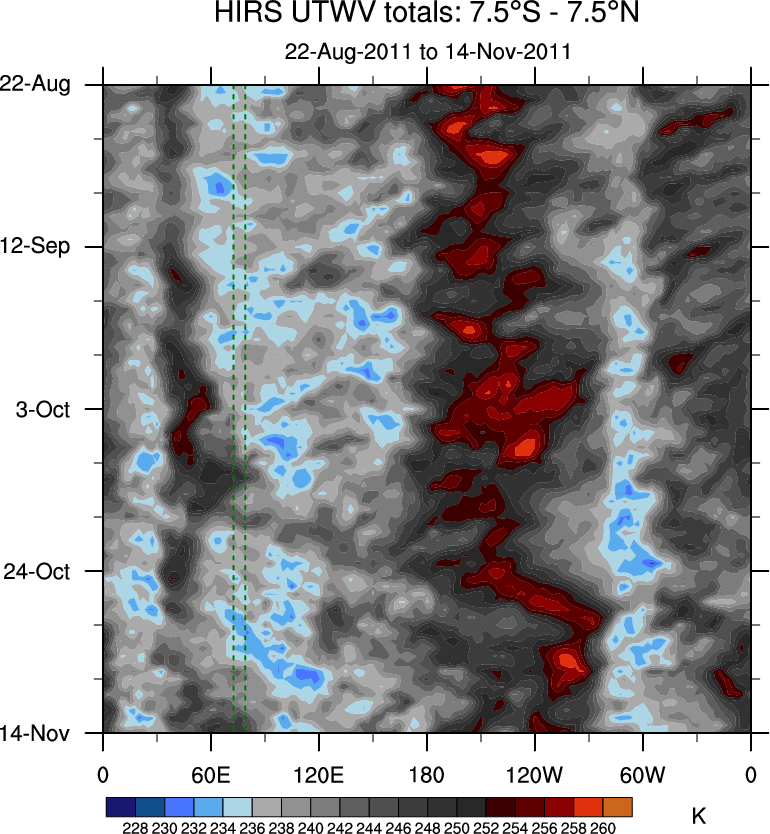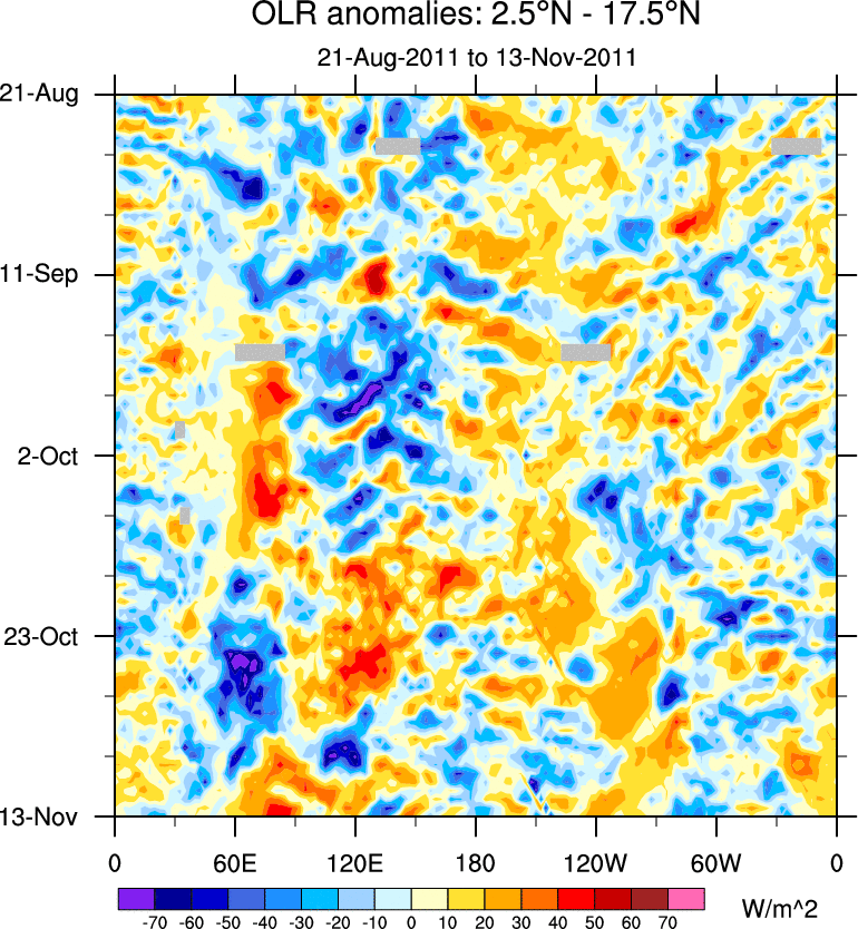 To identify tropical waves in near real-time, the OLR and UTWV data are filtered following Wheeler & Weickmann (2001 MWR). The daily anomalies are calculated using the first 3 harmonics of the seasonal cycle for 1979–2009. Missing values are then filled using linear interpolation in space and time. The most recent 365 days of anomalies are padded with 659 days of zeroes, and the result is filtered for each wave type.