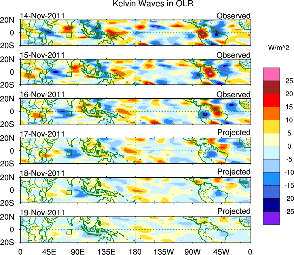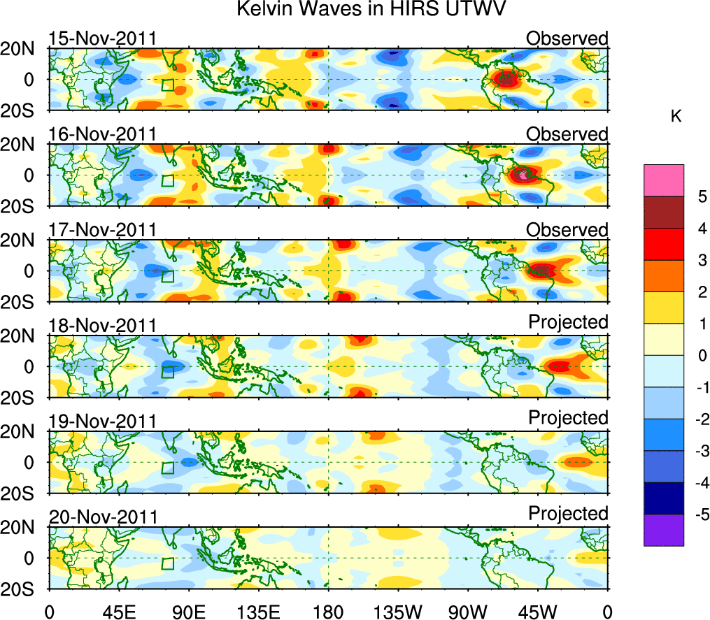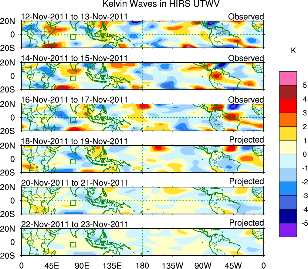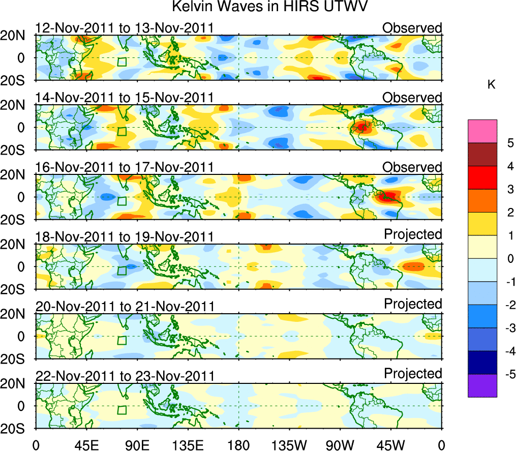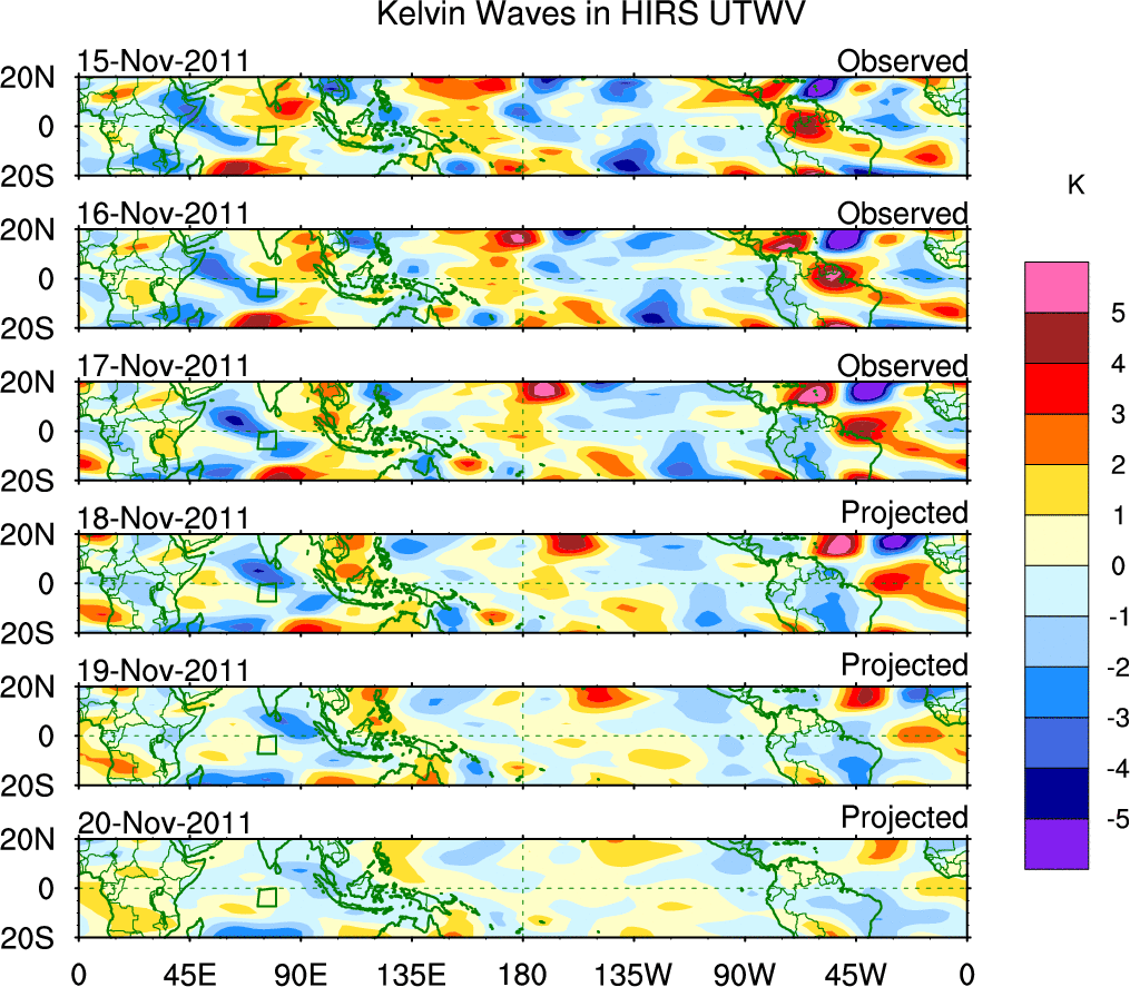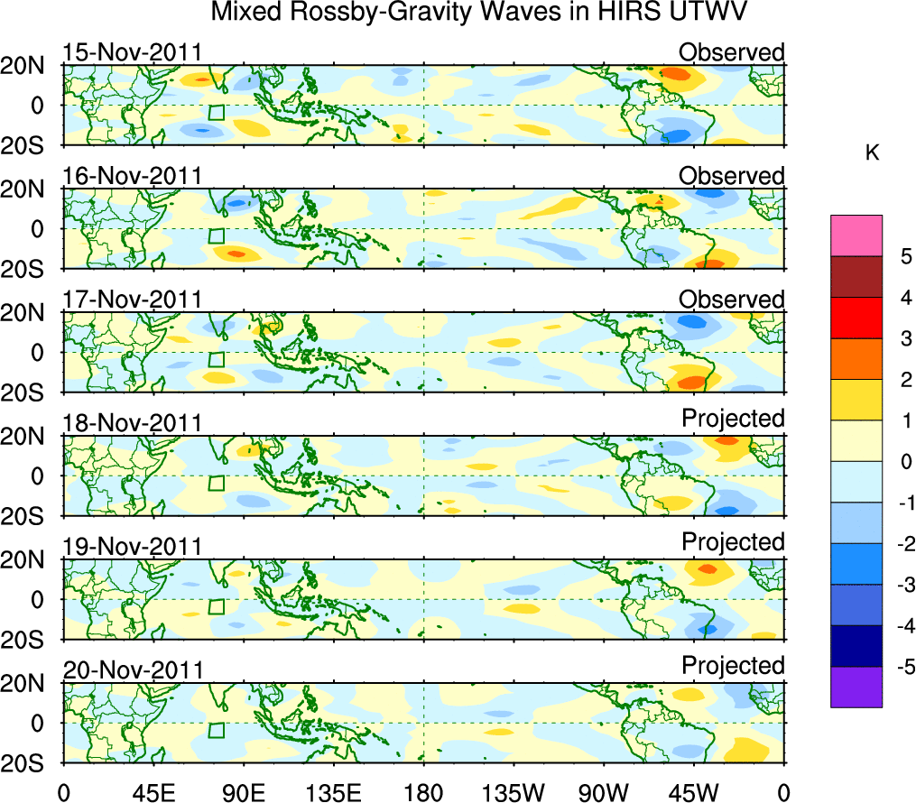To identify tropical waves in near real-time, the OLR and UTWV data are filtered following Wheeler & Weickmann (2001 MWR). The daily anomalies are calculated using the first 3 harmonics of the seasonal cycle for 1979–2009. Missing values are then filled using linear interpolation in space and time. The most recent 365 days of anomalies are padded with 659 days of zeroes, and the result is filtered for each wave type.