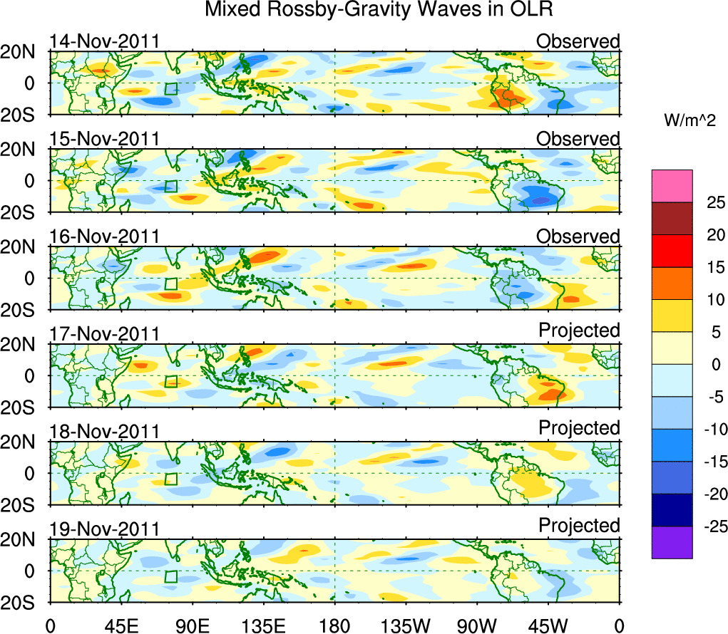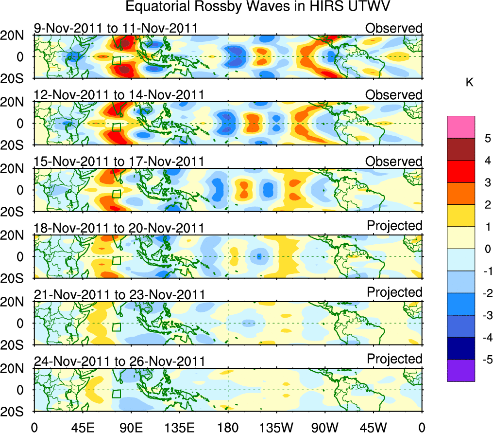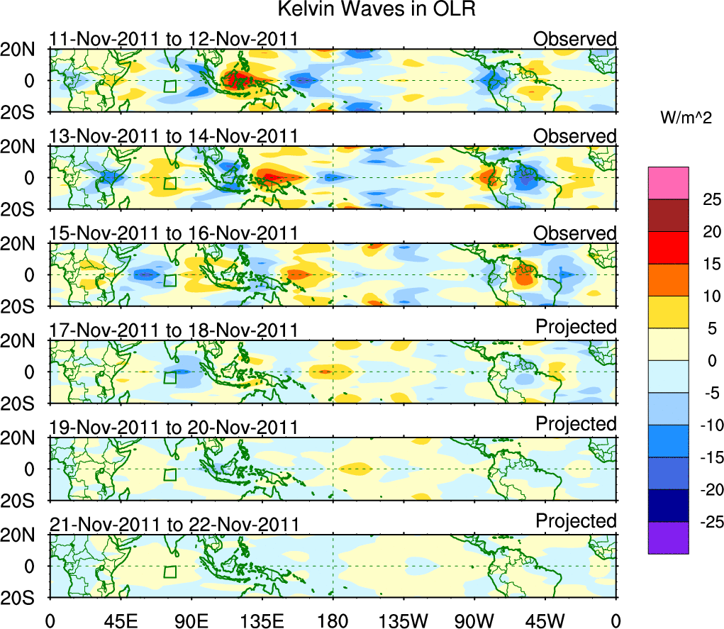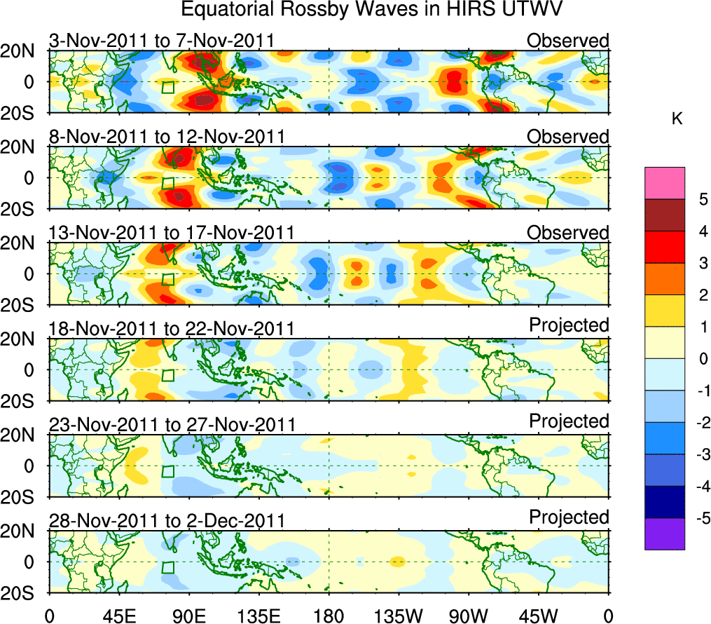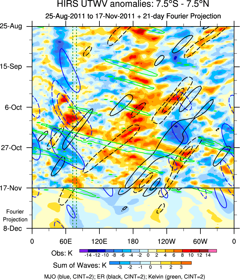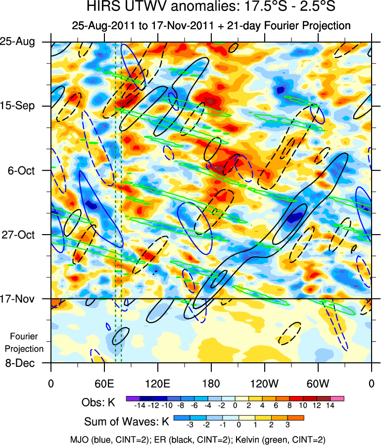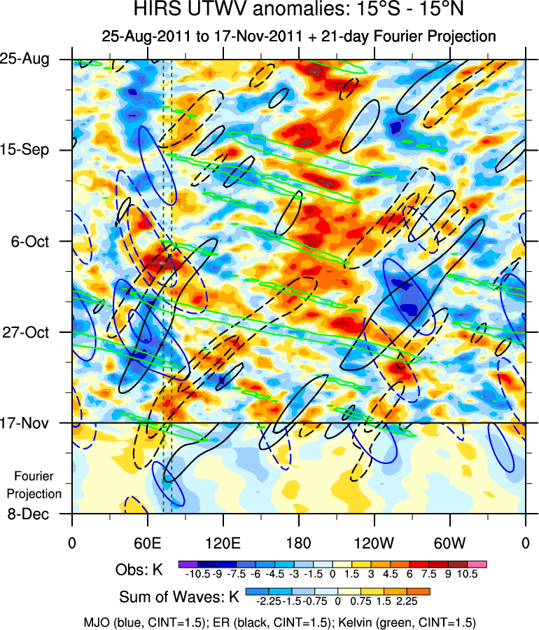 To identify tropical waves in near real-time, the OLR and UTWV data are filtered following Wheeler & Weickmann (2001 MWR). The daily anomalies are calculated using the first 3 harmonics of the seasonal cycle for 1979–2009. Missing values are then filled using linear interpolation in space and time. The most recent 365 days of anomalies are padded with 659 days of zeroes, and the result is filtered for each wave type.