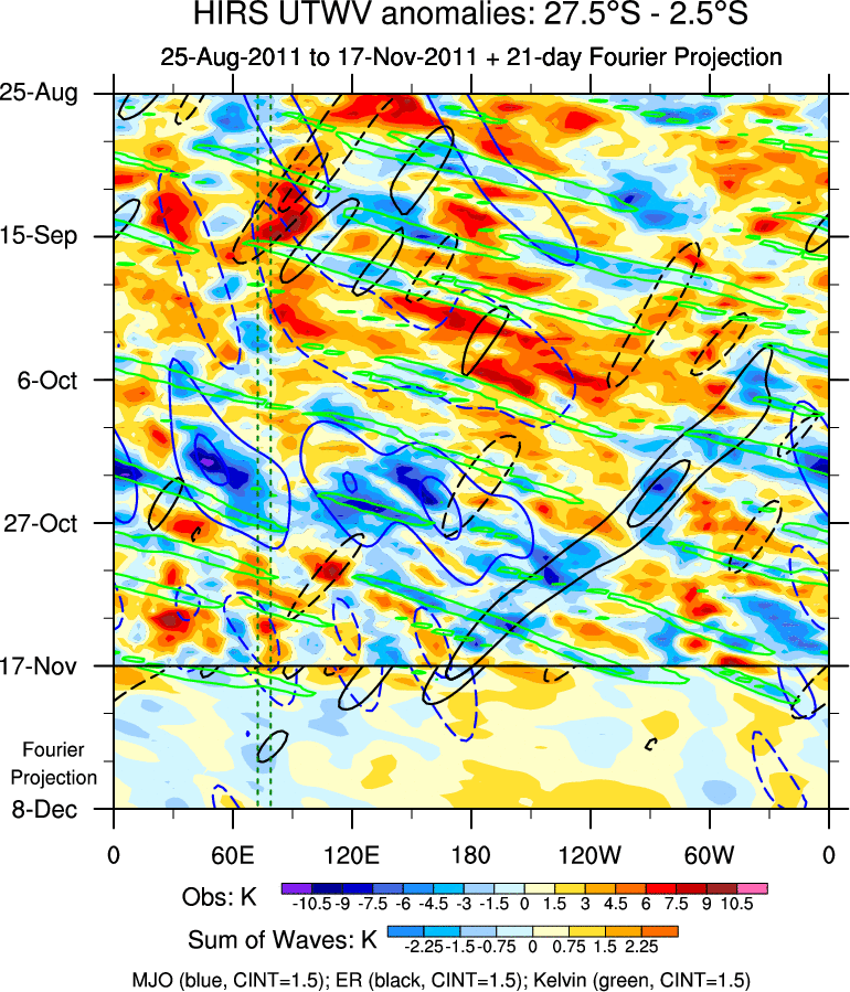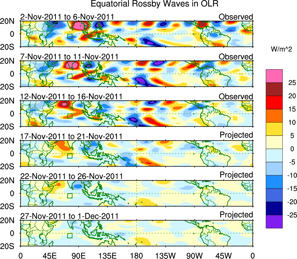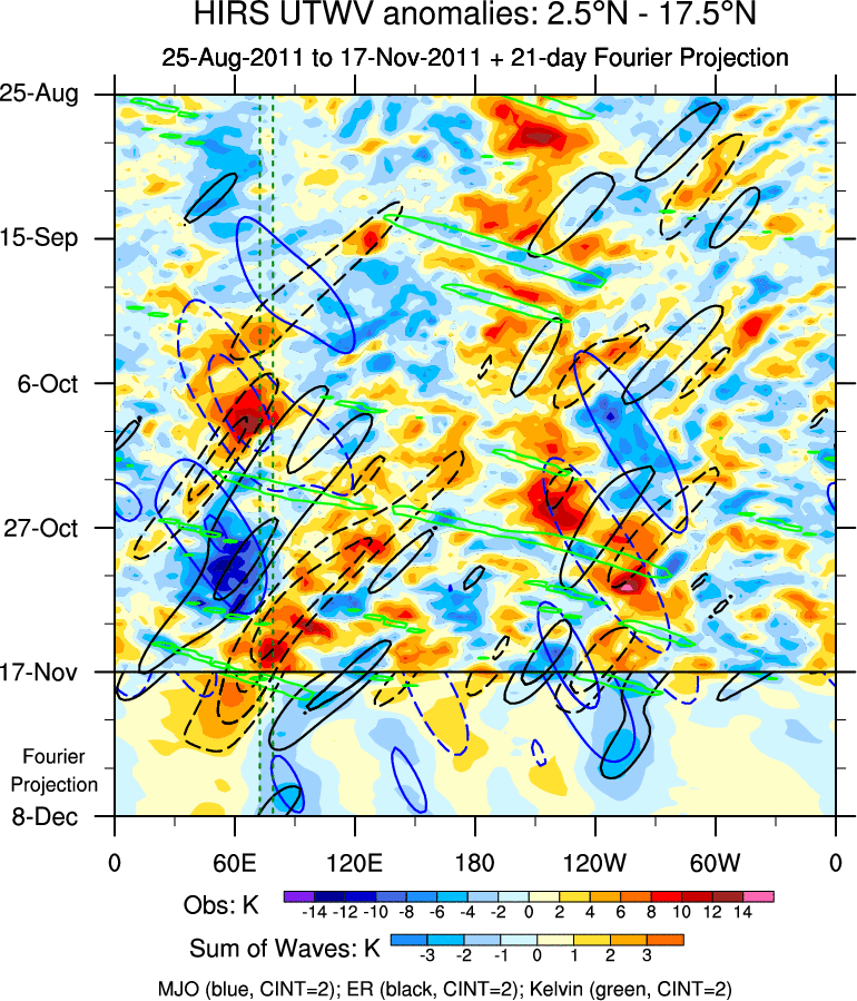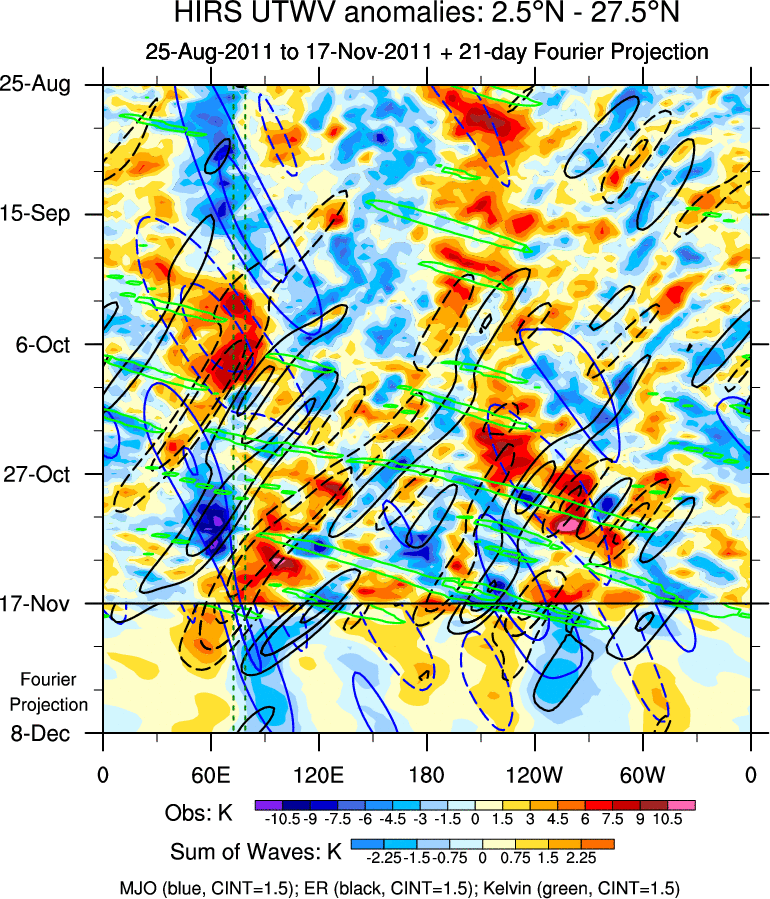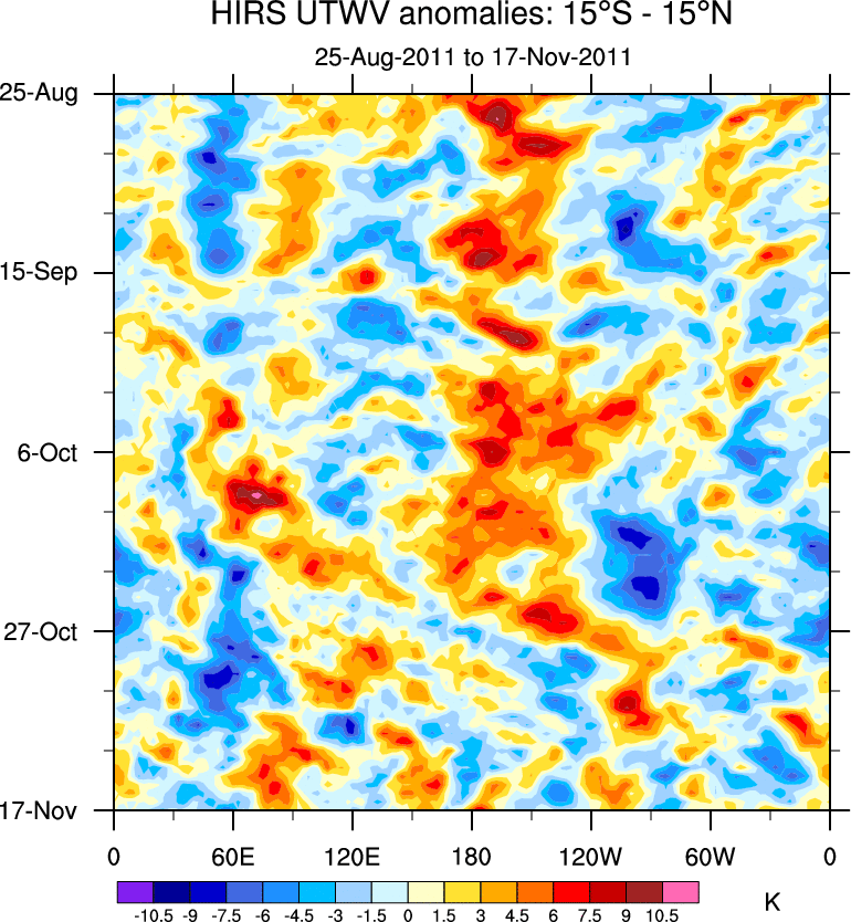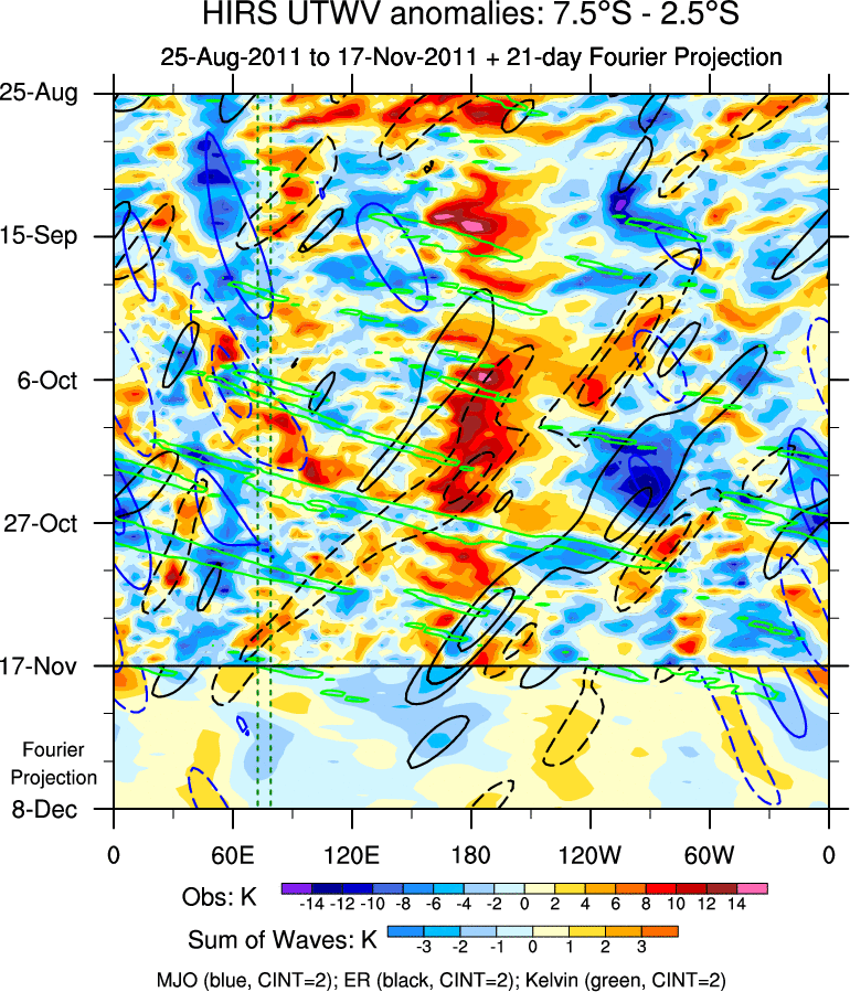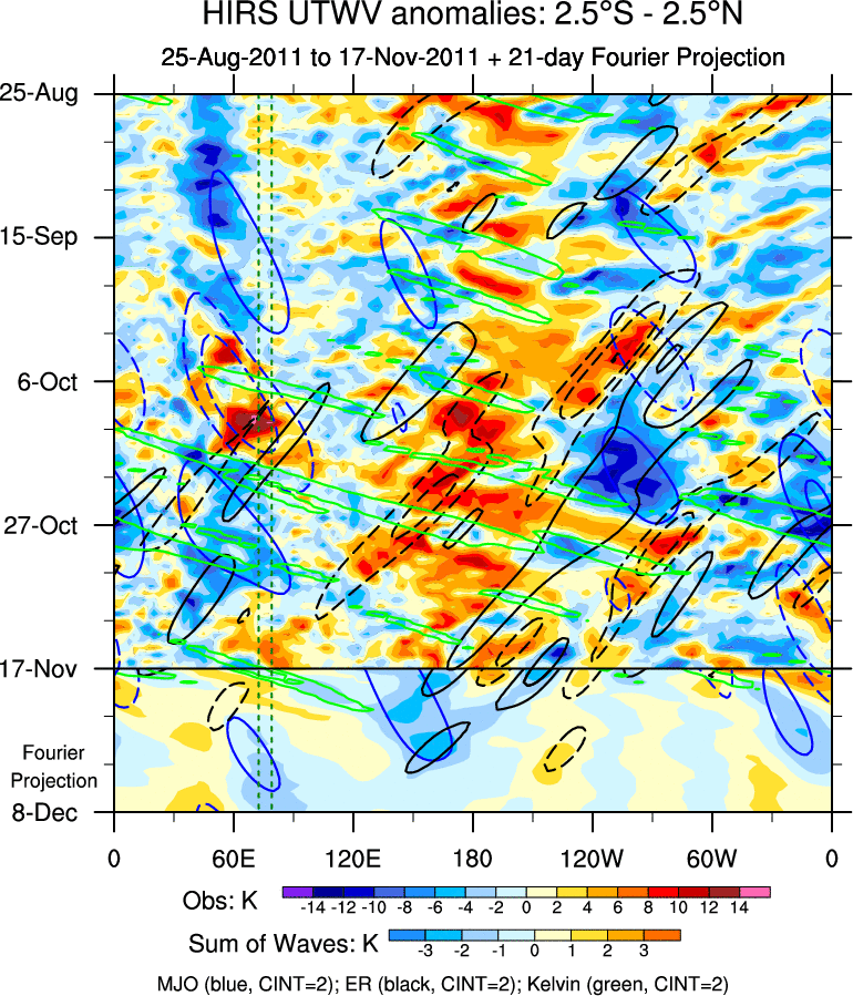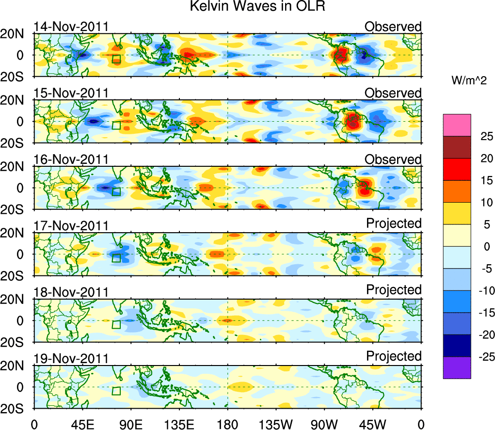 To identify tropical waves in near real-time, the OLR and UTWV data are filtered following Wheeler & Weickmann (2001 MWR). The daily anomalies are calculated using the first 3 harmonics of the seasonal cycle for 1979–2009. Missing values are then filled using linear interpolation in space and time. The most recent 365 days of anomalies are padded with 659 days of zeroes, and the result is filtered for each wave type.