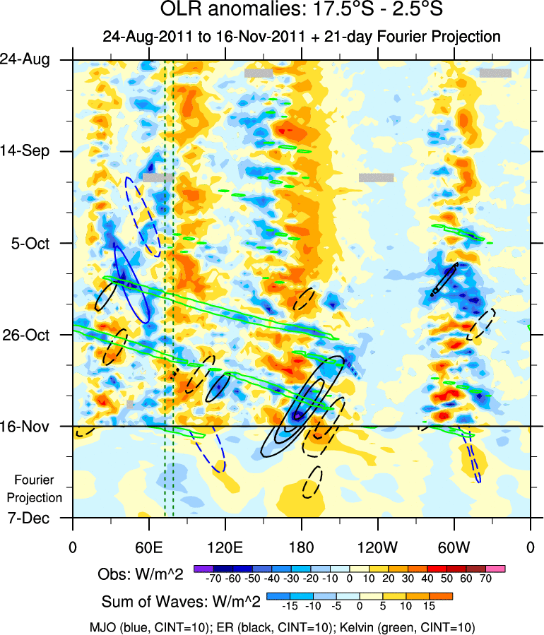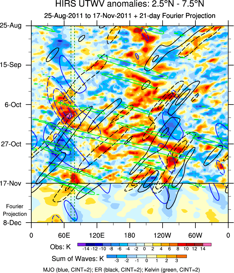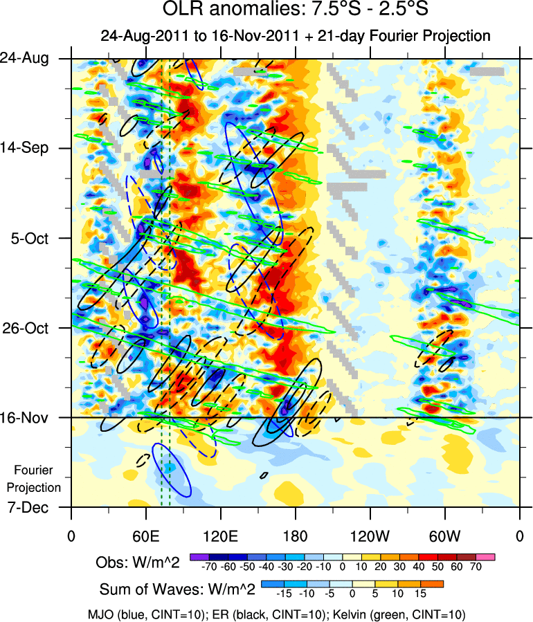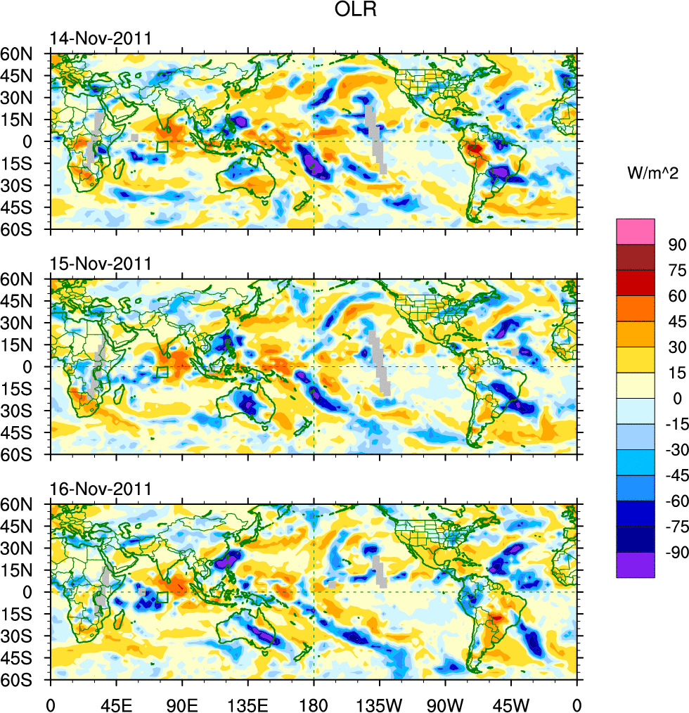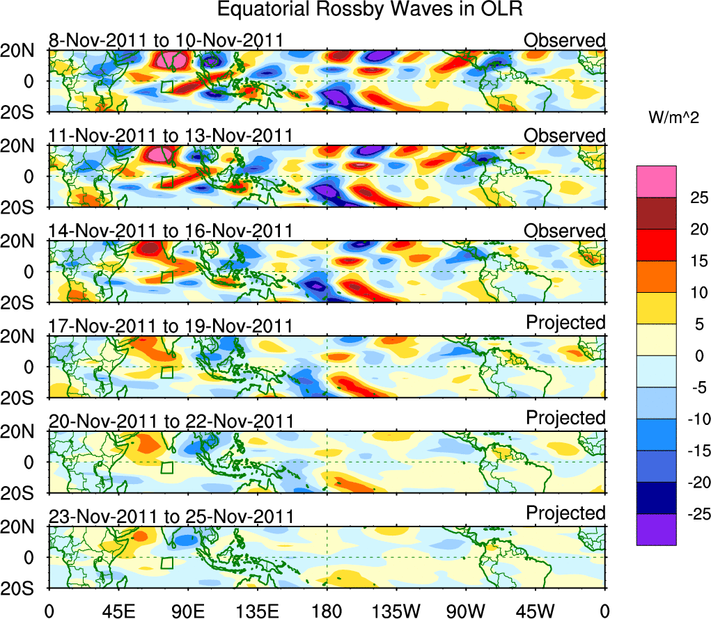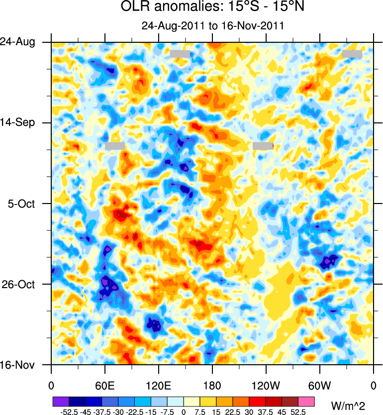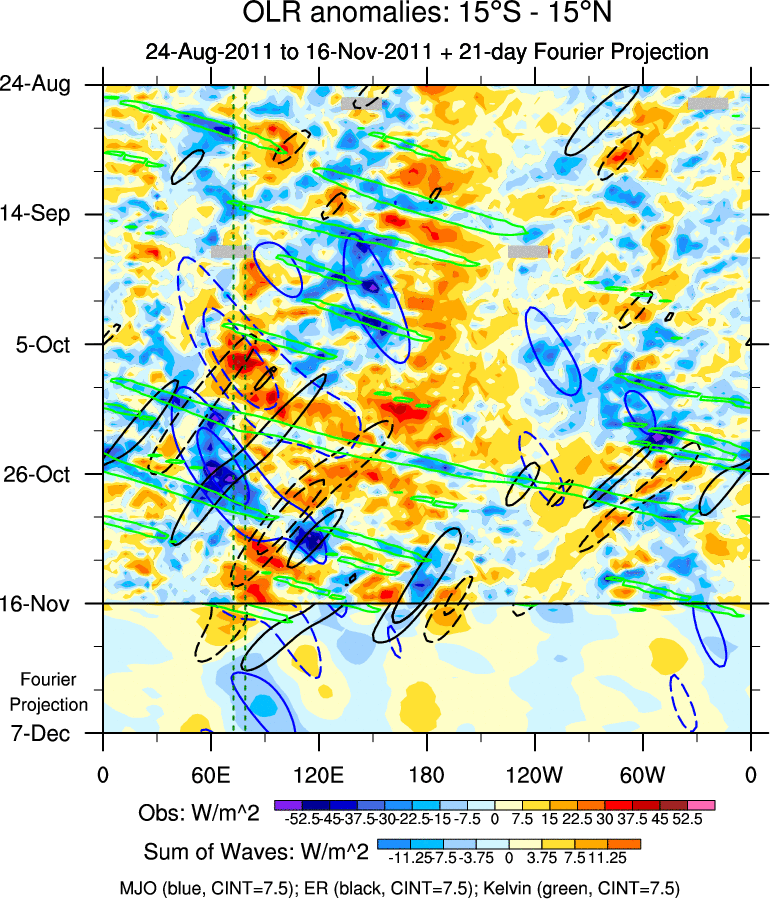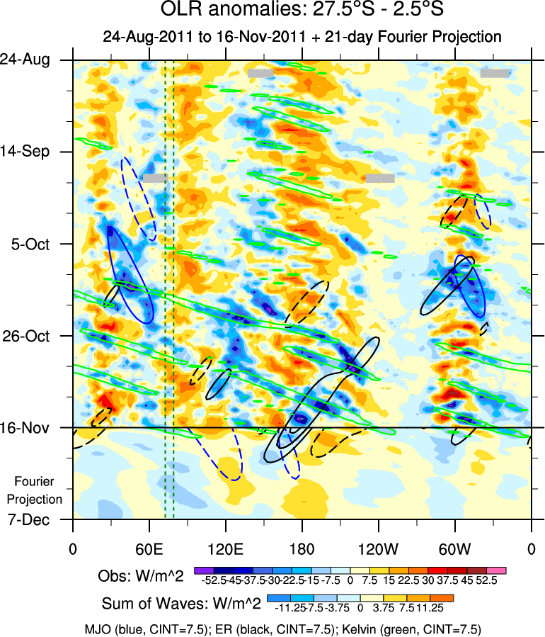 To identify tropical waves in near real-time, the OLR and UTWV data are filtered following Wheeler & Weickmann (2001 MWR). The daily anomalies are calculated using the first 3 harmonics of the seasonal cycle for 1979–2009. Missing values are then filled using linear interpolation in space and time. The most recent 365 days of anomalies are padded with 659 days of zeroes, and the result is filtered for each wave type.