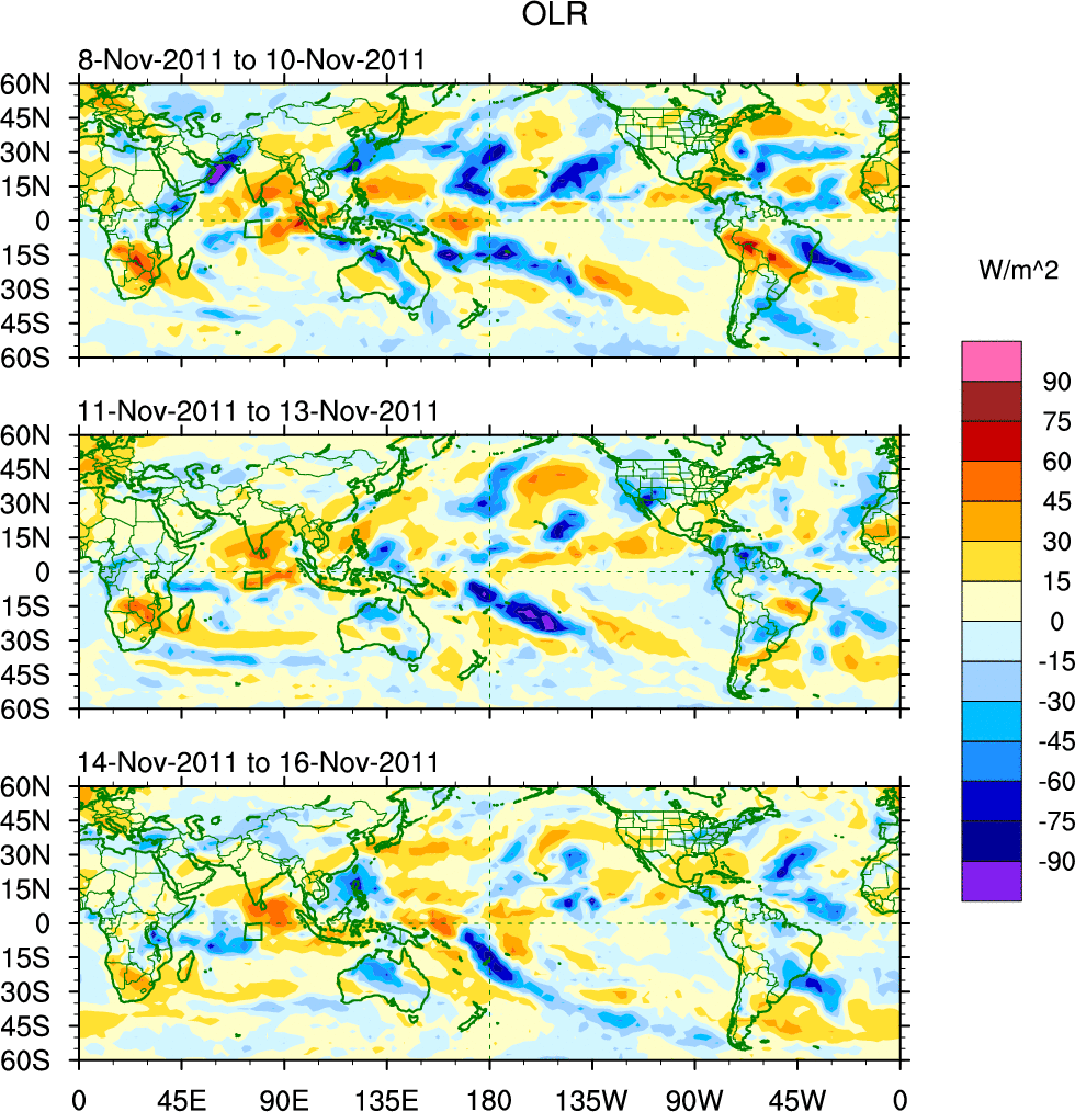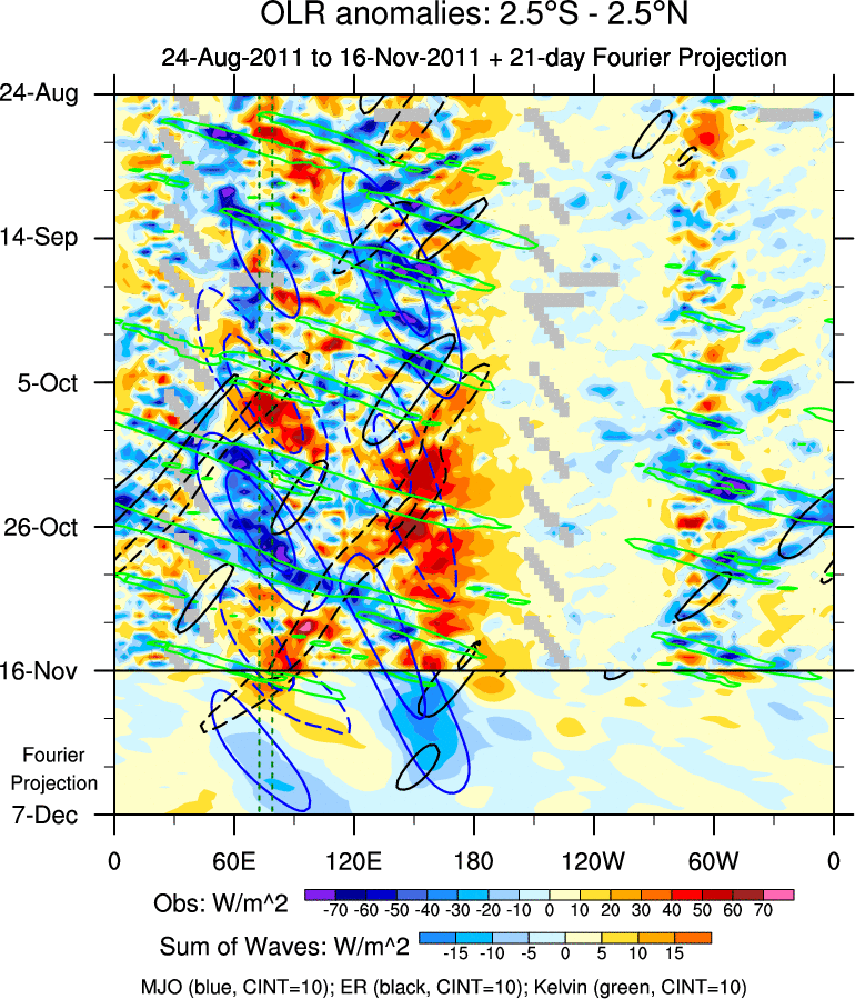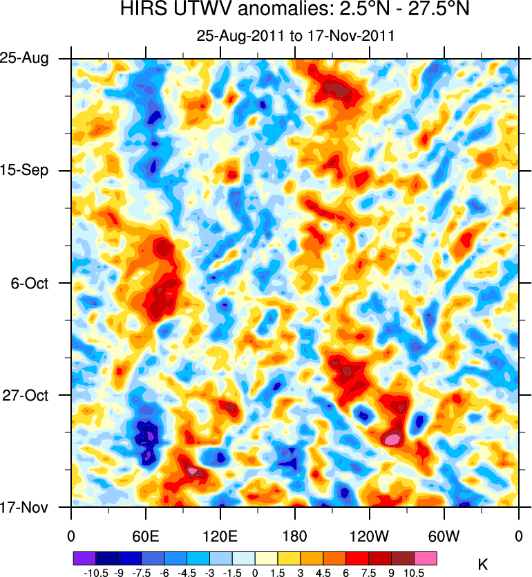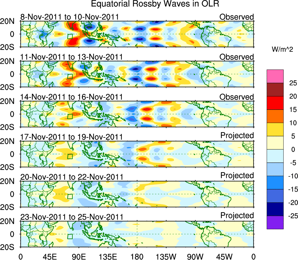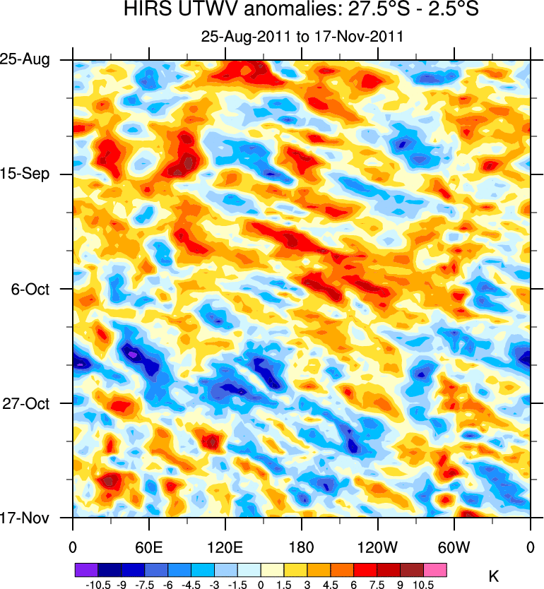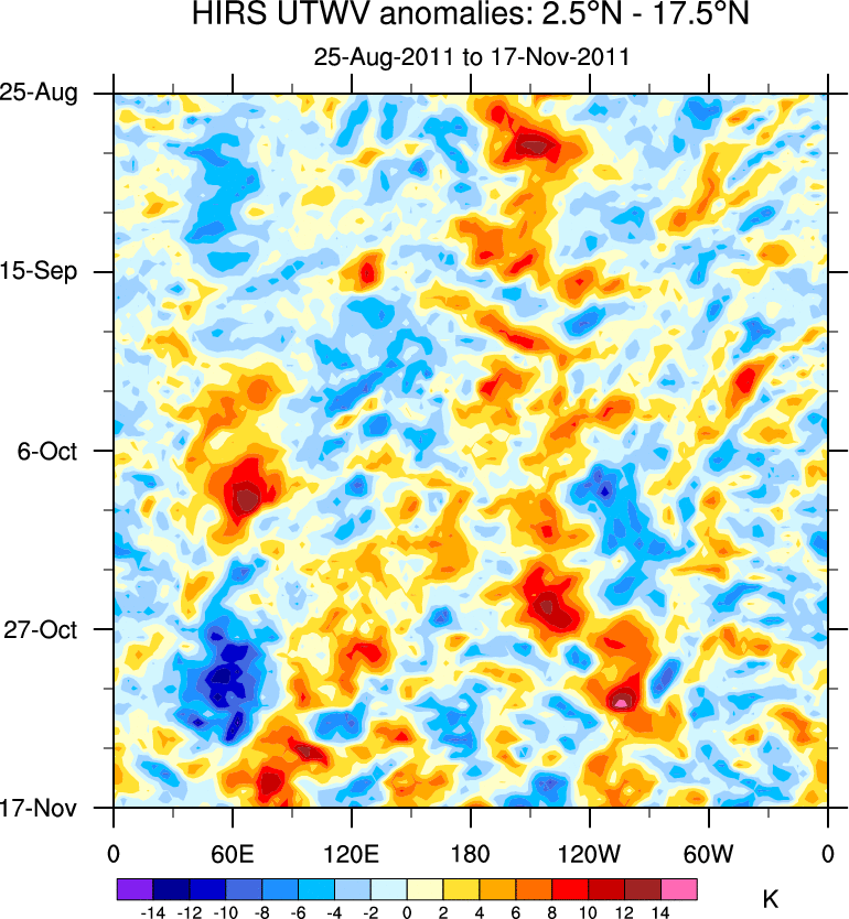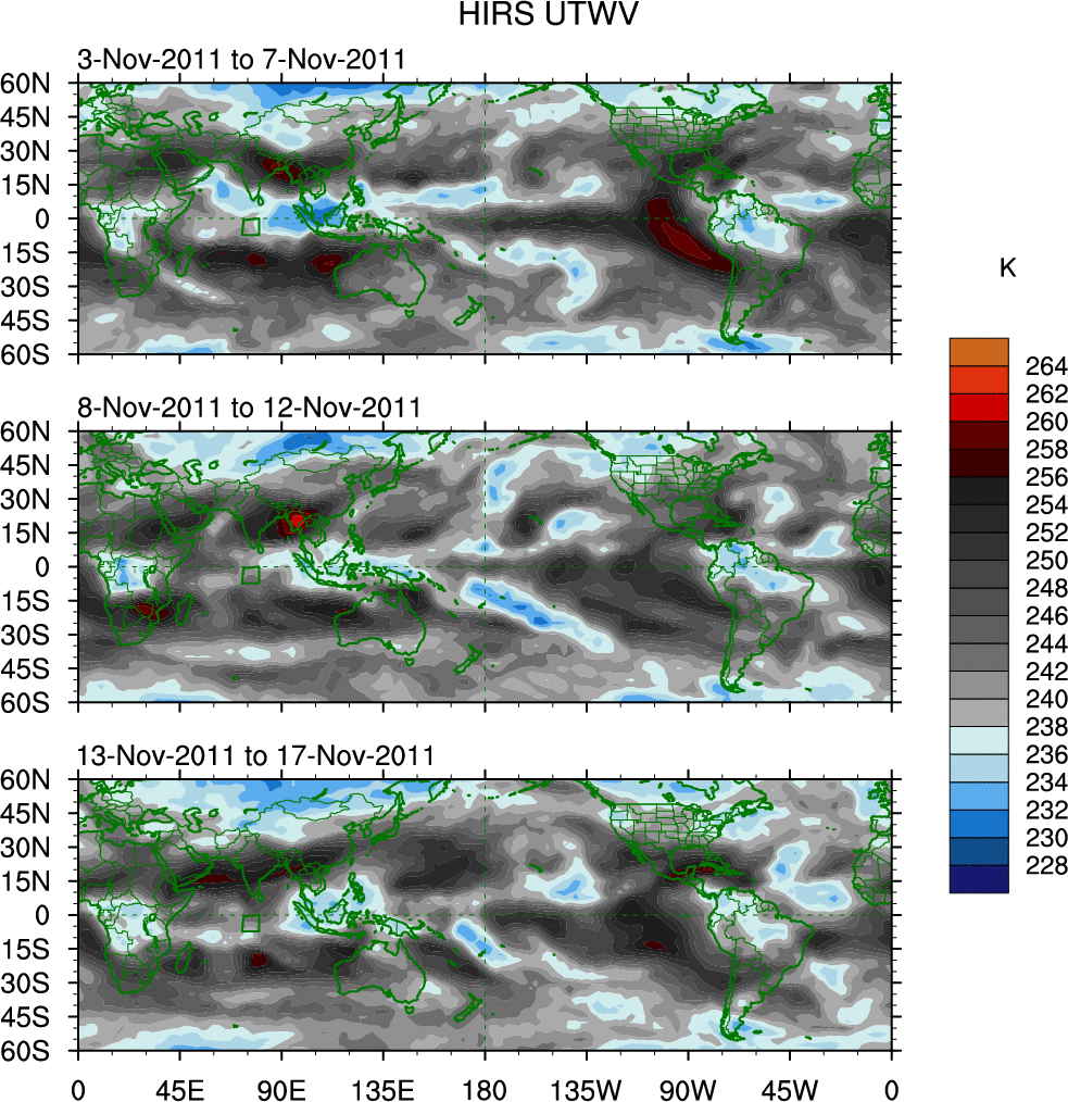 To identify tropical waves in near real-time, the OLR and UTWV data are filtered following Wheeler & Weickmann (2001 MWR). The daily anomalies are calculated using the first 3 harmonics of the seasonal cycle for 1979–2009. Missing values are then filled using linear interpolation in space and time. The most recent 365 days of anomalies are padded with 659 days of zeroes, and the result is filtered for each wave type.