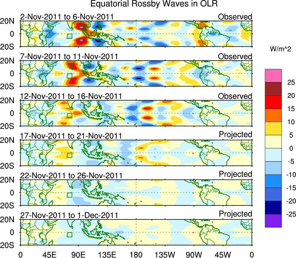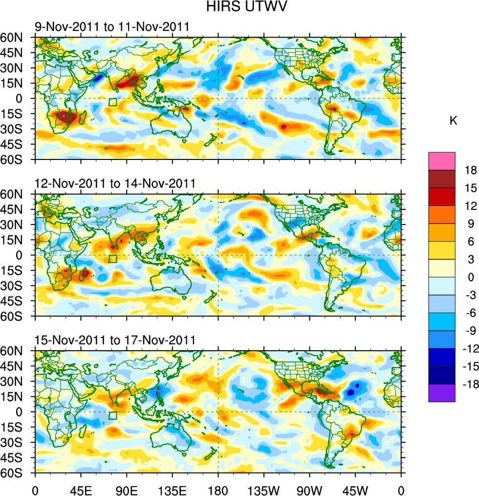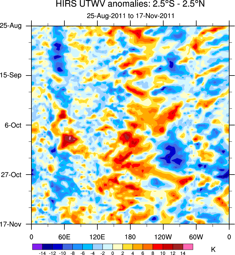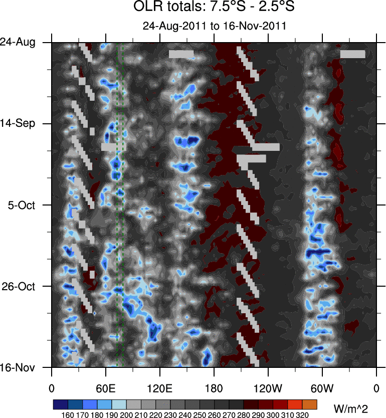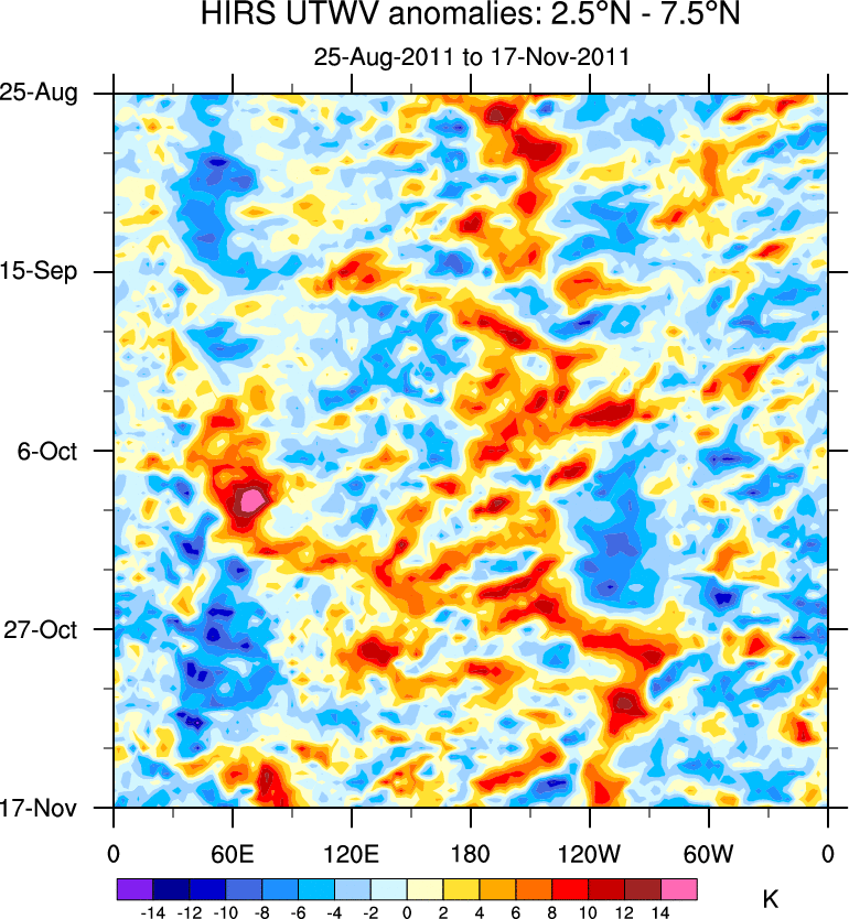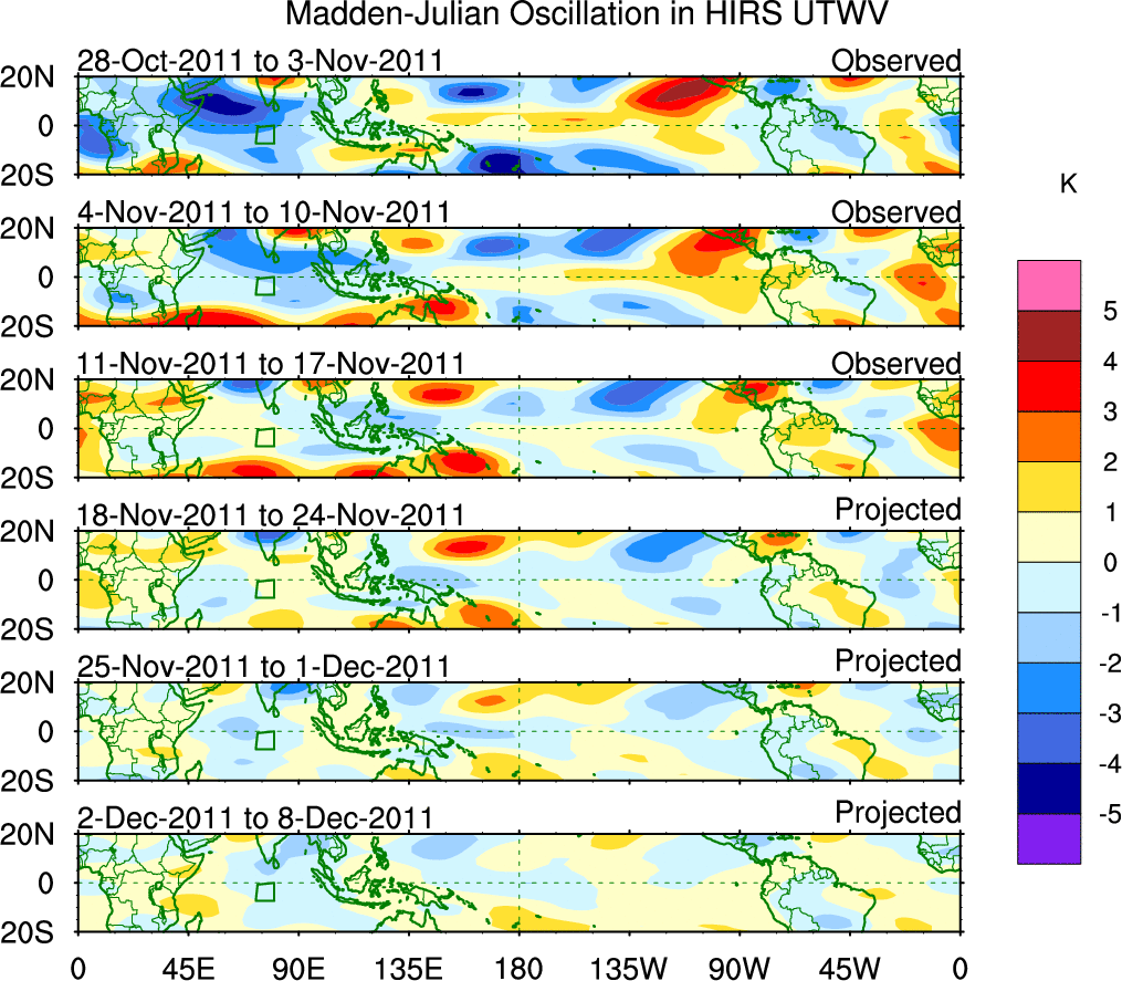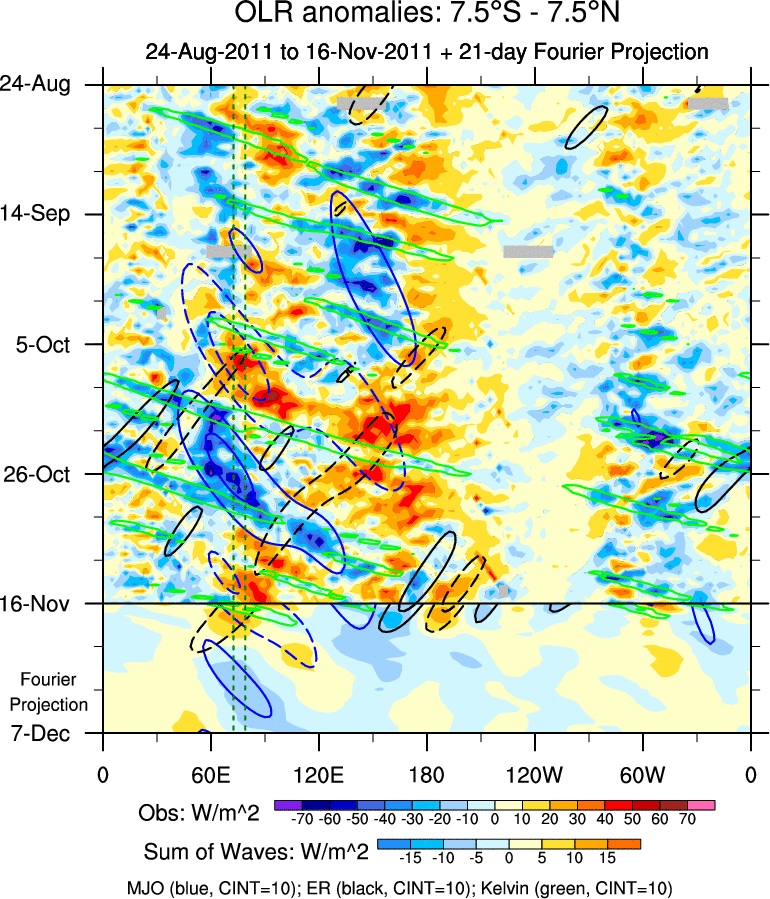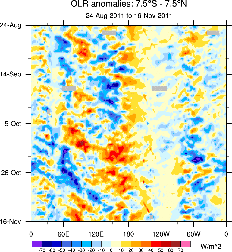 To identify tropical waves in near real-time, the OLR and UTWV data are filtered following Wheeler & Weickmann (2001 MWR). The daily anomalies are calculated using the first 3 harmonics of the seasonal cycle for 1979–2009. Missing values are then filled using linear interpolation in space and time. The most recent 365 days of anomalies are padded with 659 days of zeroes, and the result is filtered for each wave type.