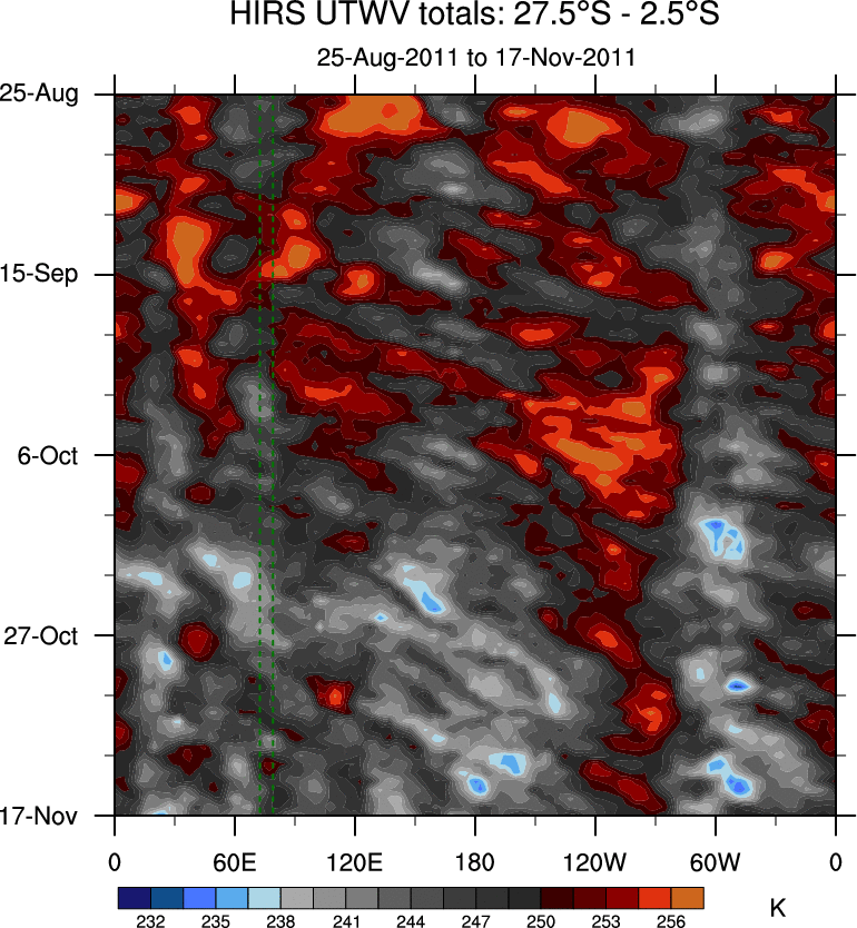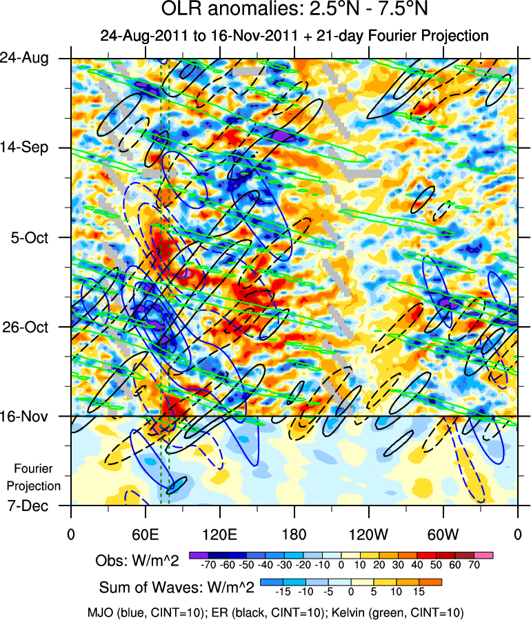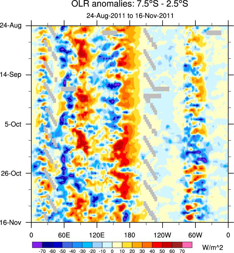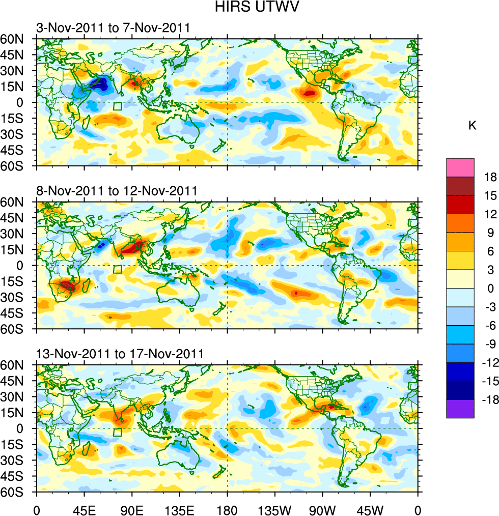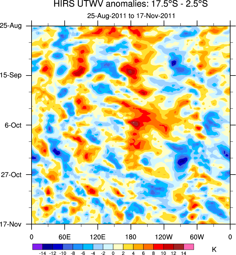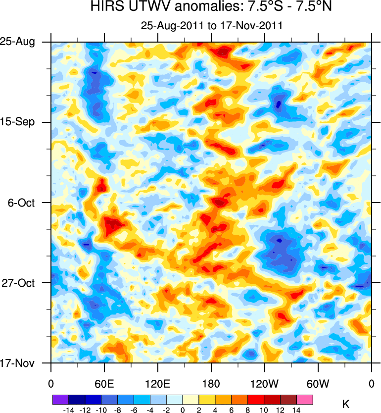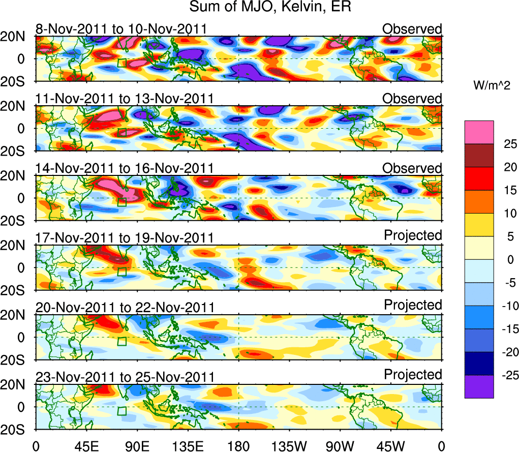 To identify tropical waves in near real-time, the OLR and UTWV data are filtered following Wheeler & Weickmann (2001 MWR). The daily anomalies are calculated using the first 3 harmonics of the seasonal cycle for 1979–2009. Missing values are then filled using linear interpolation in space and time. The most recent 365 days of anomalies are padded with 659 days of zeroes, and the result is filtered for each wave type.