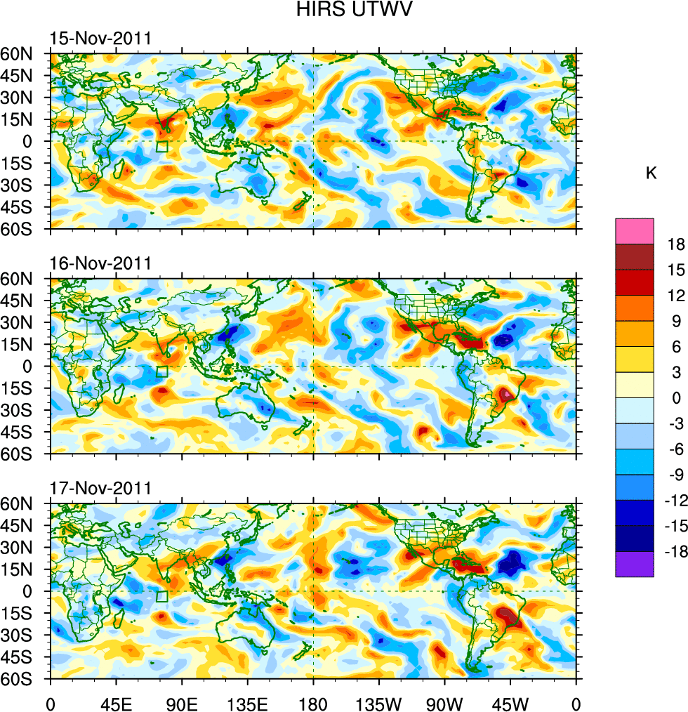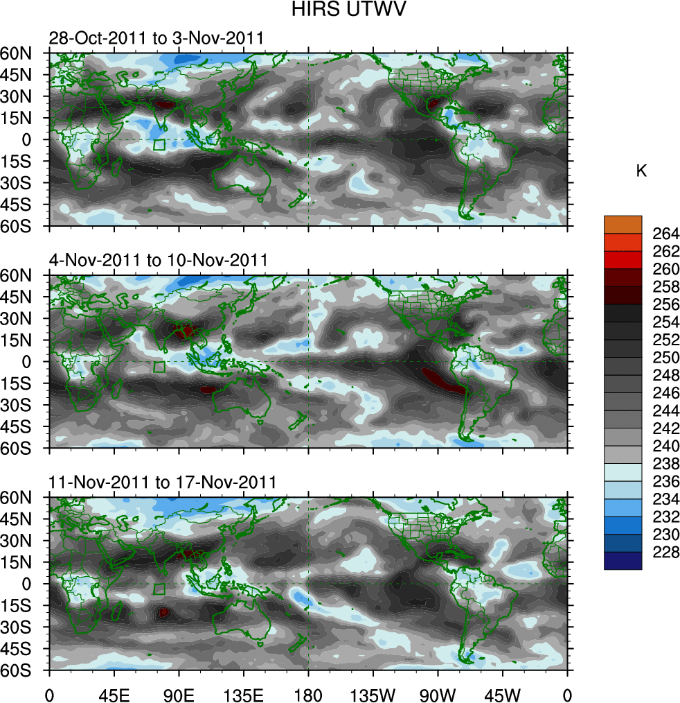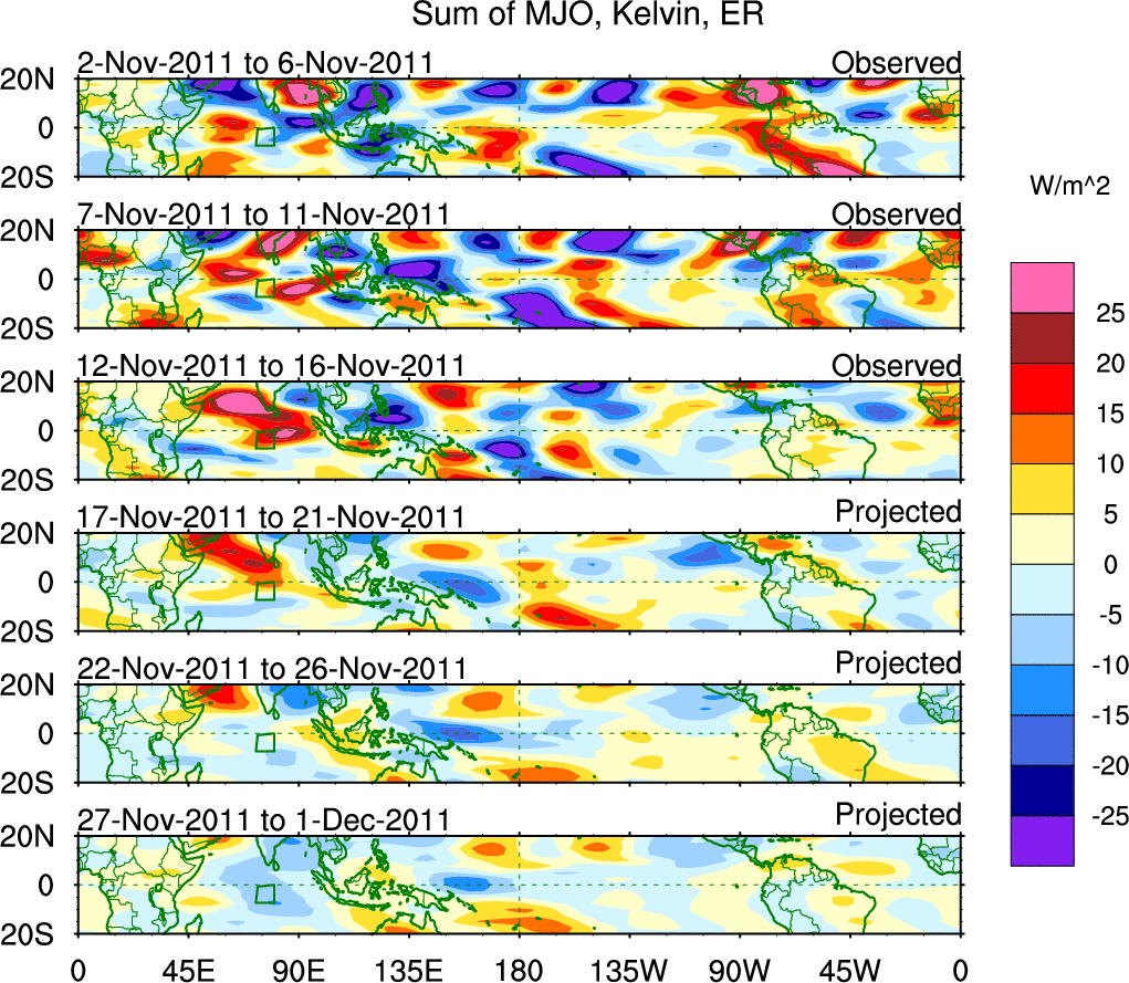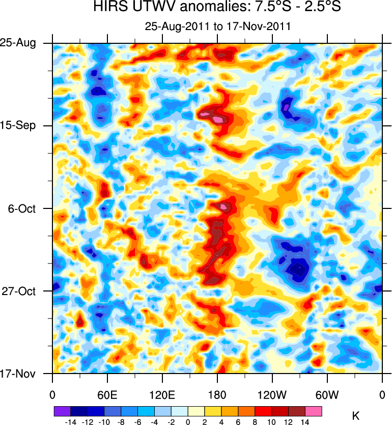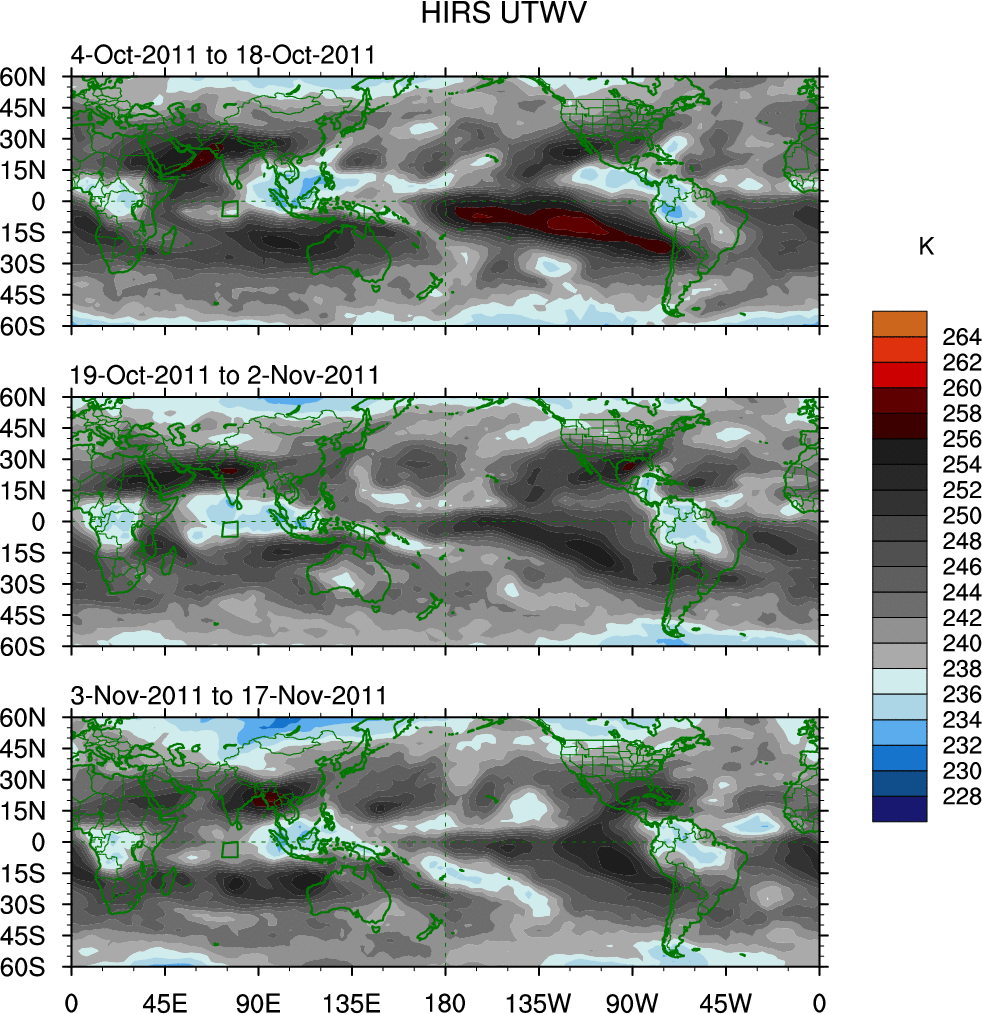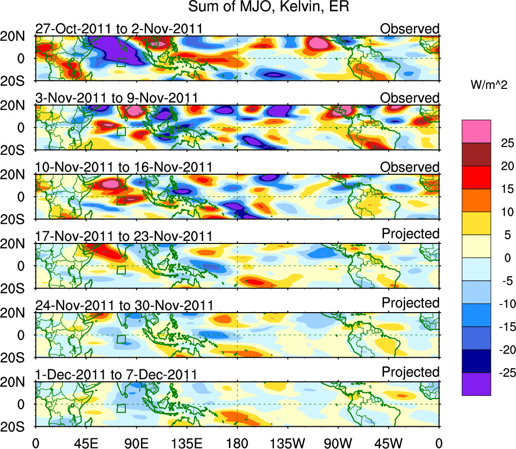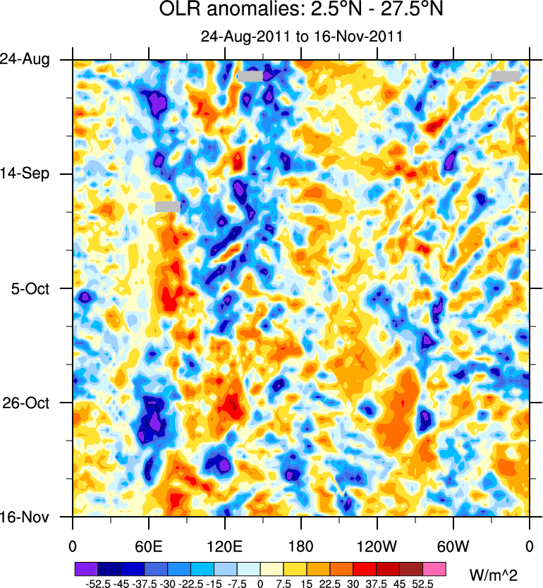 To identify tropical waves in near real-time, the OLR and UTWV data are filtered following Wheeler & Weickmann (2001 MWR). The daily anomalies are calculated using the first 3 harmonics of the seasonal cycle for 1979–2009. Missing values are then filled using linear interpolation in space and time. The most recent 365 days of anomalies are padded with 659 days of zeroes, and the result is filtered for each wave type.