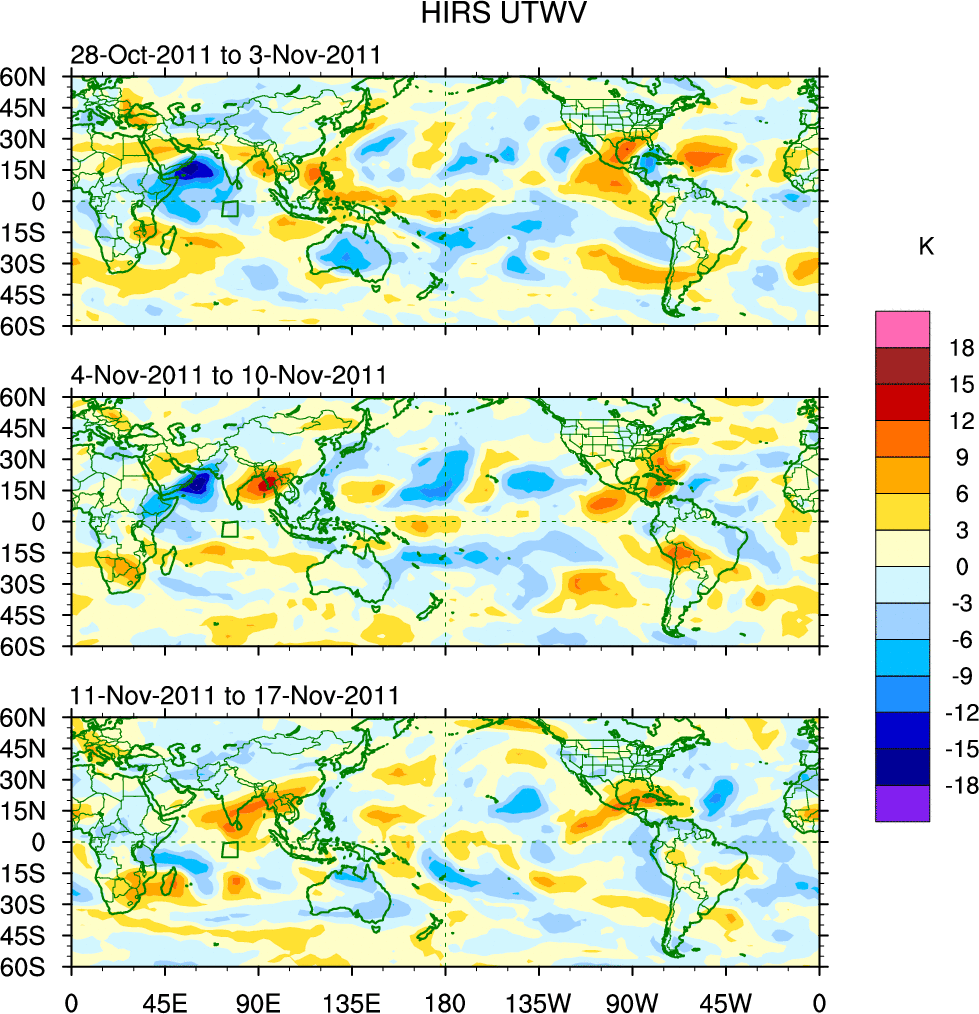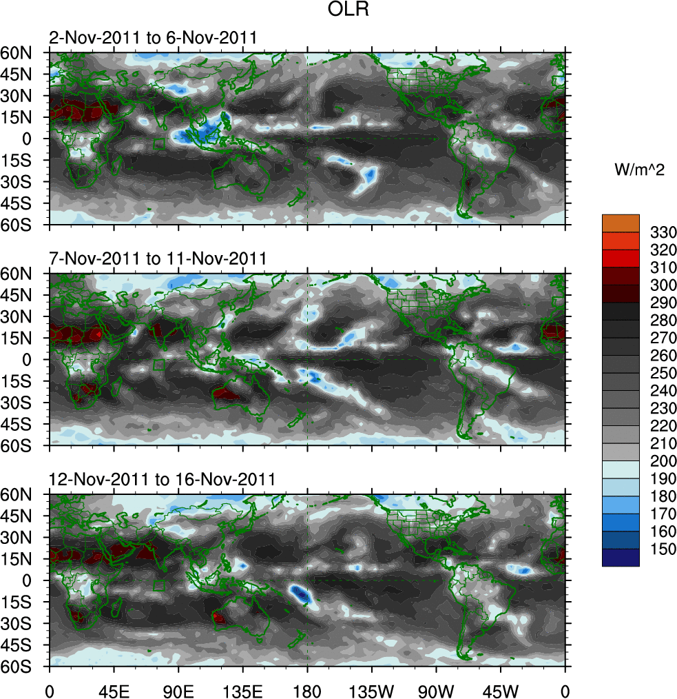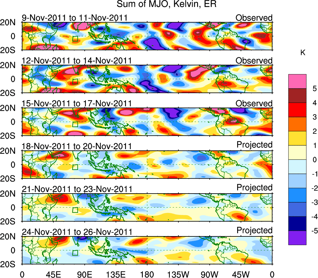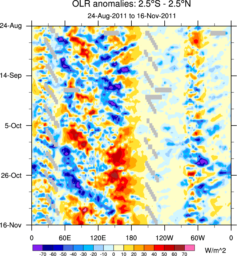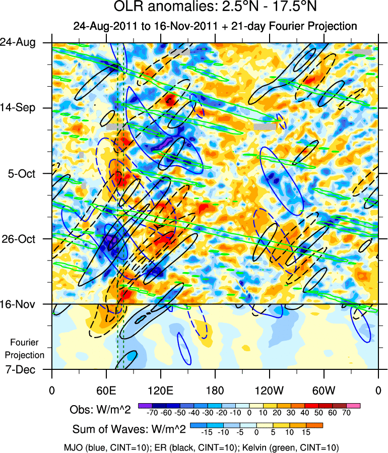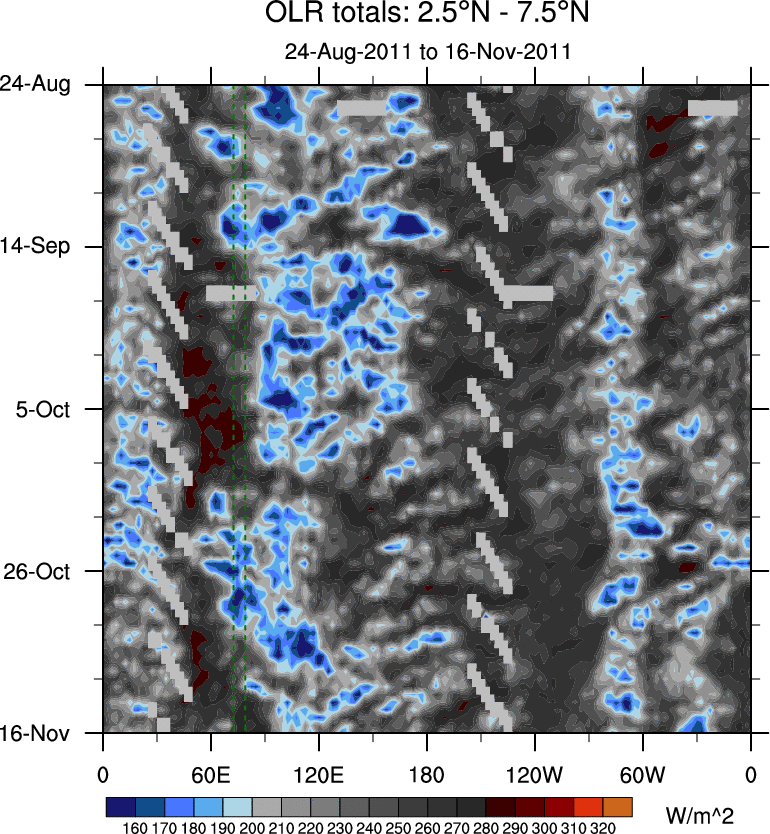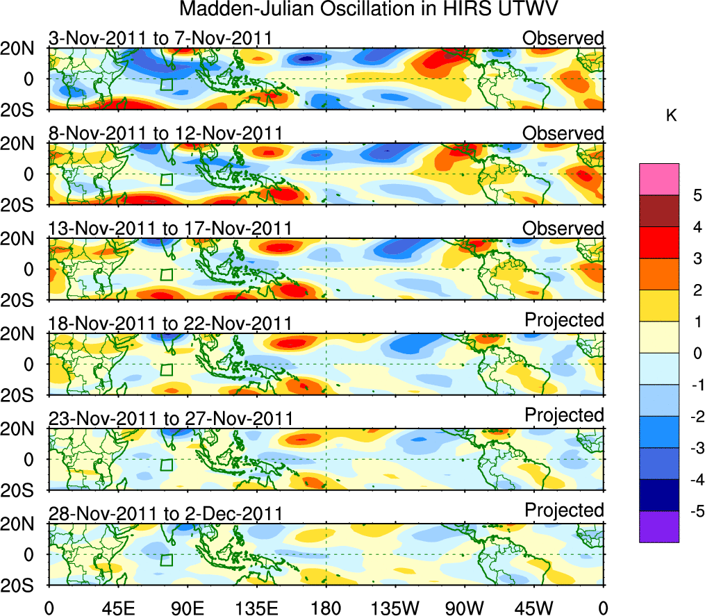 To identify tropical waves in near real-time, the OLR and UTWV data are filtered following Wheeler & Weickmann (2001 MWR). The daily anomalies are calculated using the first 3 harmonics of the seasonal cycle for 1979–2009. Missing values are then filled using linear interpolation in space and time. The most recent 365 days of anomalies are padded with 659 days of zeroes, and the result is filtered for each wave type.
