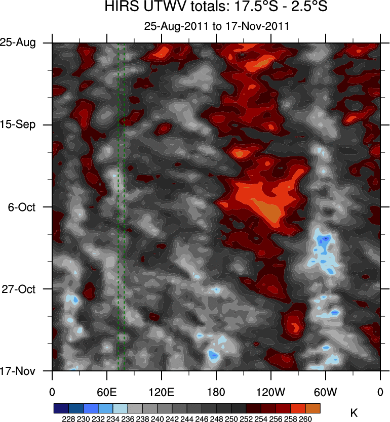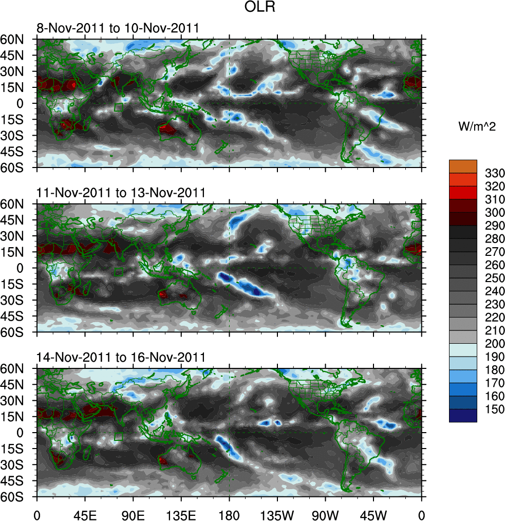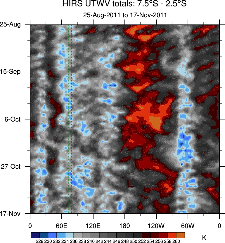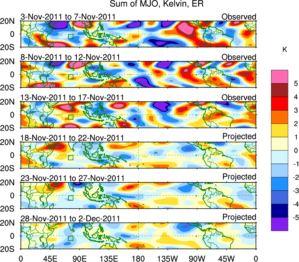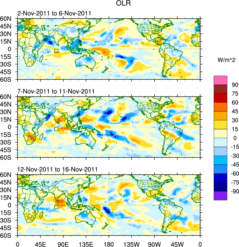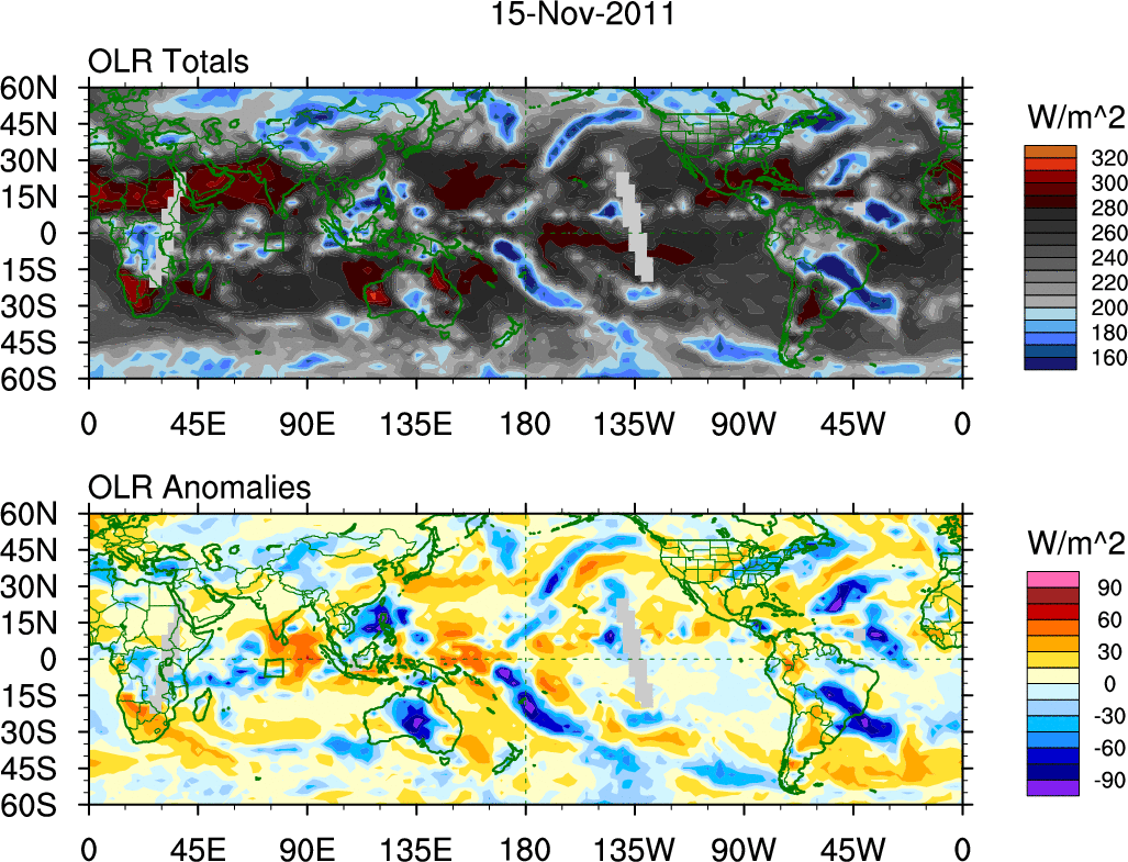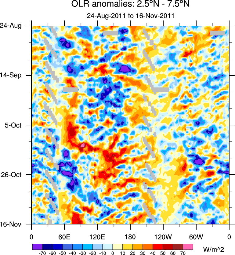 To identify tropical waves in near real-time, the OLR and UTWV data are filtered following Wheeler & Weickmann (2001 MWR). The daily anomalies are calculated using the first 3 harmonics of the seasonal cycle for 1979–2009. Missing values are then filled using linear interpolation in space and time. The most recent 365 days of anomalies are padded with 659 days of zeroes, and the result is filtered for each wave type.