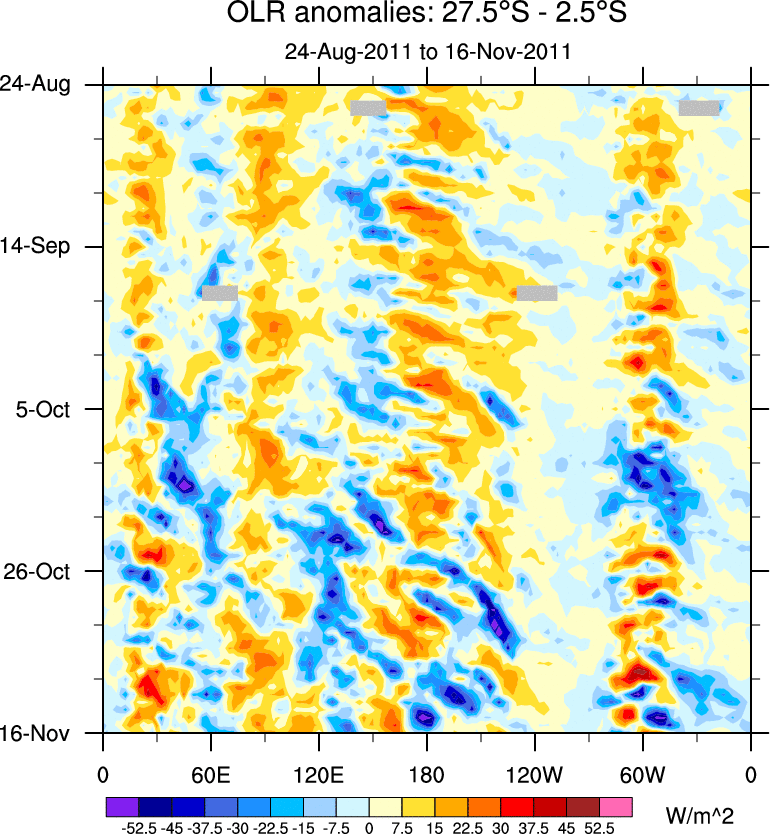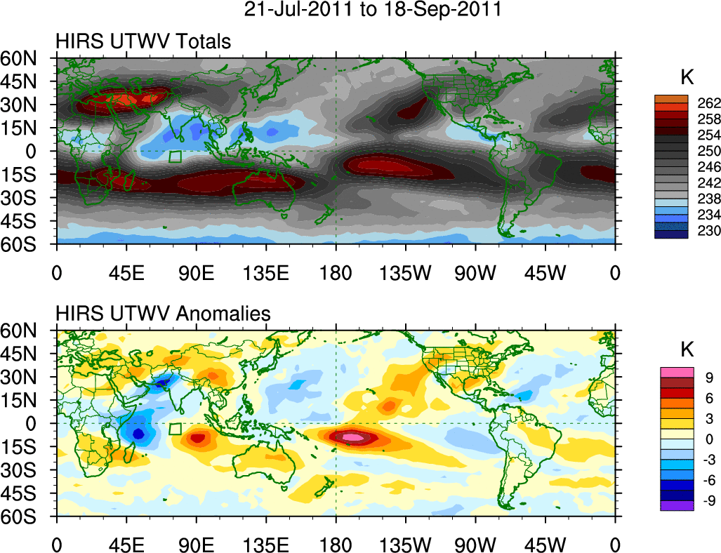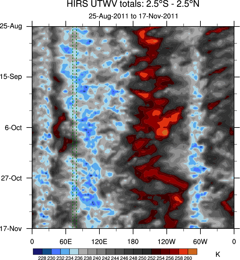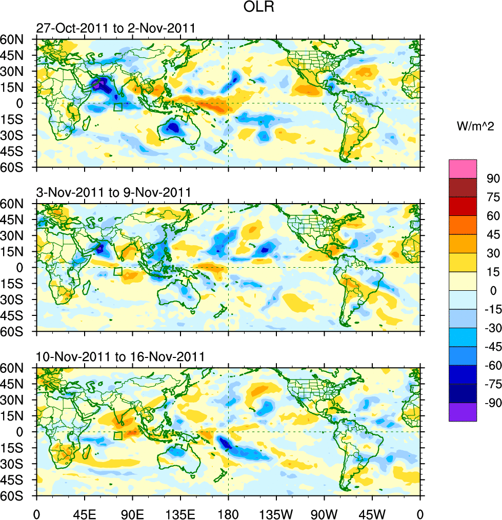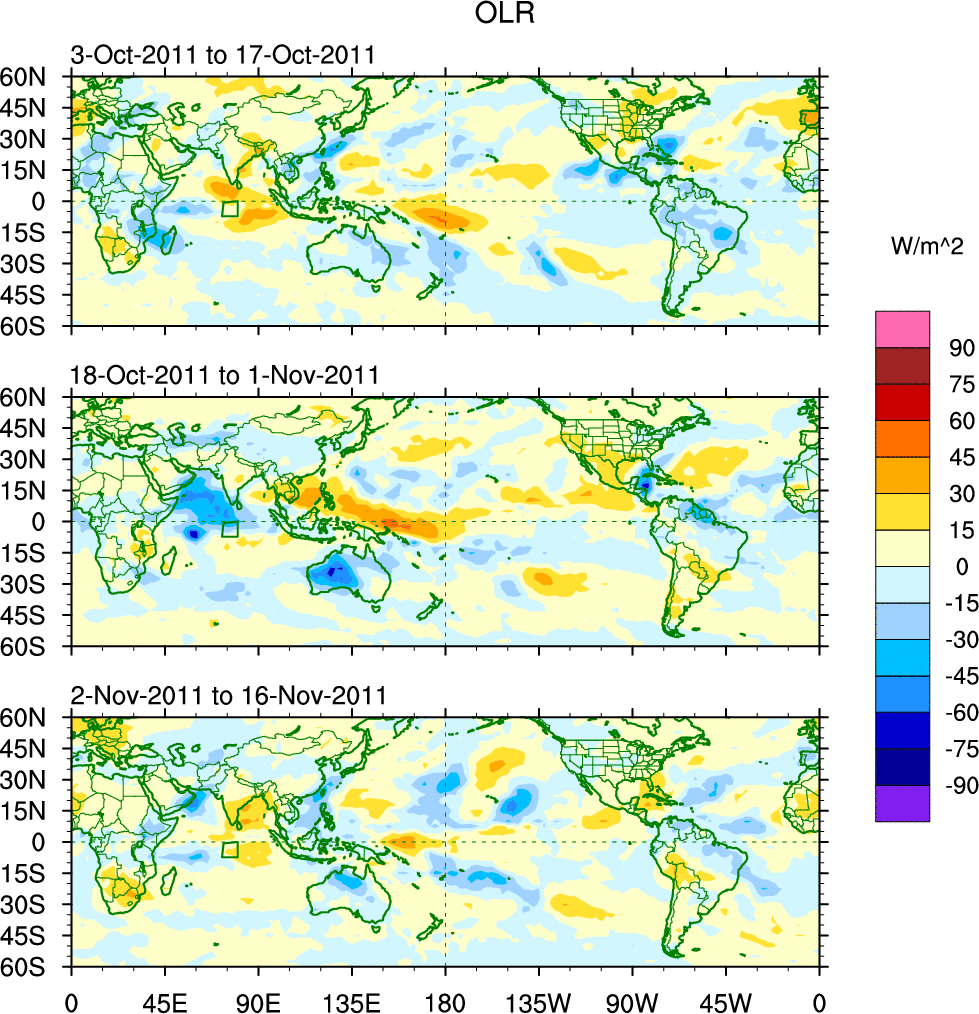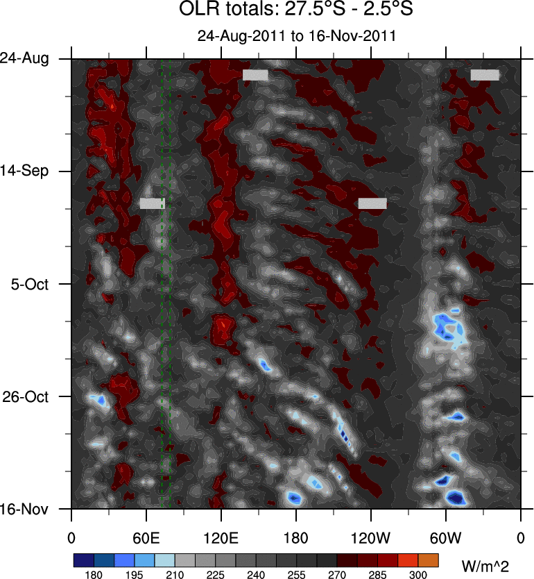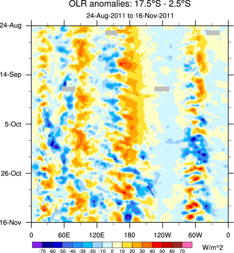 To identify tropical waves in near real-time, the OLR and UTWV data are filtered following Wheeler & Weickmann (2001 MWR). The daily anomalies are calculated using the first 3 harmonics of the seasonal cycle for 1979–2009. Missing values are then filled using linear interpolation in space and time. The most recent 365 days of anomalies are padded with 659 days of zeroes, and the result is filtered for each wave type.
