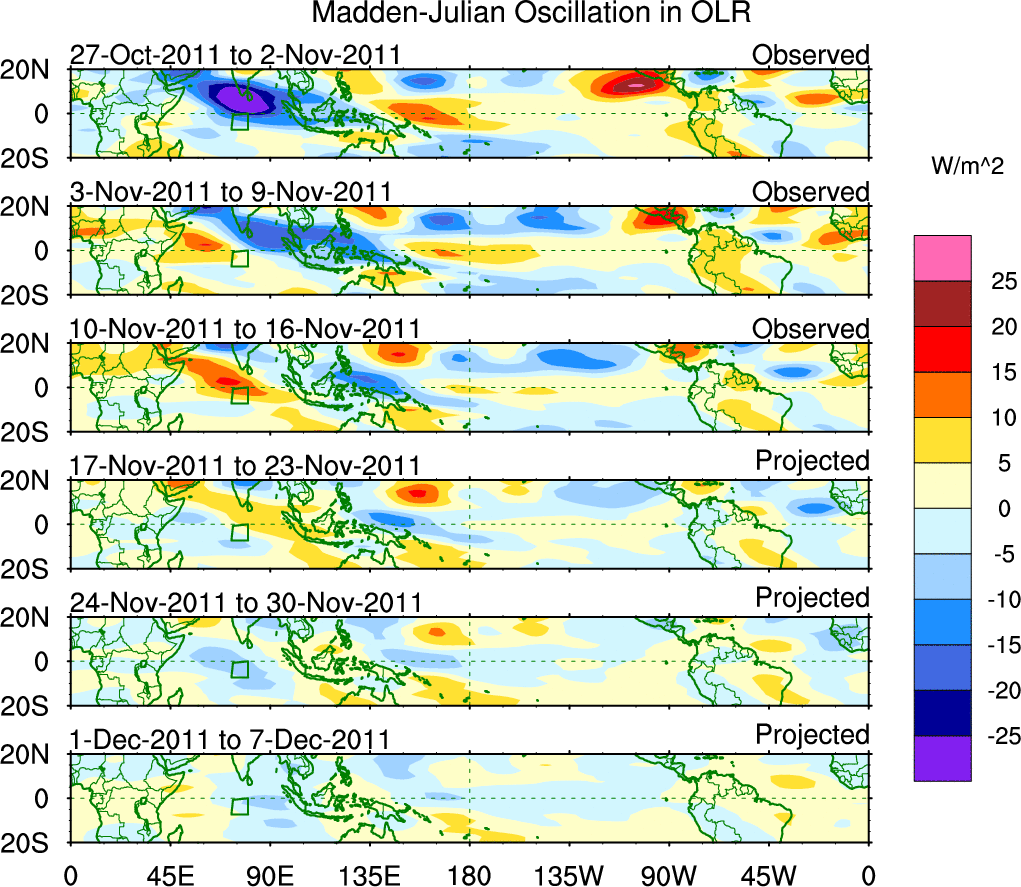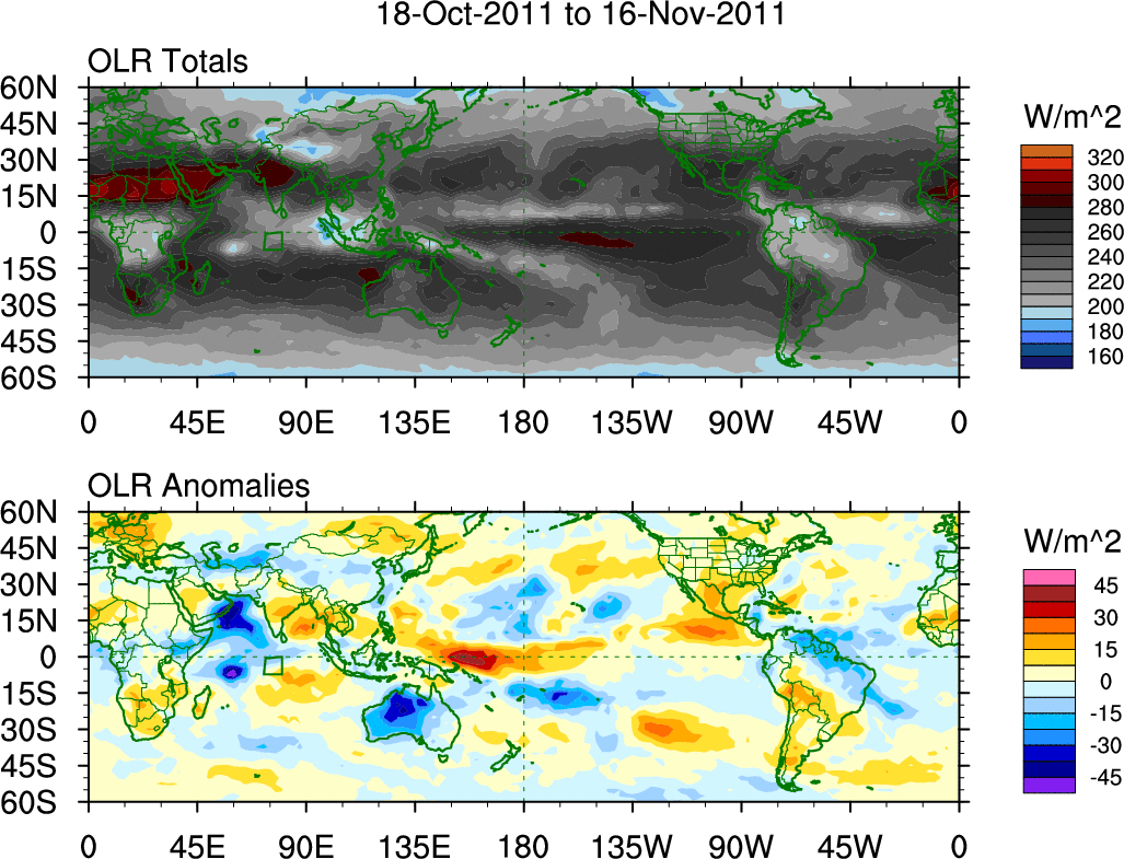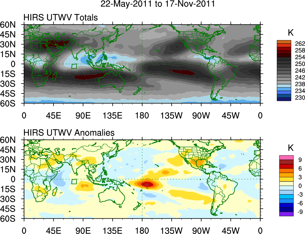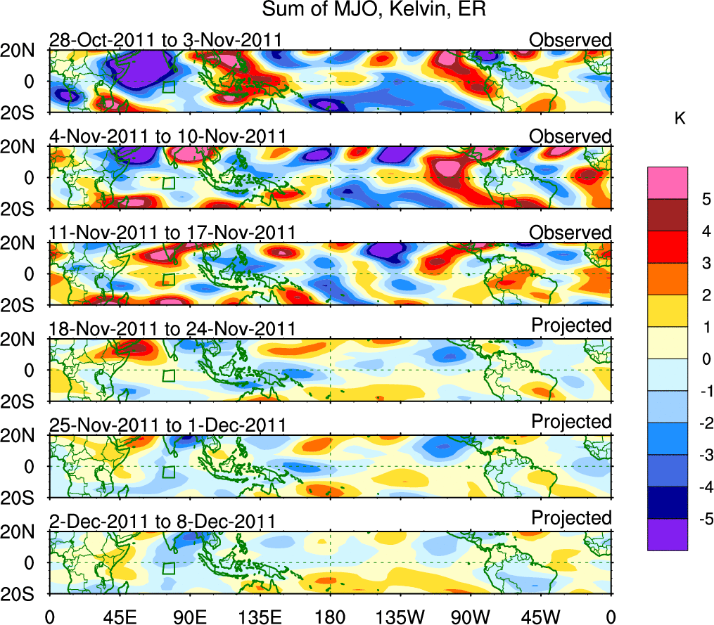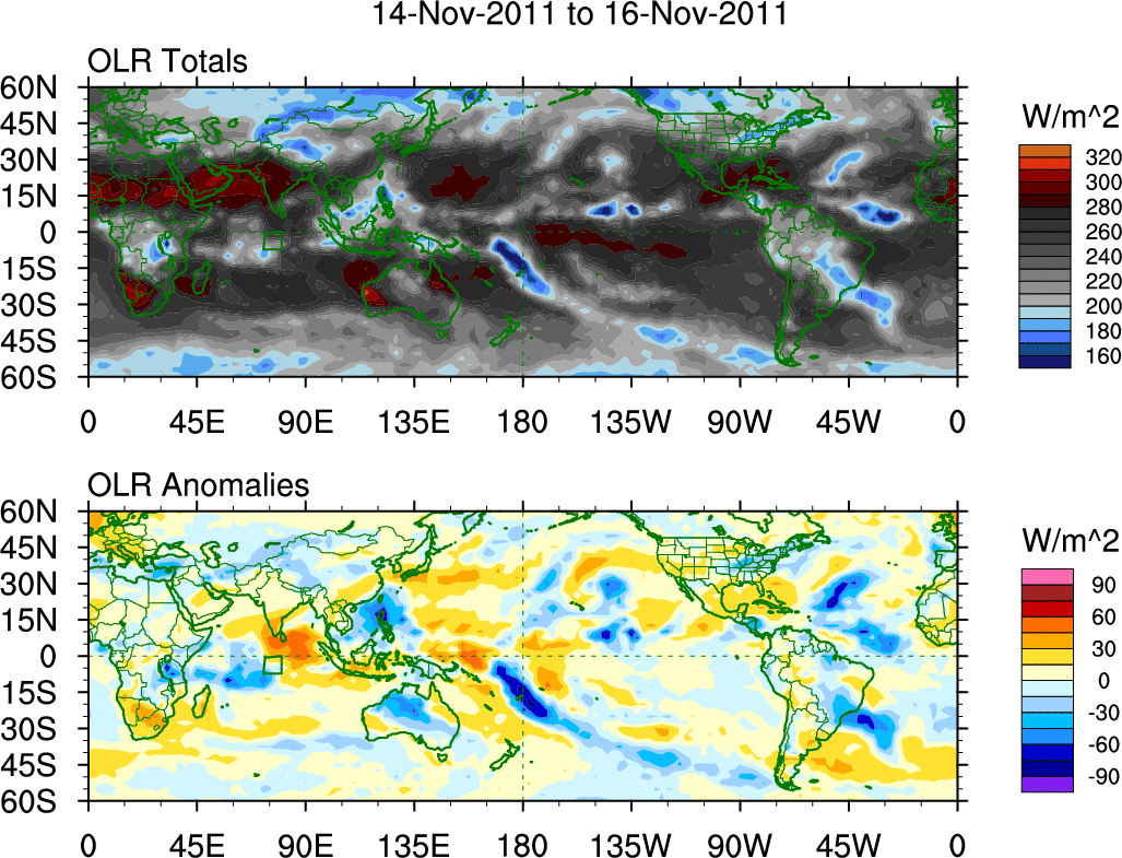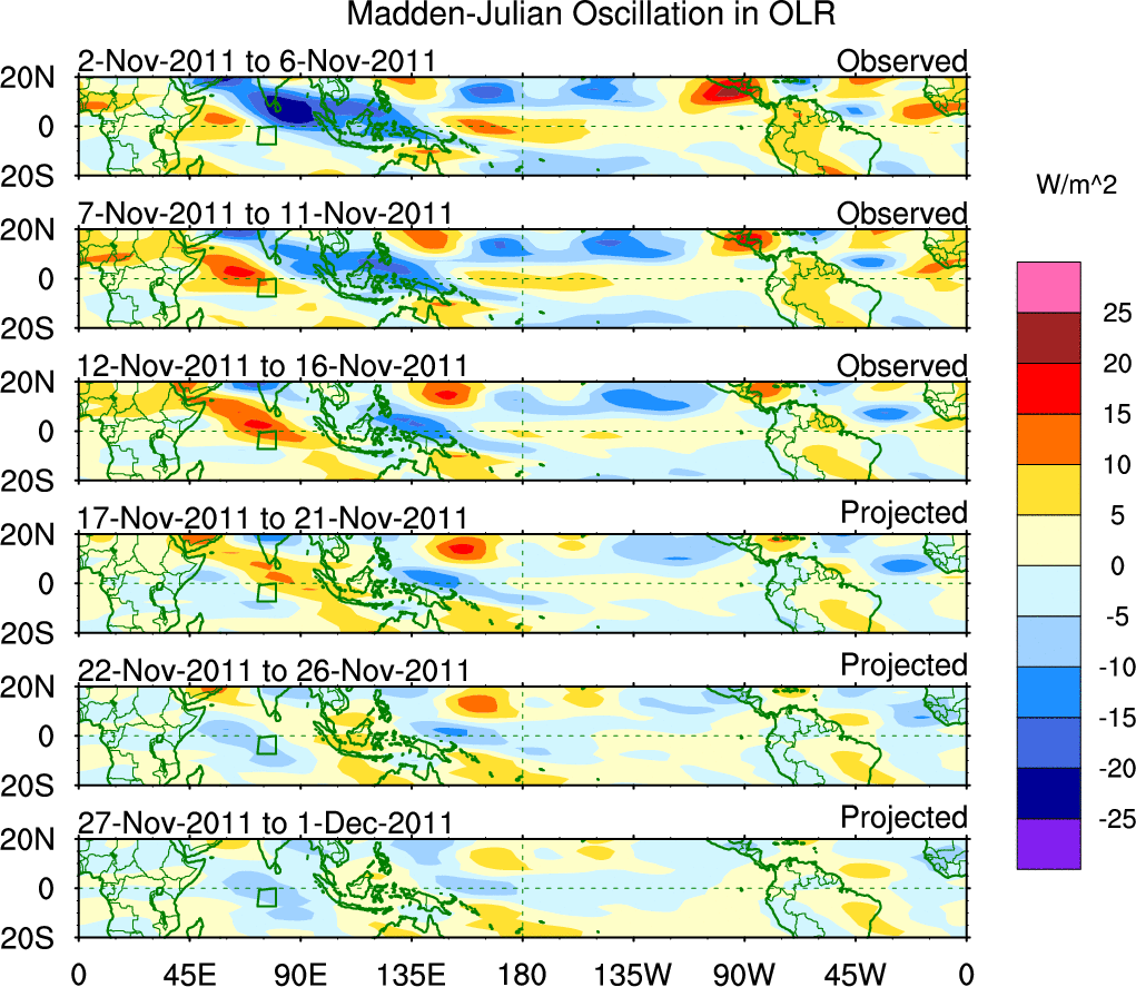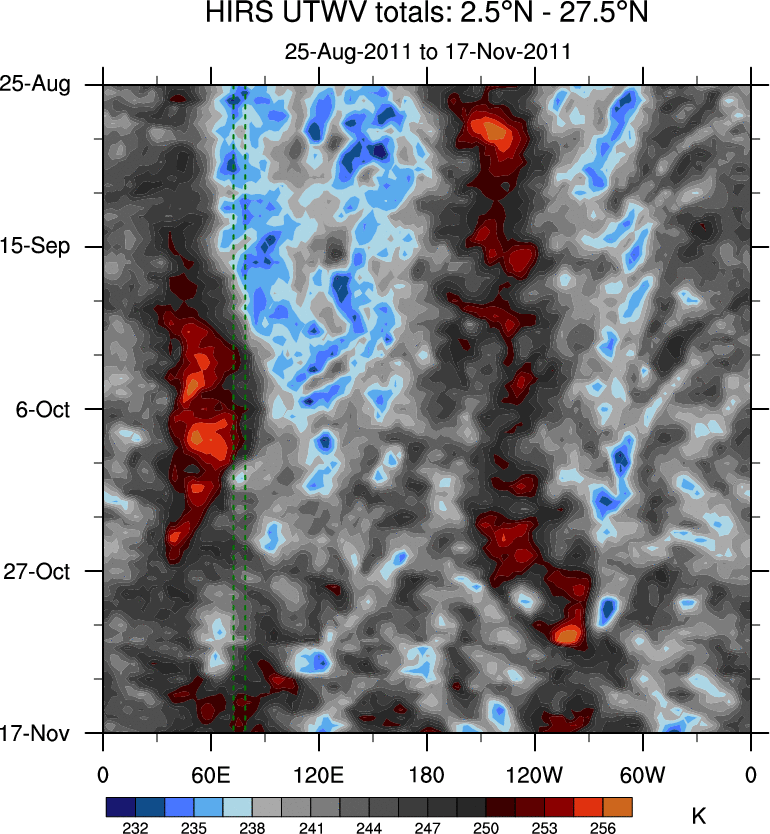 To identify tropical waves in near real-time, the OLR and UTWV data are filtered following Wheeler & Weickmann (2001 MWR). The daily anomalies are calculated using the first 3 harmonics of the seasonal cycle for 1979–2009. Missing values are then filled using linear interpolation in space and time. The most recent 365 days of anomalies are padded with 659 days of zeroes, and the result is filtered for each wave type.