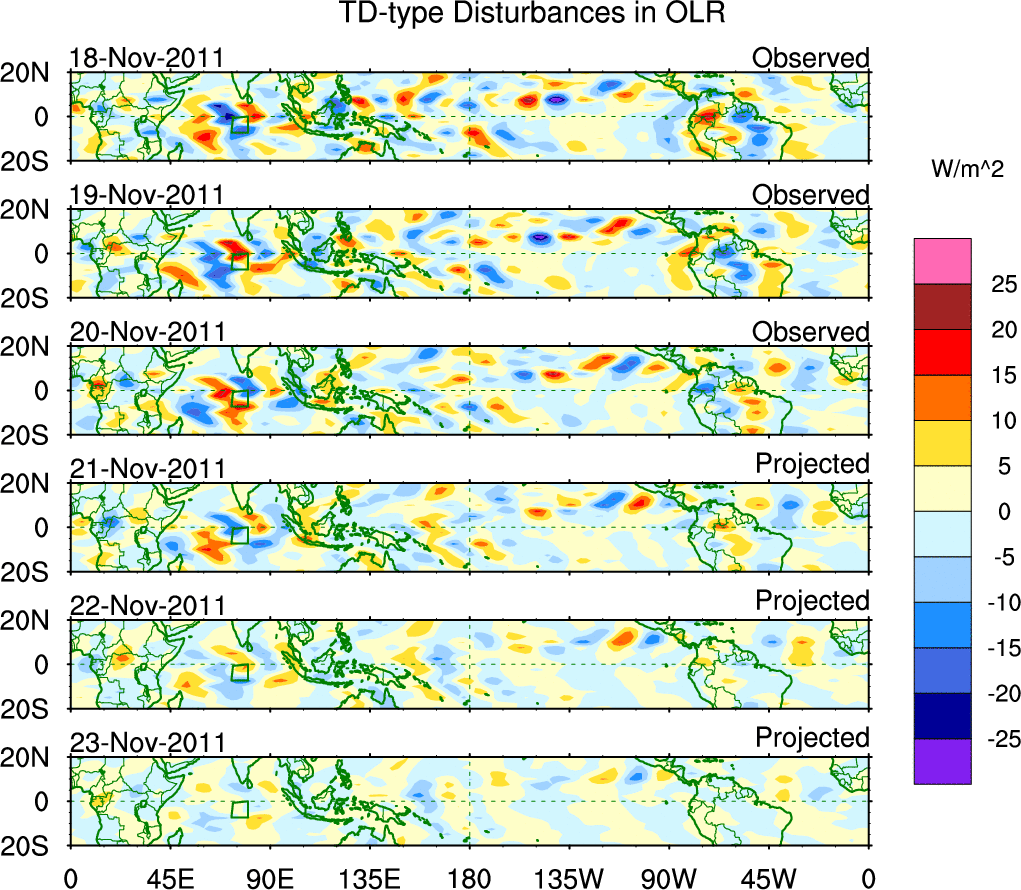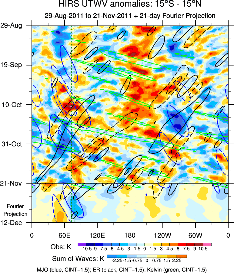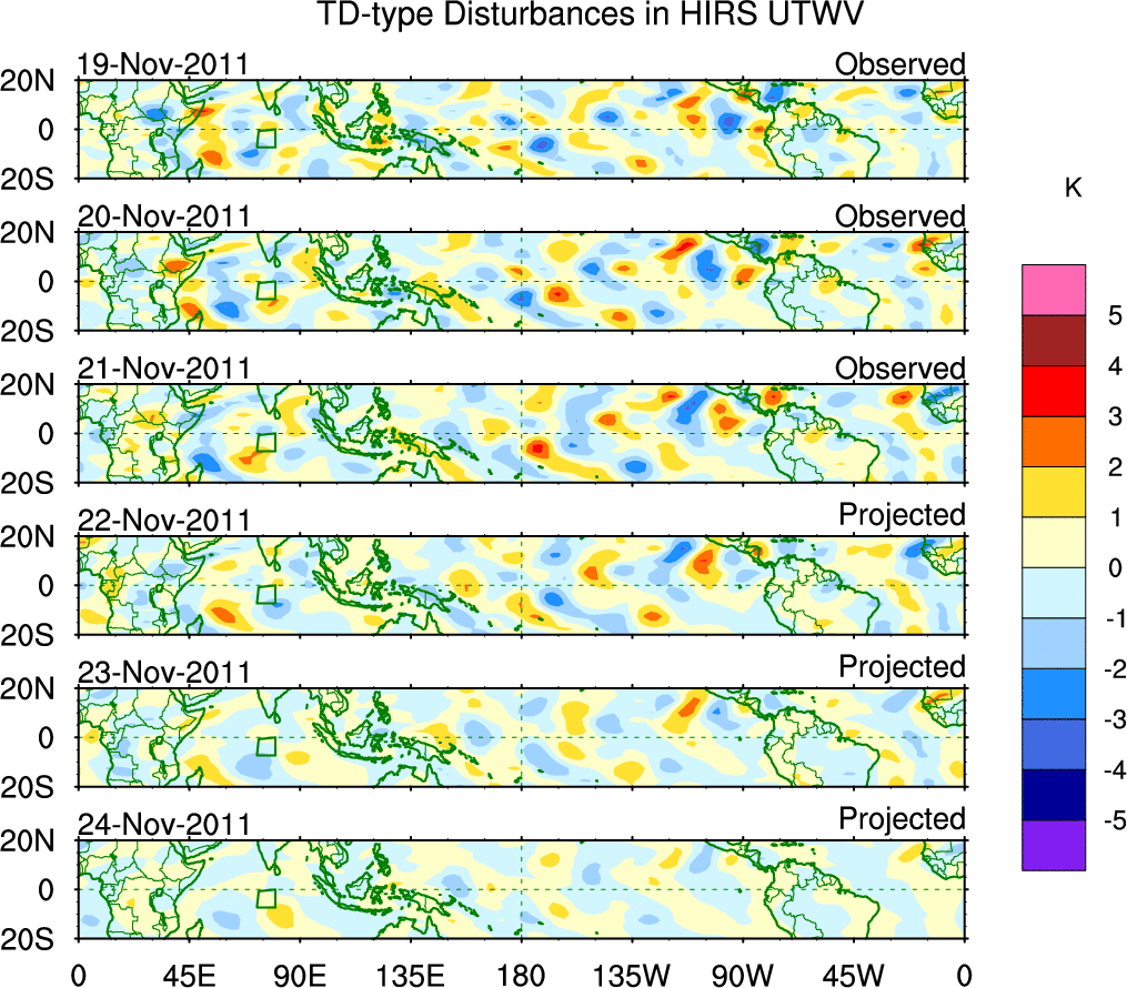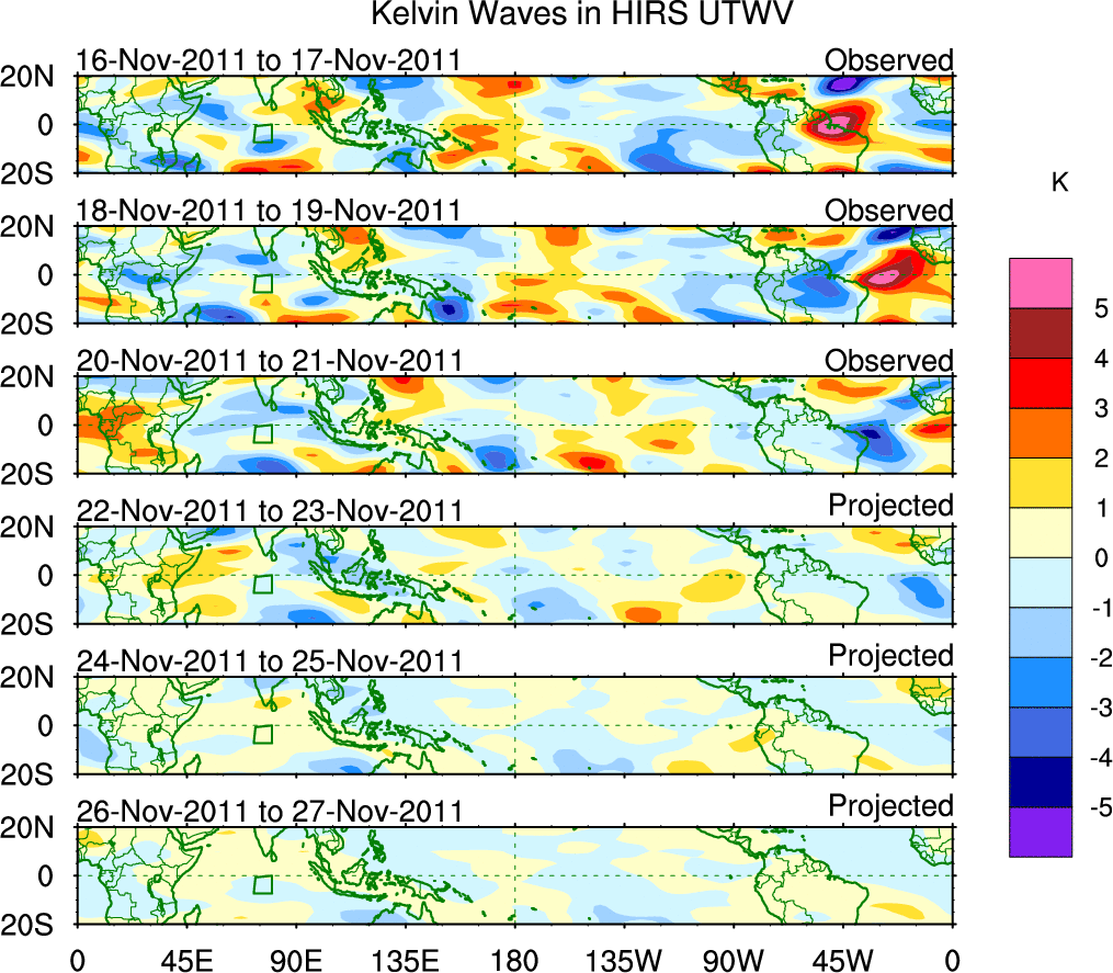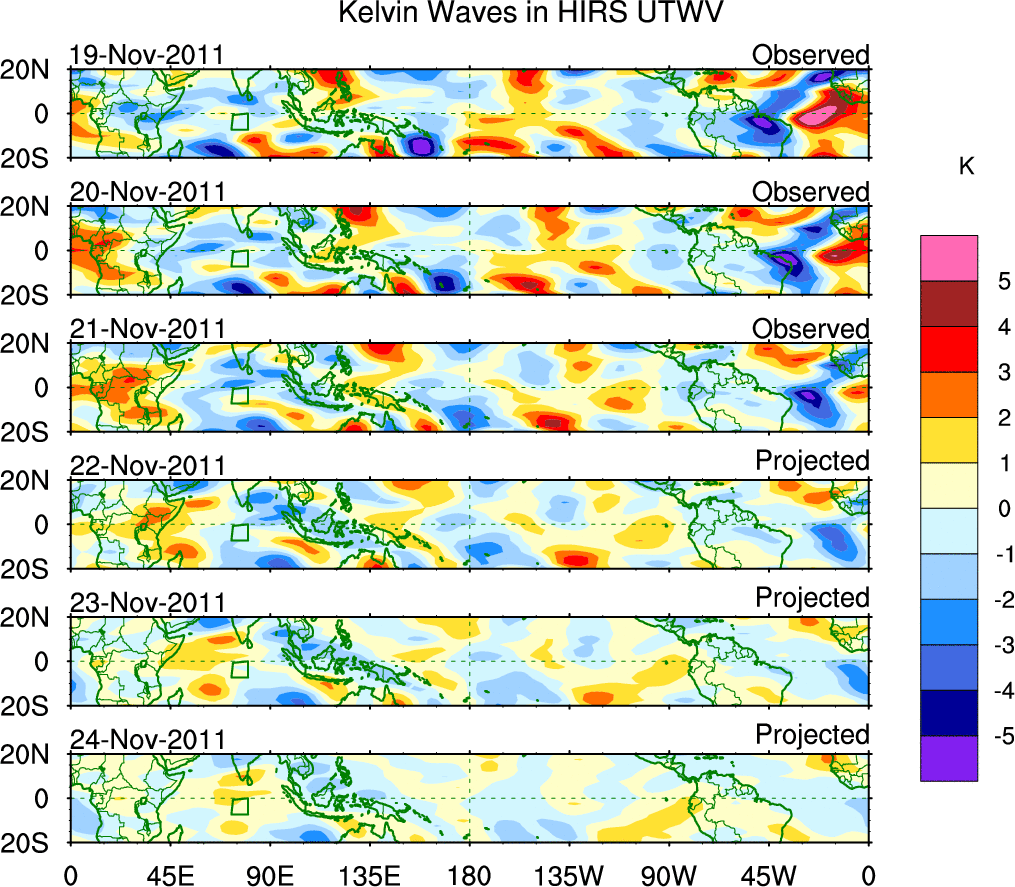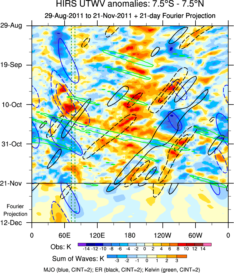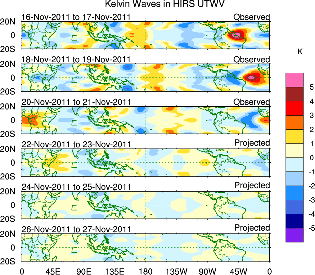 To identify tropical waves in near real-time, the OLR and UTWV data are filtered following Wheeler & Weickmann (2001 MWR). The daily anomalies are calculated using the first 3 harmonics of the seasonal cycle for 1979–2009. Missing values are then filled using linear interpolation in space and time. The most recent 365 days of anomalies are padded with 659 days of zeroes, and the result is filtered for each wave type.