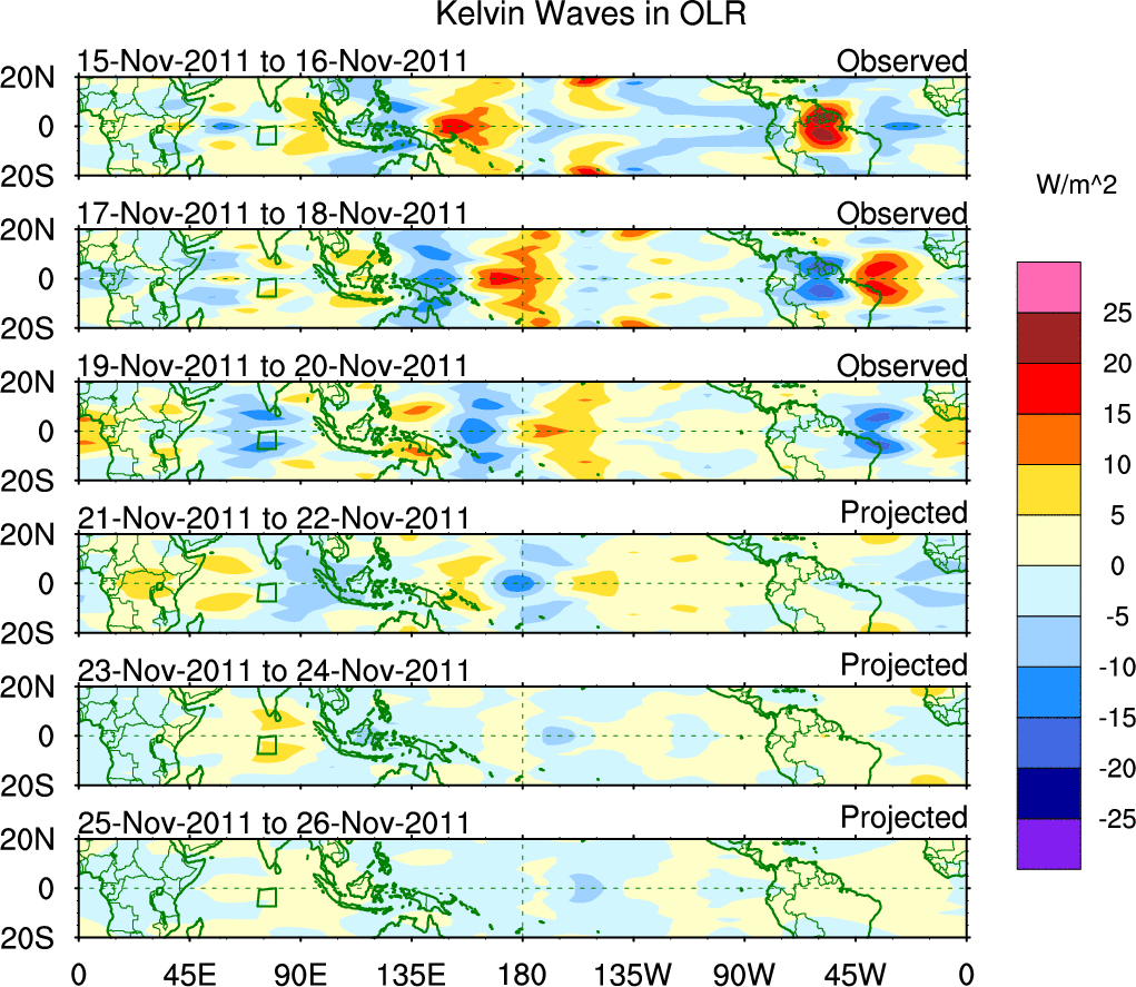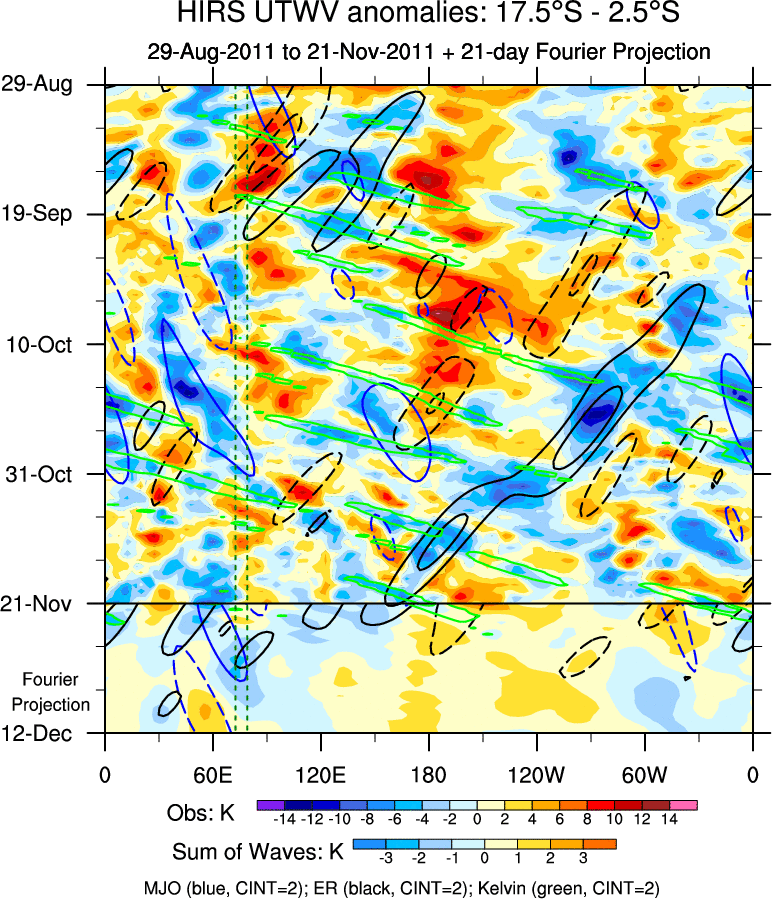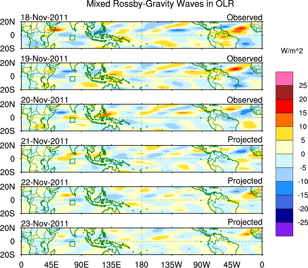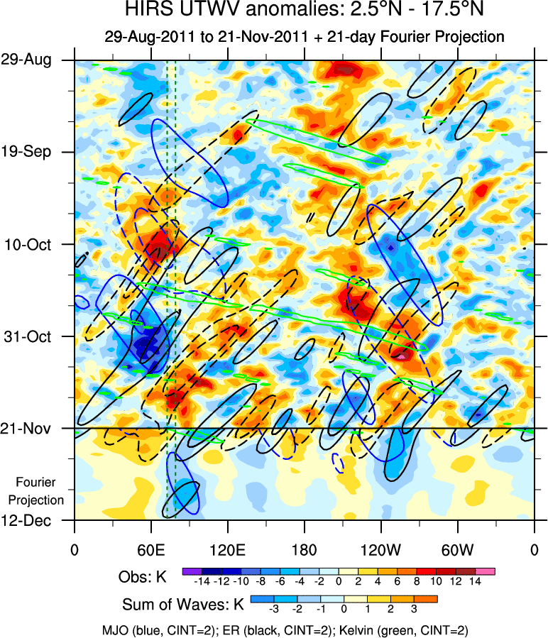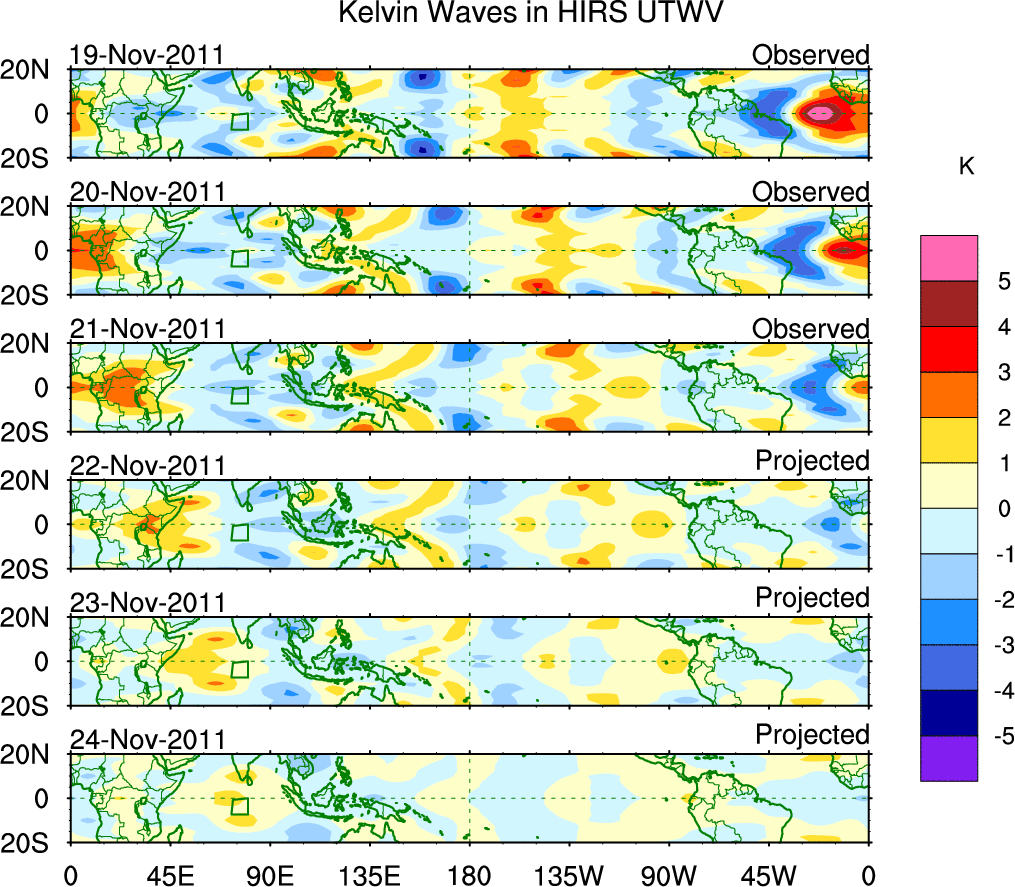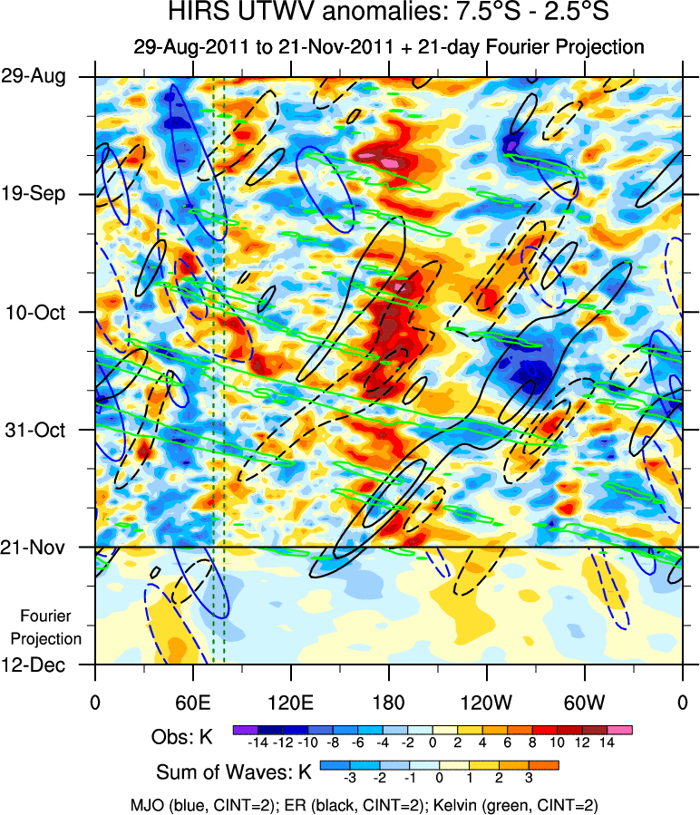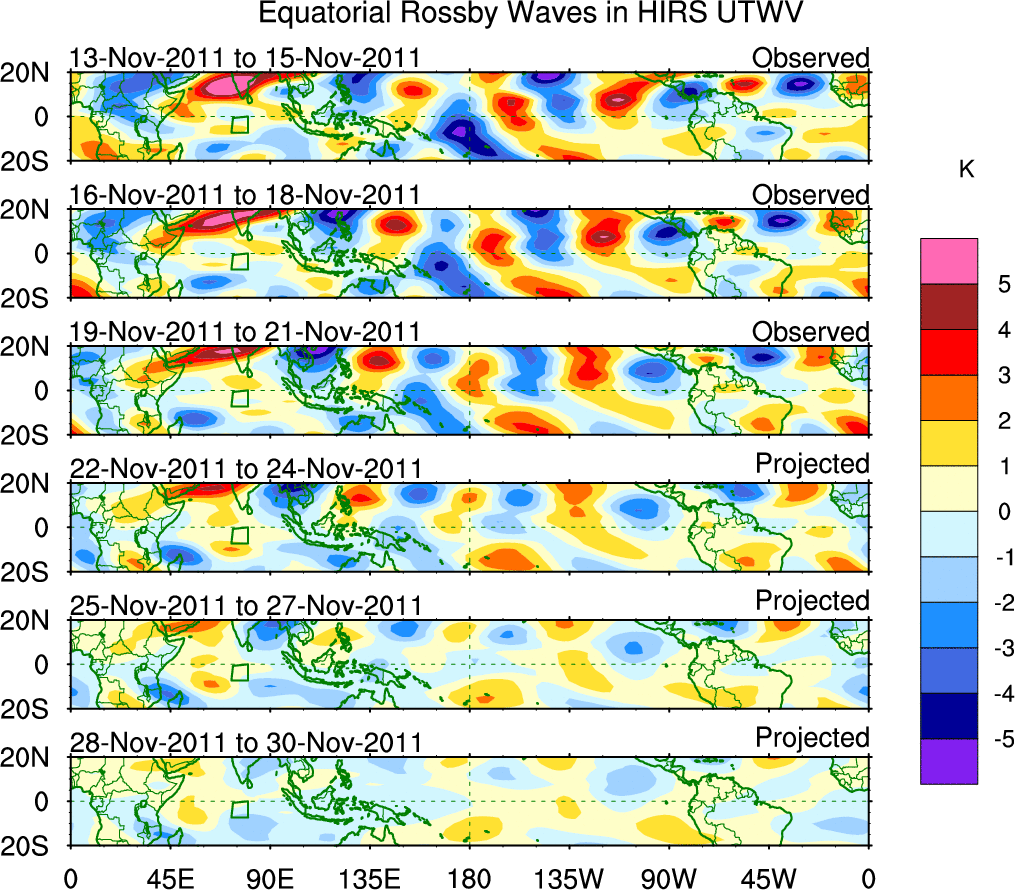 To identify tropical waves in near real-time, the OLR and UTWV data are filtered following Wheeler & Weickmann (2001 MWR). The daily anomalies are calculated using the first 3 harmonics of the seasonal cycle for 1979–2009. Missing values are then filled using linear interpolation in space and time. The most recent 365 days of anomalies are padded with 659 days of zeroes, and the result is filtered for each wave type.