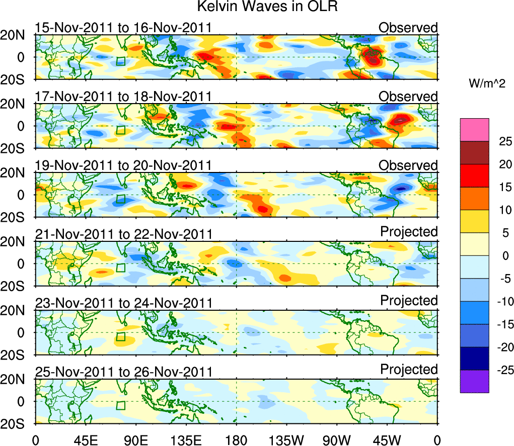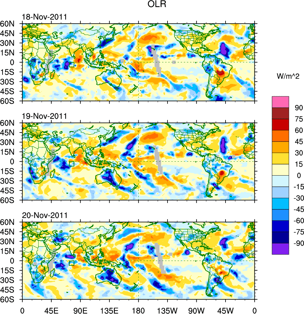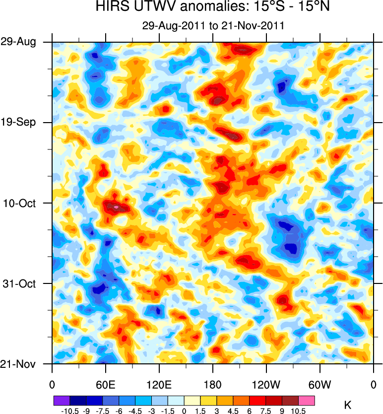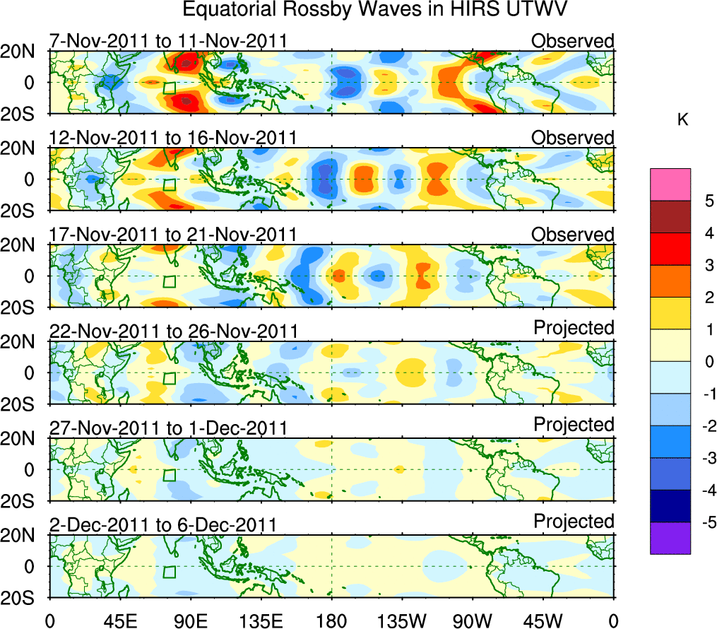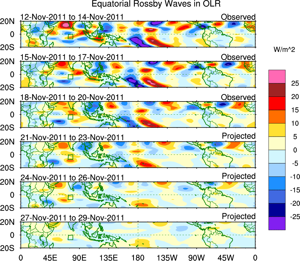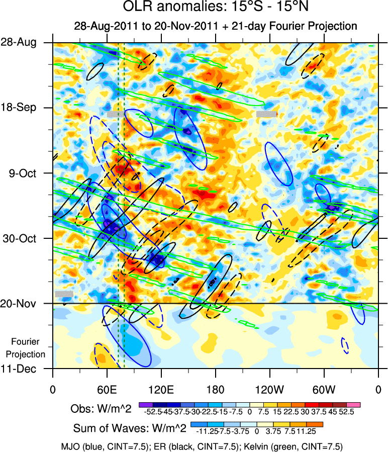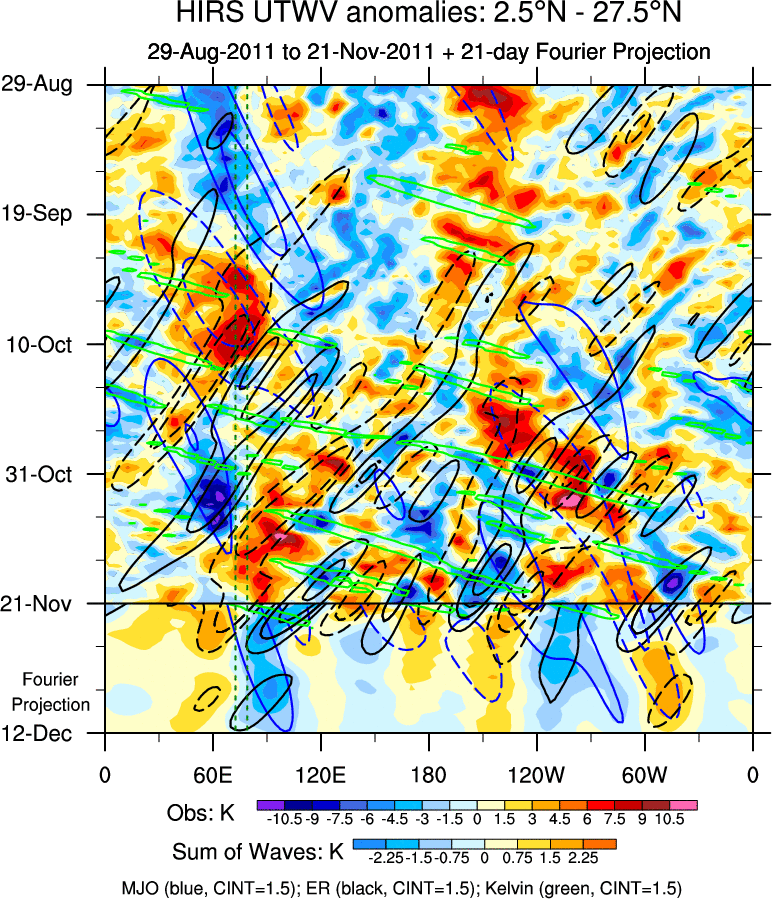 To identify tropical waves in near real-time, the OLR and UTWV data are filtered following Wheeler & Weickmann (2001 MWR). The daily anomalies are calculated using the first 3 harmonics of the seasonal cycle for 1979–2009. Missing values are then filled using linear interpolation in space and time. The most recent 365 days of anomalies are padded with 659 days of zeroes, and the result is filtered for each wave type.